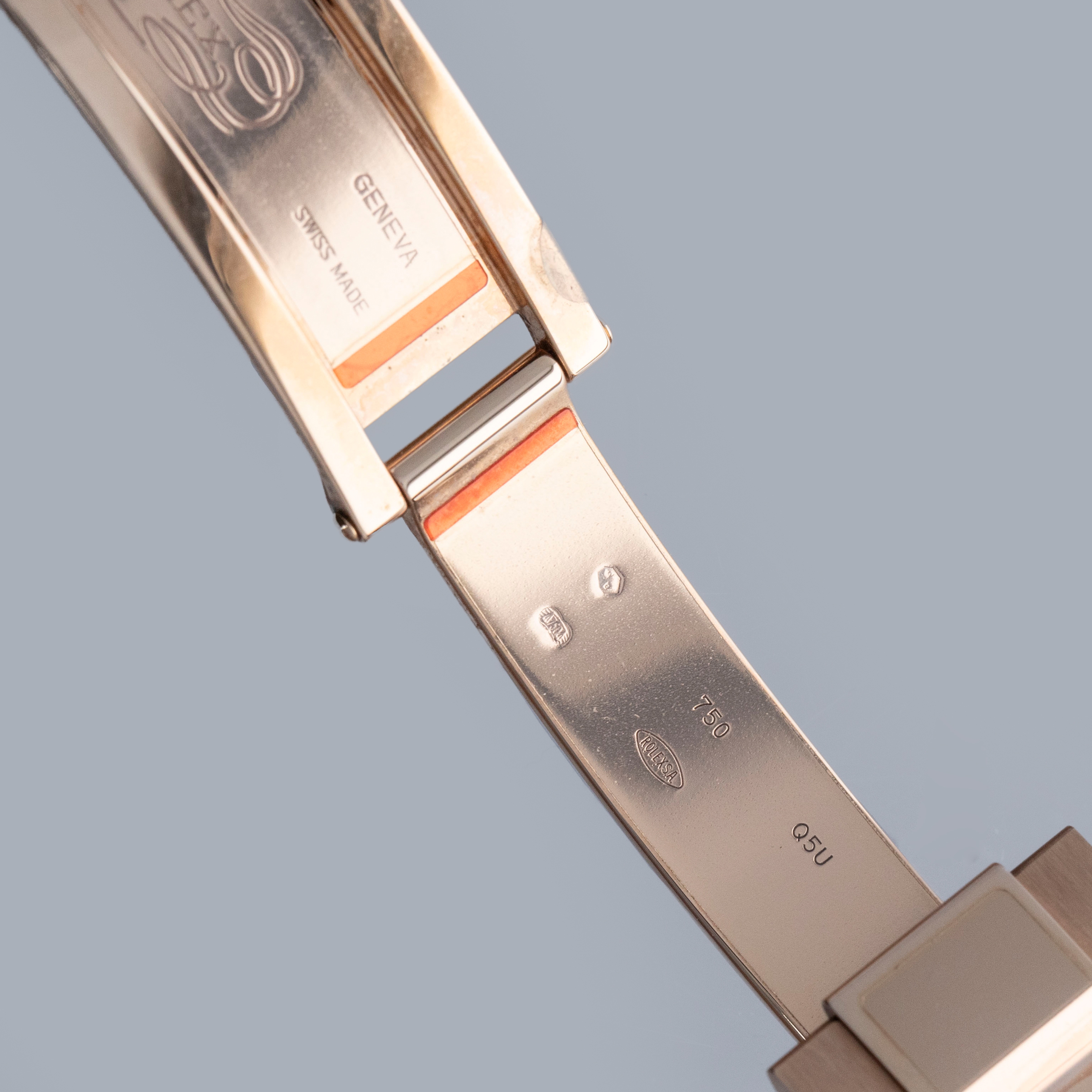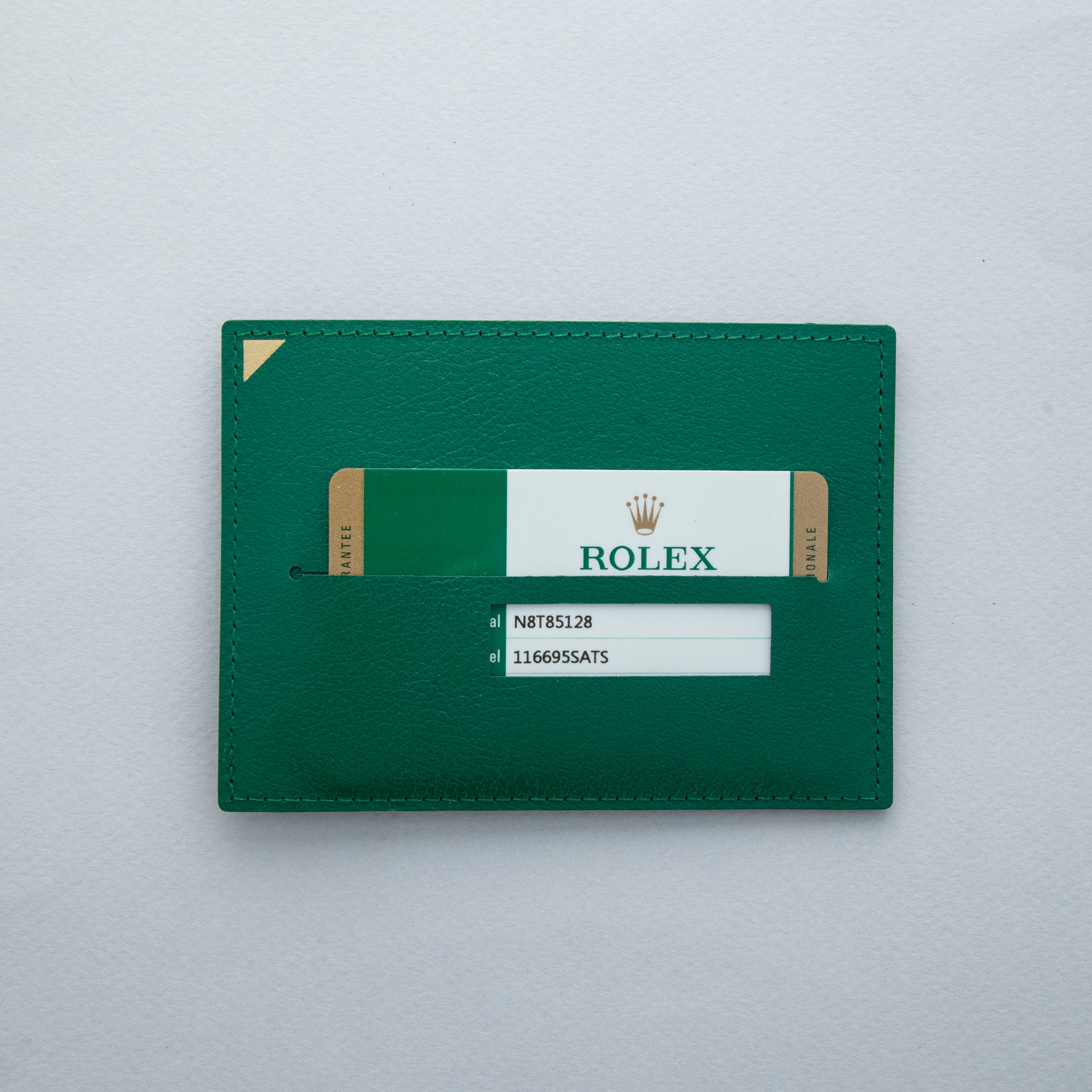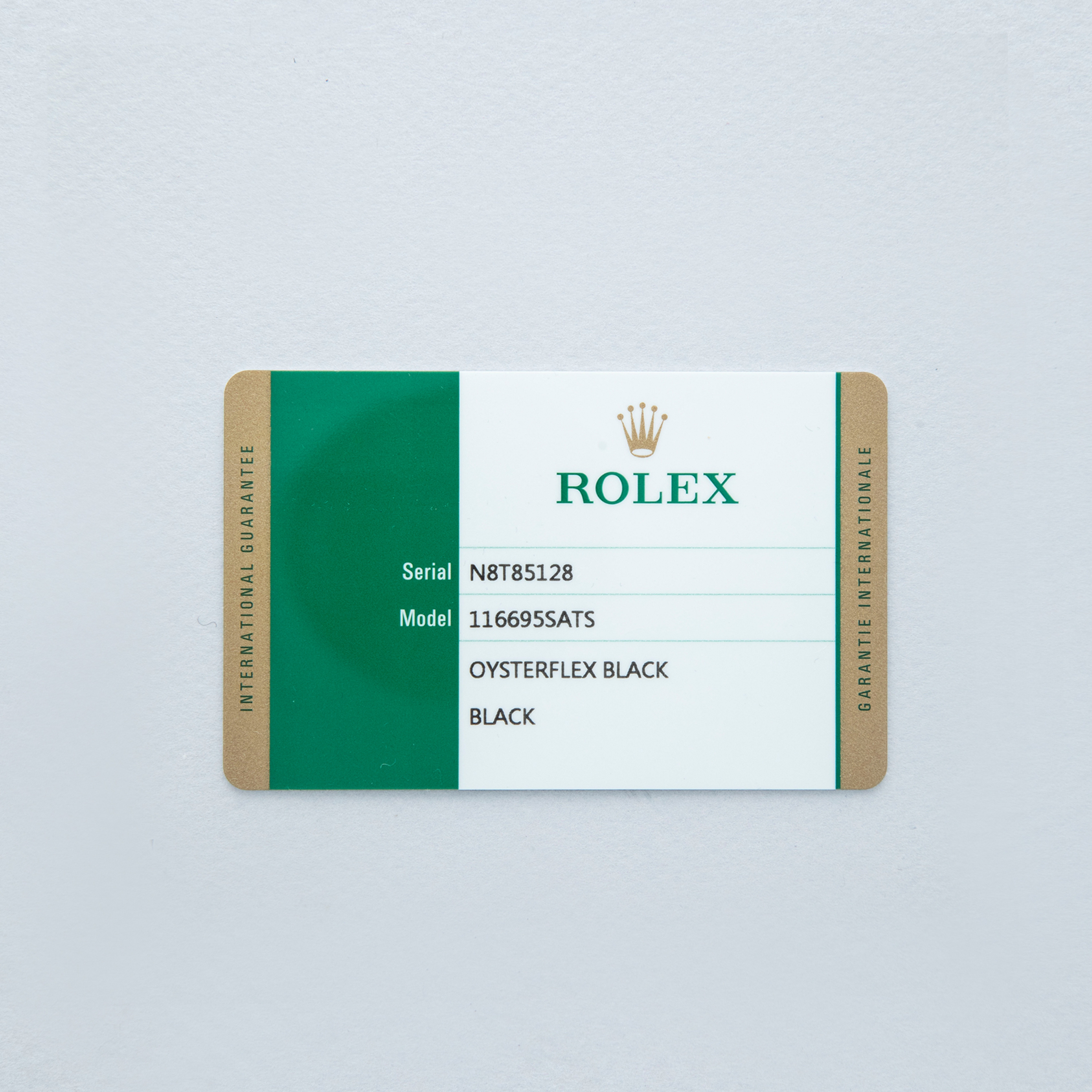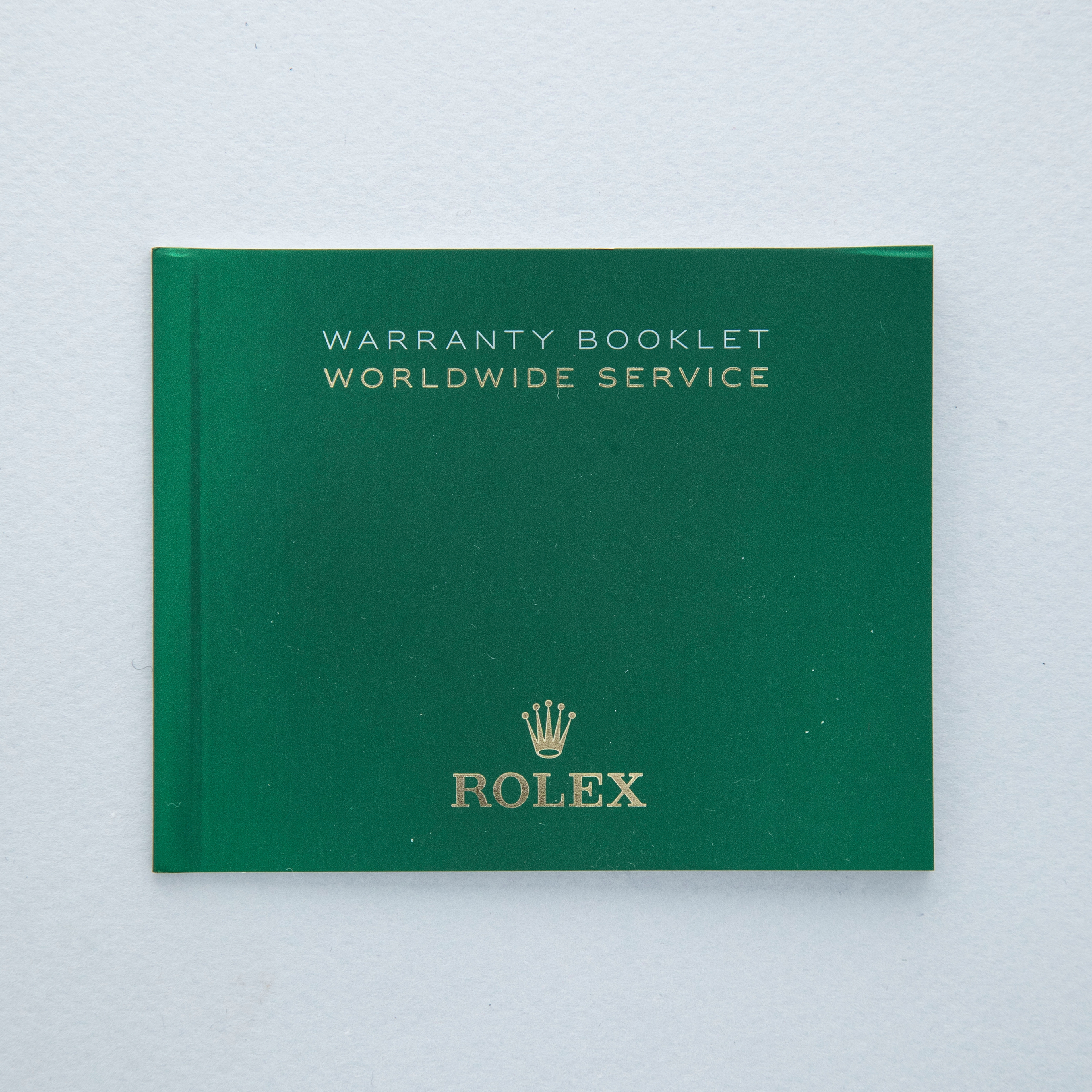 The watch is in like-new condition, showing only very light signs of wear. The case back stickers are still intact, as are some of the clasp blade stickers. There is light wear visible on the exterior of the clasp. The Oysterflex bracelet fits an approximately 6 1/2” wrist. The watch comes as a full set with boxes, warranty card, booklet, hangtags, and card holder.