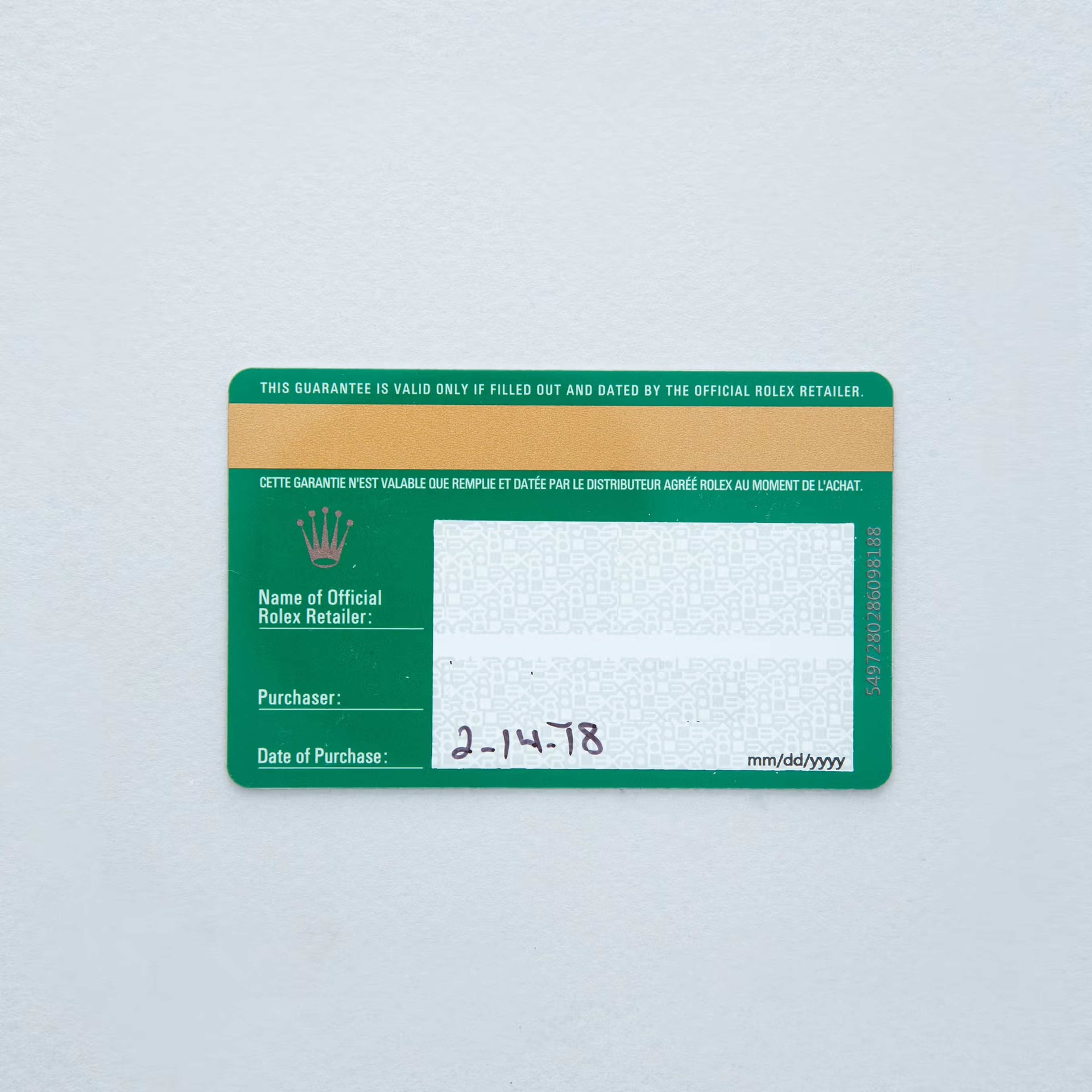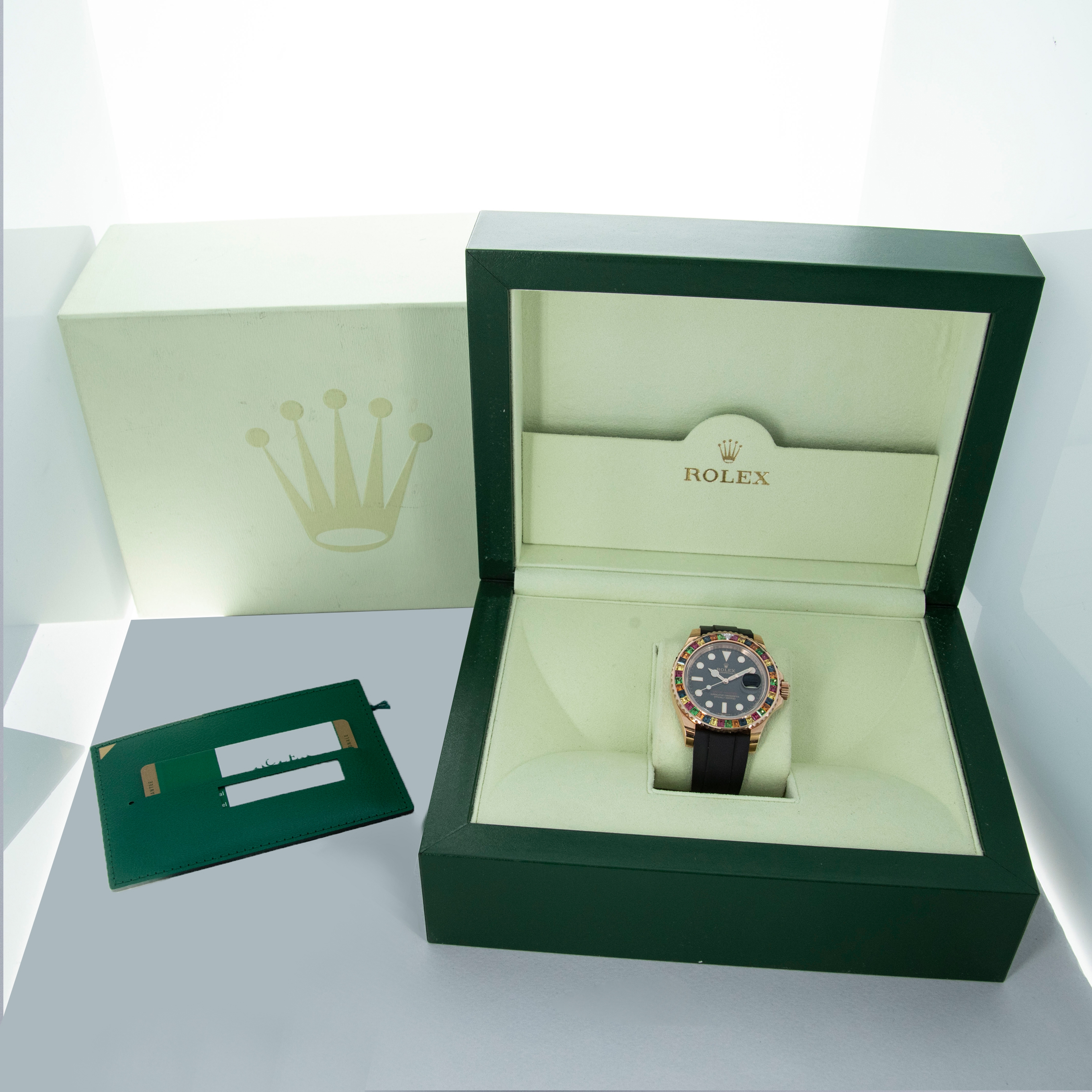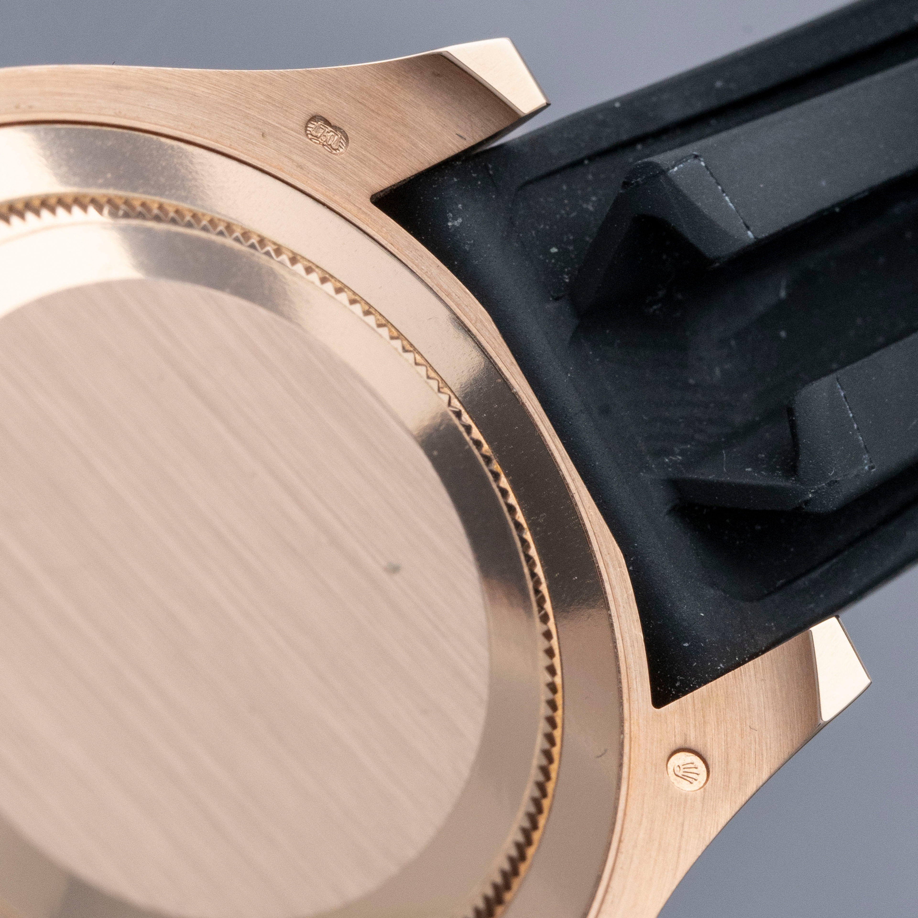 The watch is in like-new condition, showing only very light signs of wear. The case back stickers are still intact, as are some of the clasp blade stickers. There is light wear visible on the exterior of the clasp. The Oysterflex bracelet fits an approximately 6 1/2” wrist. The watch comes as a full set with boxes, warranty card, booklet, hangtags, and card holder.