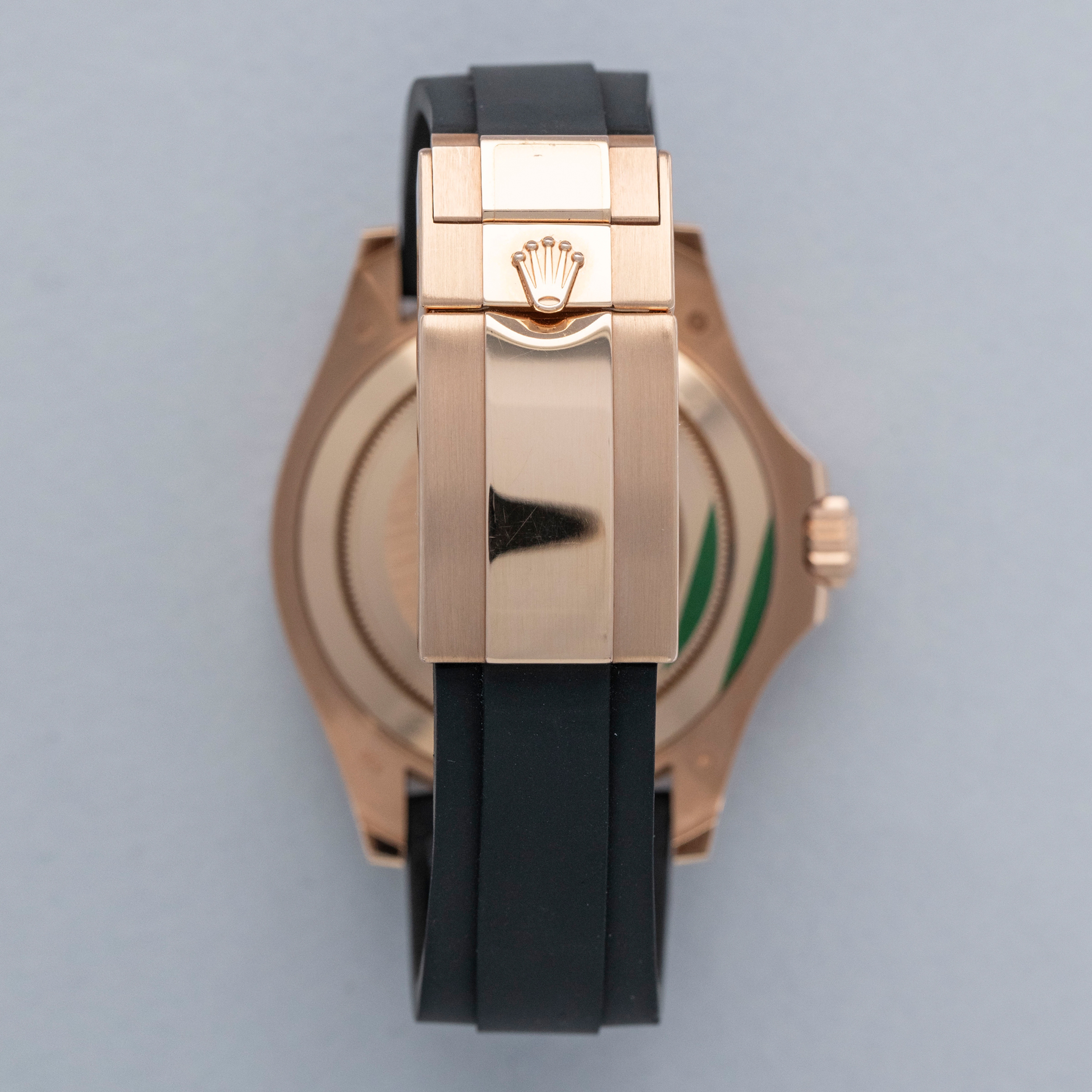 Released in 1992 as Rolex’s first all-new watch since the Daytona in 1963, the Yacht-Master was Rolex’s solution to creating a luxury-orientated version of their tool-watch-specific Submariner collection. Inspired by the Submariner’s dive watch credentials, the Yacht-Master introduced some subtle design details that set it apart as a yachting watch with a sporty yet luxurious aesthetic. To achieve this, Rolex gave the Yacht-Master bigger hands, more prominent hour markers, smoother edges with finer beveling, and a solid bi-directional metal bezel with an engraved inlay that, while functional, provided a fashionable statement on the wrist as the bezel caught the light. In 2015 Rolex decided to update the Yacht-Master collection with one of Rolex’s largest deviations from their typically restrained aesthetic in a long time by swapping the collection’s precious metal bezel for a new matte ceramic version and the brand’s new innovative take on the humble rubber strap; the Oysterflex. Made of black rubber with a titanium core, the Oysterflex is not as it seems. While it wears and functions like a rubber strap thanks to its outer shell, it provides all of the safety that a bracelet would, thanks to the continuous strip of titanium that runs through it. With vents on the rear providing airflow to the wrist, the Oysterflex compounds upon the Yacht-Master’s tool watch credentials, but with its sleek black aesthetic that casually contrasts its elegant precious metal construction. Offered as a particularly rare variant of the Yacht-Master, the ref. 116659SATS “Skittles” that we have here boasts a sapphire rainbow-set bezel instead of the Yacht-Master’s matter ceramic bezel, giving the watch an incredibly luxurious presence on the wrist.