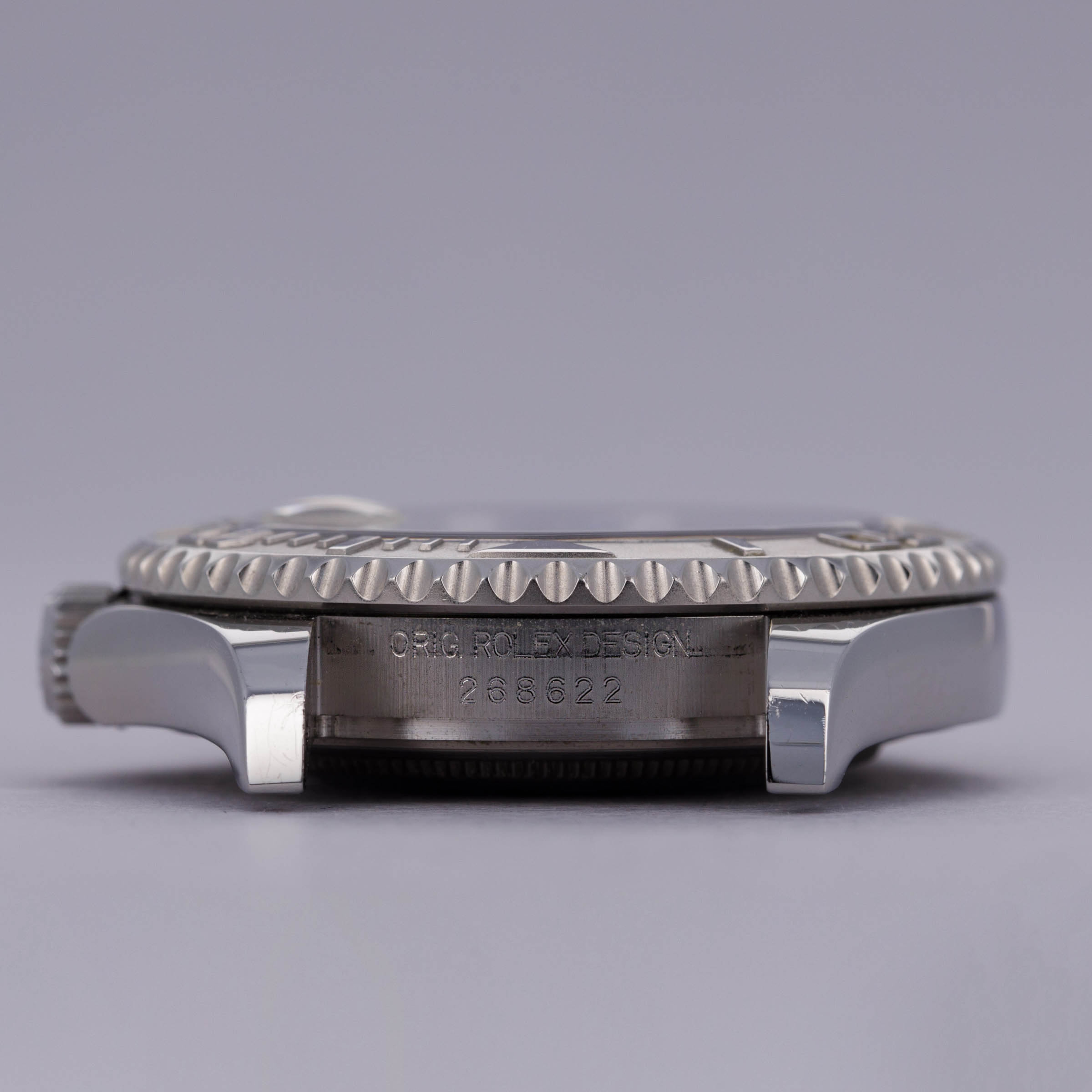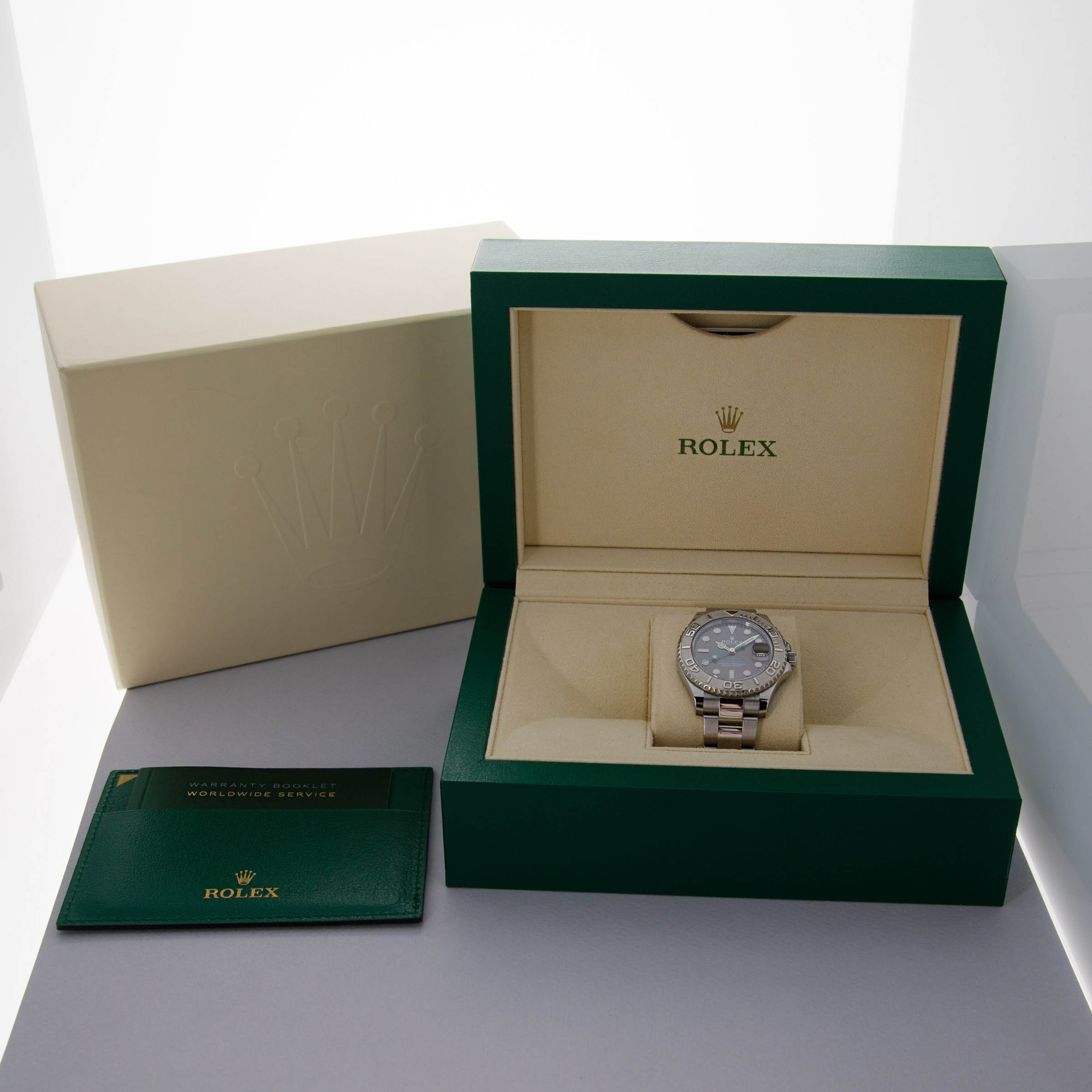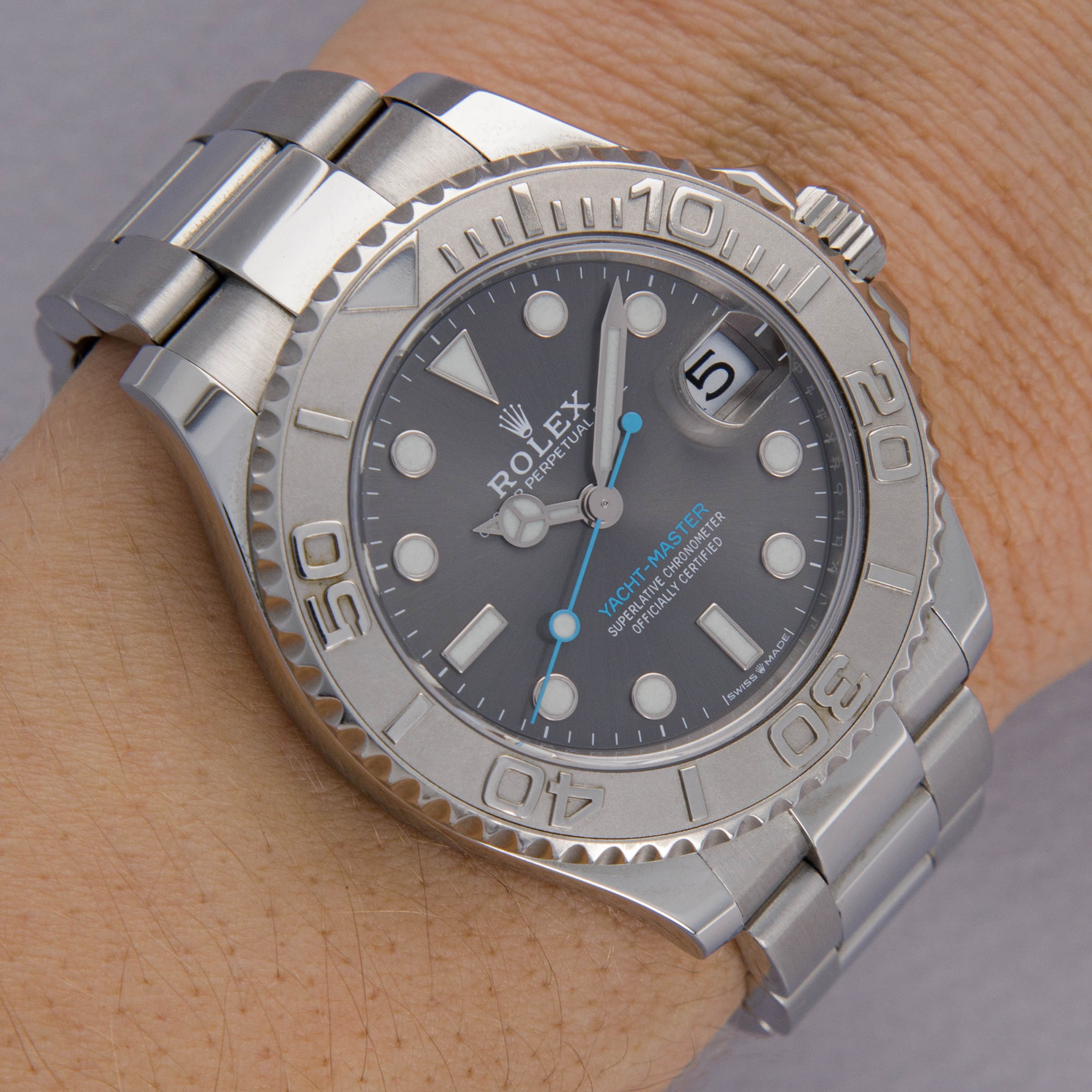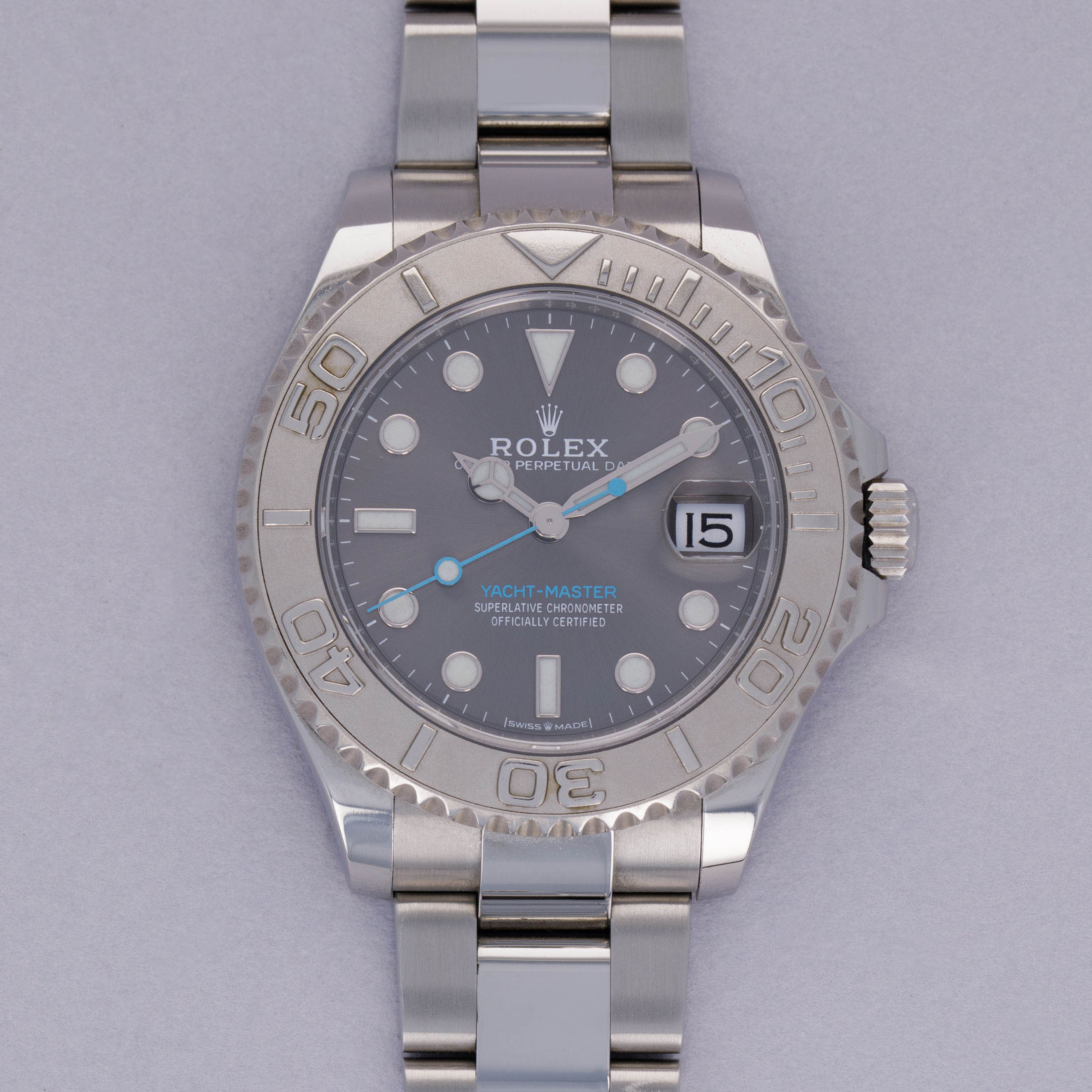 Boasting a stunning rhodium grey dial with a sunburst finish and beautiful blue accents, the Yacht-Master's display perfectly matches the platinum bezel that surrounds it.