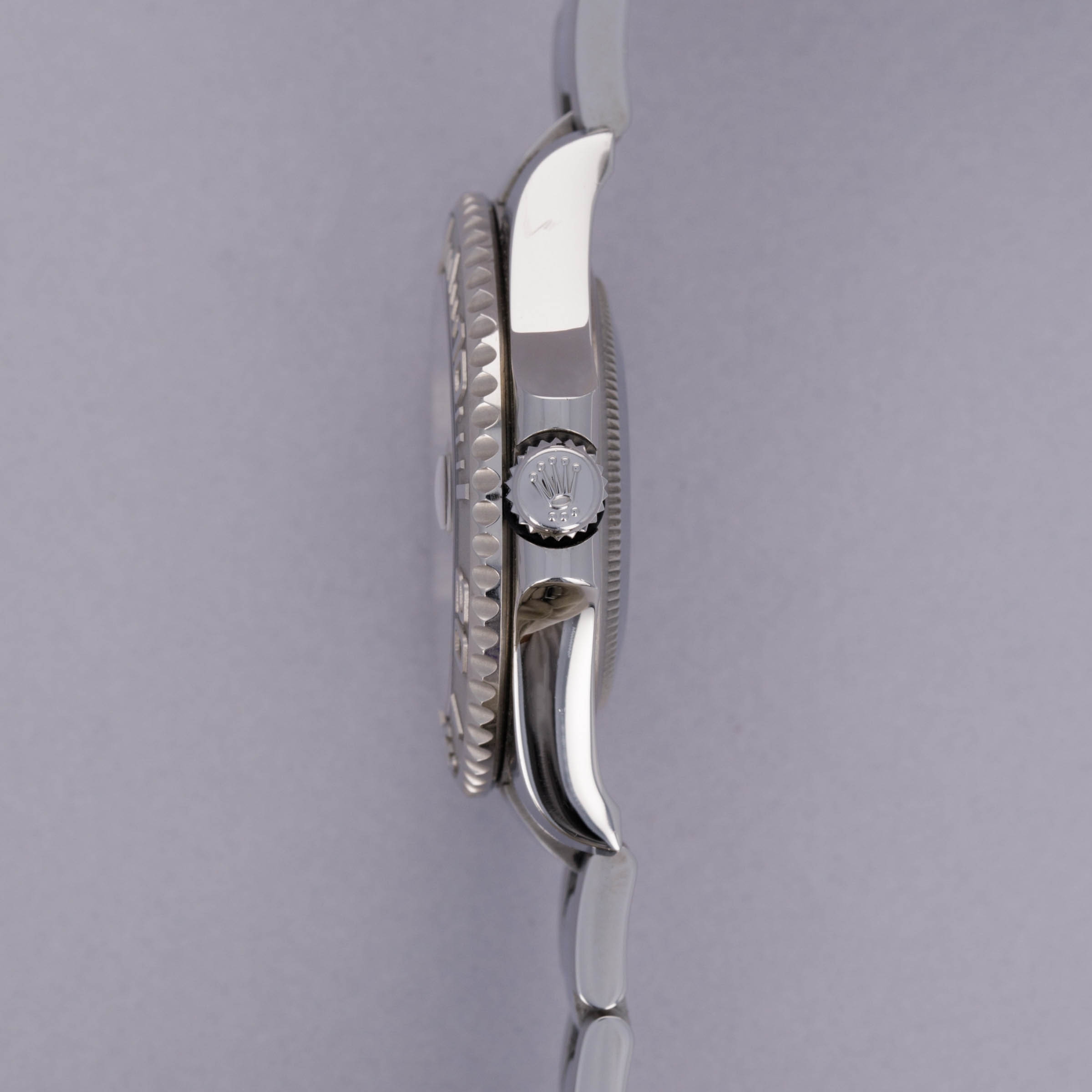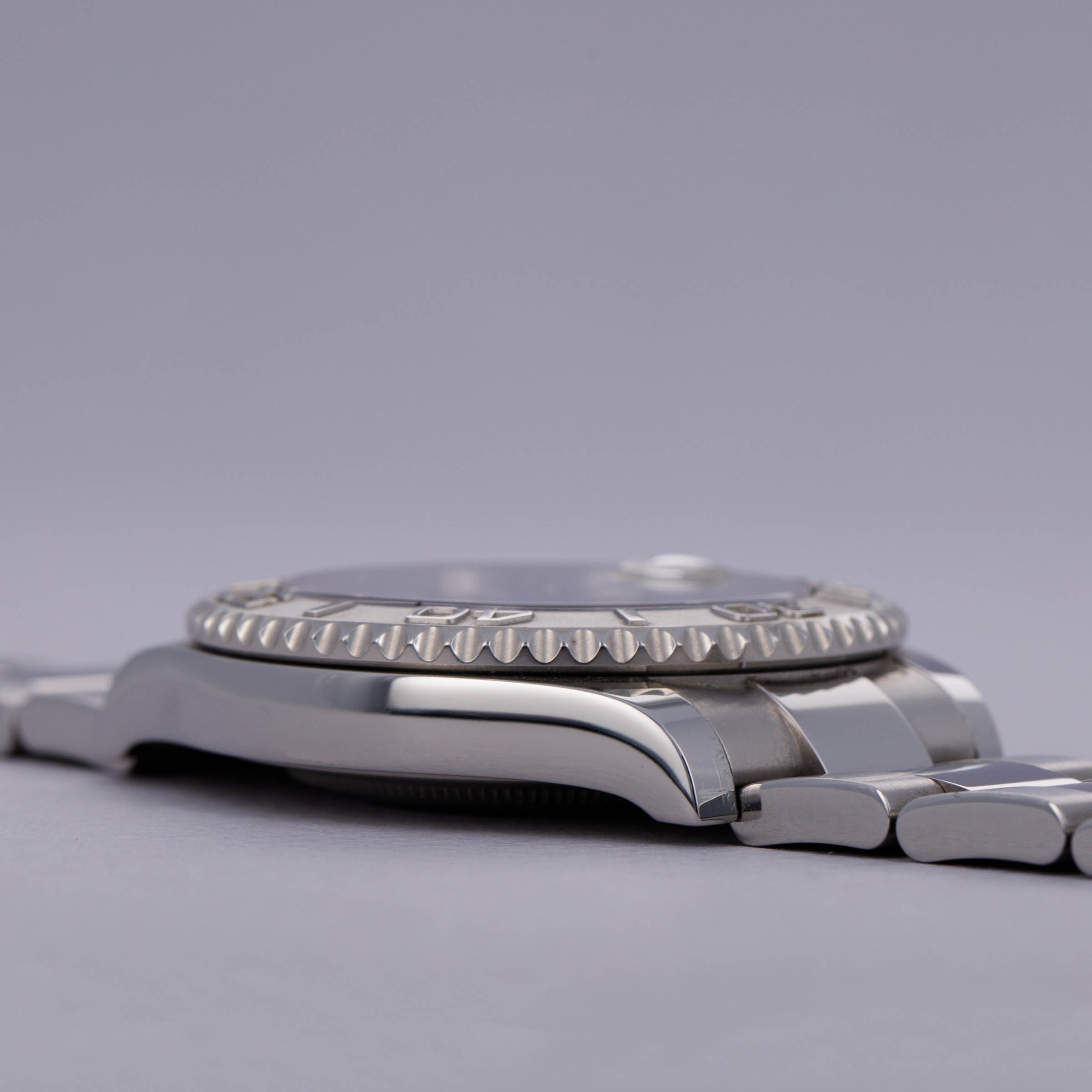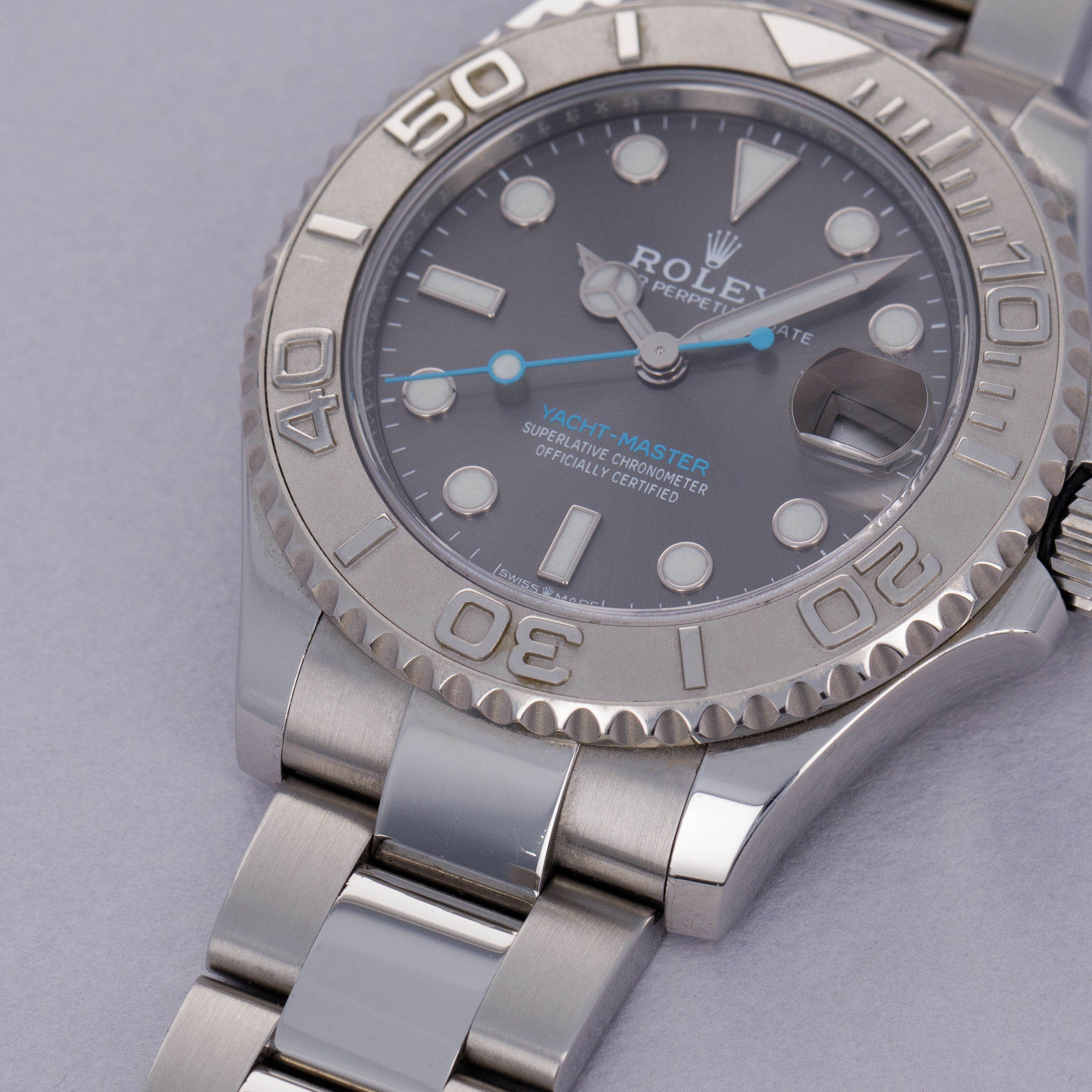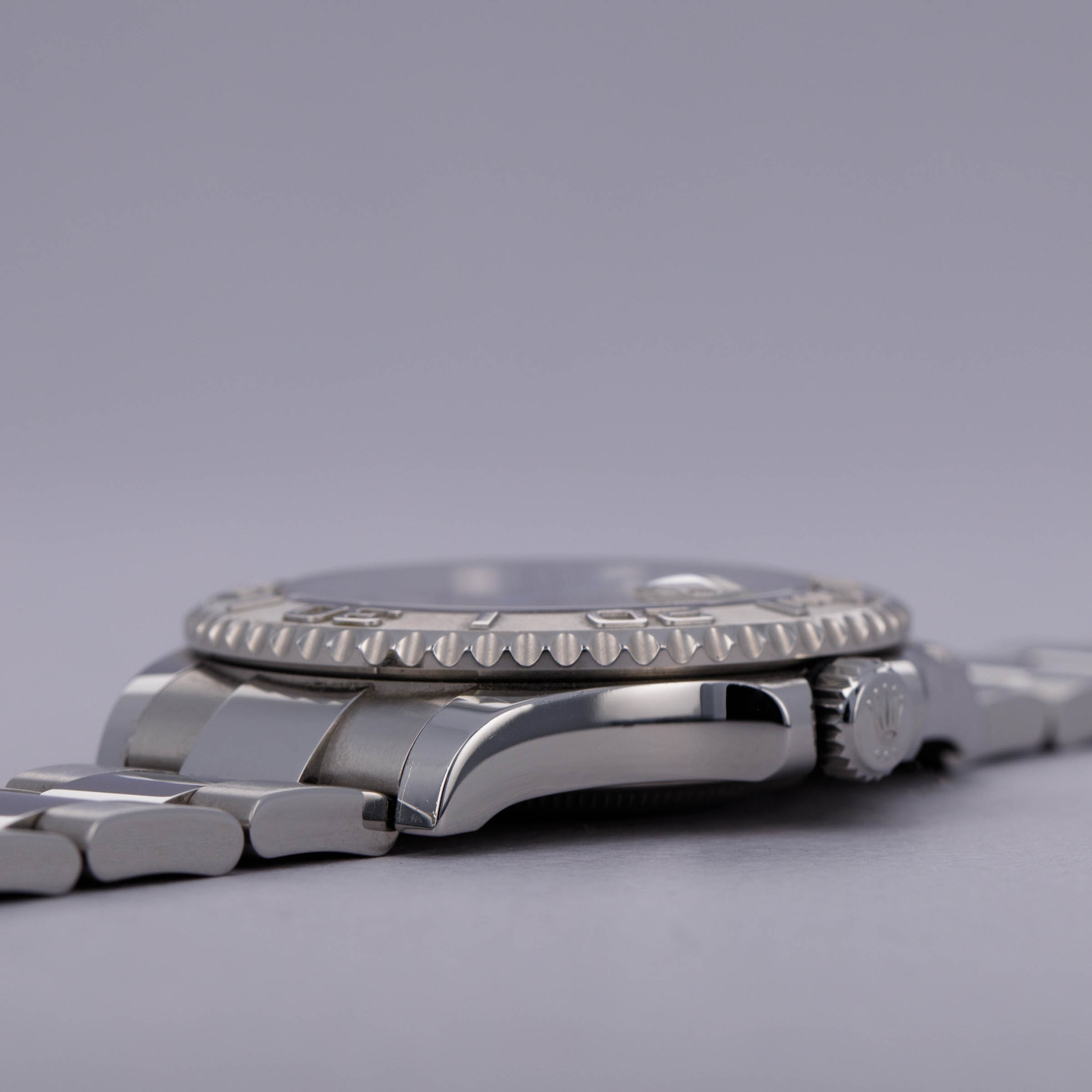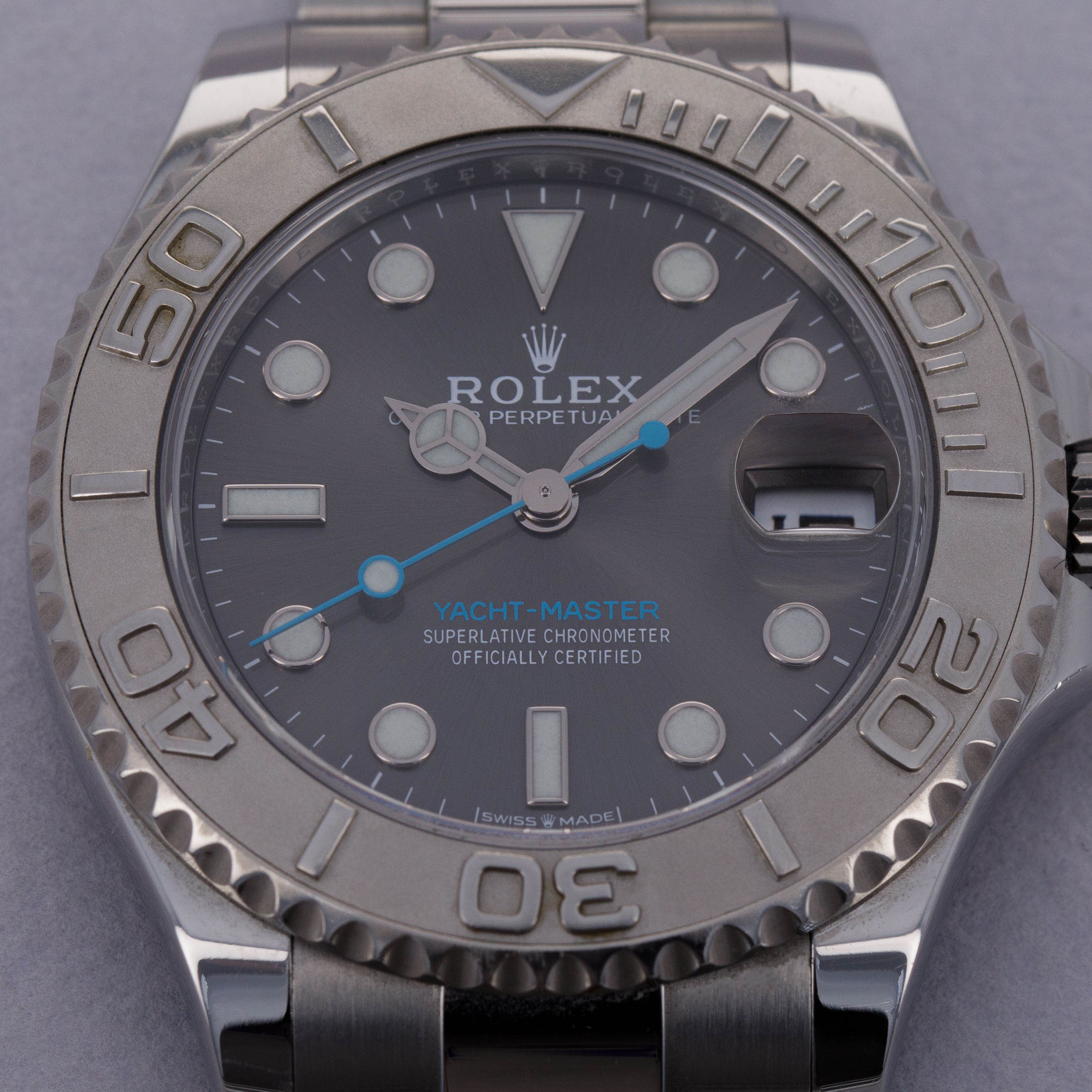 Boasting a stunning rhodium grey dial with a sunburst finish and beautiful blue accents, the Yacht-Master's display perfectly matches the platinum bezel that surrounds it.