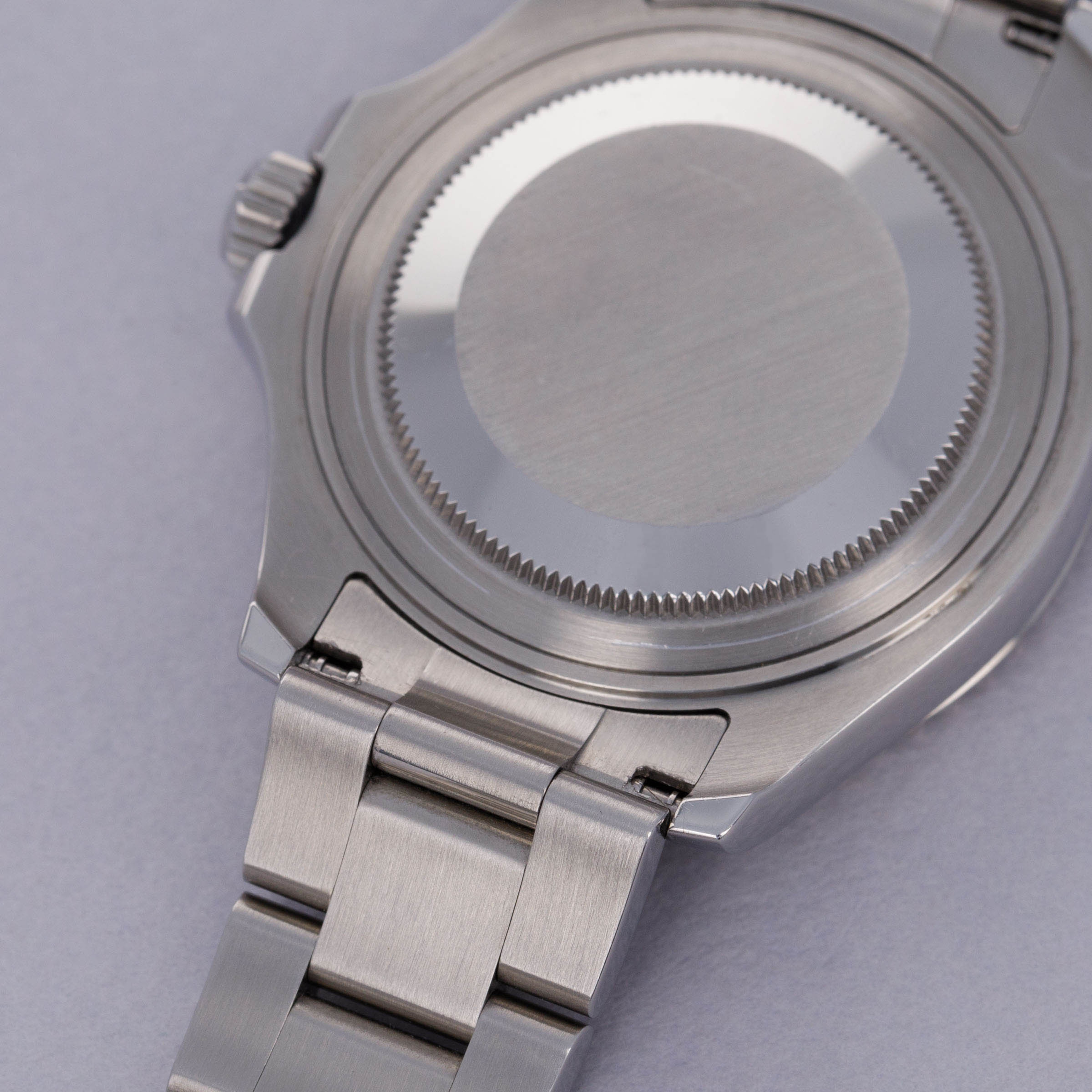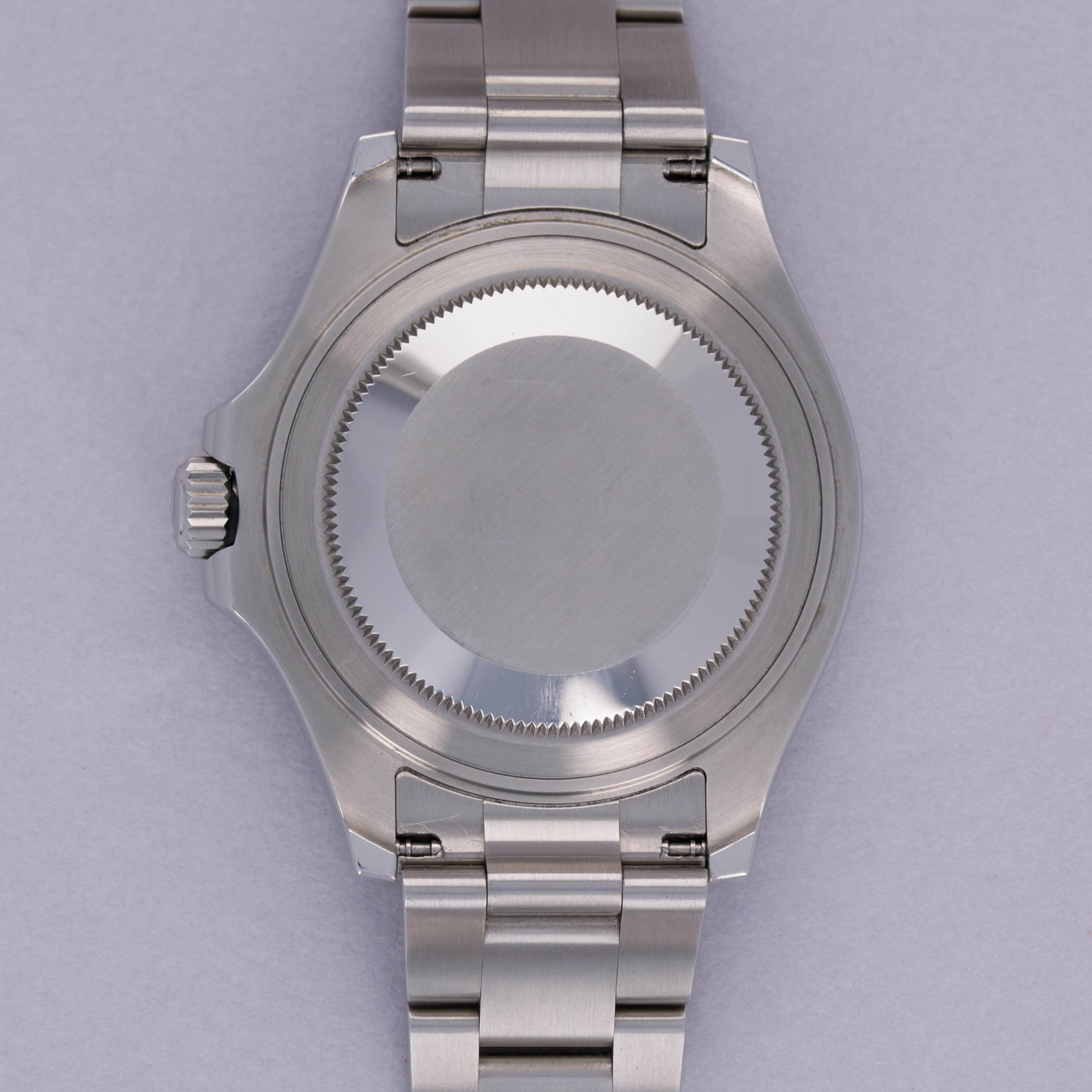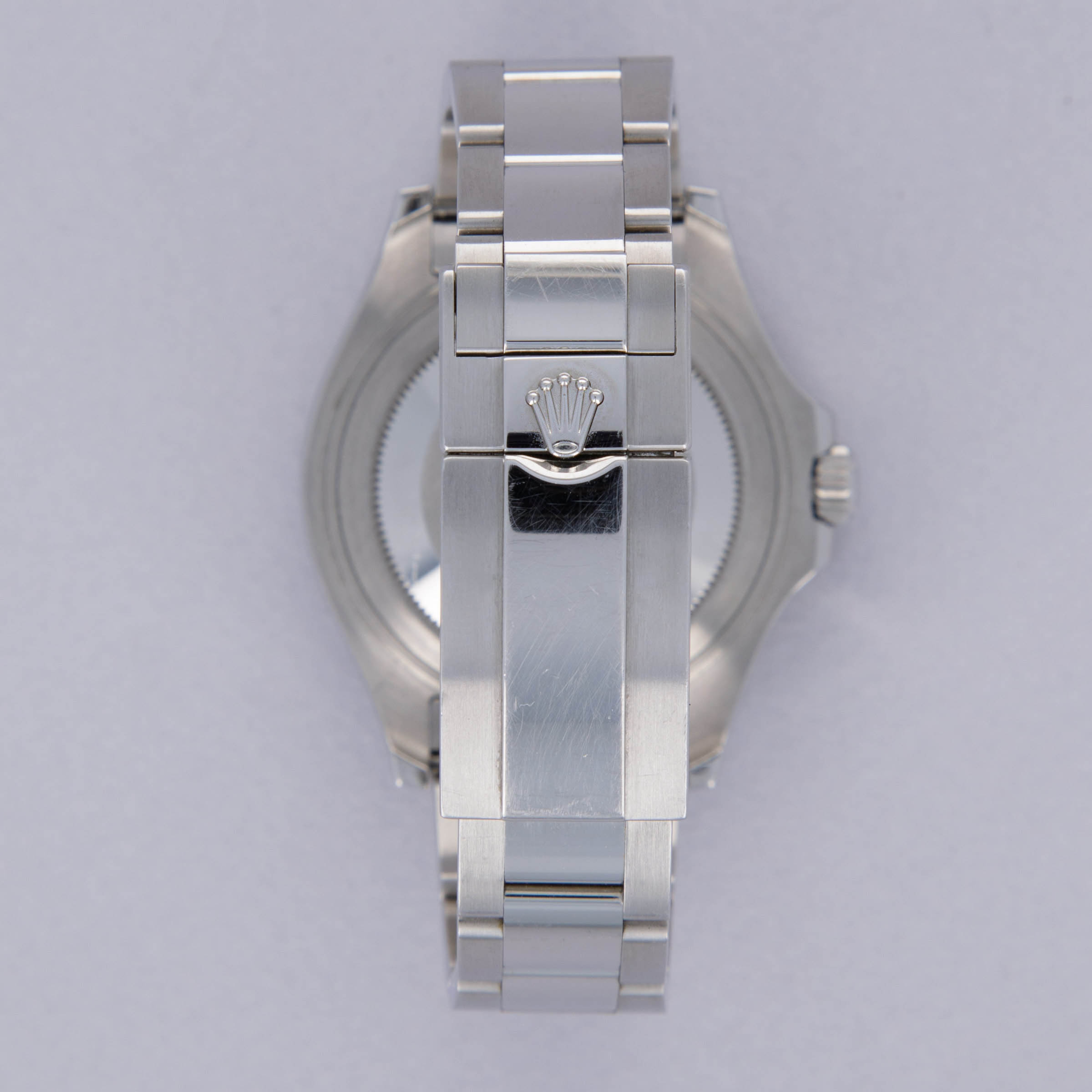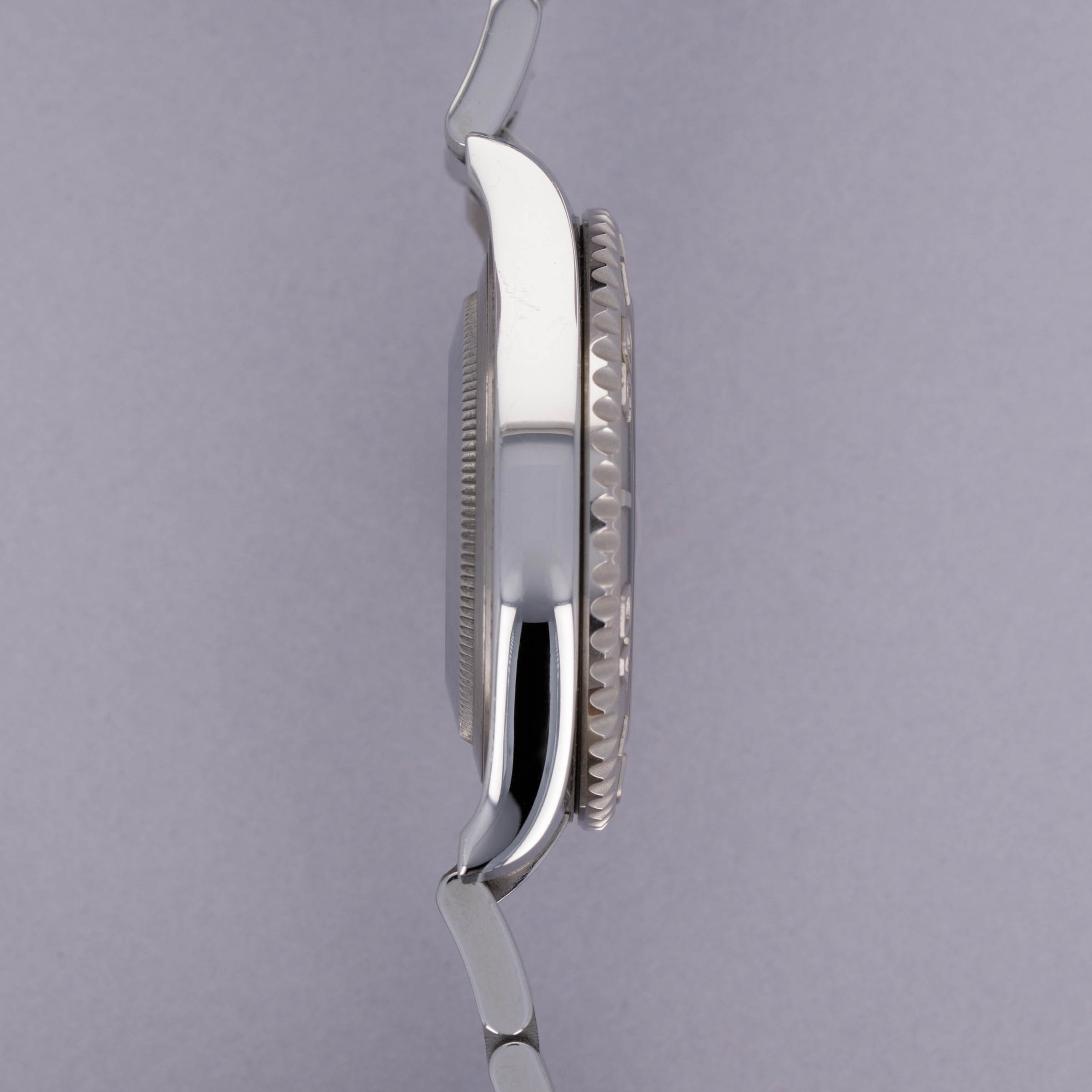 Boasting a stunning rhodium grey dial with a sunburst finish and beautiful blue accents, the Yacht-Master's display perfectly matches the platinum bezel that surrounds it.