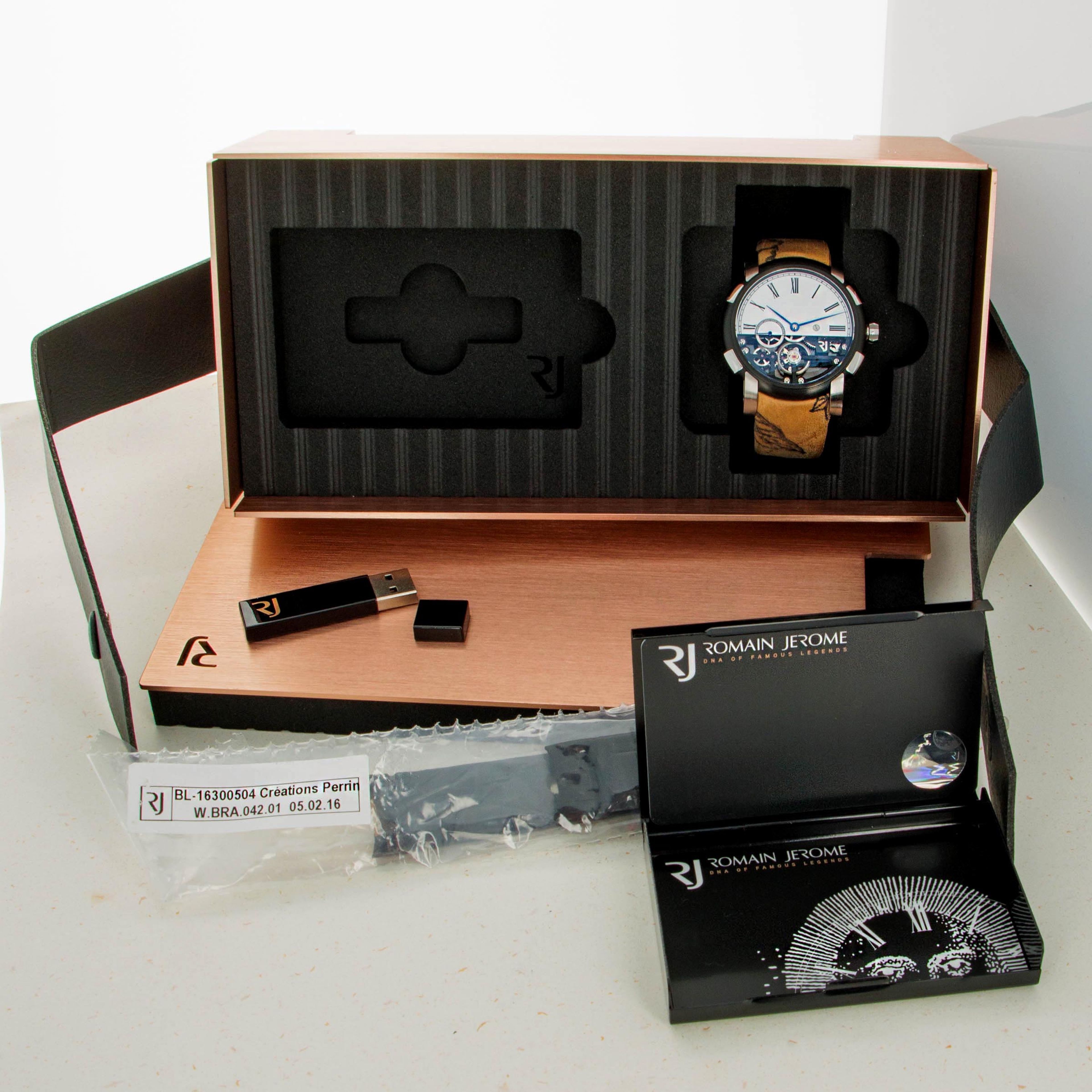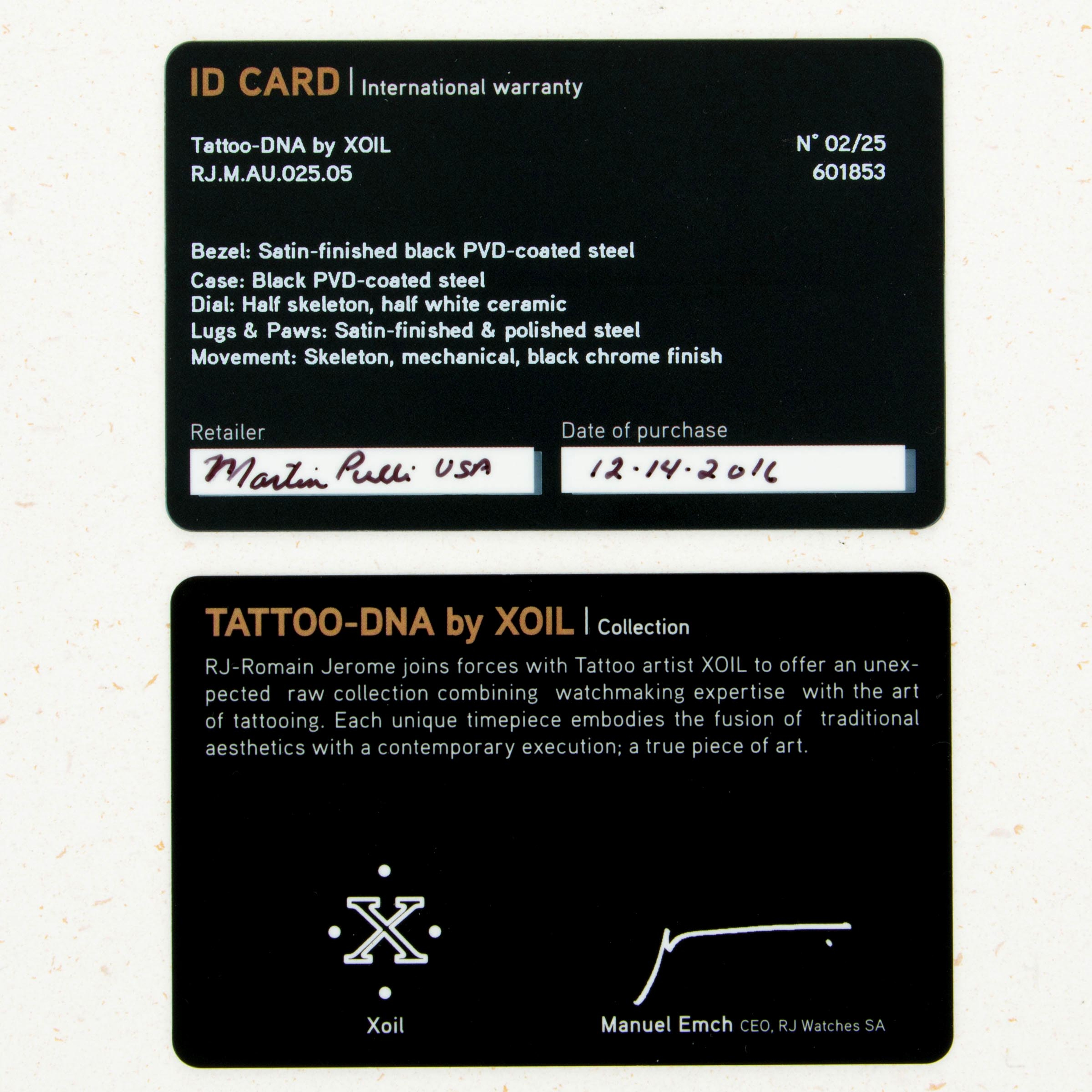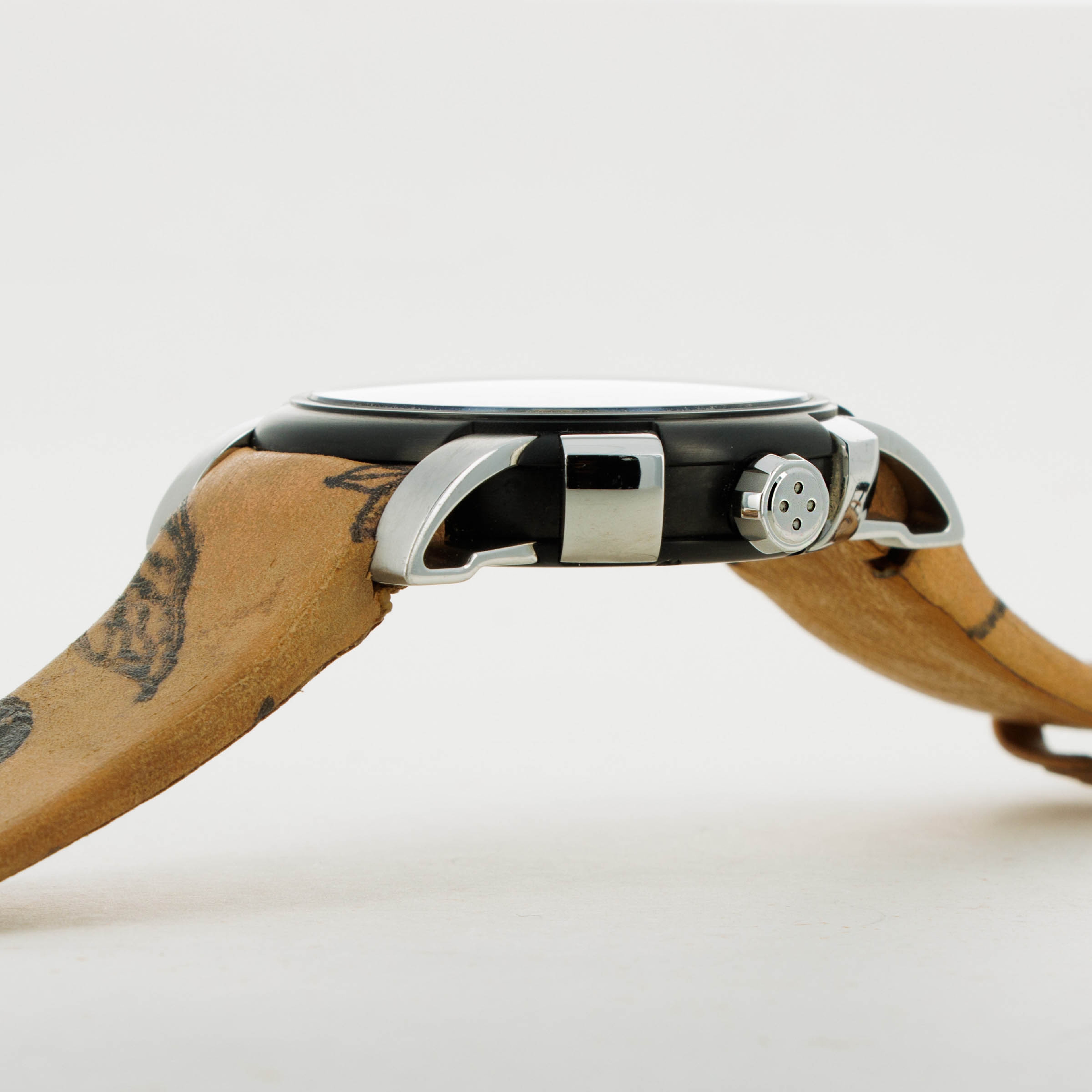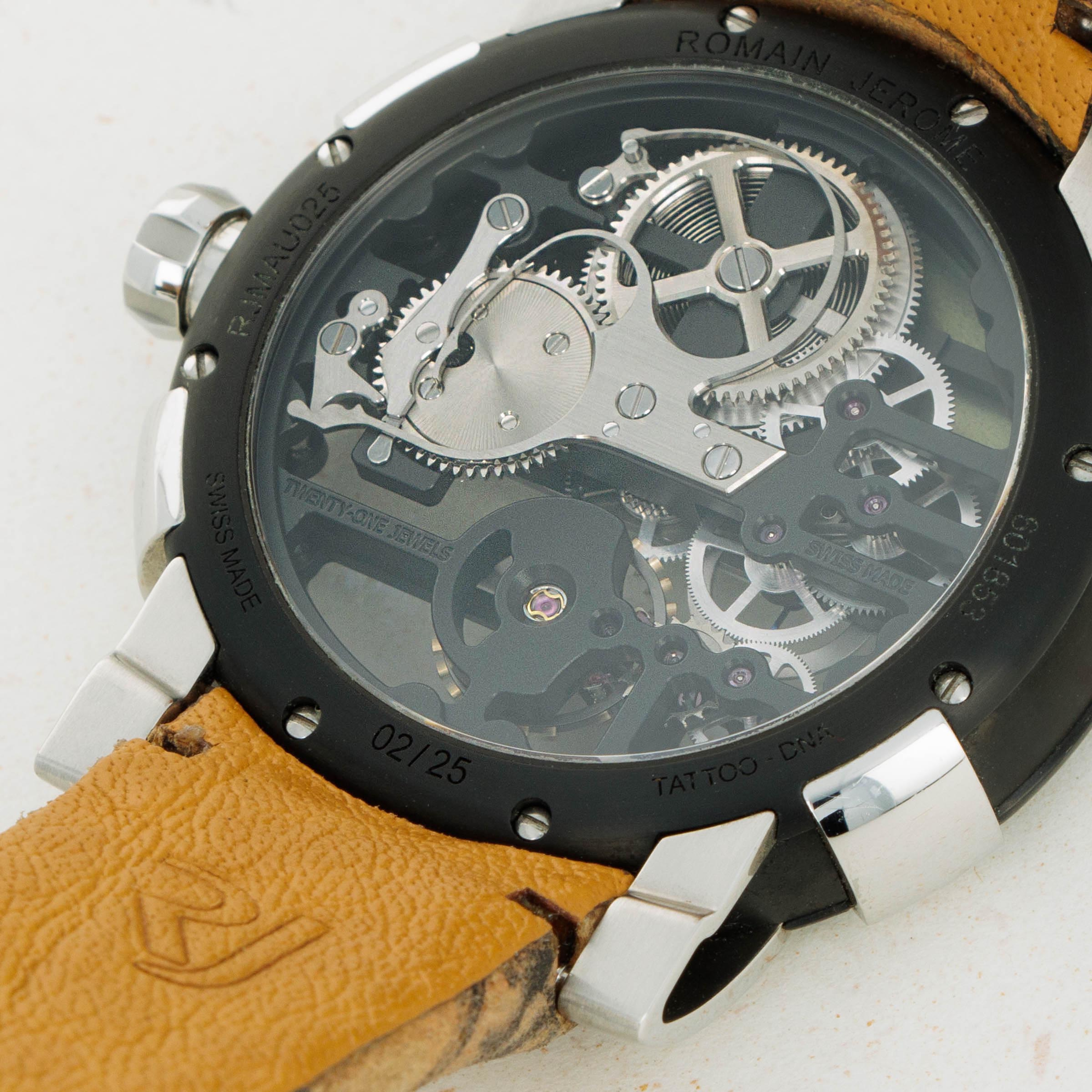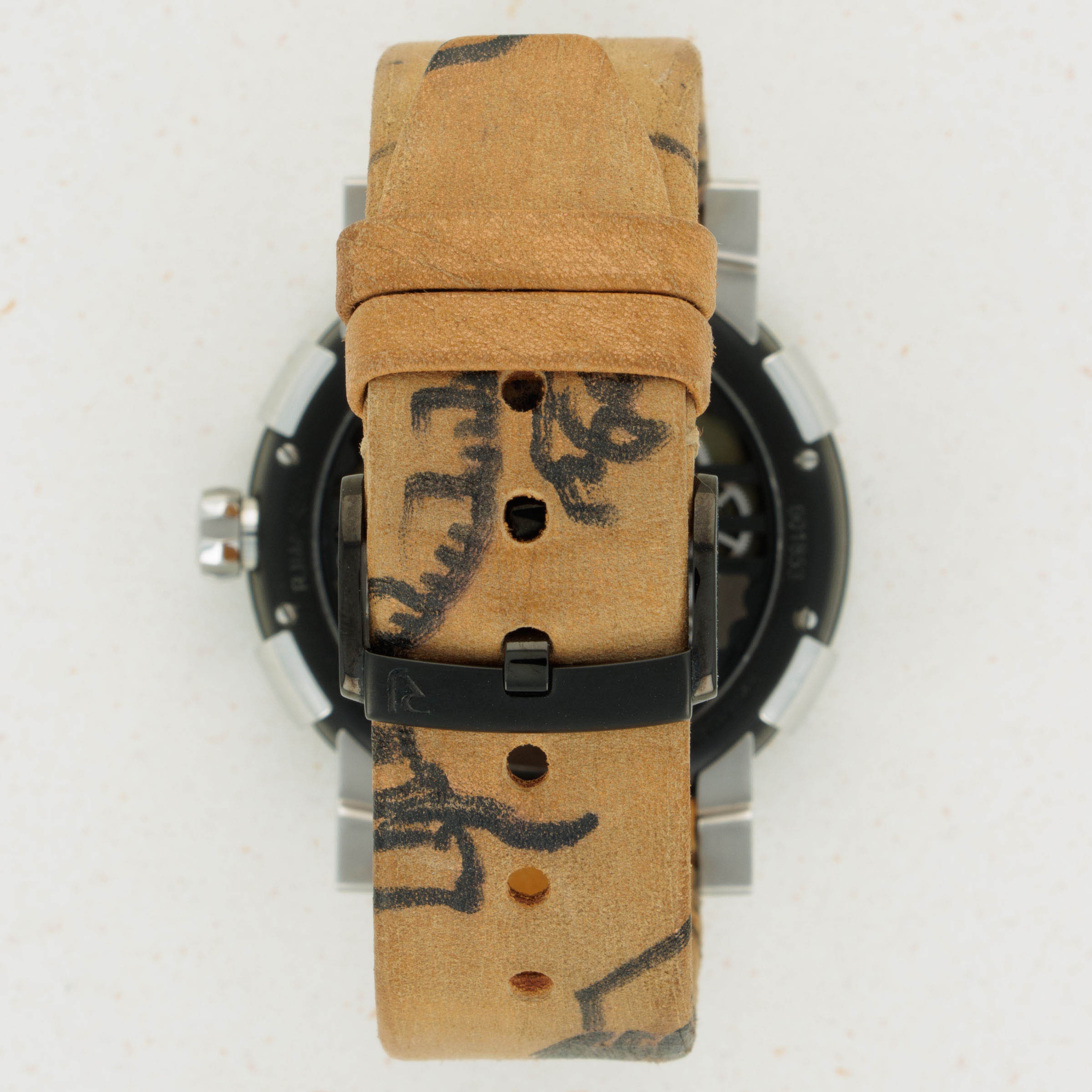 An exceptionally rare watch, the Tattoo - DNA is unique in both its aesthetic and ability to challenge norms within the watchmaking industry. With its tattooed straps, unique dial design, and interesting hands, it is unmistakable as a Romain Jerome timepiece.