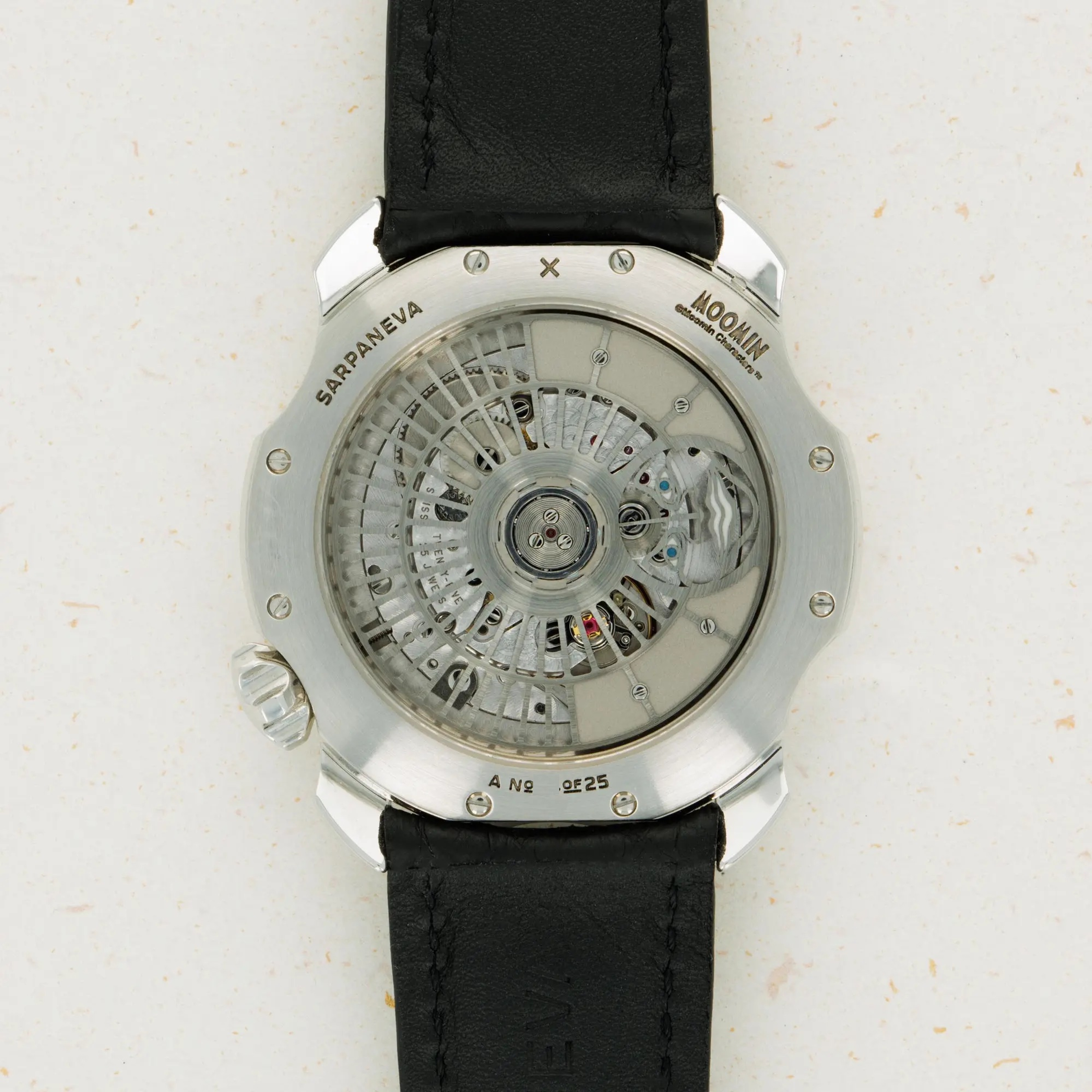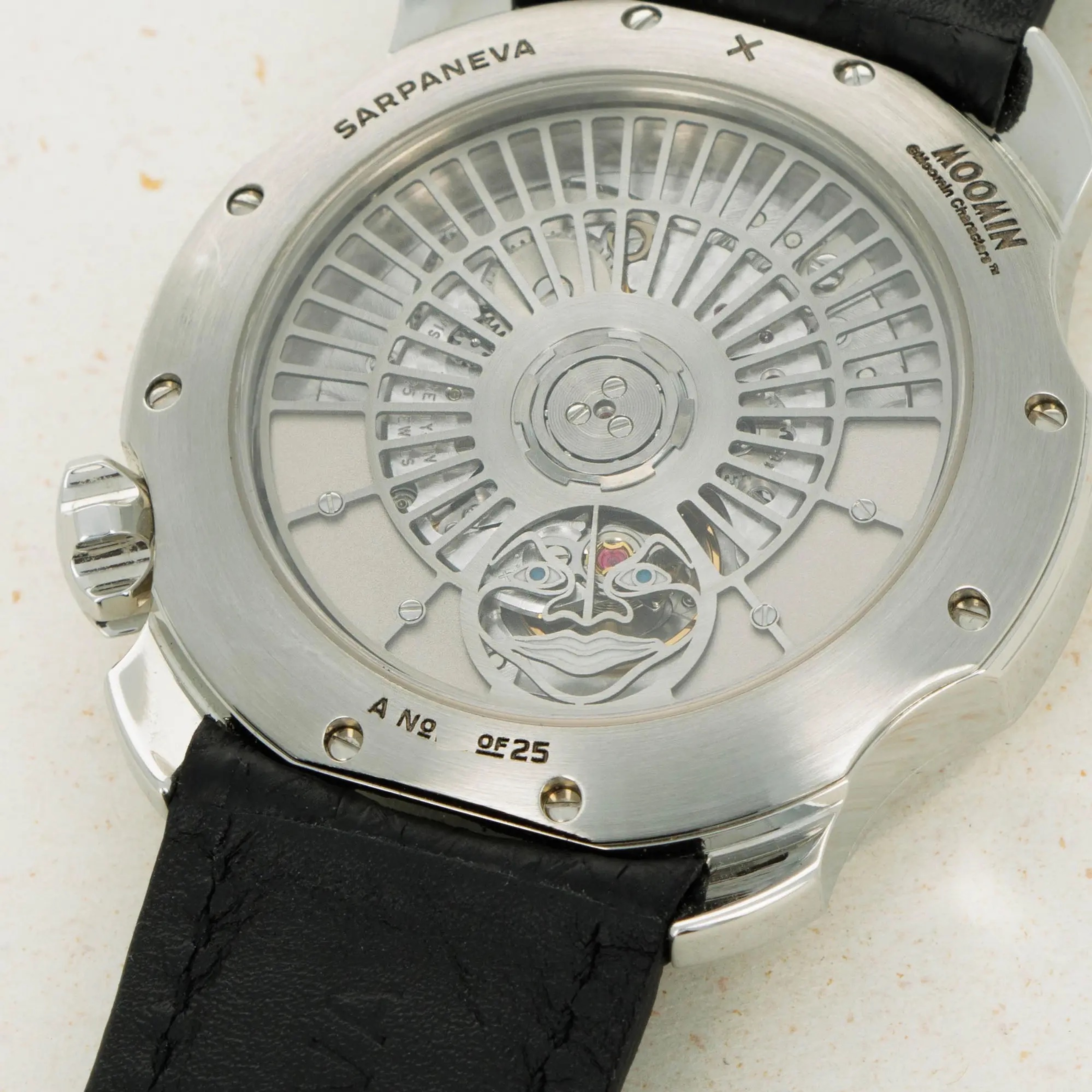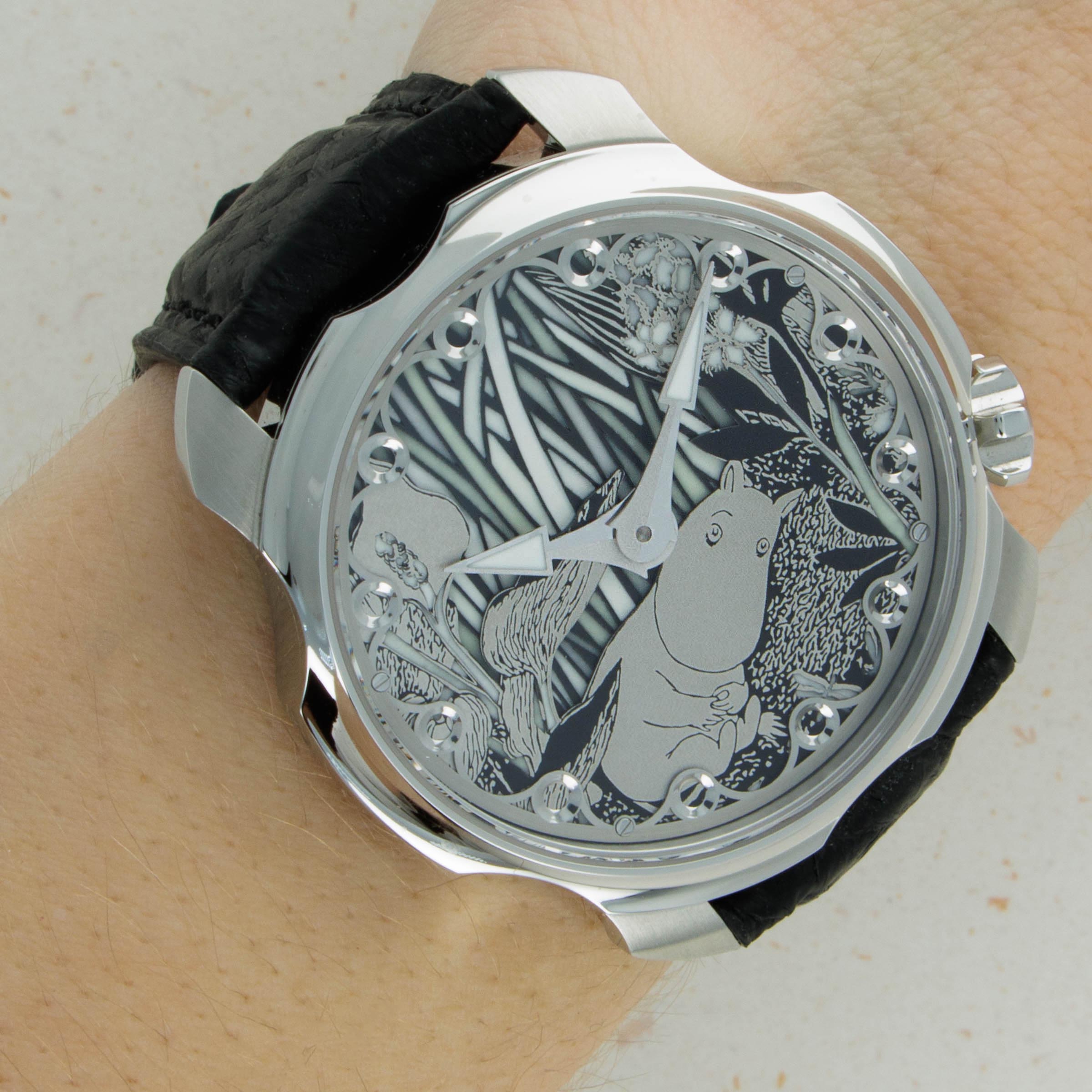 Not ones to half-do a job, Sarpaneva made sure to fit the Moomin with a movement fit for the incredible dial they gave the watch, and so its cal. A10 soprod movement is fitted with a custom skeletonised winding rotor with Sarpaneva's moon face logo.