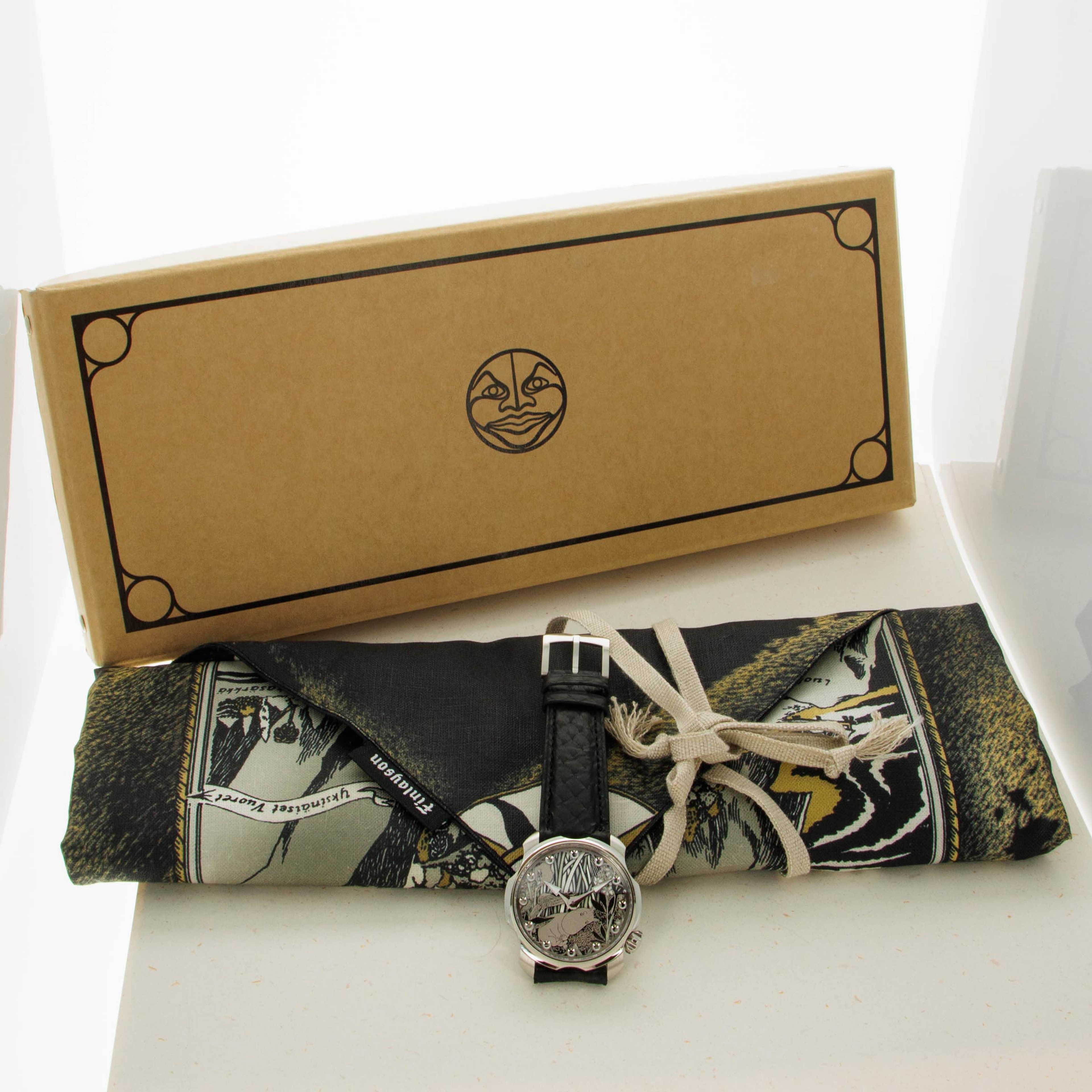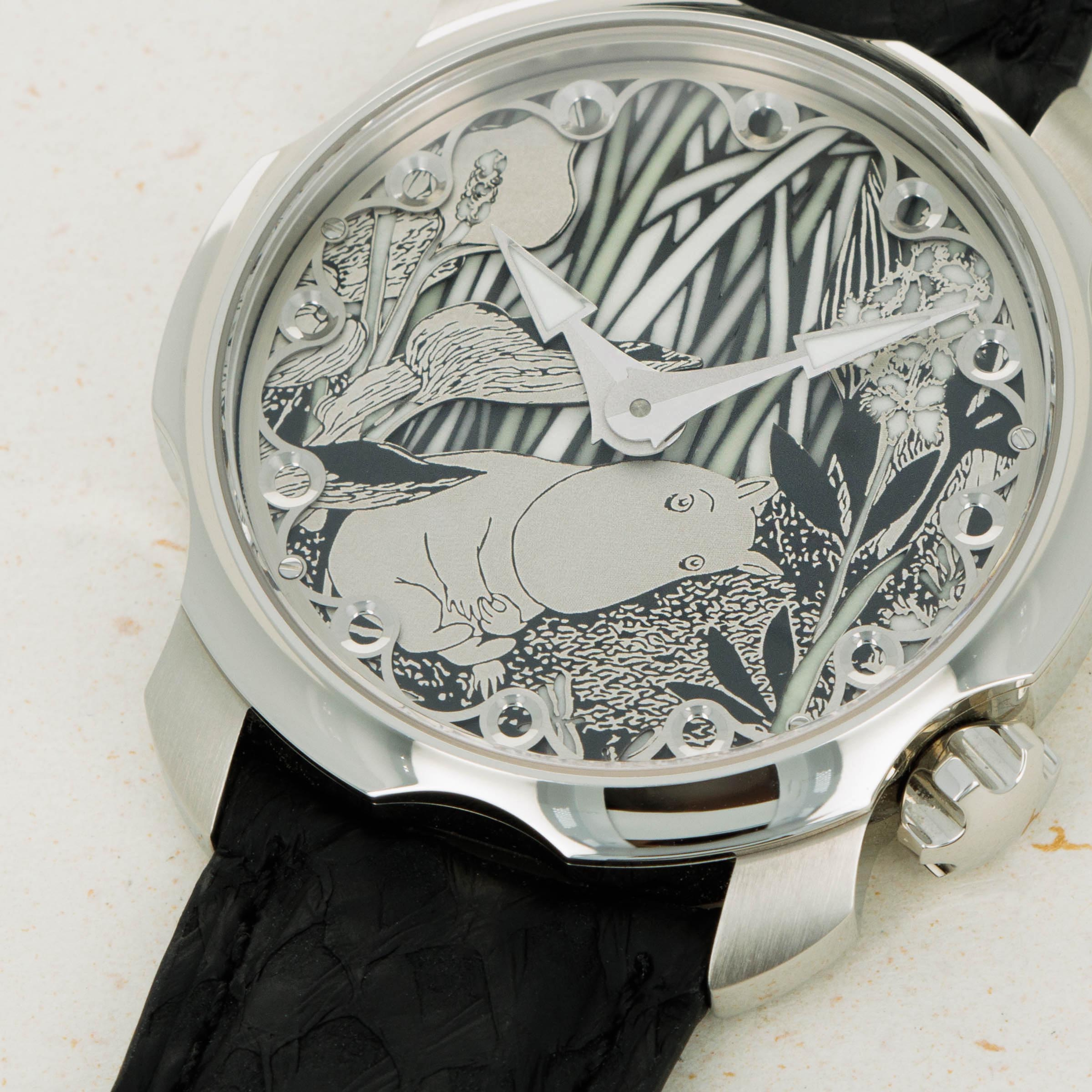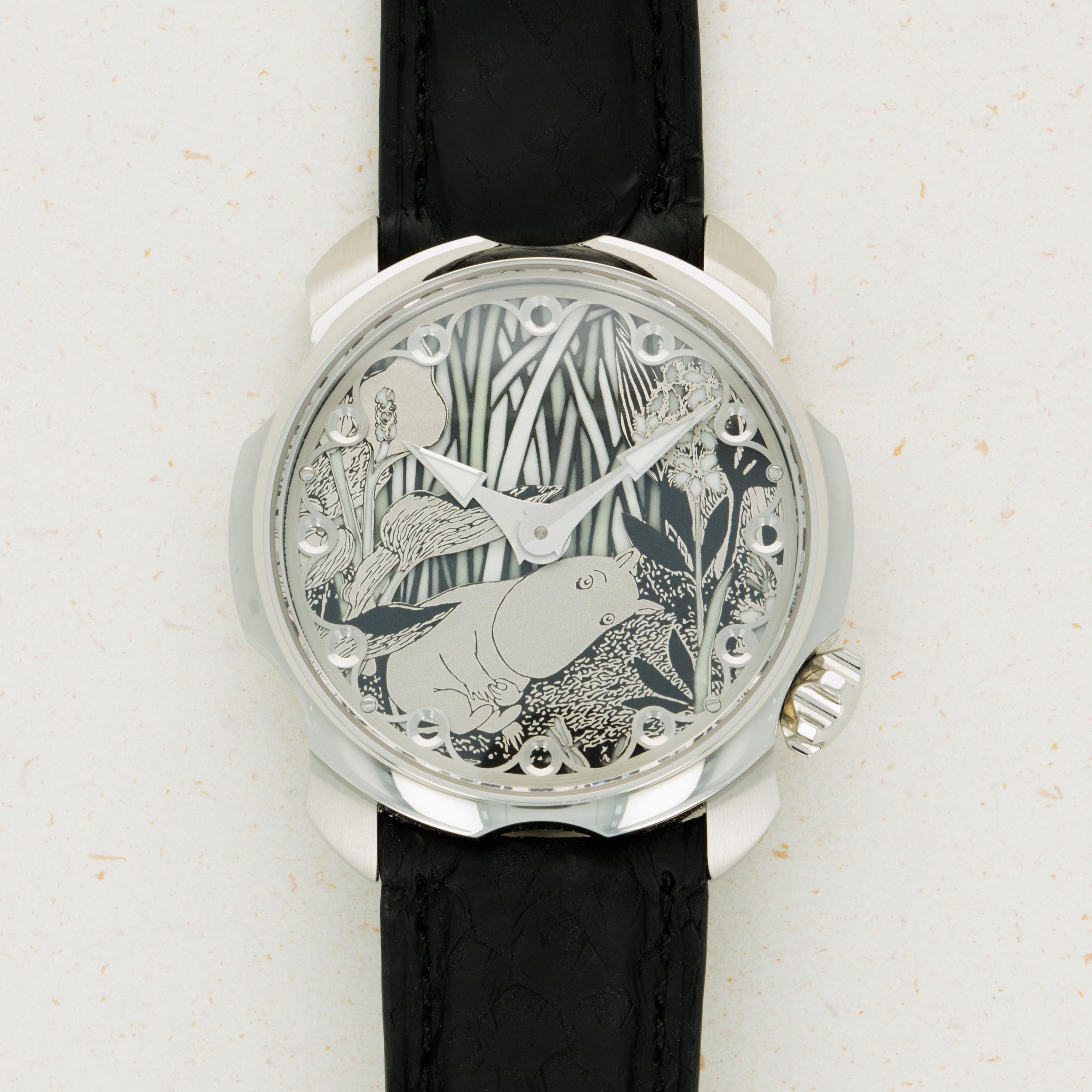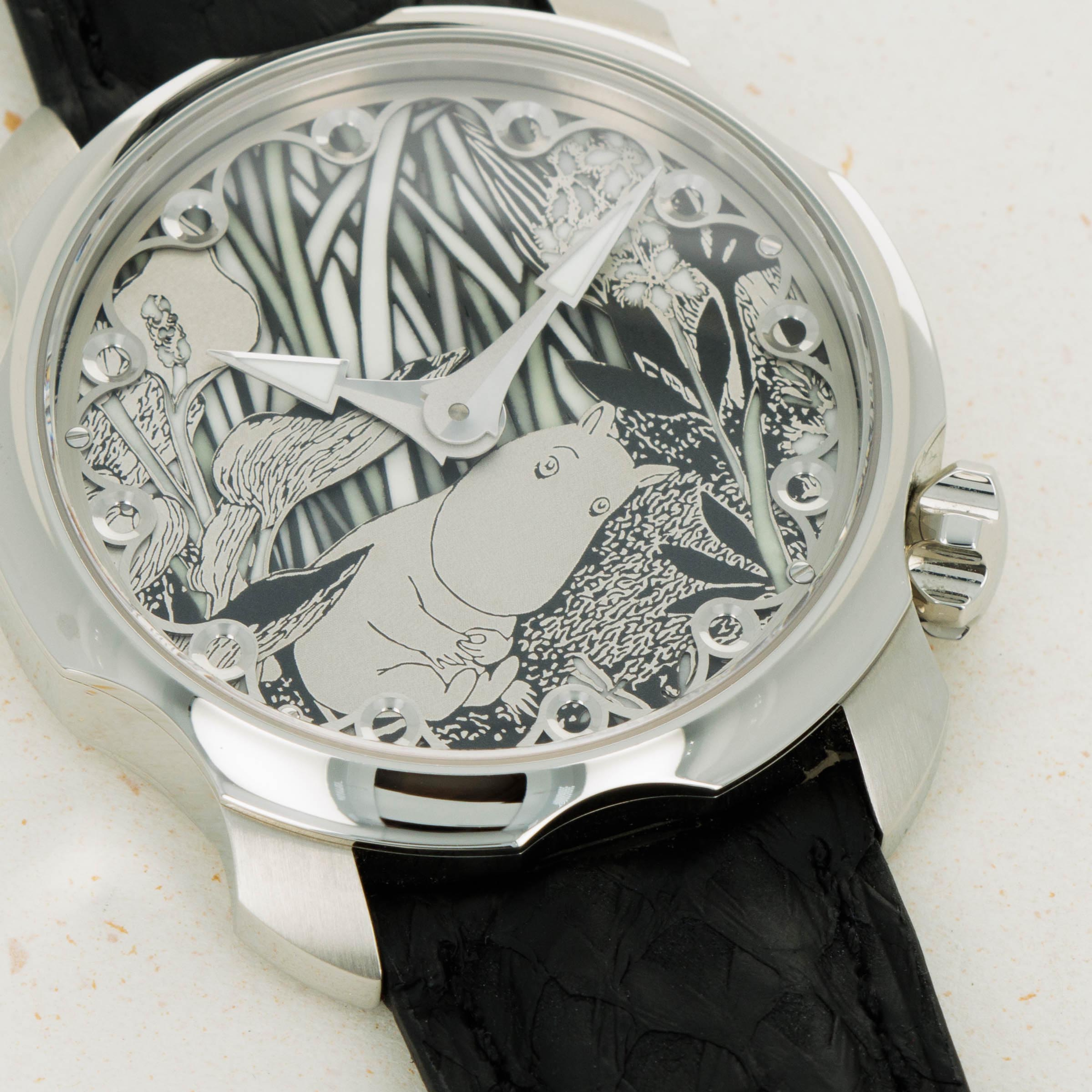 Not ones to half-do a job, Sarpaneva made sure to fit the Moomin with a movement fit for the incredible dial they gave the watch, and so its cal. A10 soprod movement is fitted with a custom skeletonised winding rotor with Sarpaneva's moon face logo.