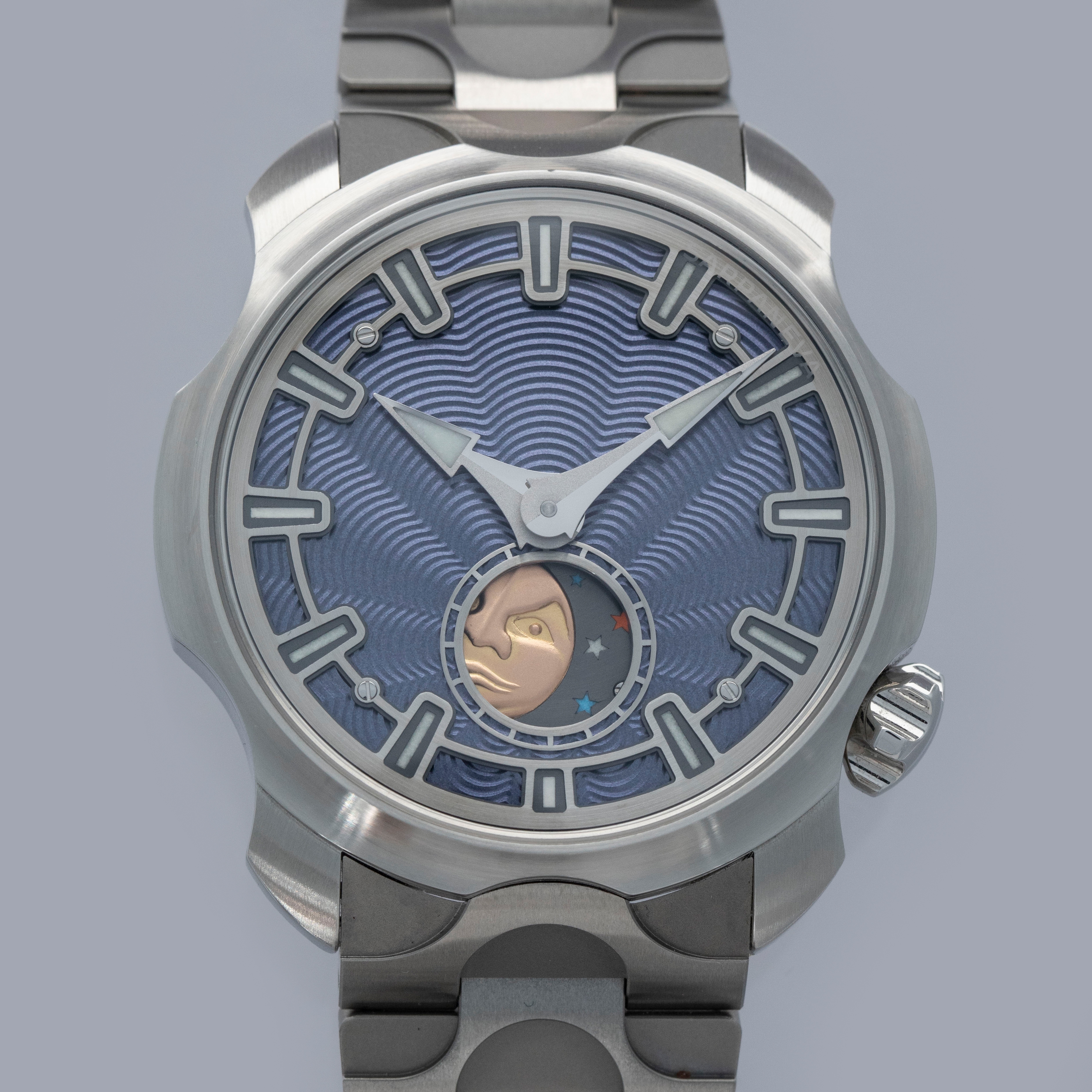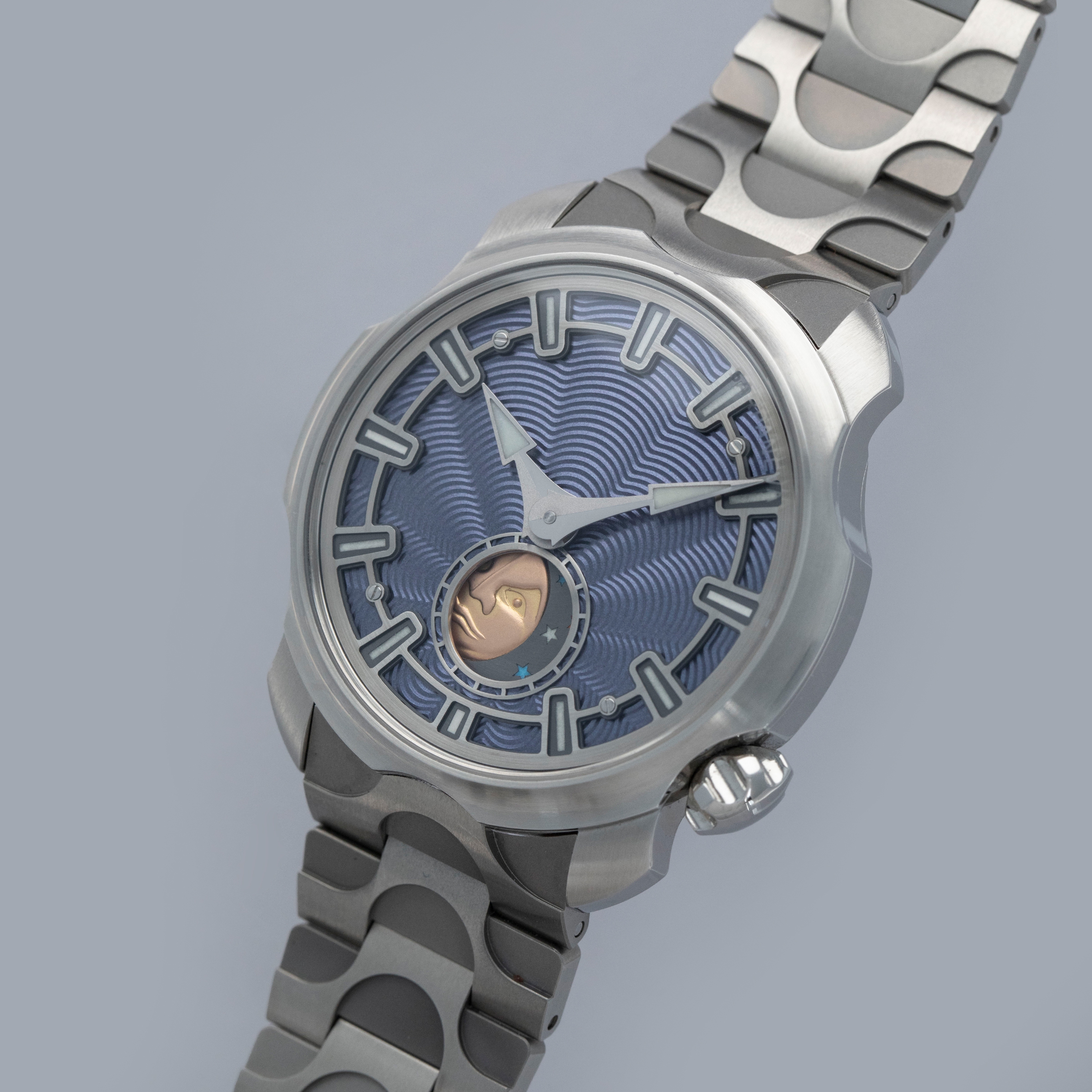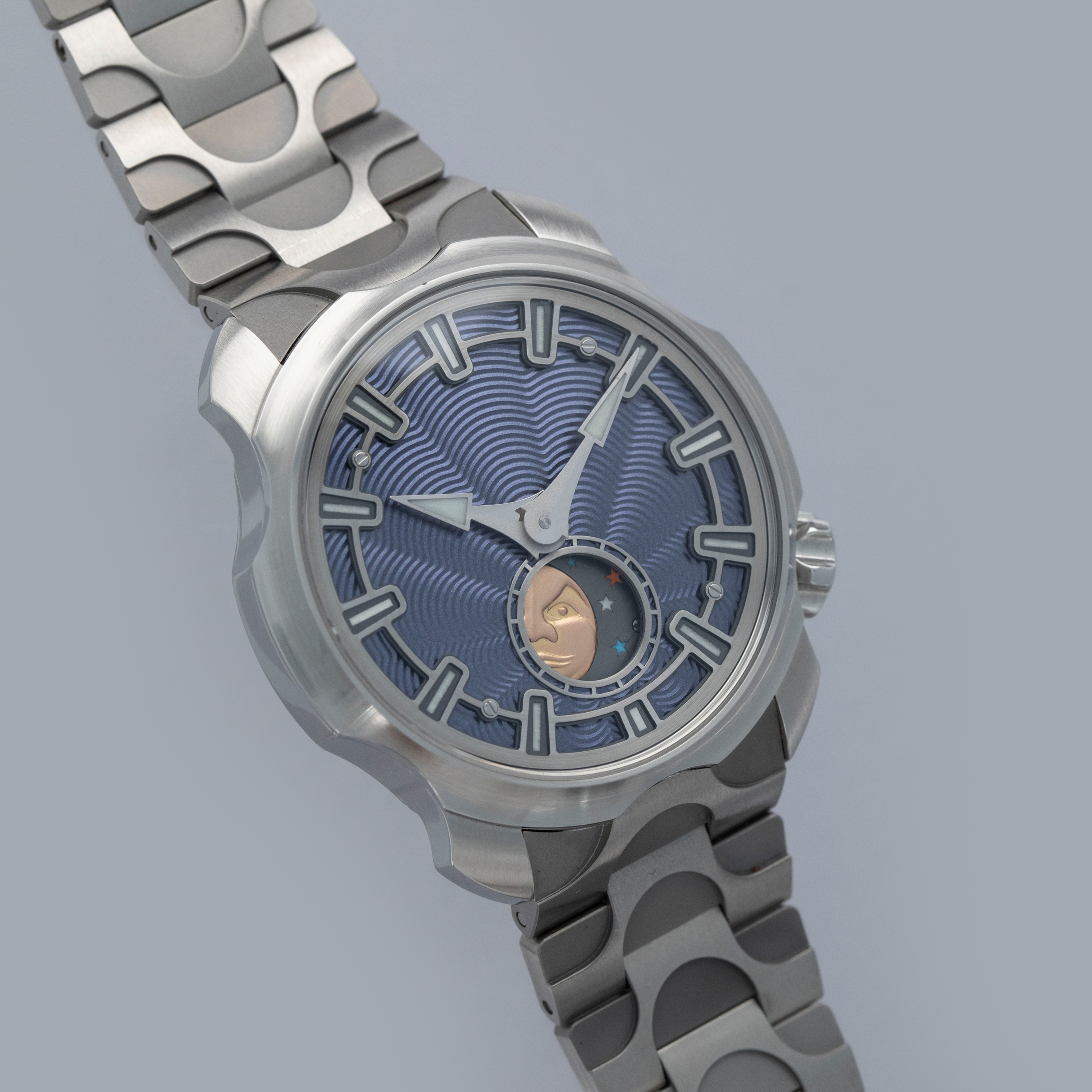 While not traditionally known for boasting famed watchmakers like some other countries, Finland has undoubtedly found its way onto the map thanks to Sarapeneva - one of the most unique and distinctive independent watchmakers in the industry. Launched in 2011, the K3 Guilloche has seen several iterations over its long history in Sarpaneva’s catalog, but the example we have here is perhaps one of the most stunning. Boasting Sarpaneva’s 42mm “Korona” case in stainless steel with all of the brand’s signature design elements such as sharp angles and smooth curves that are combined with angular recesses and protruding pieces, it is a timepiece imbued with Sarpaneva’s distinguished aesthetic. Of course, like so many of Sarpaneva’s incredible timepieces, the K3 Guilloche features a beautiful dial, with this example featuring a bright blue guilloche dial with sleketon indices that create two sandwiched layers atop the dial, and a double-moon complication that is only revealed through the aperture at 6 o’clock which reveals Sarpaneva’s iconic angry moon face. Offered on a bracelet that carries many of its case's design elements through each of its links, this K3 Guilloche is an impressive timepiece on the wrist.