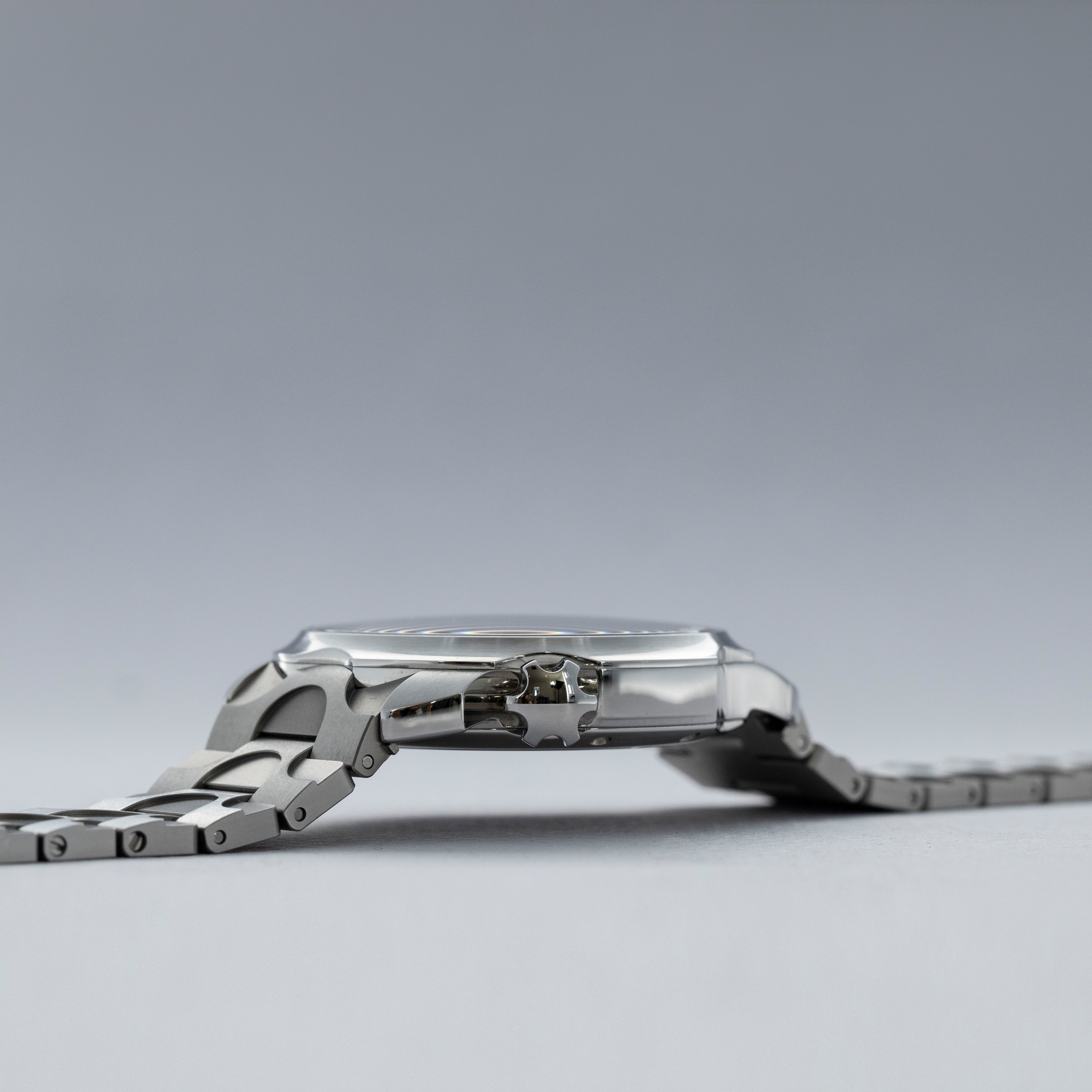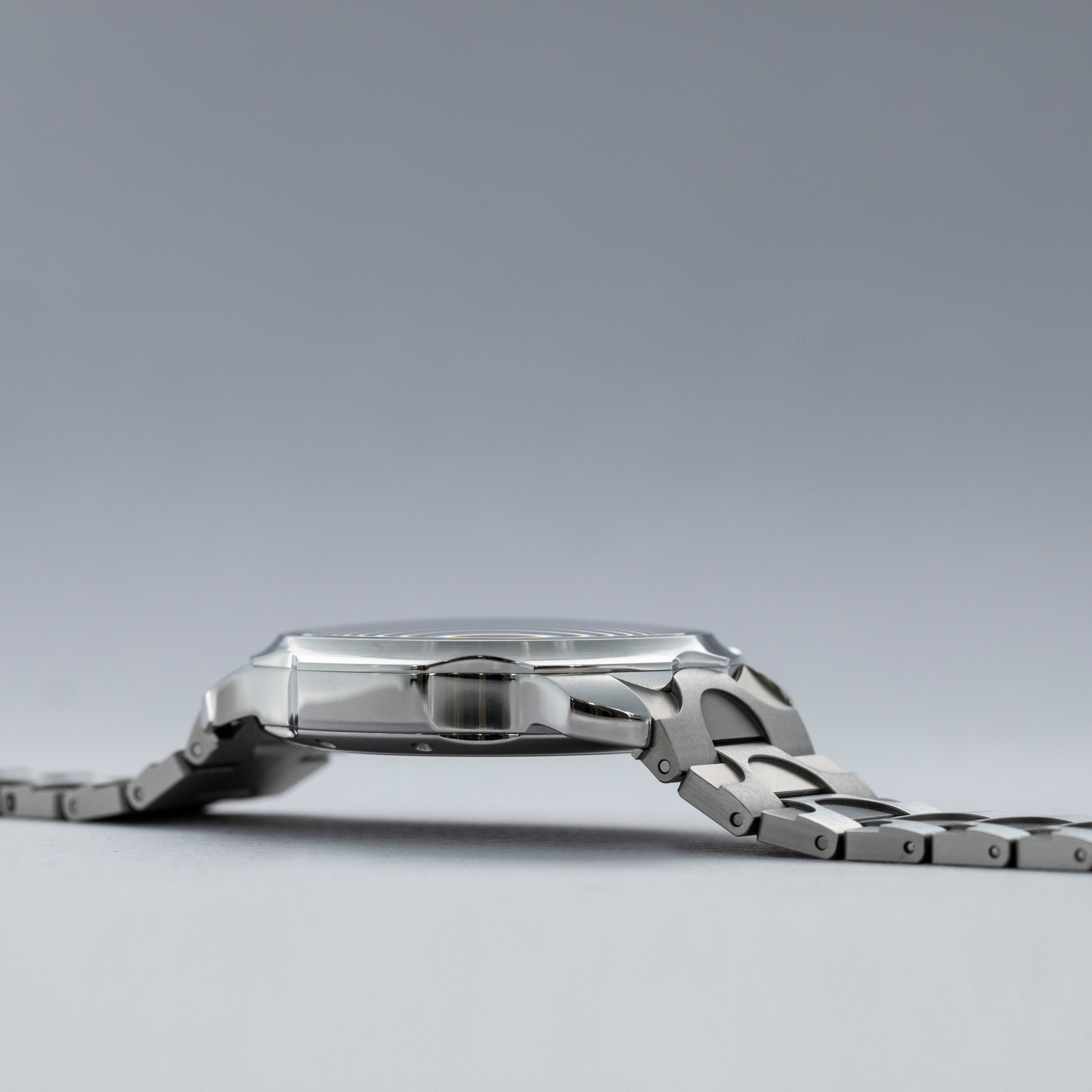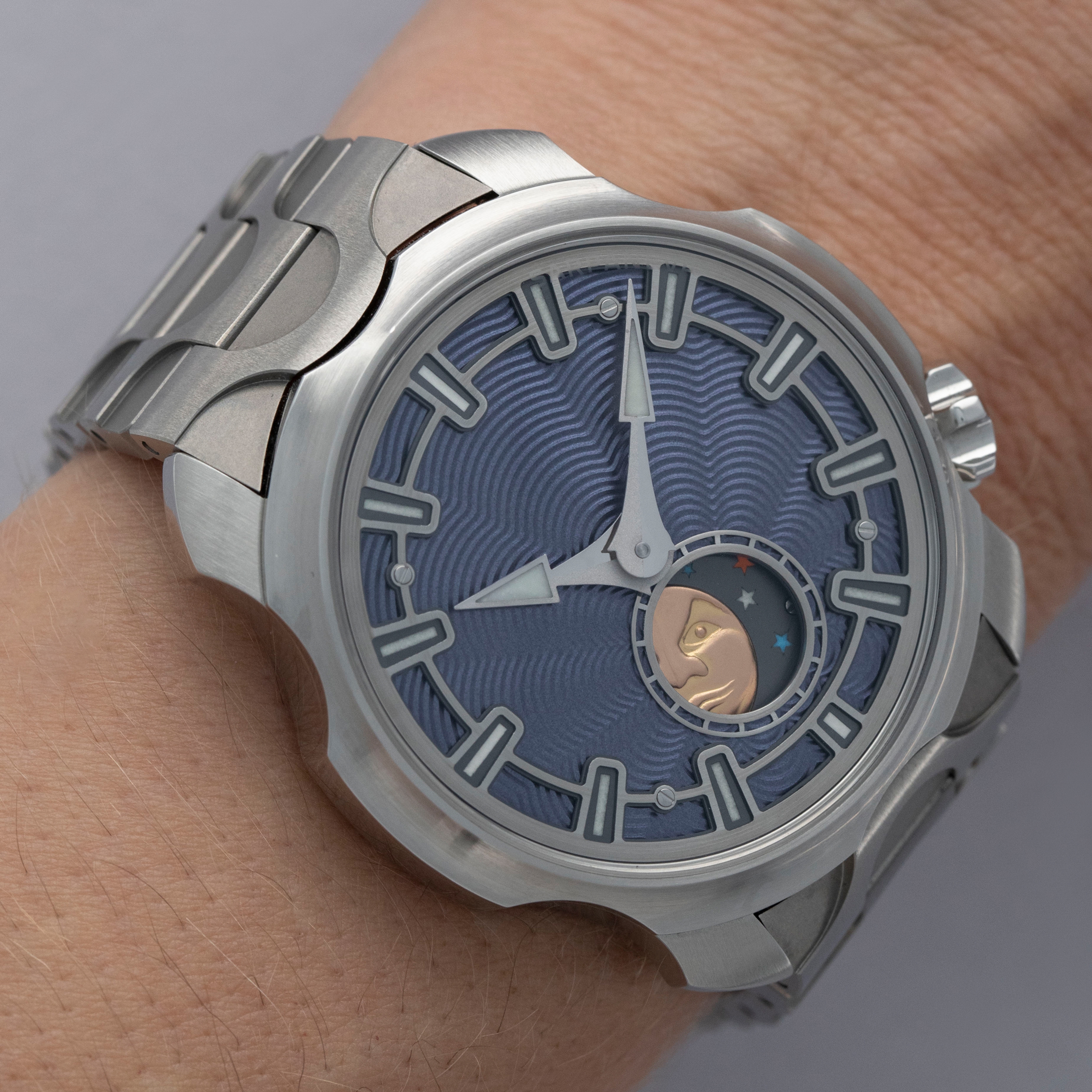 While not traditionally known for boasting famed watchmakers like some other countries, Finland has undoubtedly found its way onto the map thanks to Sarapeneva - one of the most unique and distinctive independent watchmakers in the industry. Launched in 2011, the K3 Guilloche has seen several iterations over its long history in Sarpaneva’s catalog, but the example we have here is perhaps one of the most stunning. Boasting Sarpaneva’s 42mm “Korona” case in stainless steel with all of the brand’s signature design elements such as sharp angles and smooth curves that are combined with angular recesses and protruding pieces, it is a timepiece imbued with Sarpaneva’s distinguished aesthetic. Of course, like so many of Sarpaneva’s incredible timepieces, the K3 Guilloche features a beautiful dial, with this example featuring a bright blue guilloche dial with sleketon indices that create two sandwiched layers atop the dial, and a double-moon complication that is only revealed through the aperture at 6 o’clock which reveals Sarpaneva’s iconic angry moon face. Offered on a bracelet that carries many of its case's design elements through each of its links, this K3 Guilloche is an impressive timepiece on the wrist.