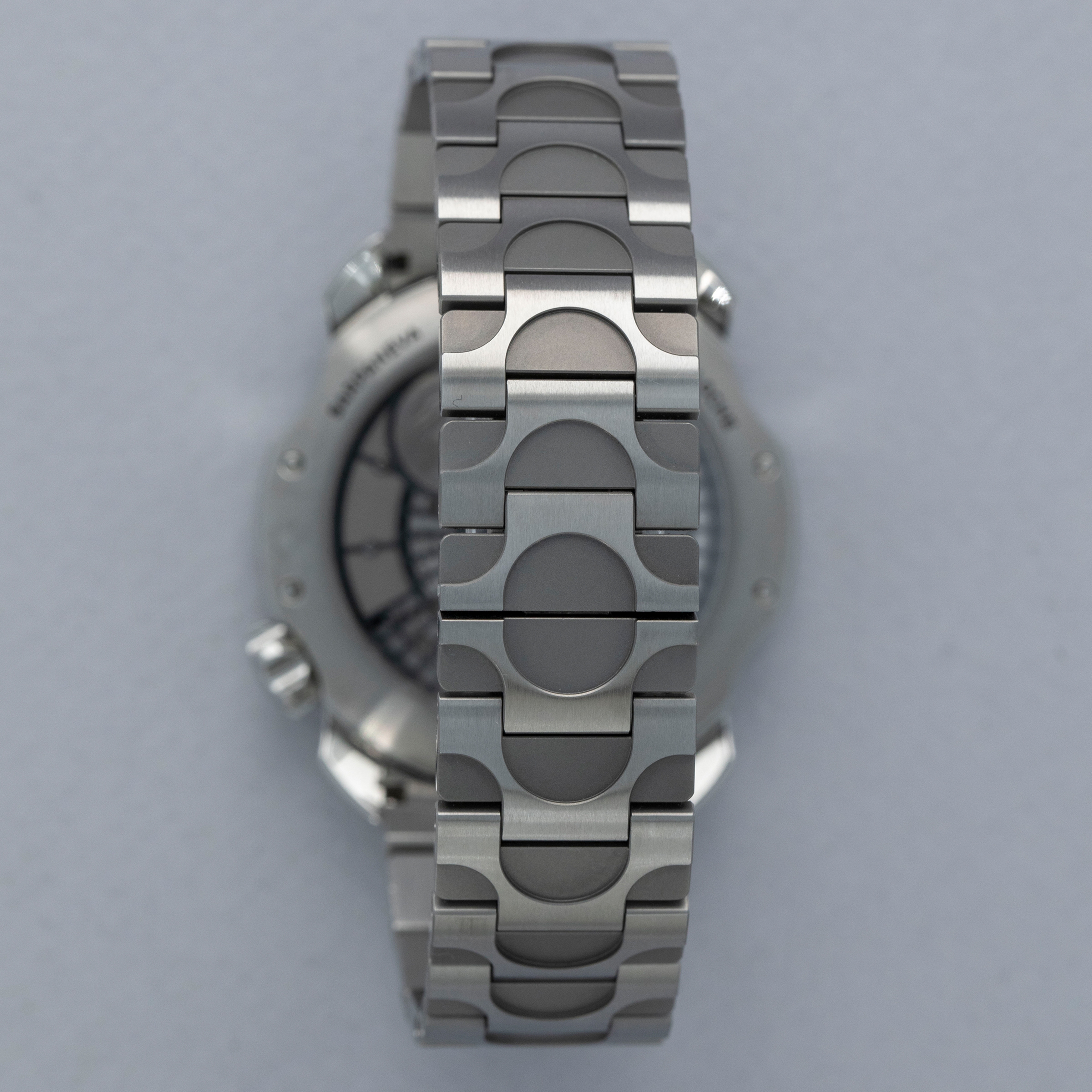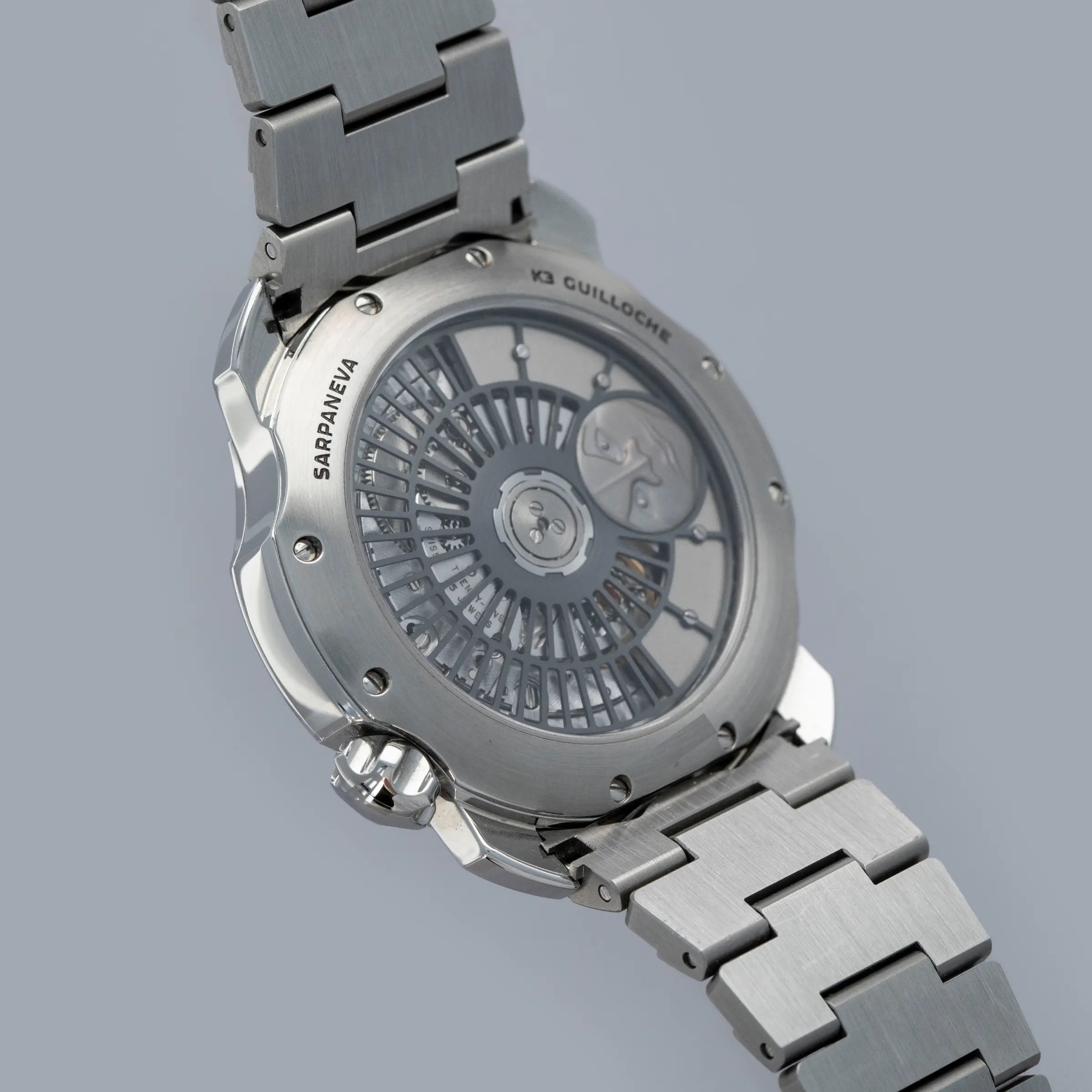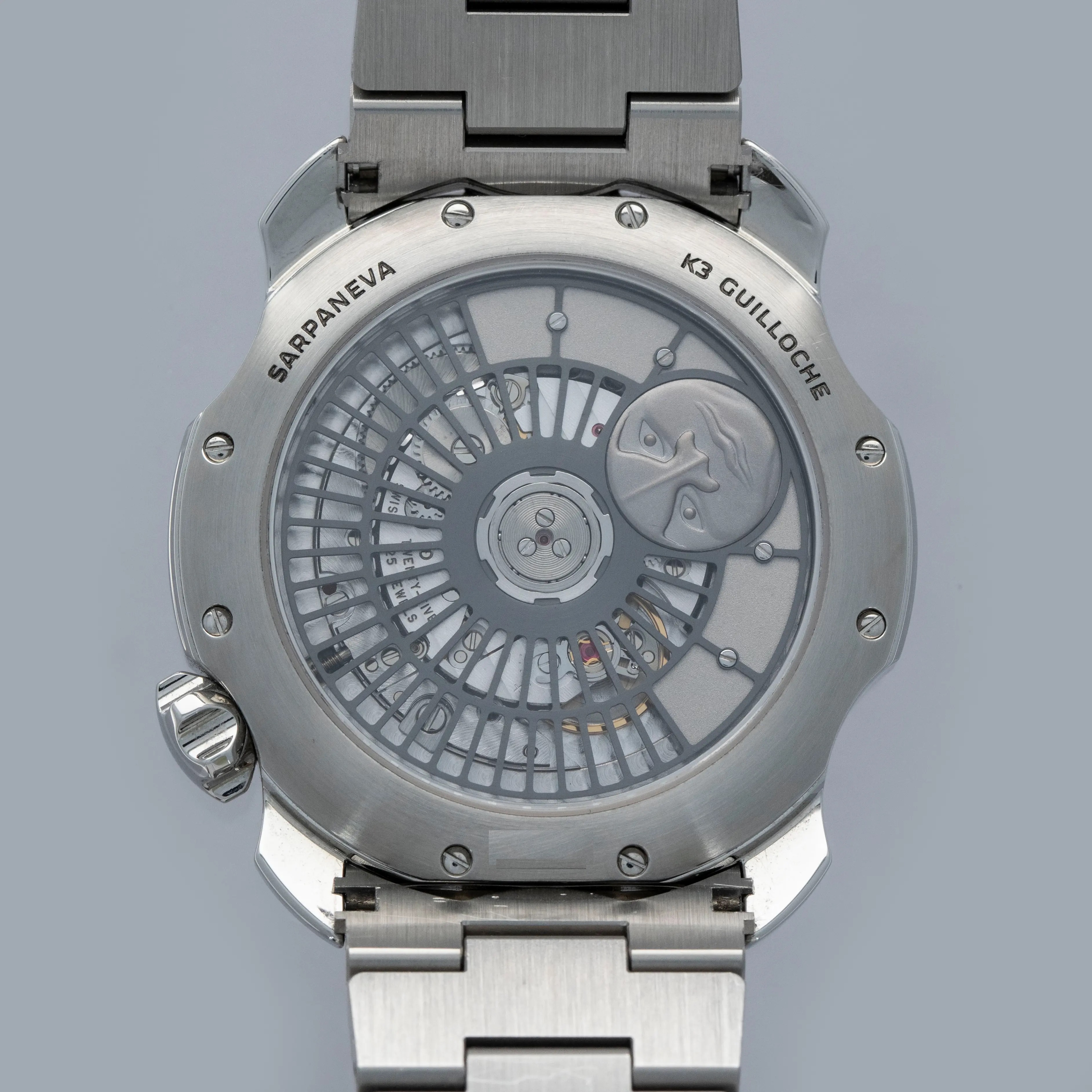 Not ones to half-do a job, Sarpaneva made sure to fit the K3 Guilloche with a movement fit for the incredible dial they gave the watch, and so its modified cal. A10 Soprod movement is fitted with a skeletonized winding rotor with Sarpaneva's moon face logo that perfectly fills the exhibition caseback of its stainless steel 42mm Korona case.