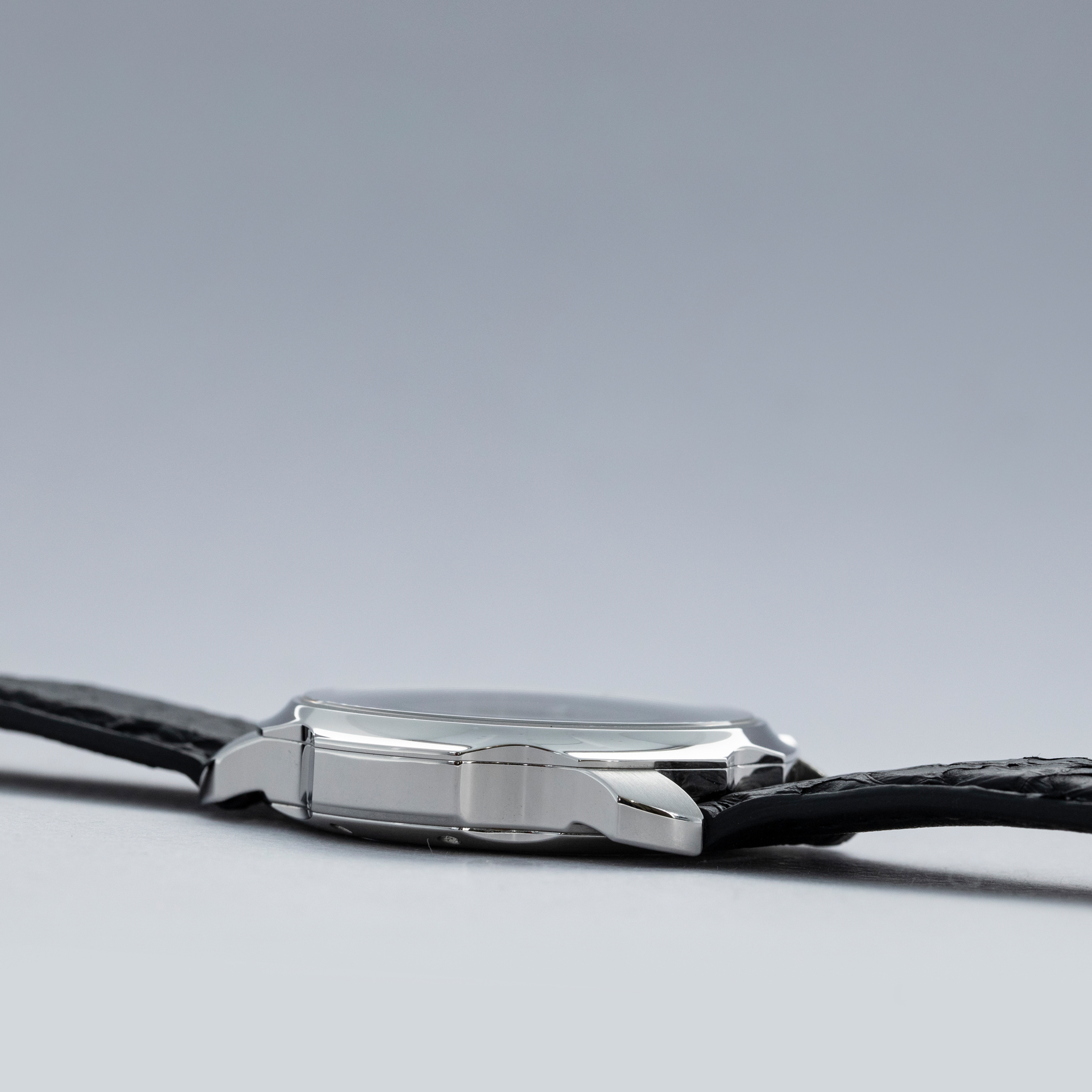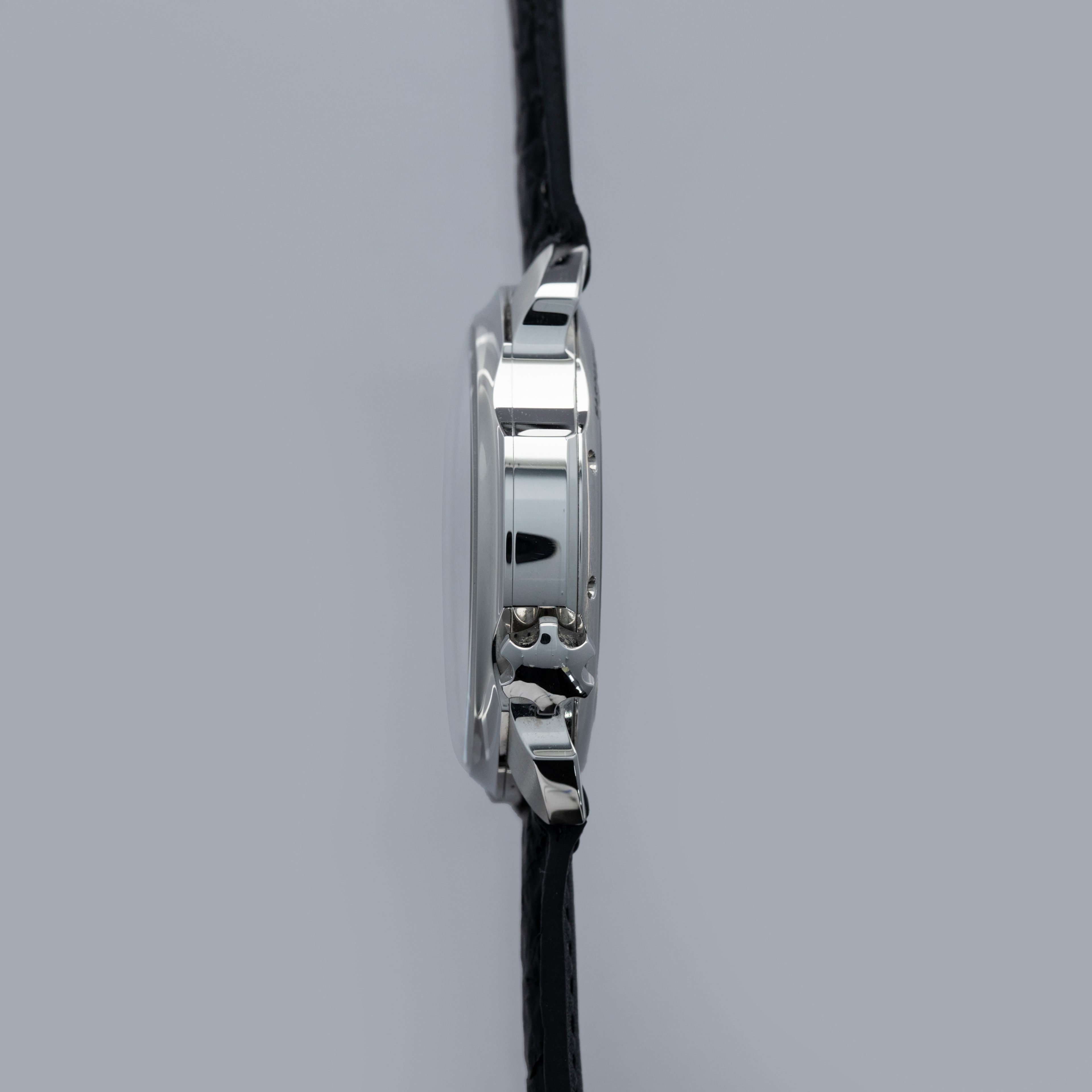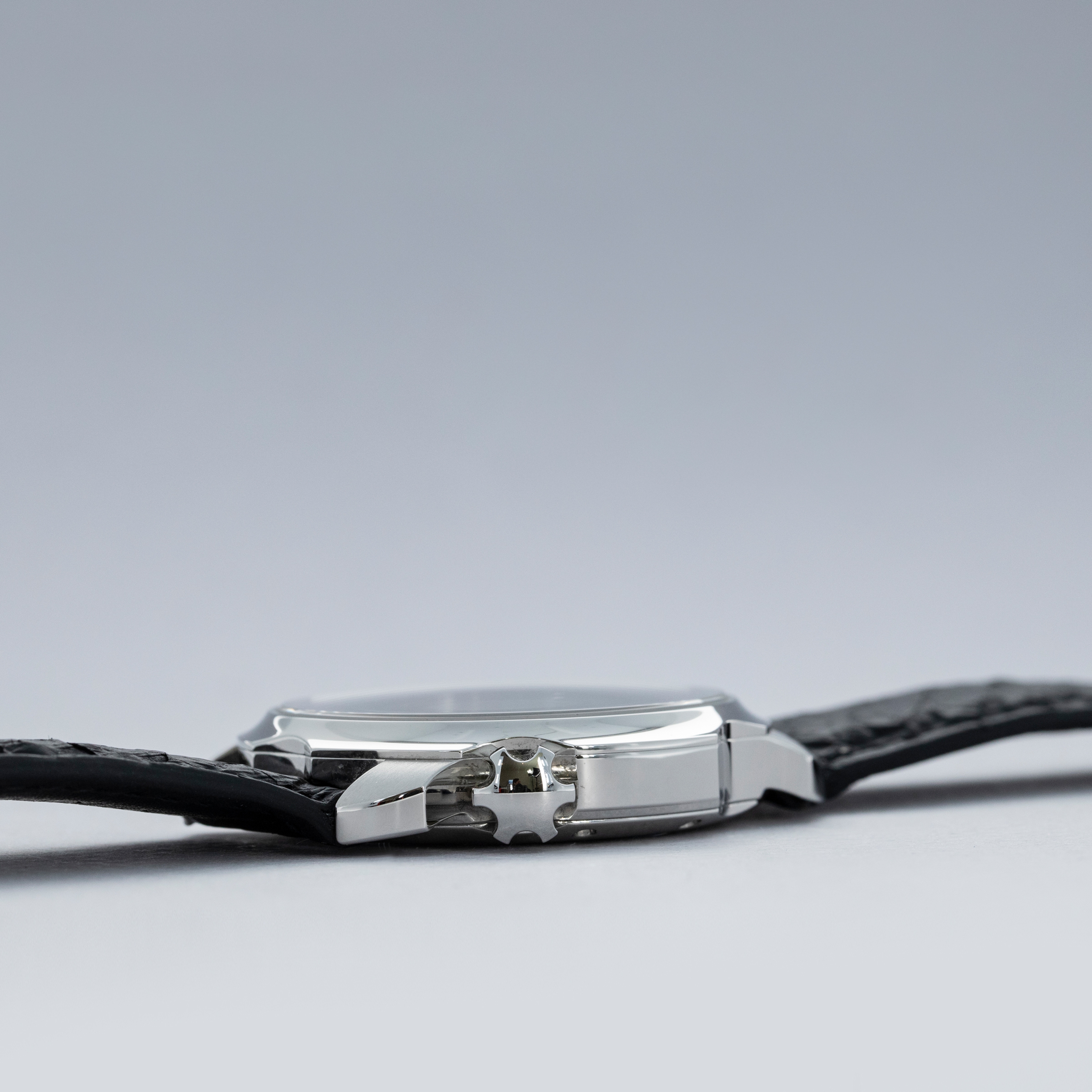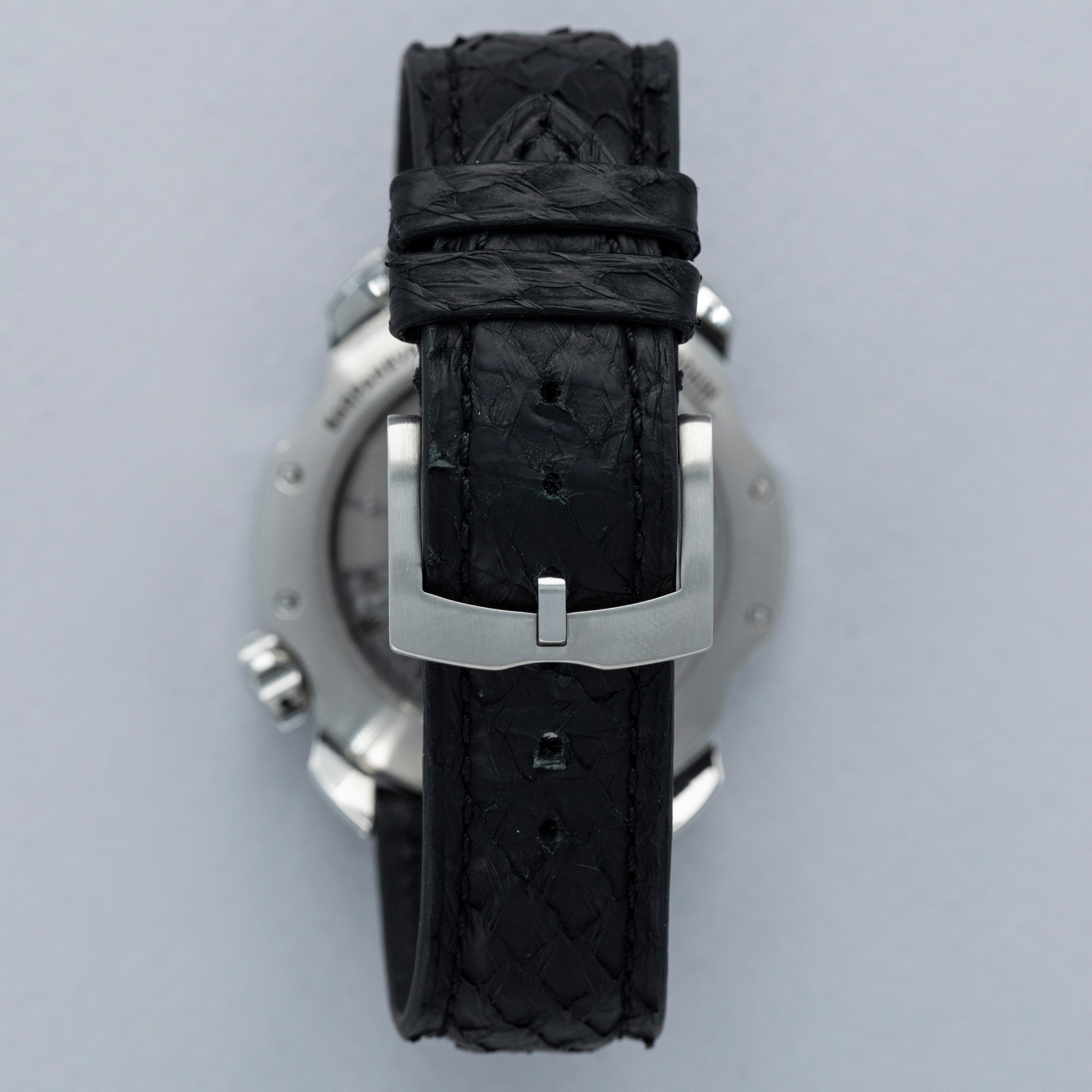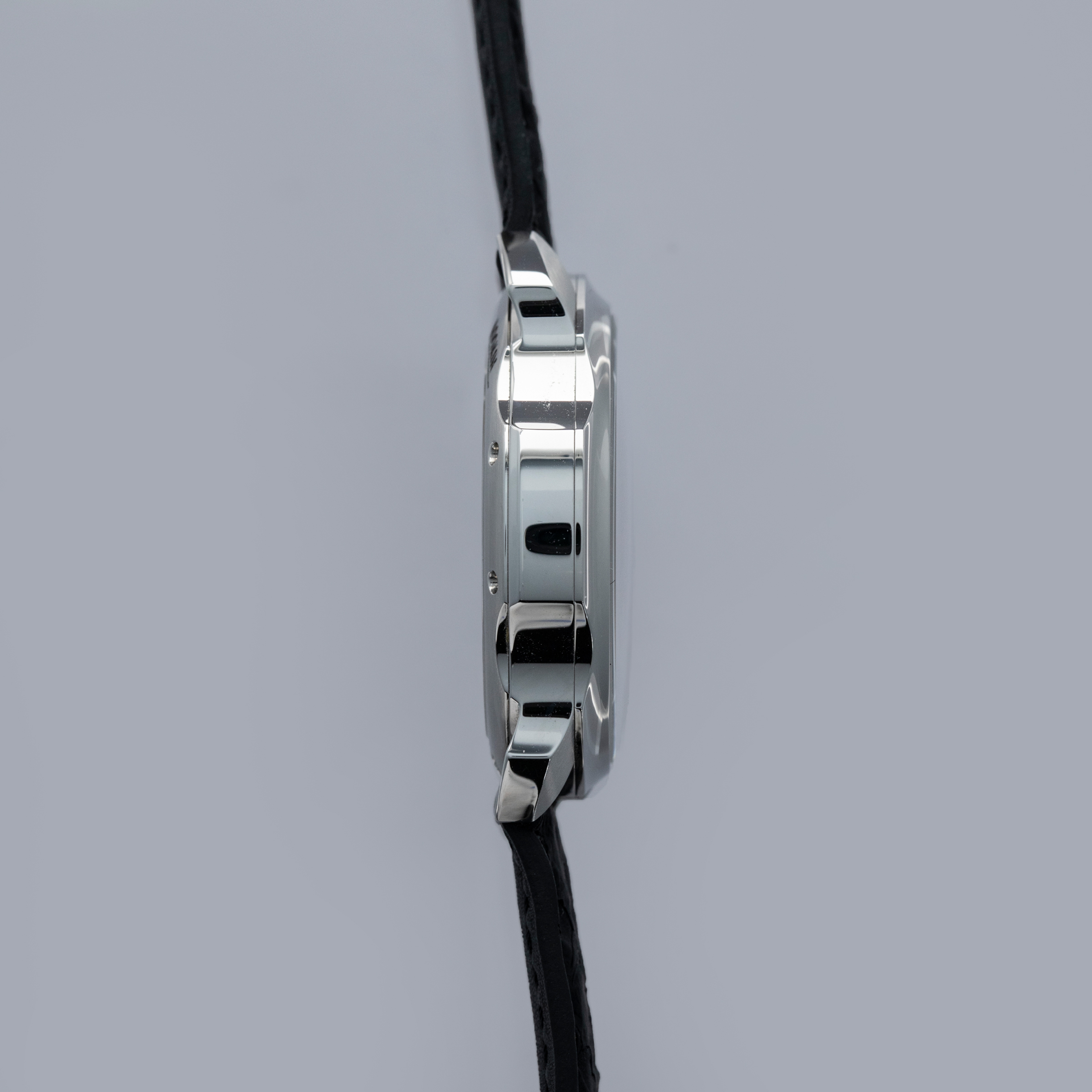 The watch is in overall near-mint condition. The steel case is very well defined, with a couple of light scratches on the case side and a few marks on the backs of the lugs. The dial and hands are pristine. It is fitted with a black leather strap with a pin buckle in near-mint condition. Comes complete with box and papers.