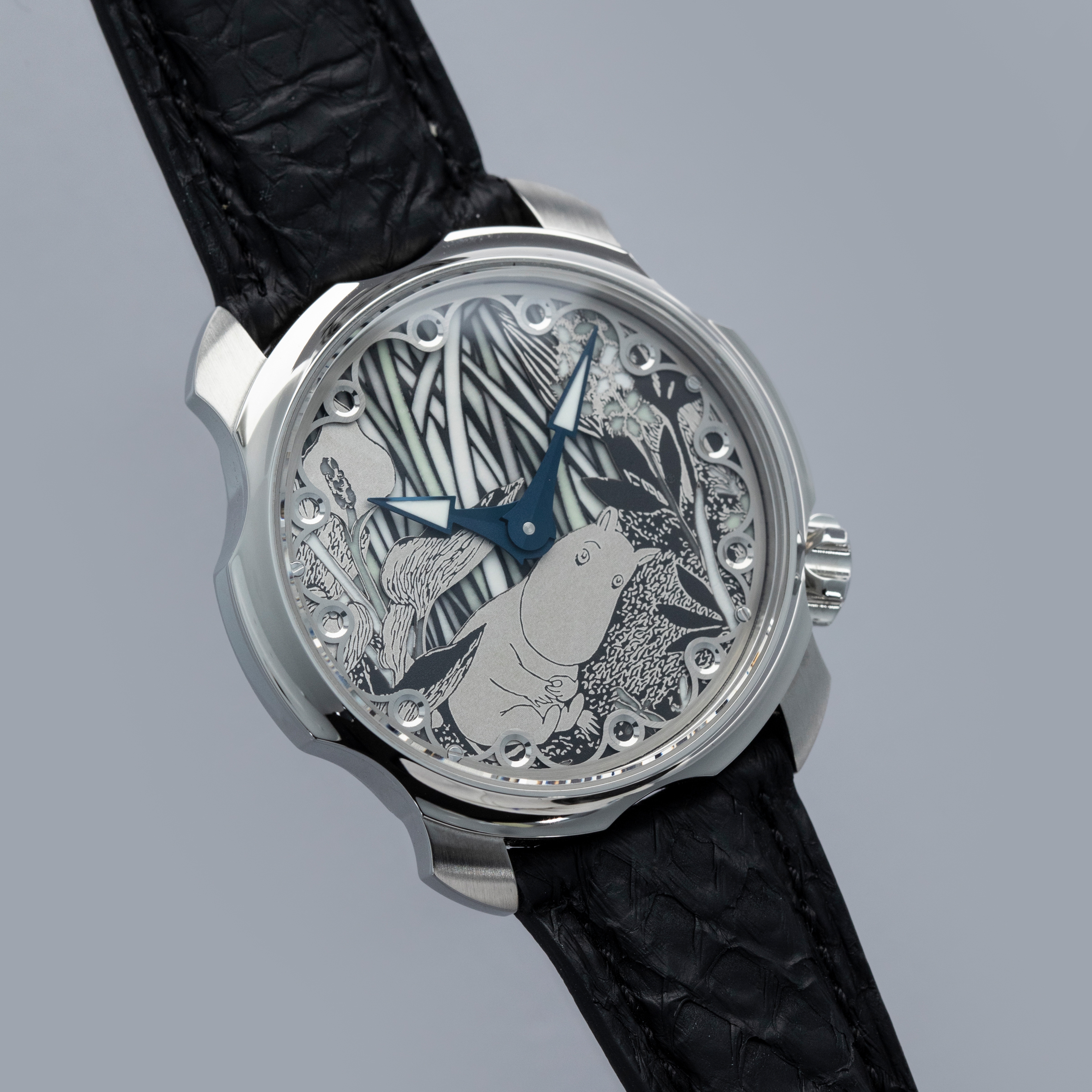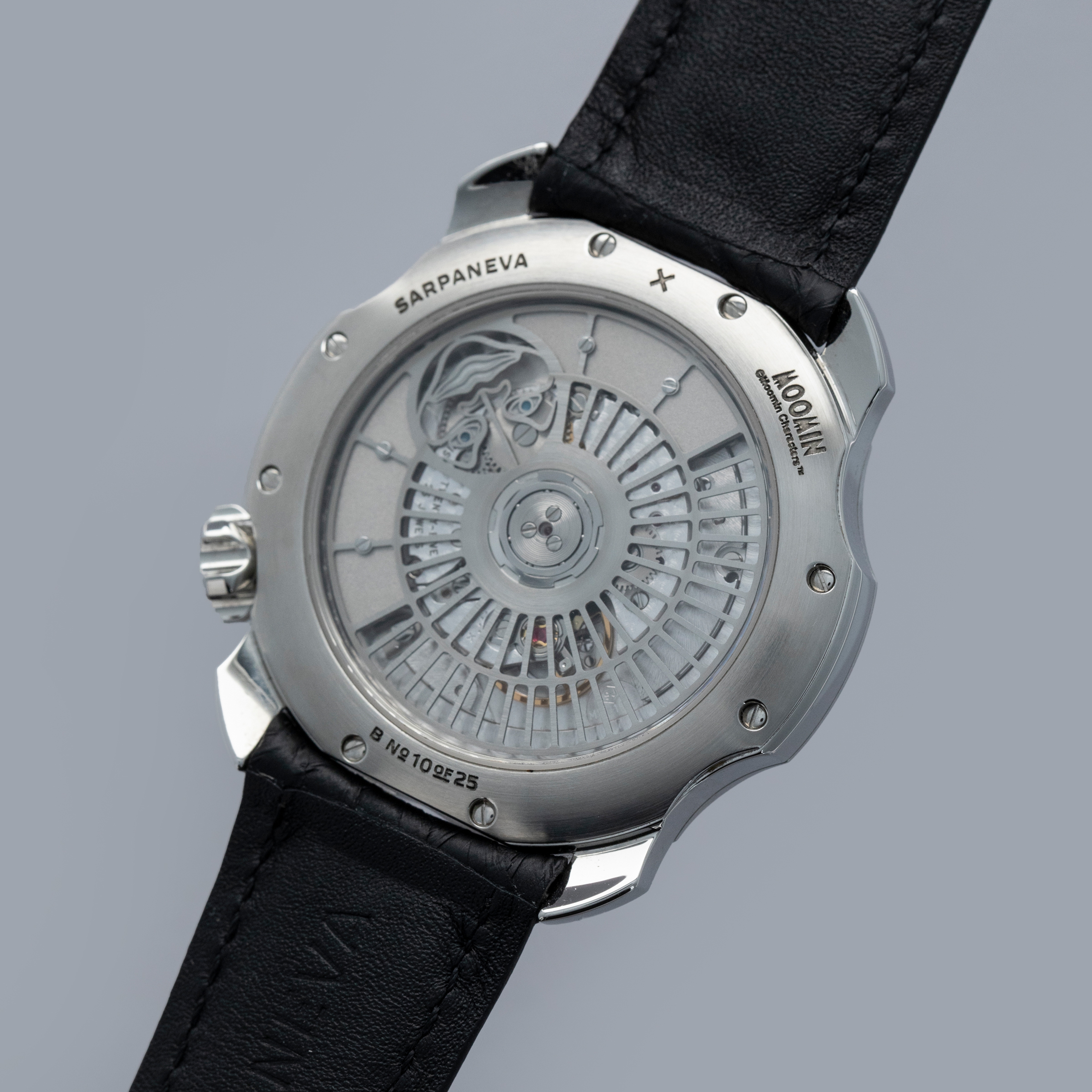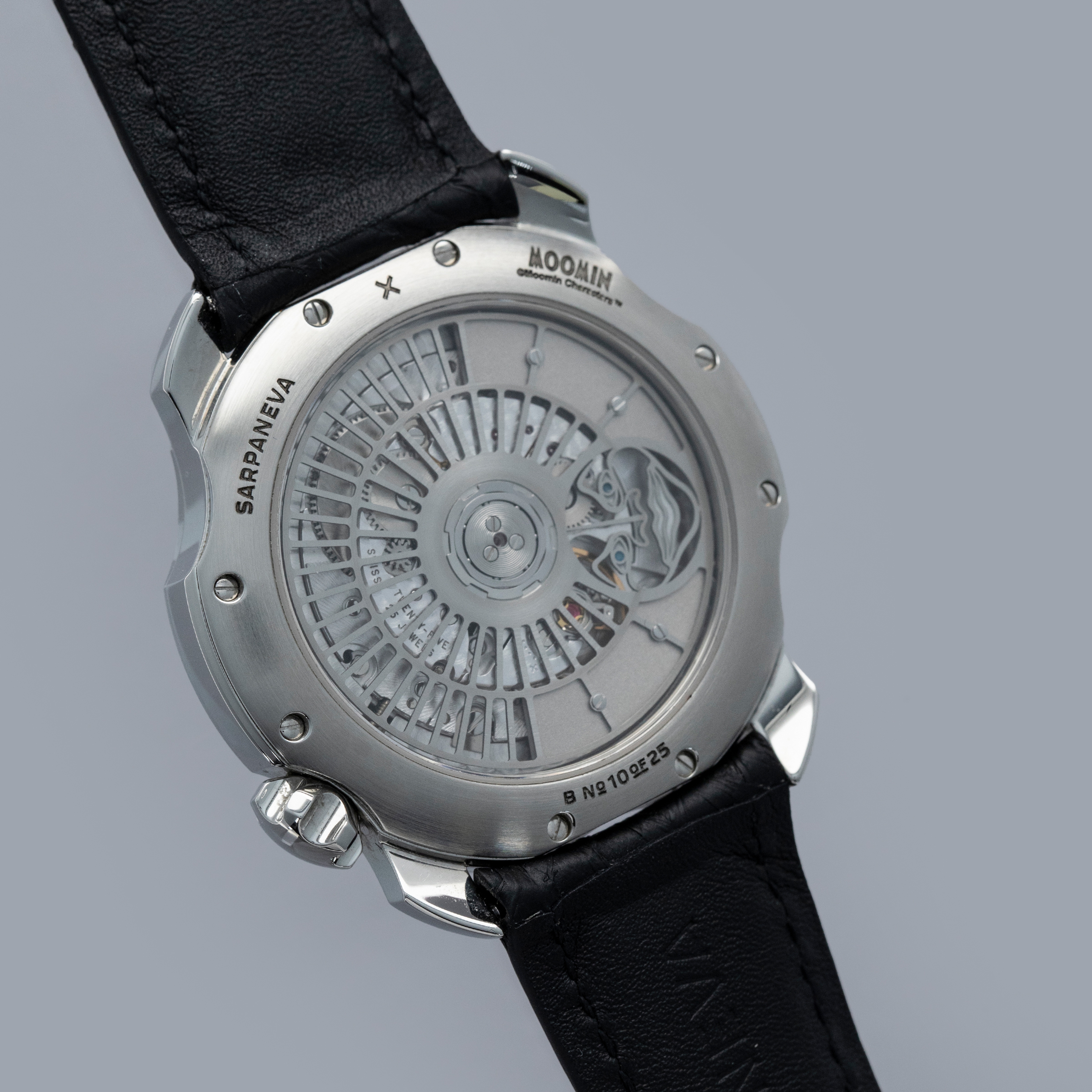 Not ones to half-do a job, Sarpaneva made sure to fit the Moomin with a movement fit for the incredible dial they gave the watch, and so its cal. A10 soprod movement is fitted with a custom skeletonised winding rotor with Sarpaneva's moon face logo.