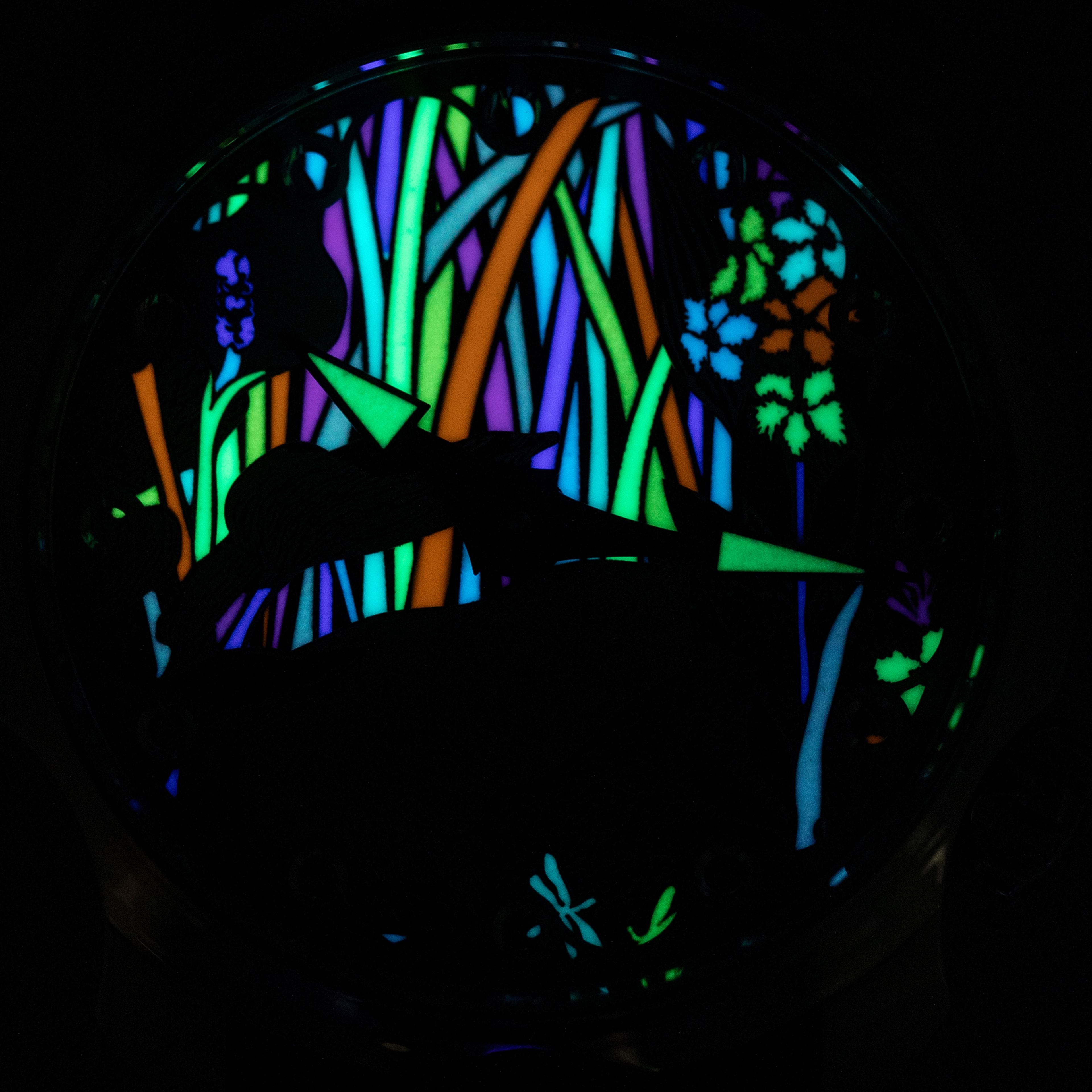 While its dial seems distinctly monochromatic in normal conditions, the Moomin's display illuminates beautifully when it is in the dark with a mixture of blues, greens, oranges and purples all filling the background that surrounds Moomin.