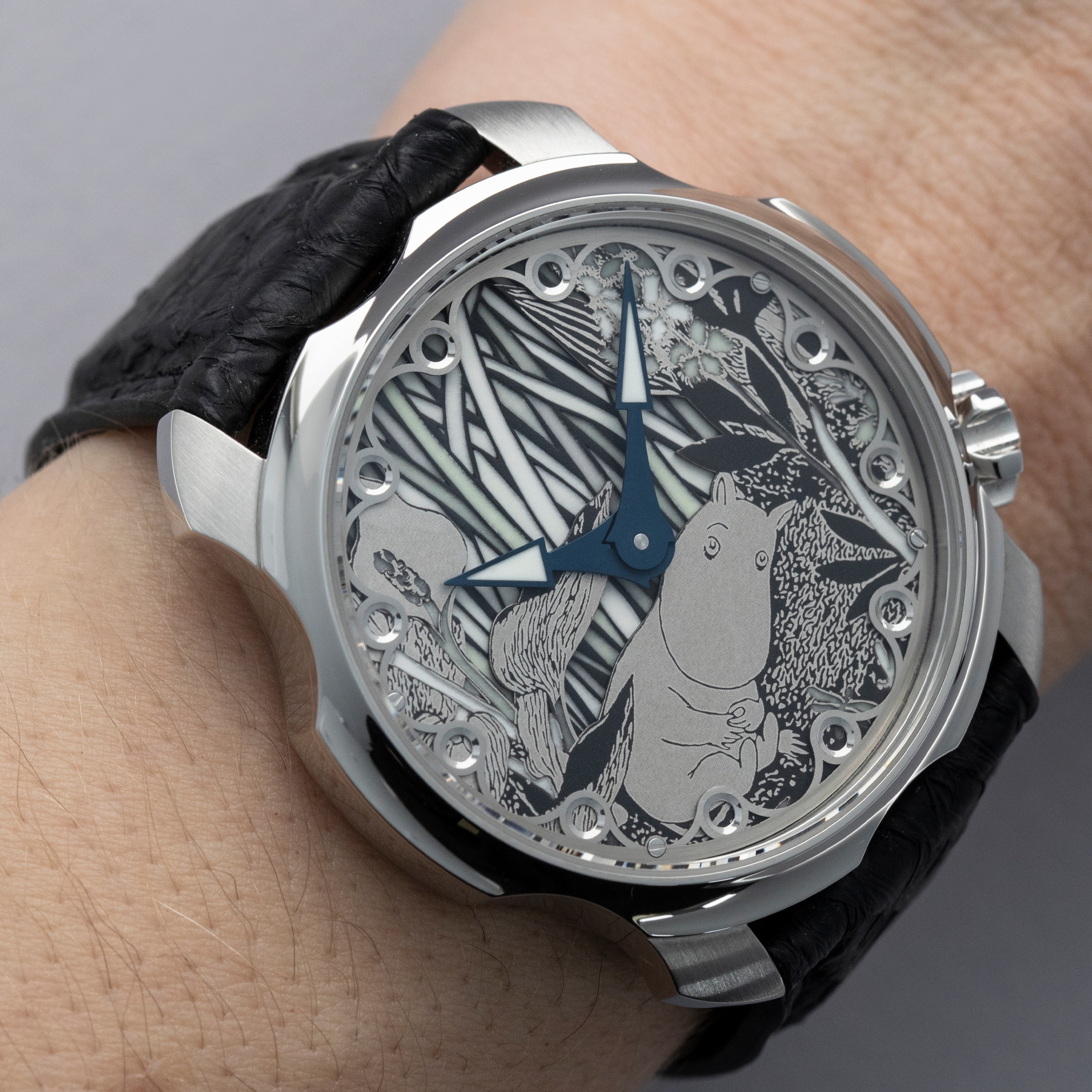 While not traditionally known for boasting famed watchmakers like some other countries, Finland has undoubtedly found its way onto the map thanks to Sarapeneva - one of the most unique and distinctive independent watchmakers in the industry. Launched in 2020 to celebrate a Finnish comic strip's 75th anniversary, Sarapaneva debuted the Moomin as an ode to the iconic comic strip's characters, design, and place within Scandinavian culture. Considering its fantastical inspiration, the Moomin's construction is rather sensible with a 42mm stainless steel case that features a domed bezel with bright polishing and pronounced lugs that flow with the case. While the Moomin's aesthetic appears to be largely monochromatic with its dial taking on several shades of grey, there is more to the Moomin's dial than first meets the eye. In normal lighting conditions, Moomin, the cartoon character, and the scene around him all devoid of colour. However, in the dark, the dial lights up and takes on the appearance of stained glass with greens, blues and oranges, all illuminating the Moomin's dial in the dark with eight different colours thanks to hand-painted Technicolour Super-Luminova. Limited to just 100 pieces across four handset options, of which we have the steel rhodium option, made of 25 pieces each, this is a unique and rare timepiece from an independent watchmaker that knows how to create a fun and interesting design that is as beautiful as it promises to be.
