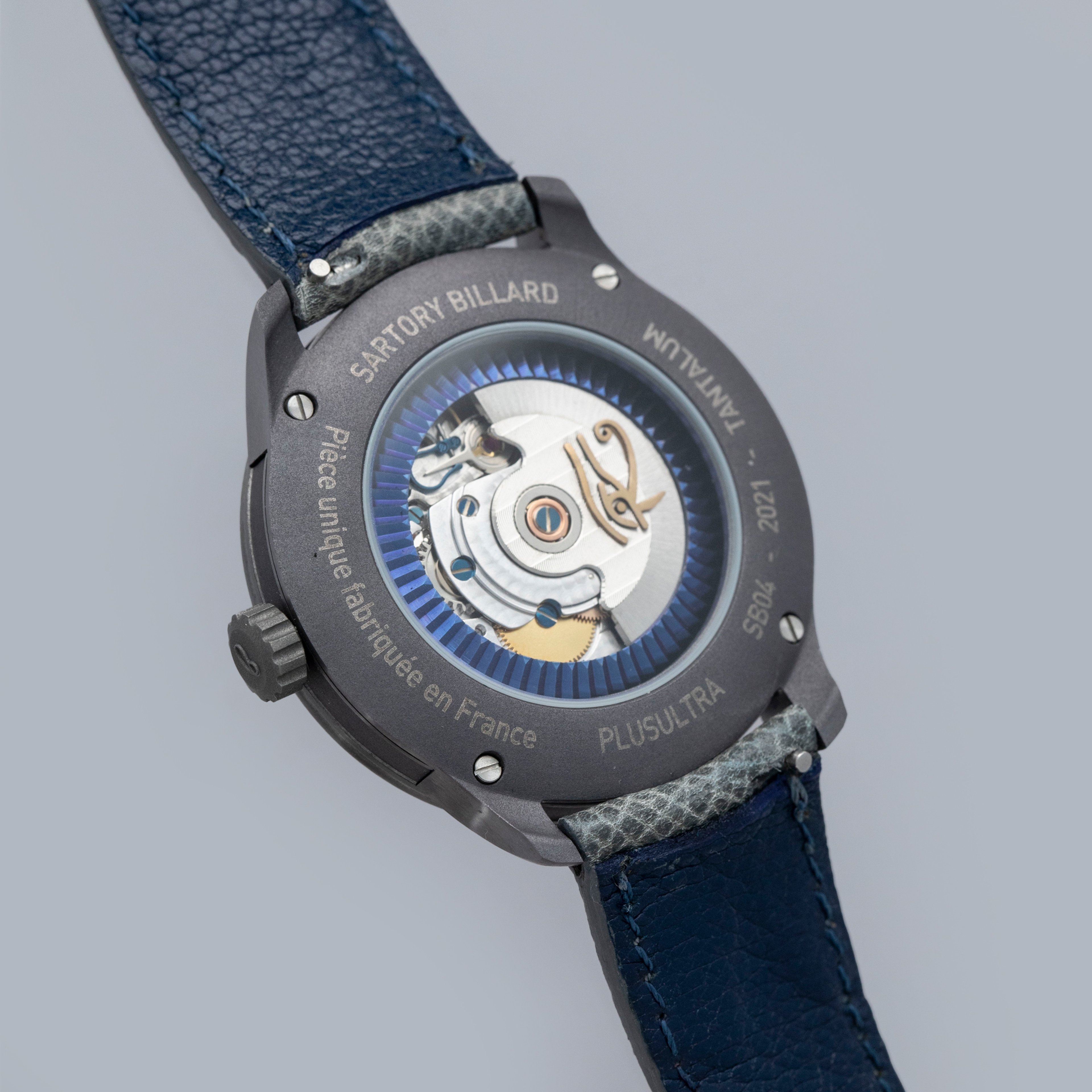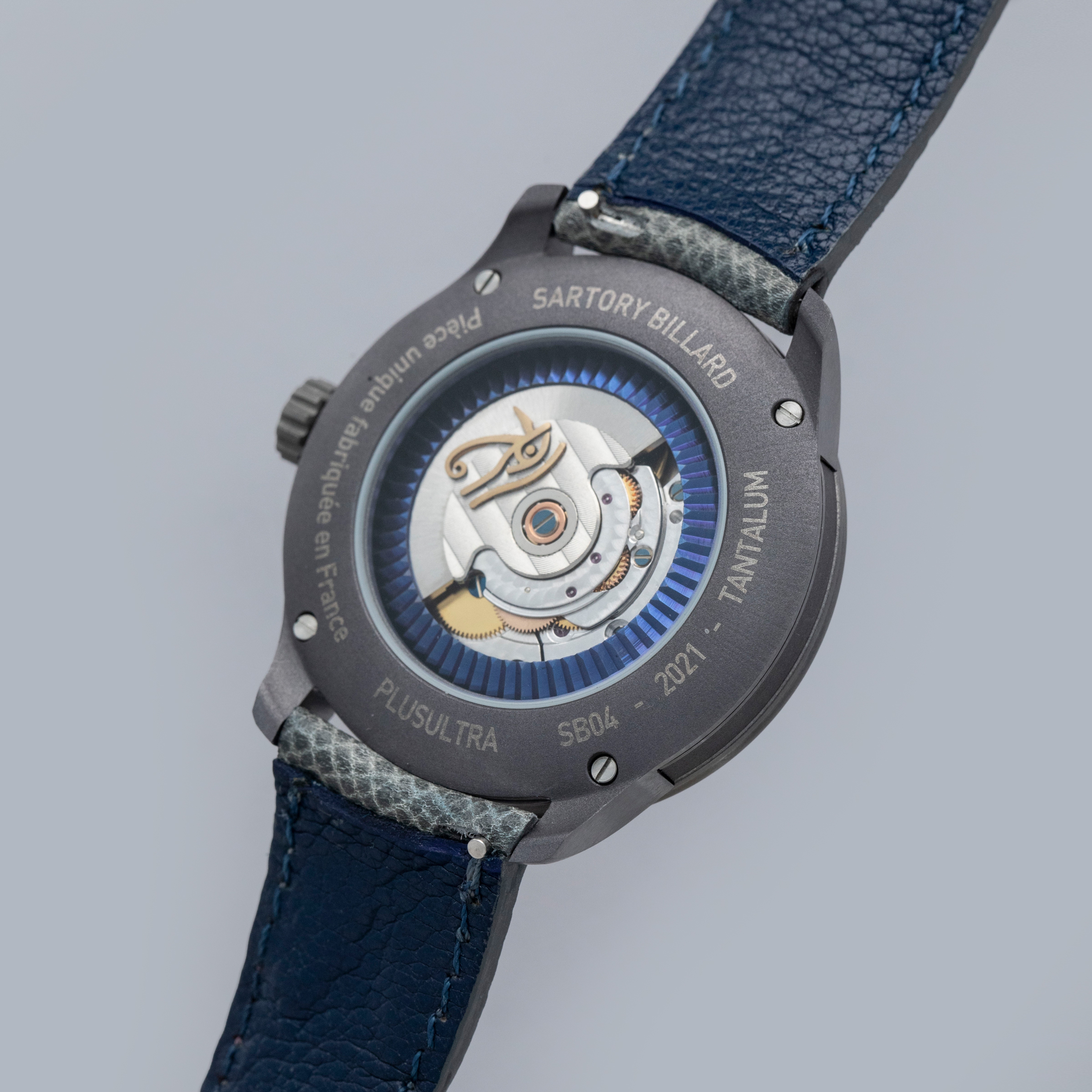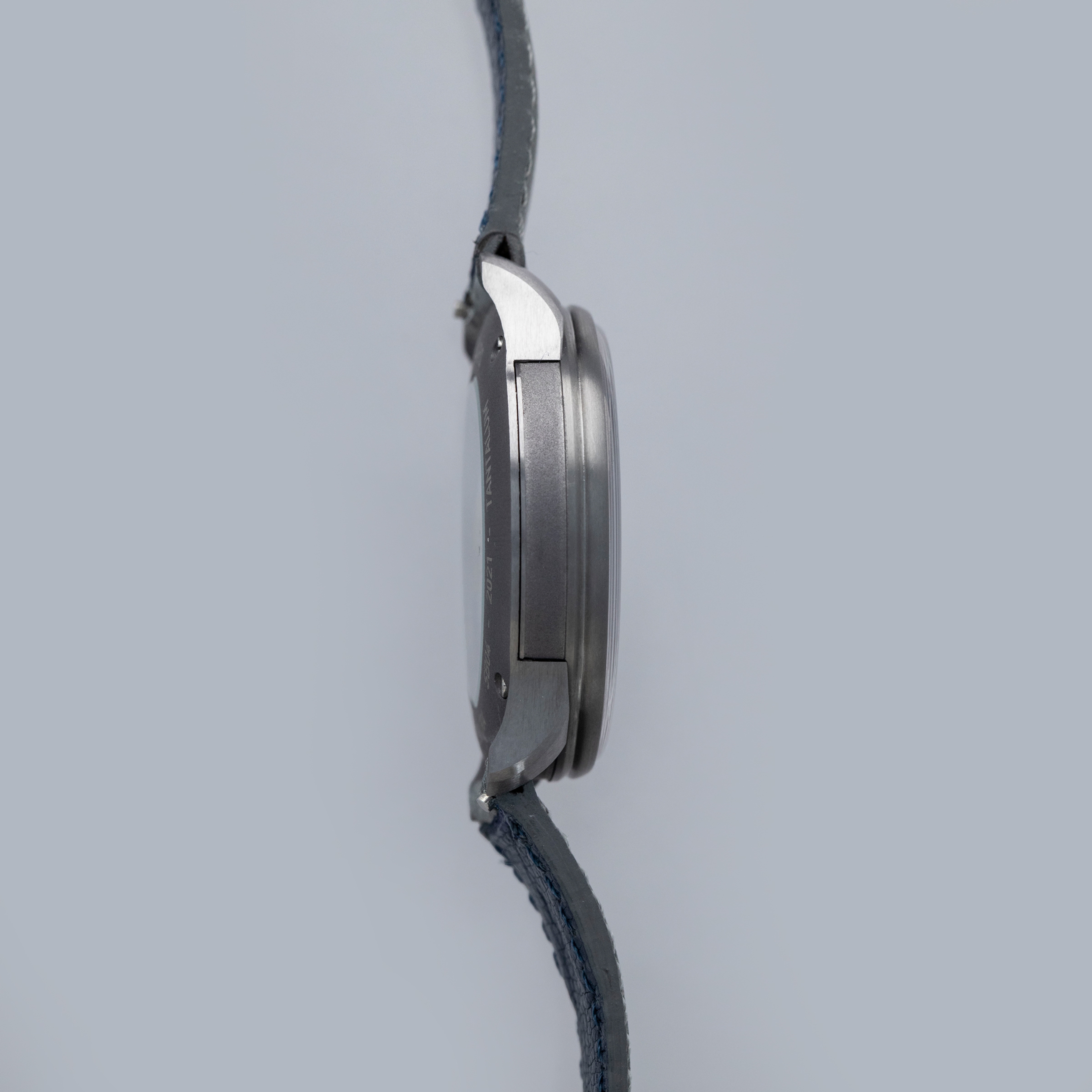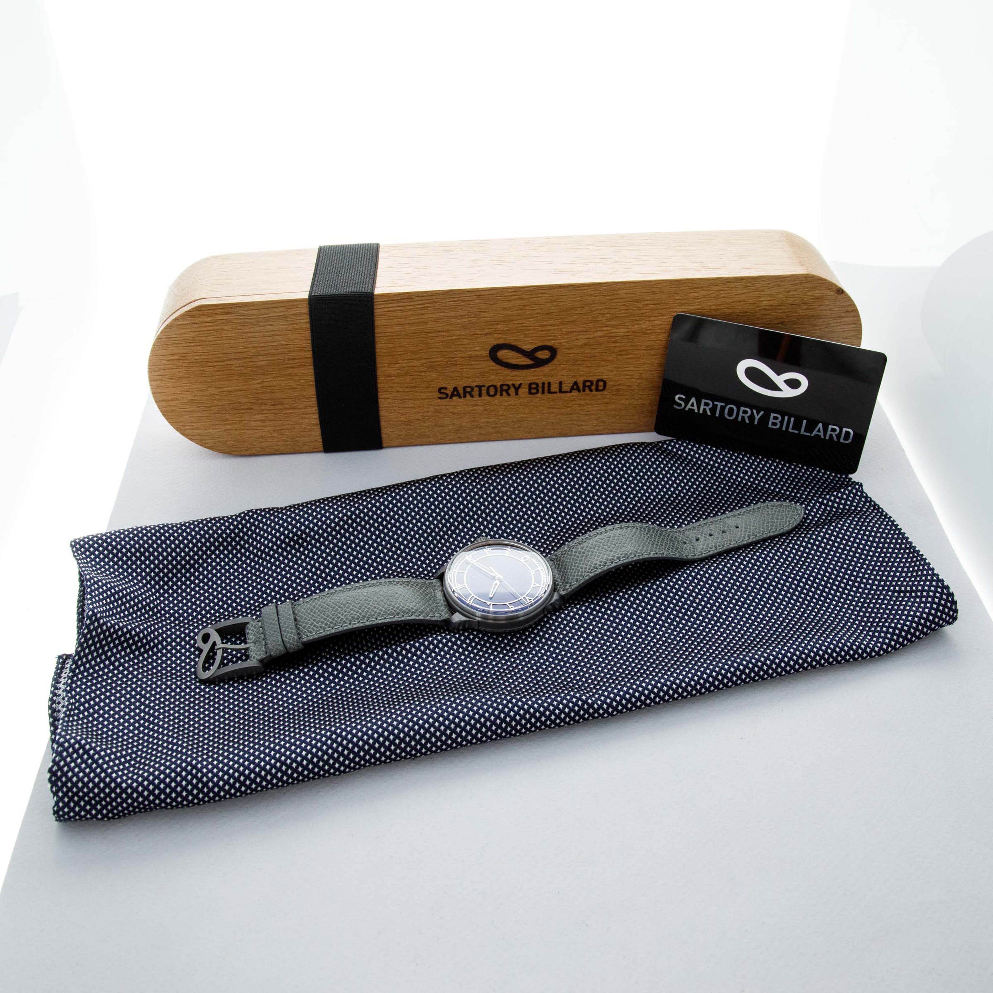 The watch is in overall like-new condition. The tantalum case is like new, with only light handling marks or signs of wear. The blue lapis dial is also like new. The watch is fitted with a near-mint grey leather strap and an SB-signed pin buckle in like-new condition. It comes complete with guarantee, pouch, and box.