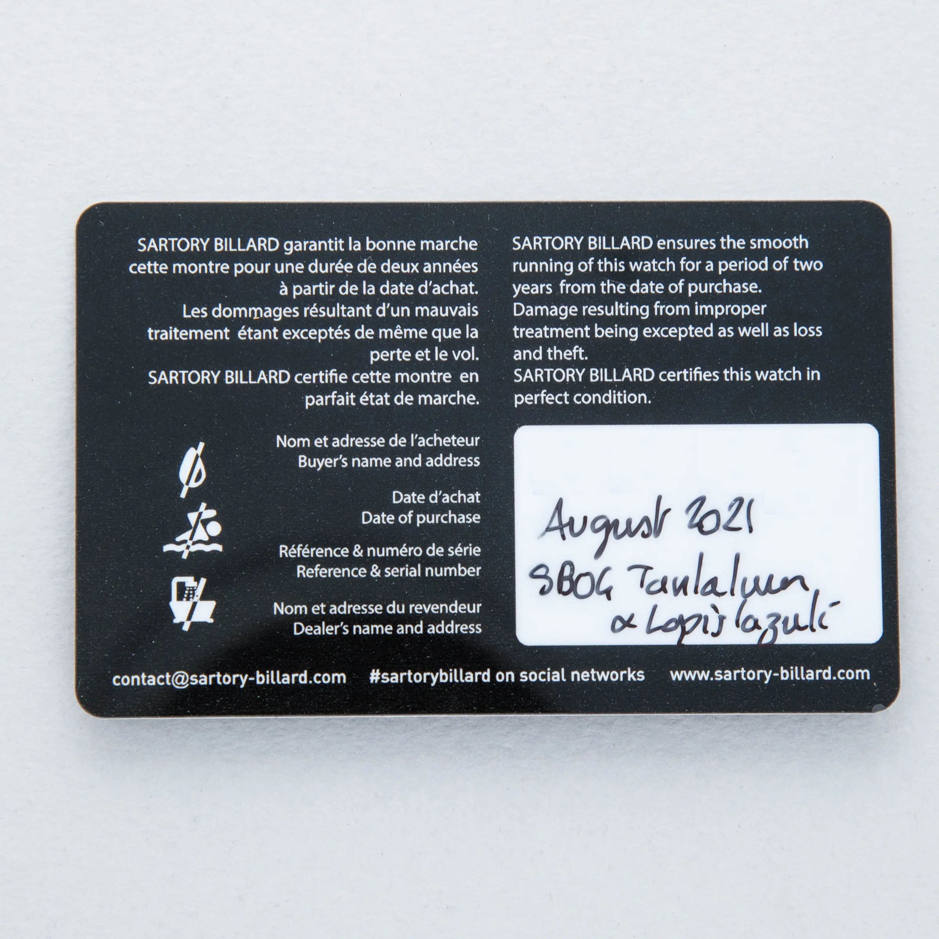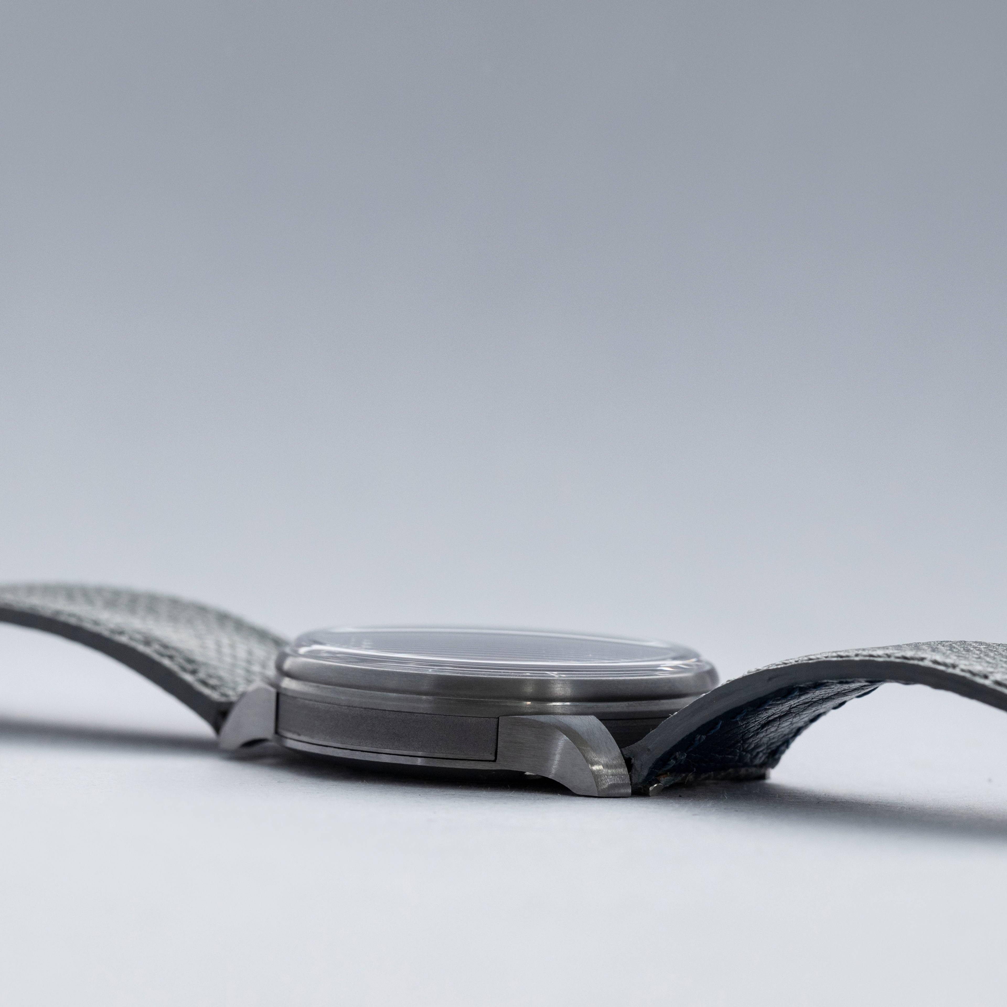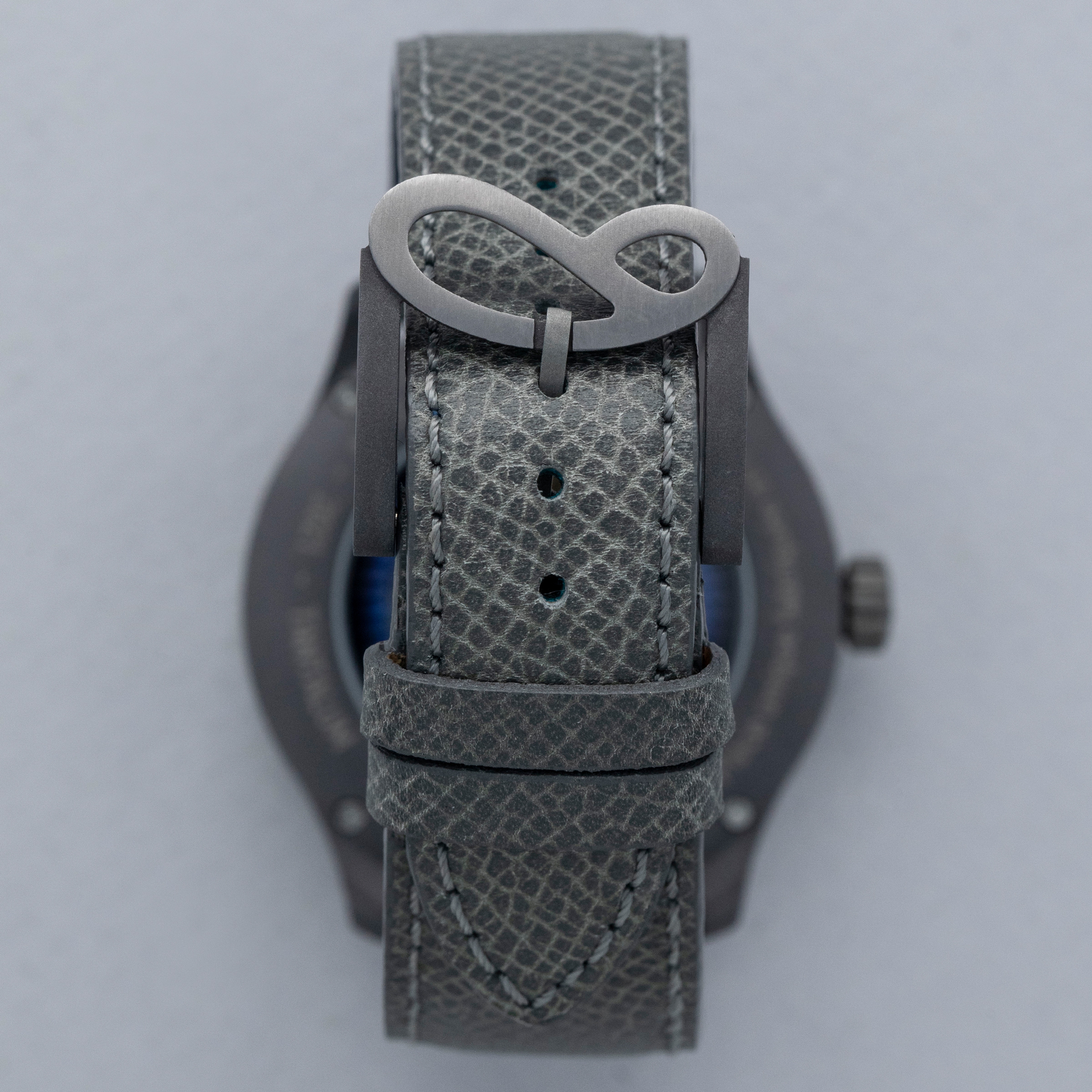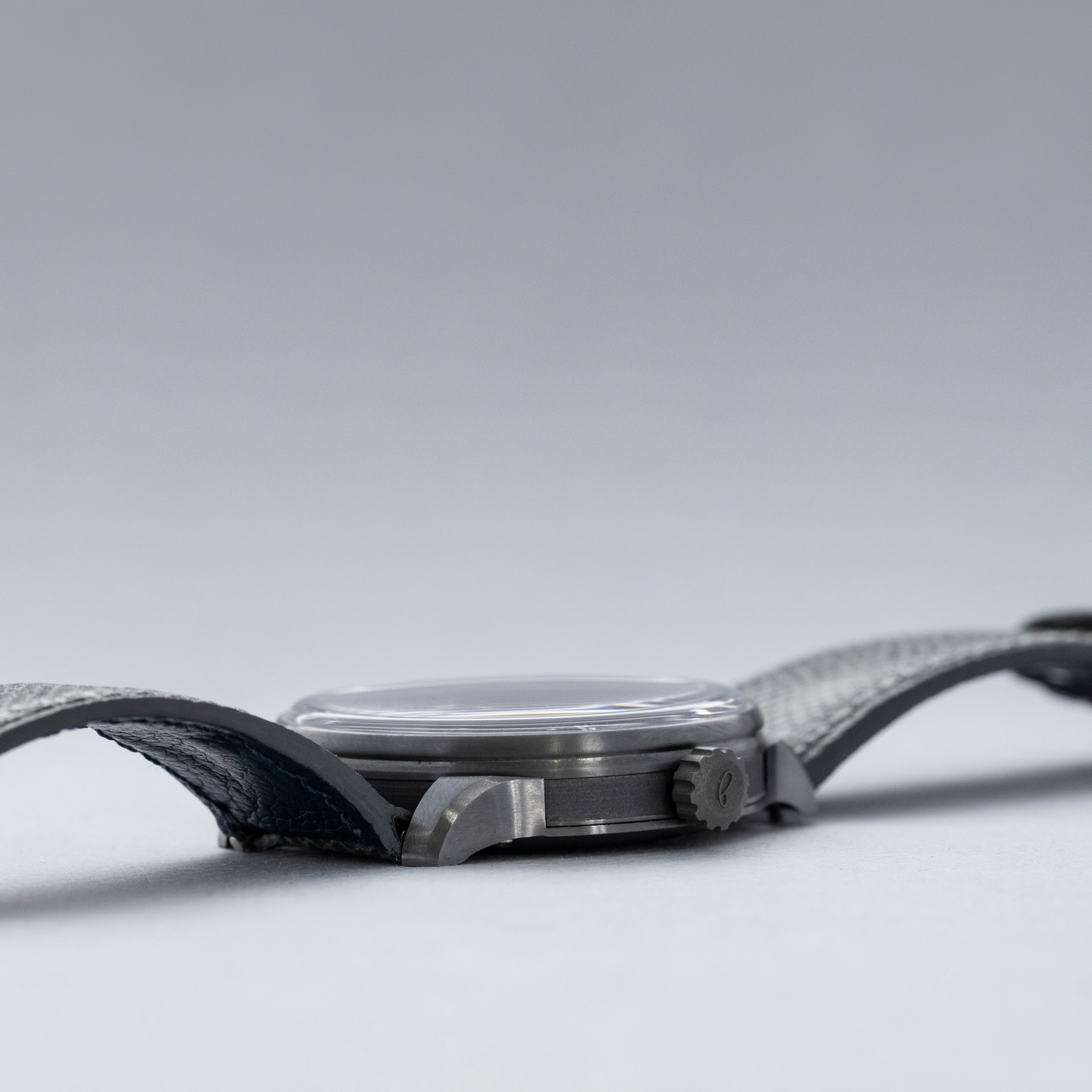 The watch is in overall like-new condition. The tantalum case is like new, with only light handling marks or signs of wear. The blue lapis dial is also like new. The watch is fitted with a near-mint grey leather strap and an SB-signed pin buckle in like-new condition. It comes complete with guarantee, pouch, and box.