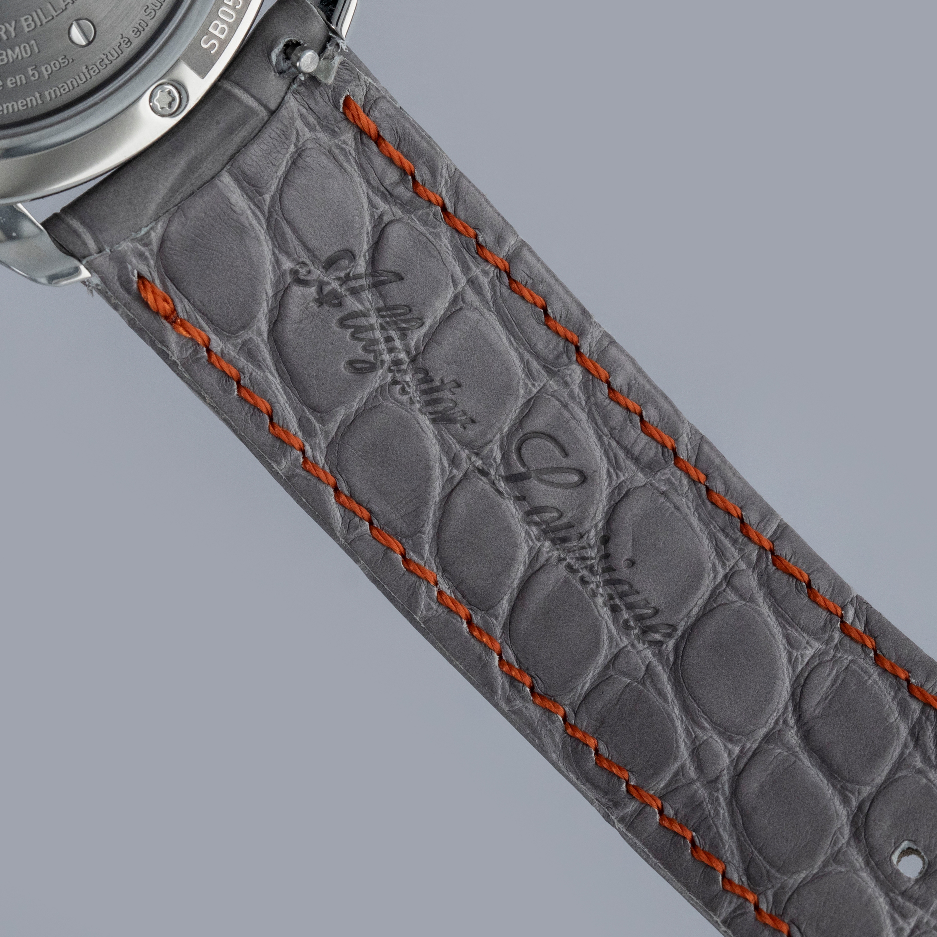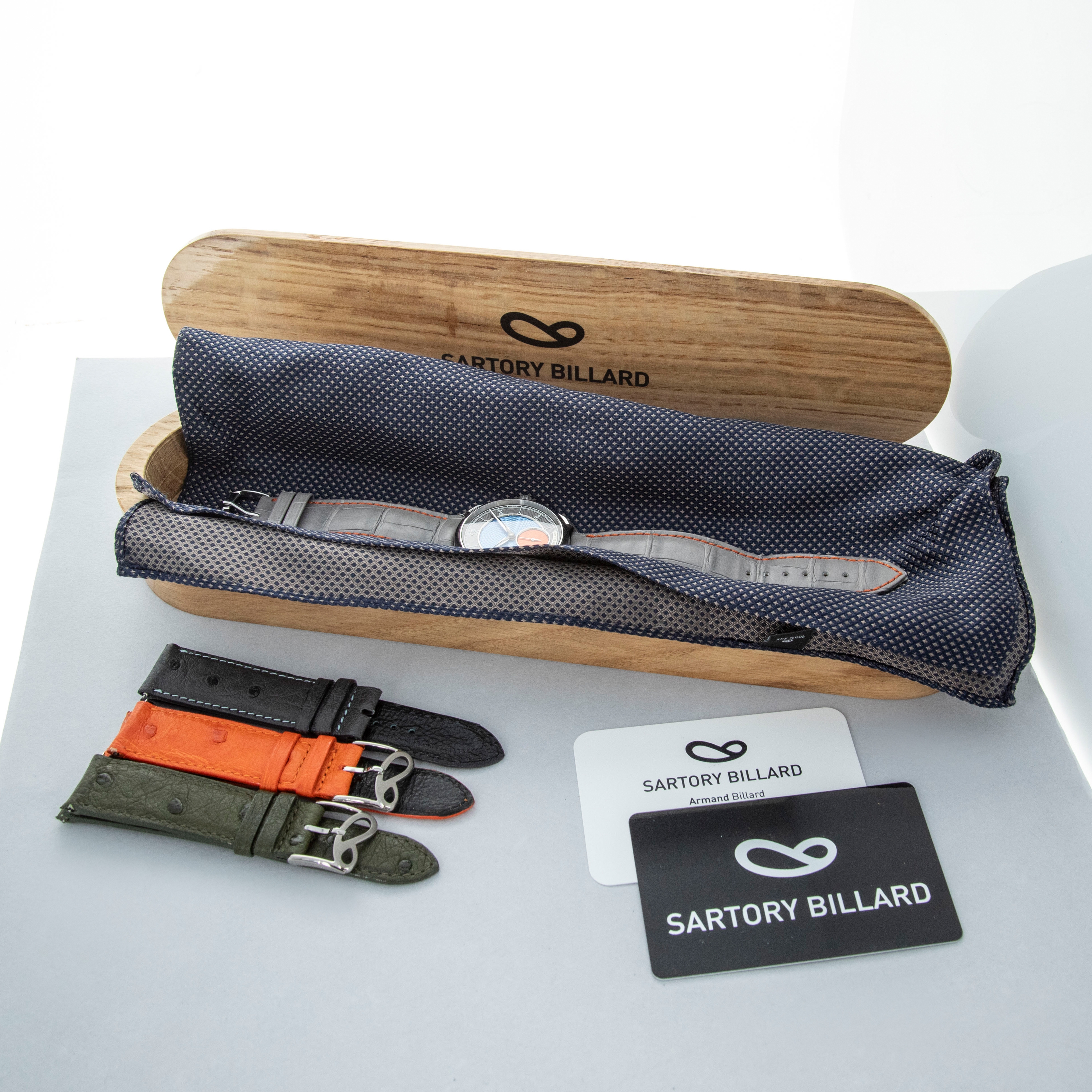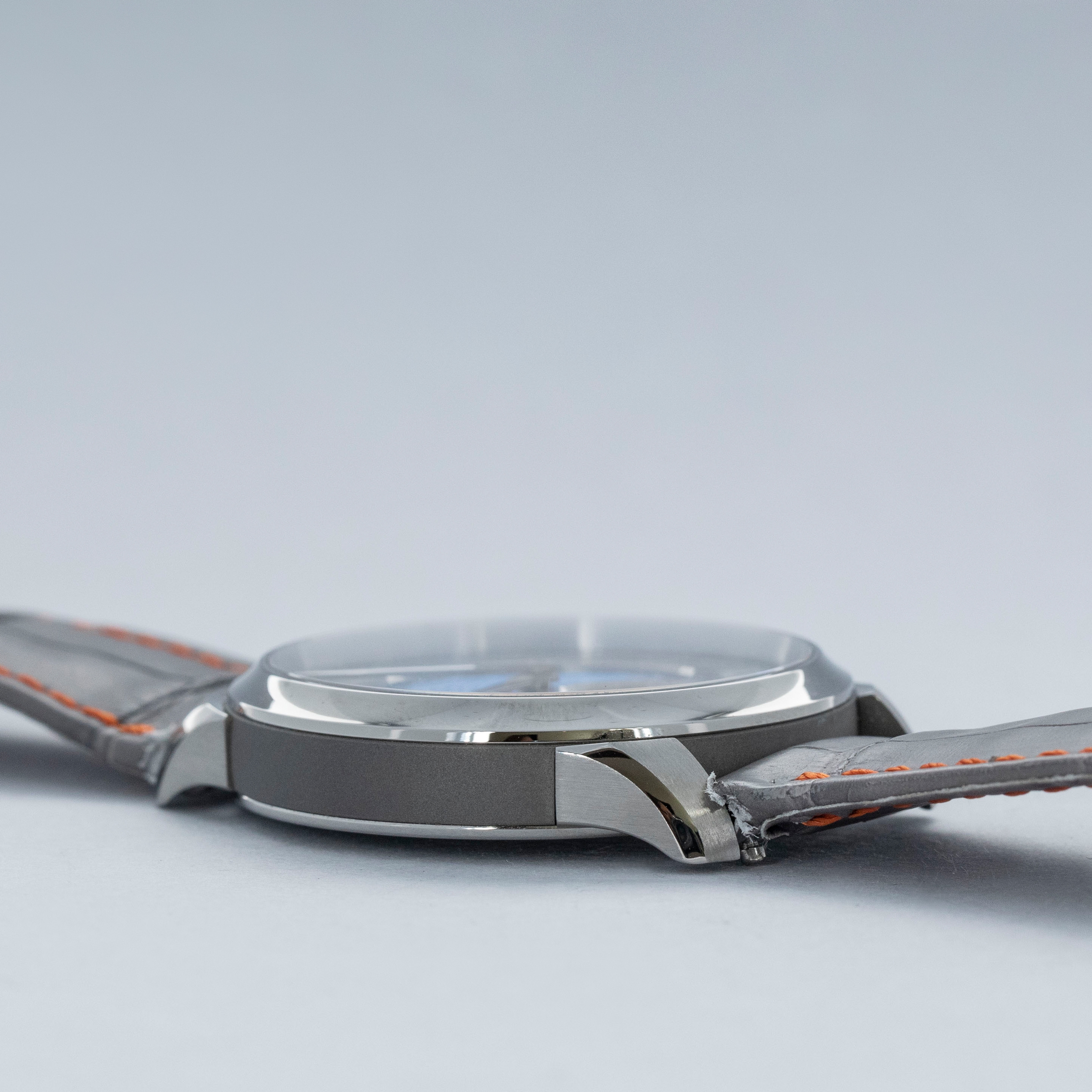 Overall near mint. The titanium case shows signs of very careful wear. The dial and hands are like new. Fitted with a Jean Rousseau grey alligator strap in near-mint condition. Comes with box and papers, along with three spare unused Sartory Billard straps—two of which are fitted with buckles.