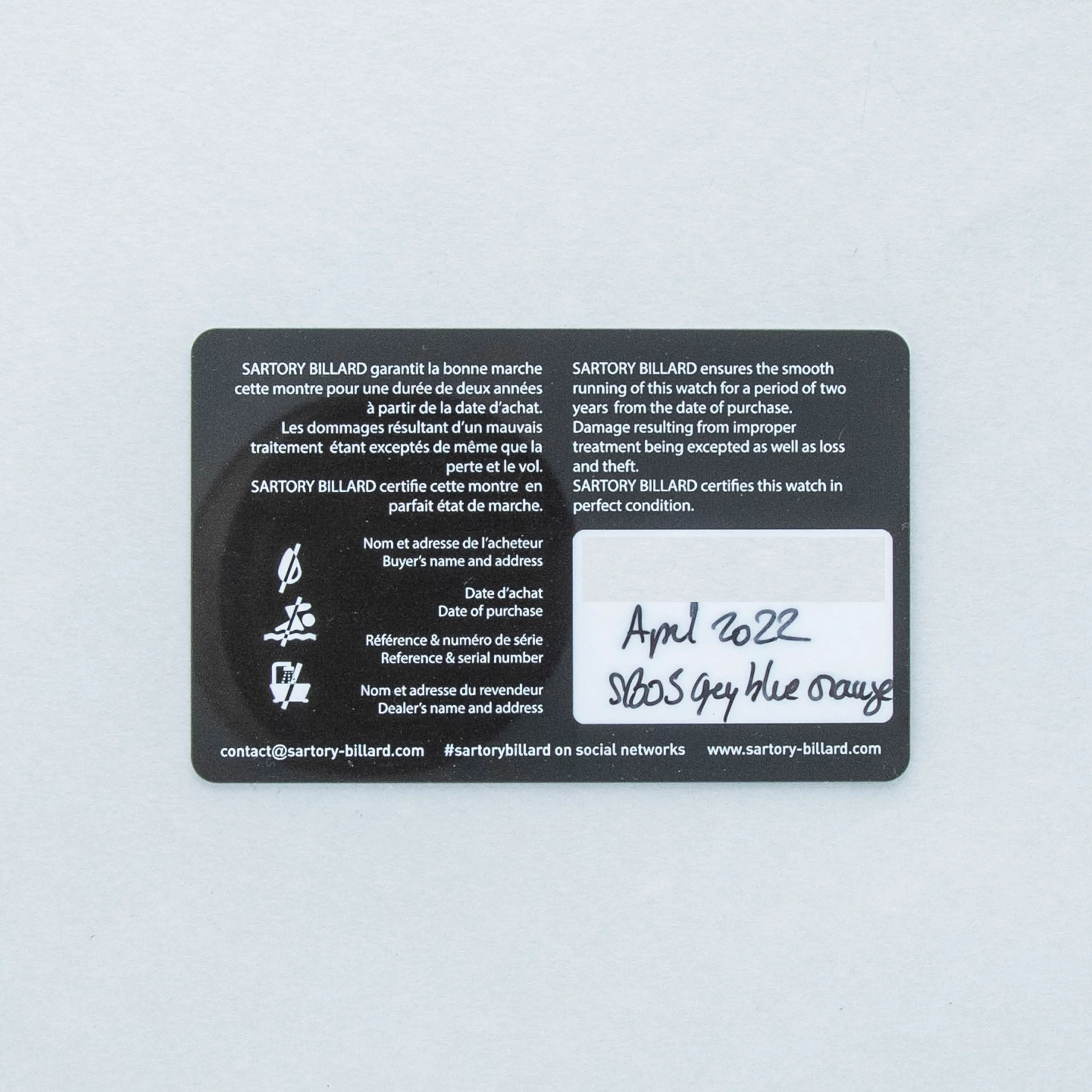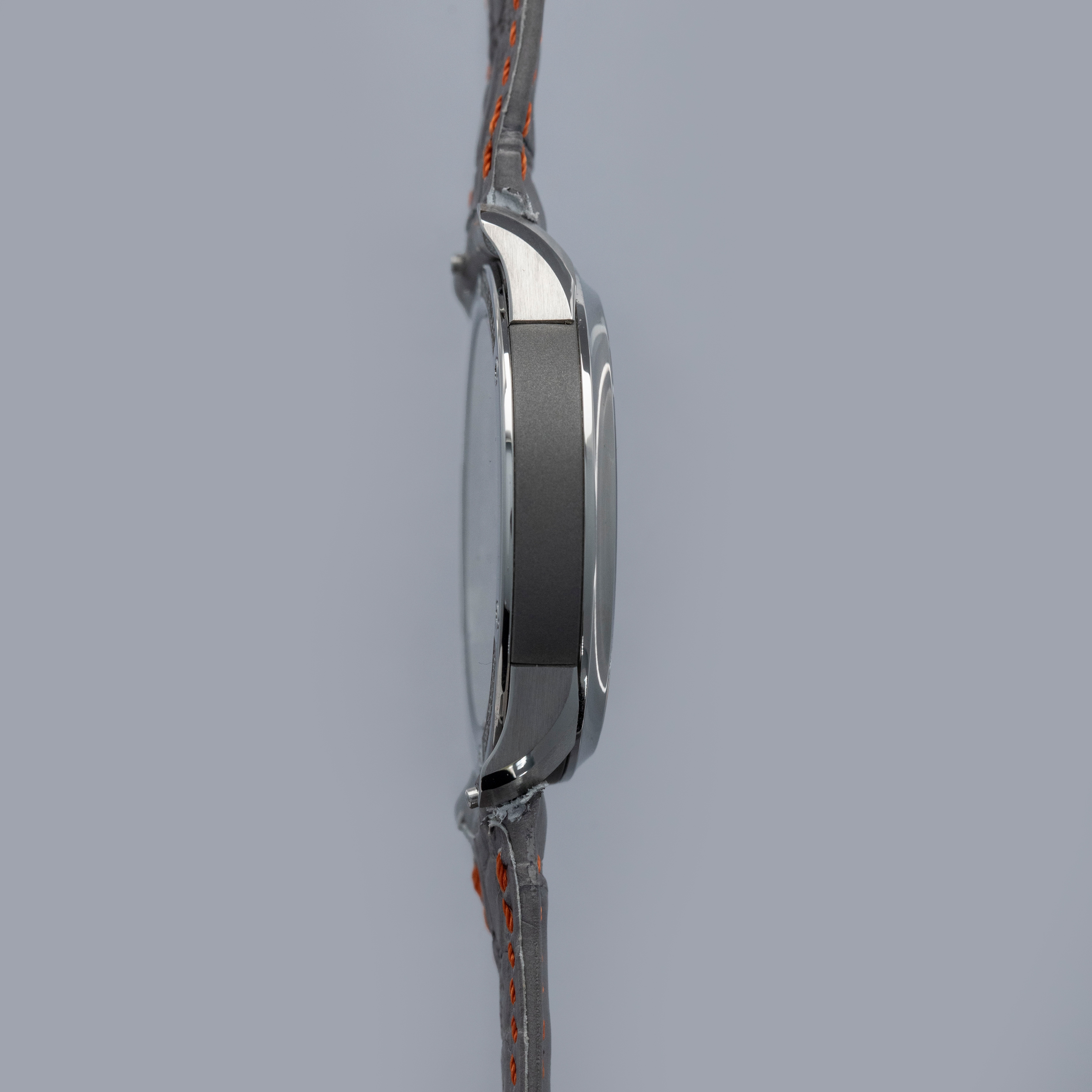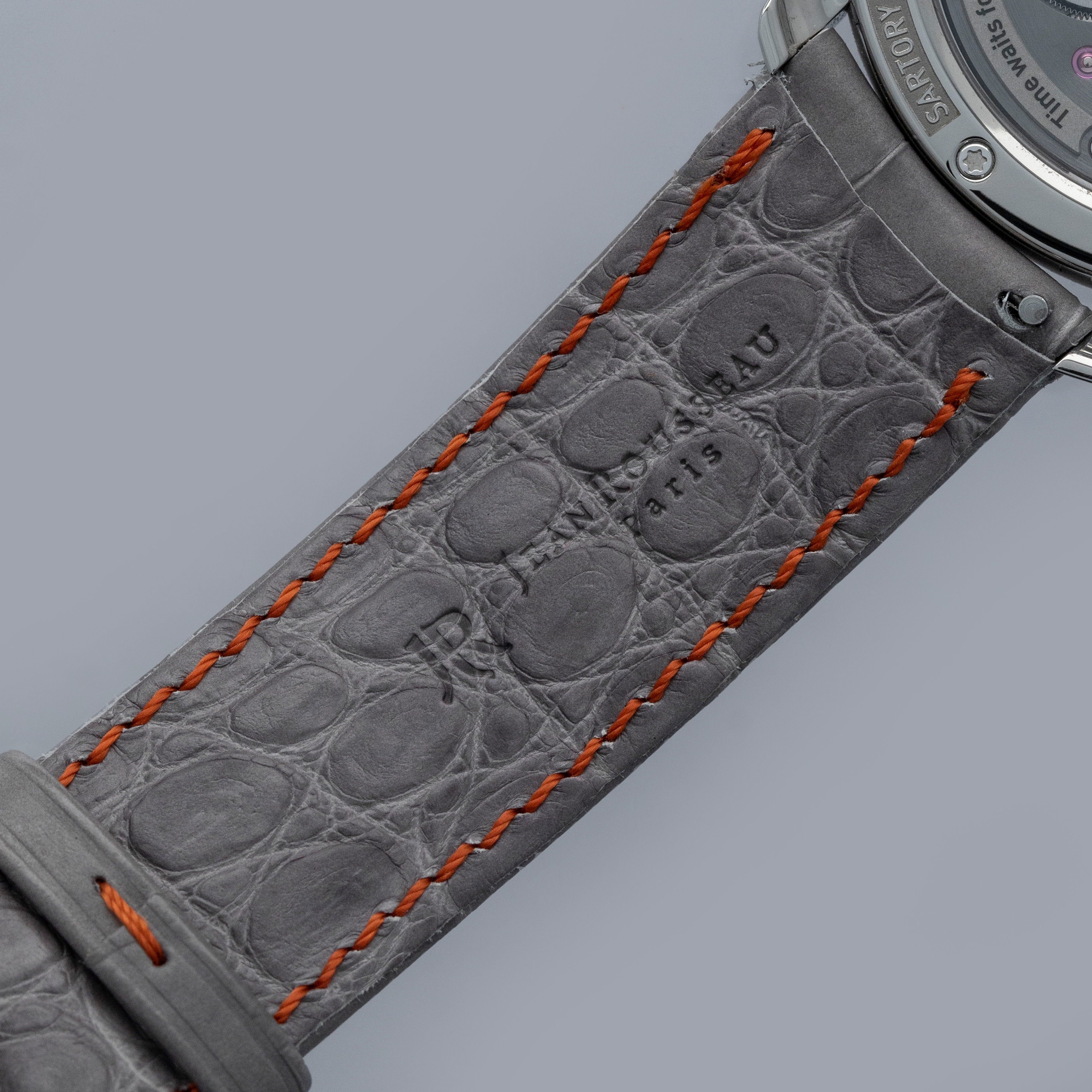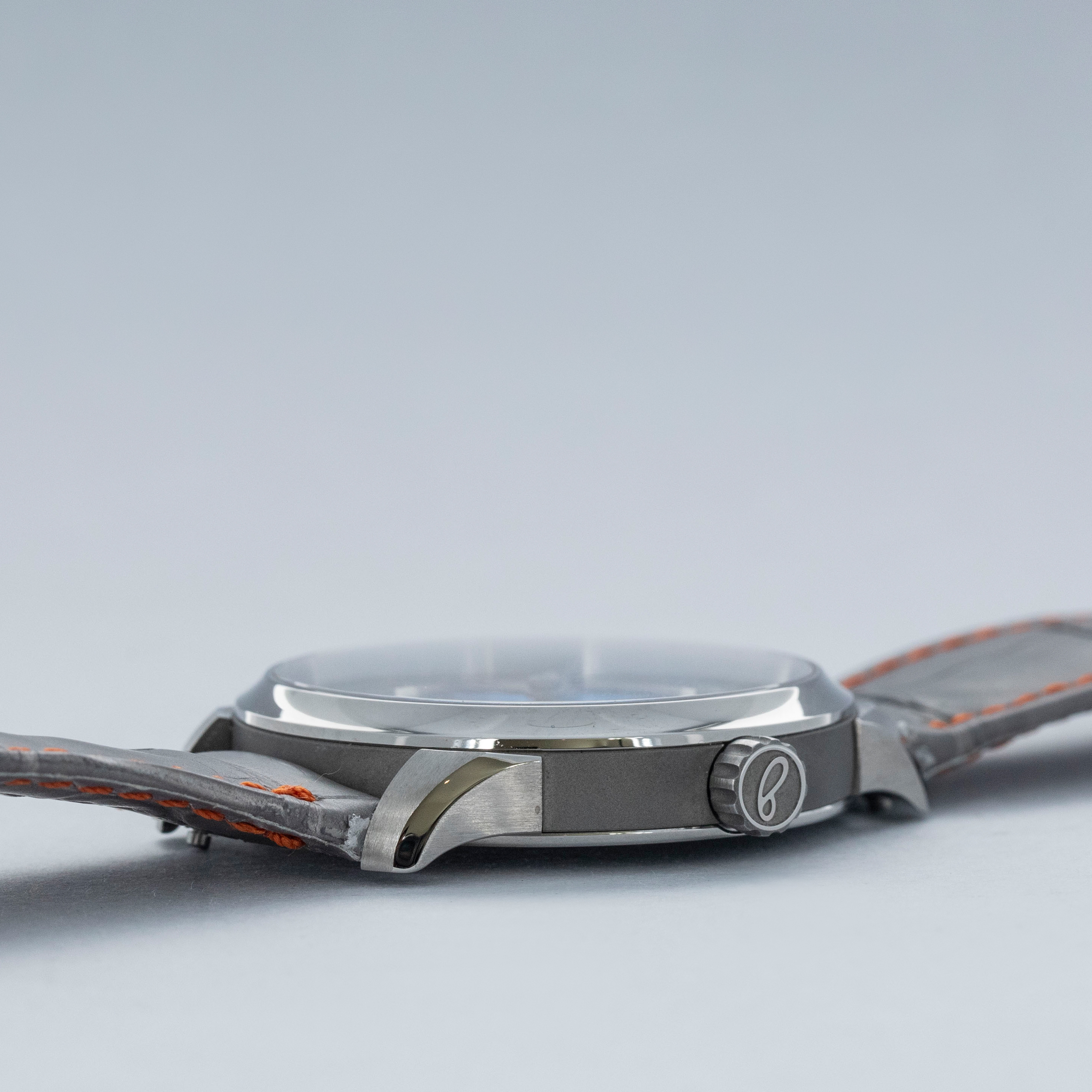 Overall near mint. The titanium case shows signs of very careful wear. The dial and hands are like new. Fitted with a Jean Rousseau grey alligator strap in near-mint condition. Comes with box and papers, along with three spare unused Sartory Billard straps—two of which are fitted with buckles.