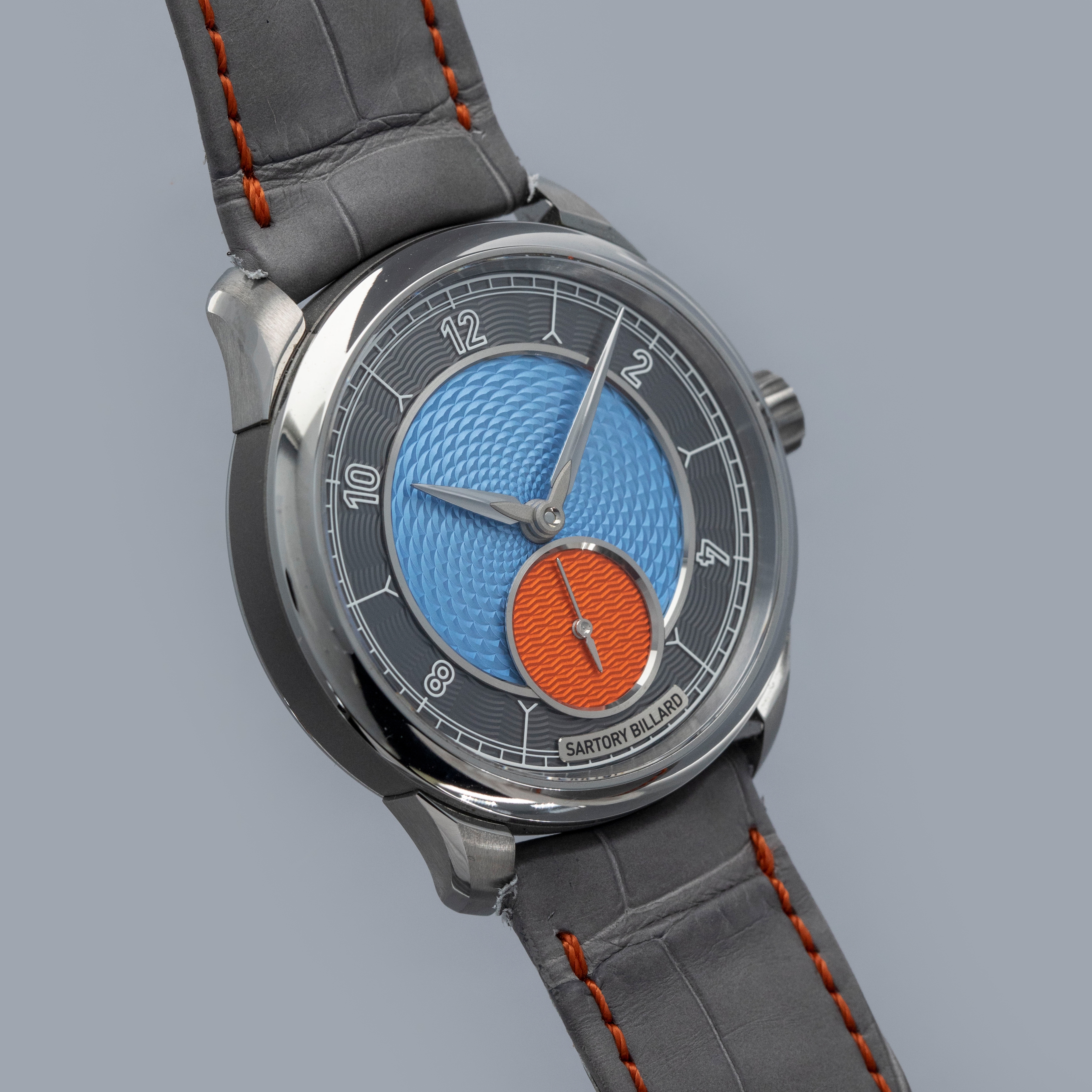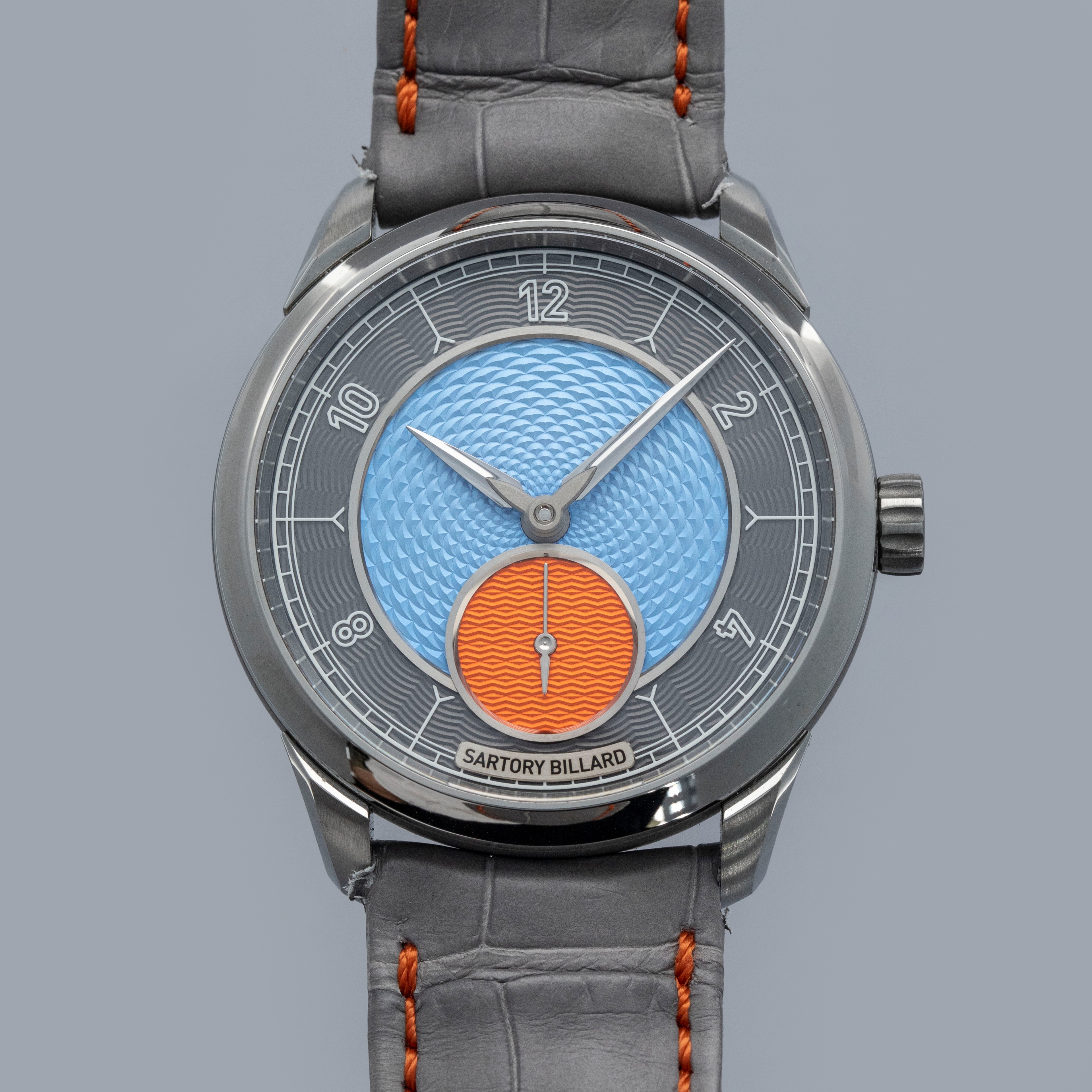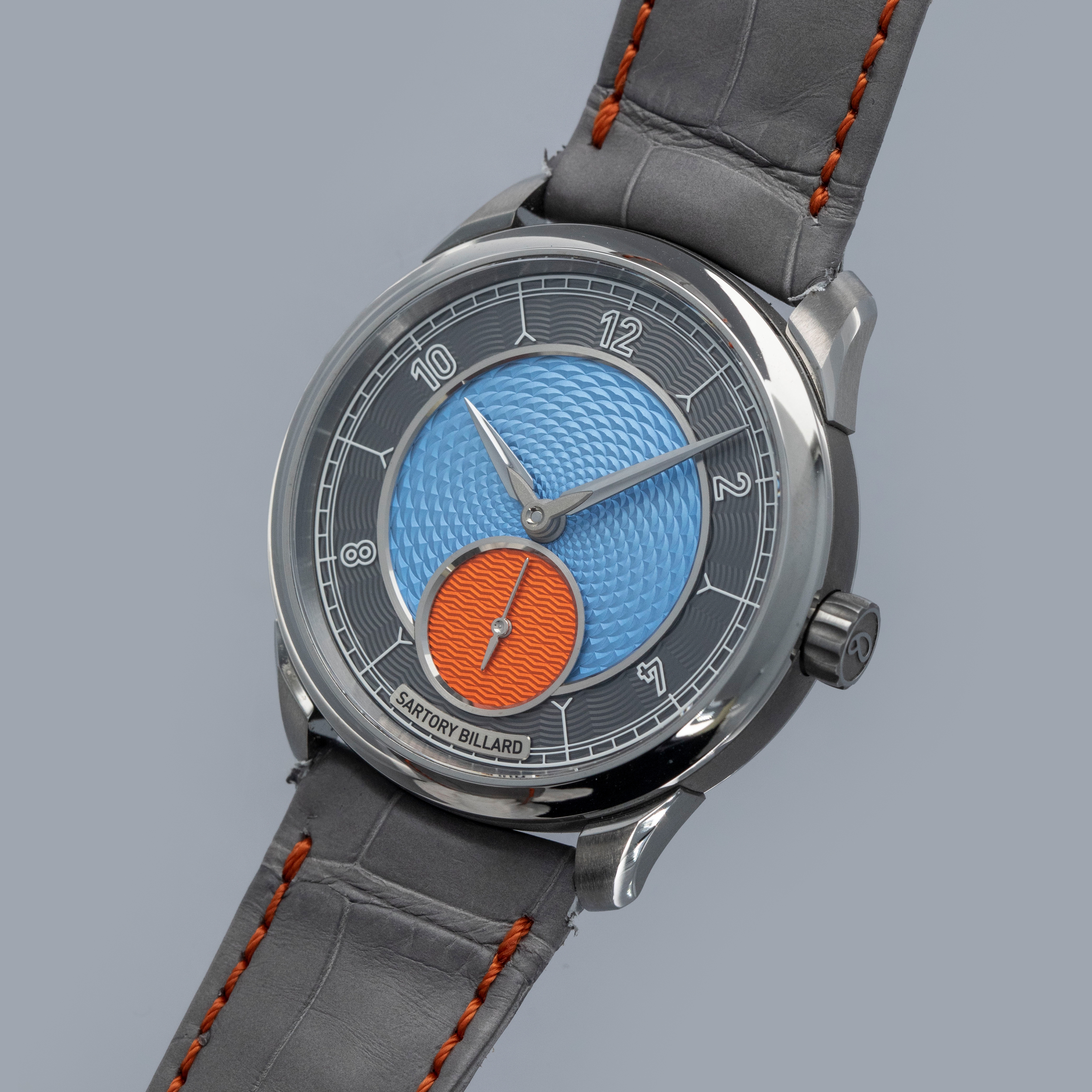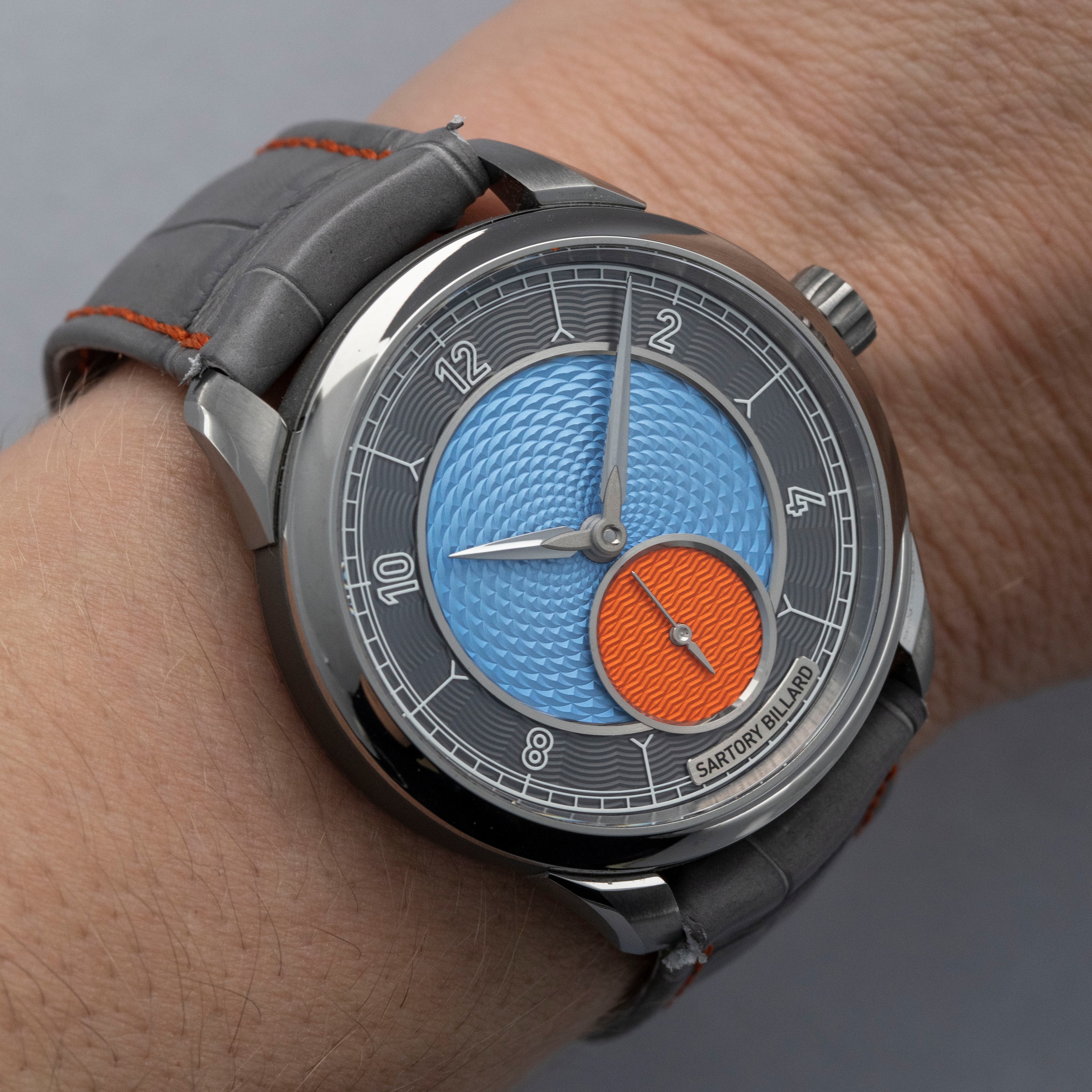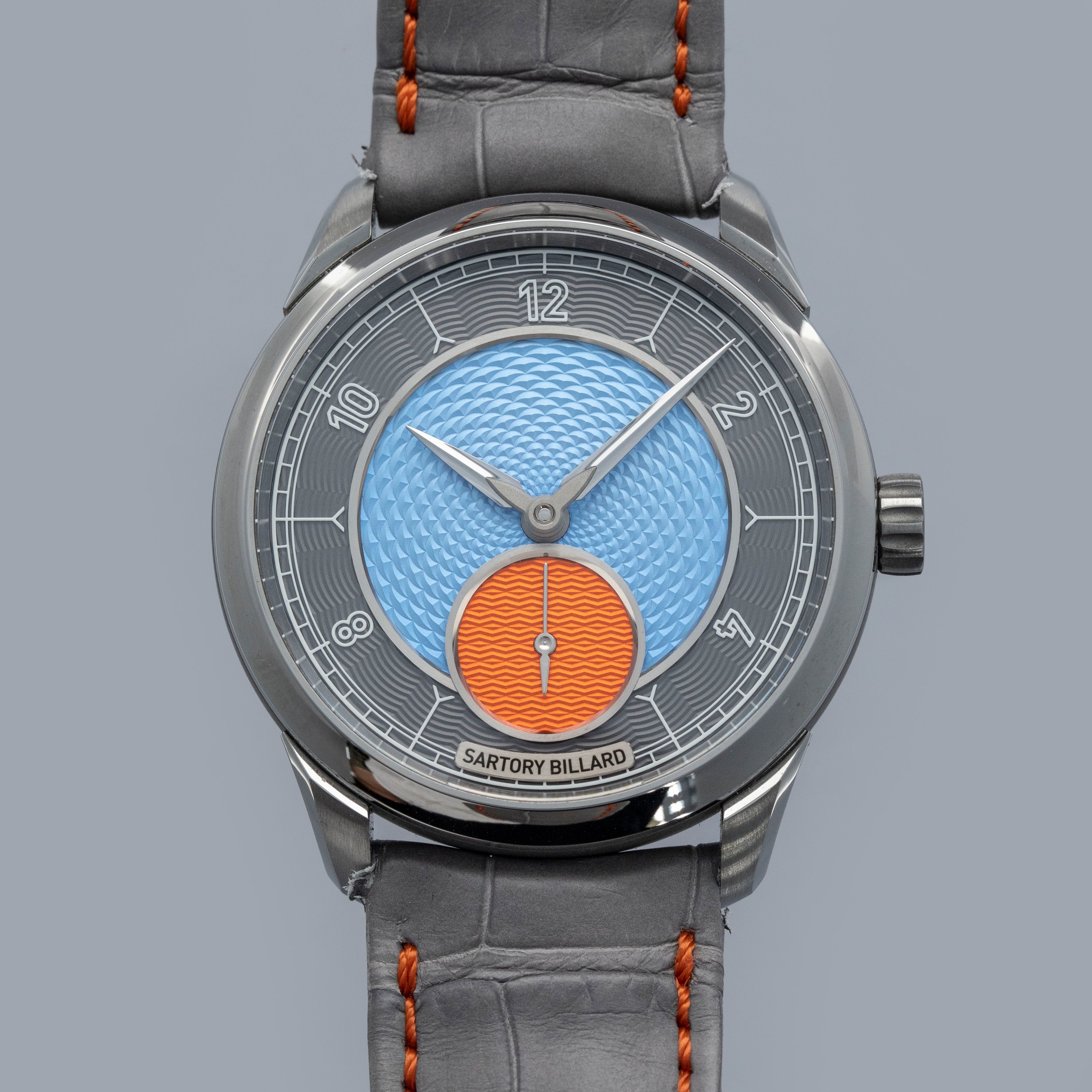While watchmaking is dominated by a handful of Goliath-like brands, there are some independent microbrands that operate like David and offer services that those larger brands just can’t quite offer, like bespoke creations that are individual to the wearer. Founded in 2015 with a simple idea, Sartory Billard set out to design and create timepieces that capture and express the unique history and personality of their customers by offering their clients the ability to customize almost every piece of their watch, so long as the watch was from their range of references. Offered here we have the SB05, a 38.5mm x 8.5mm manual-wind timepiece that is made of titanium and features a stunning dial with a grey chapter ring, an orange running seconds subdial, and a bright blue guilloche-engraved center that allows light to bounce across the dial’s textures and colors in a truly mesmerizing fashion.