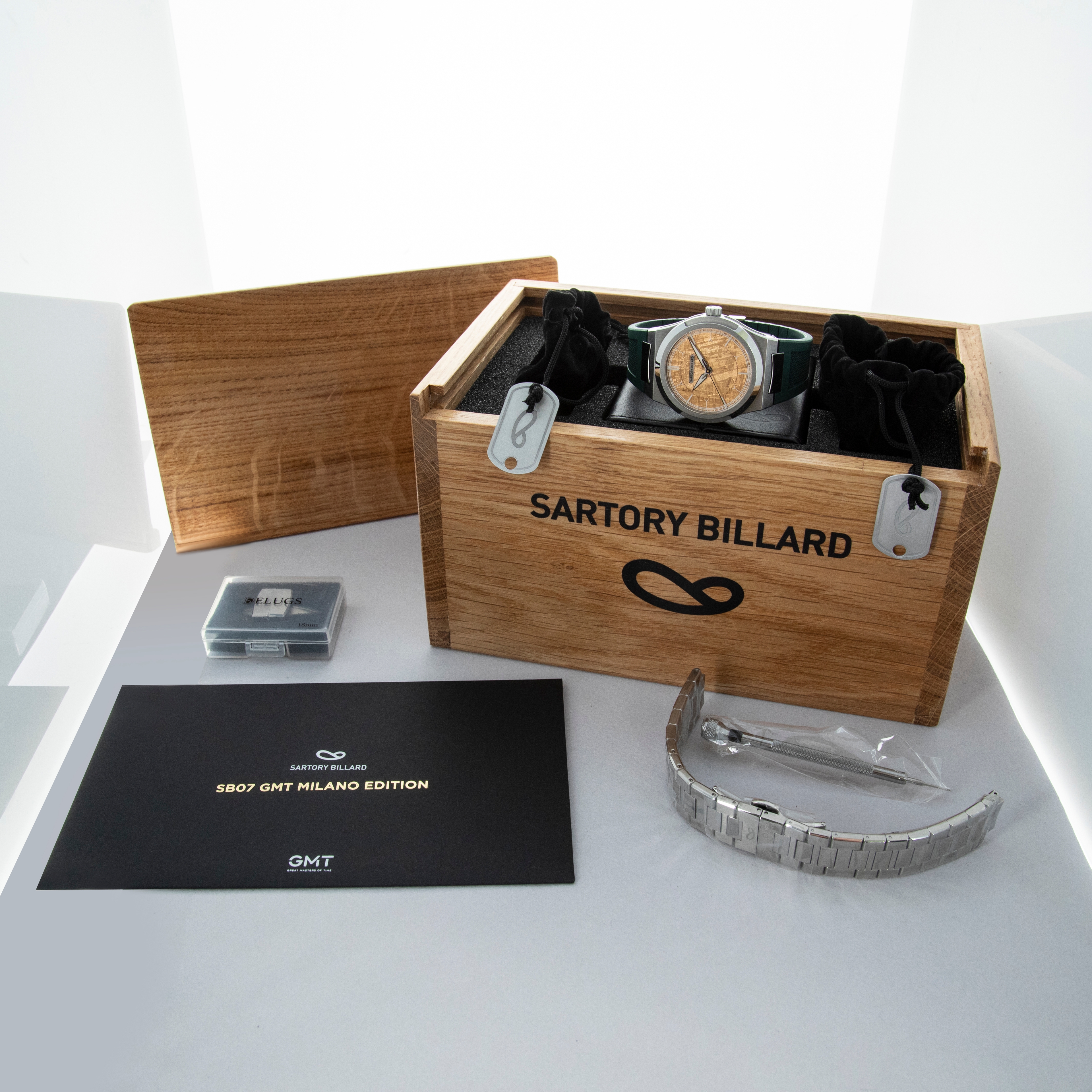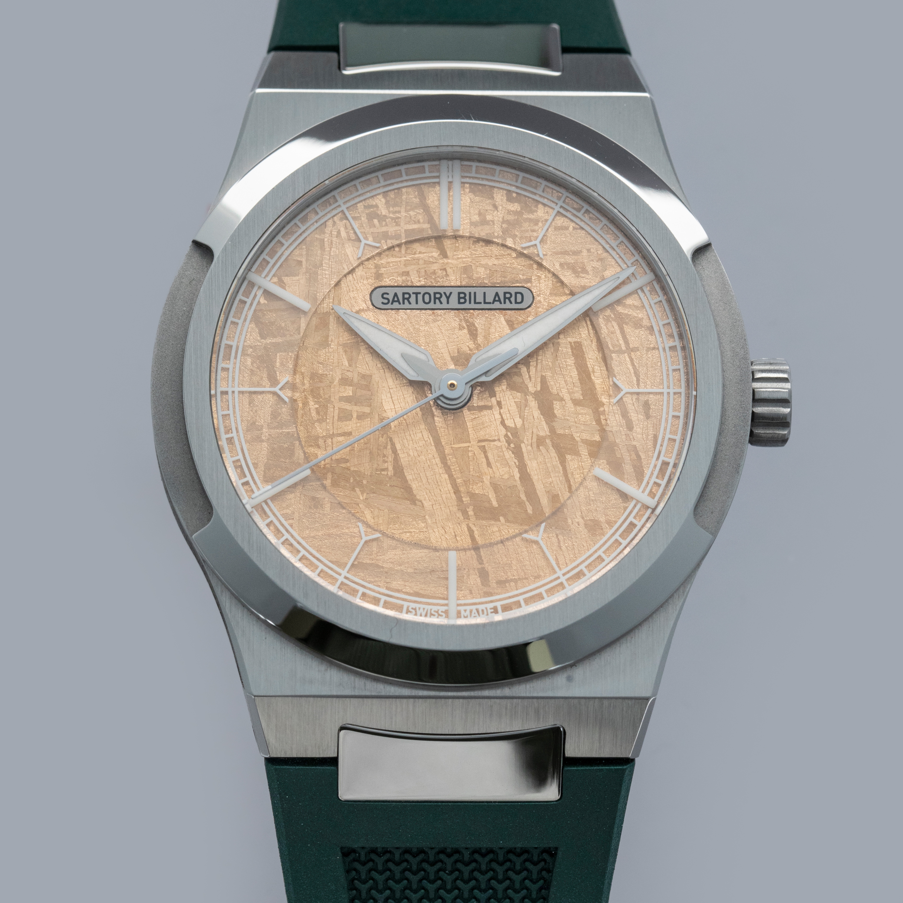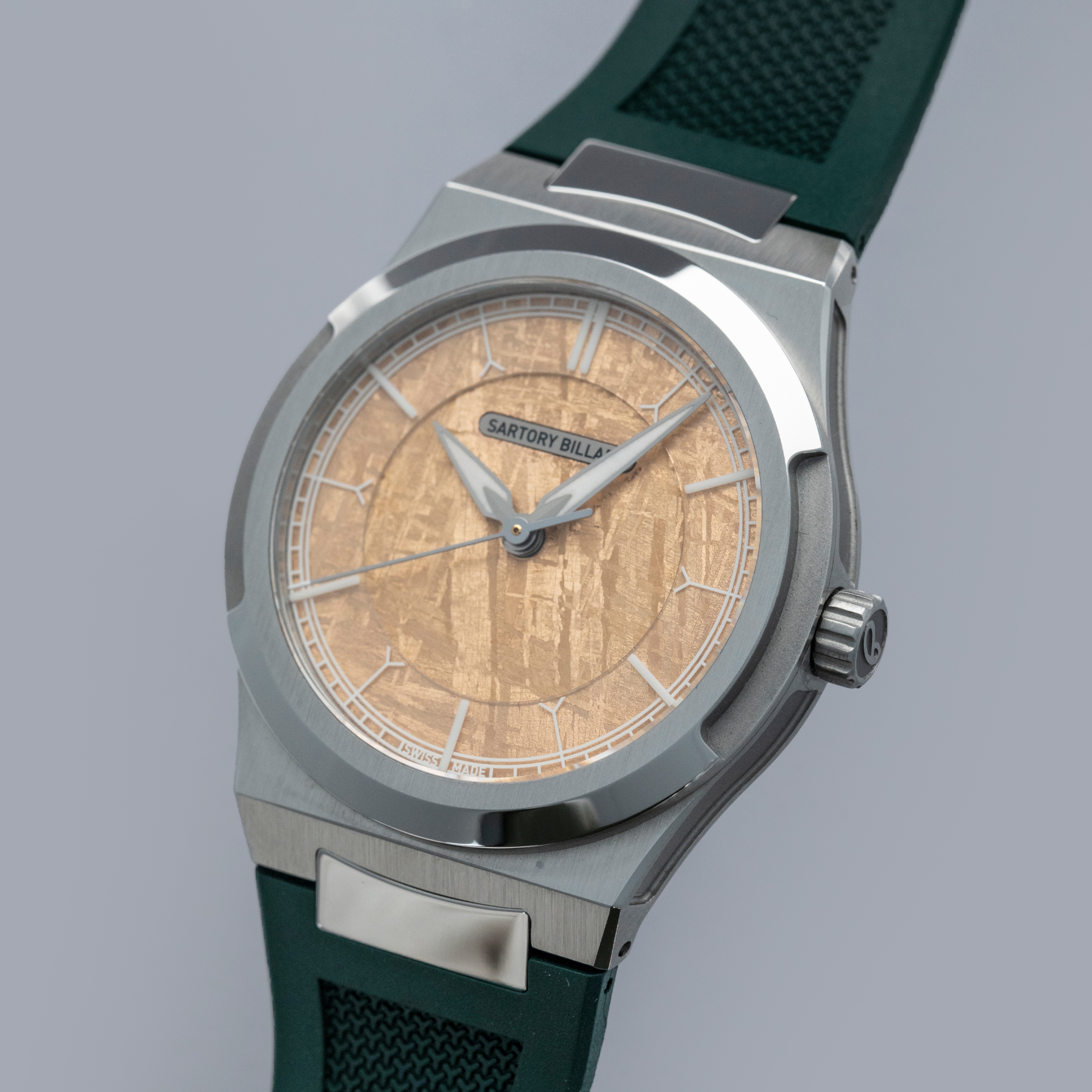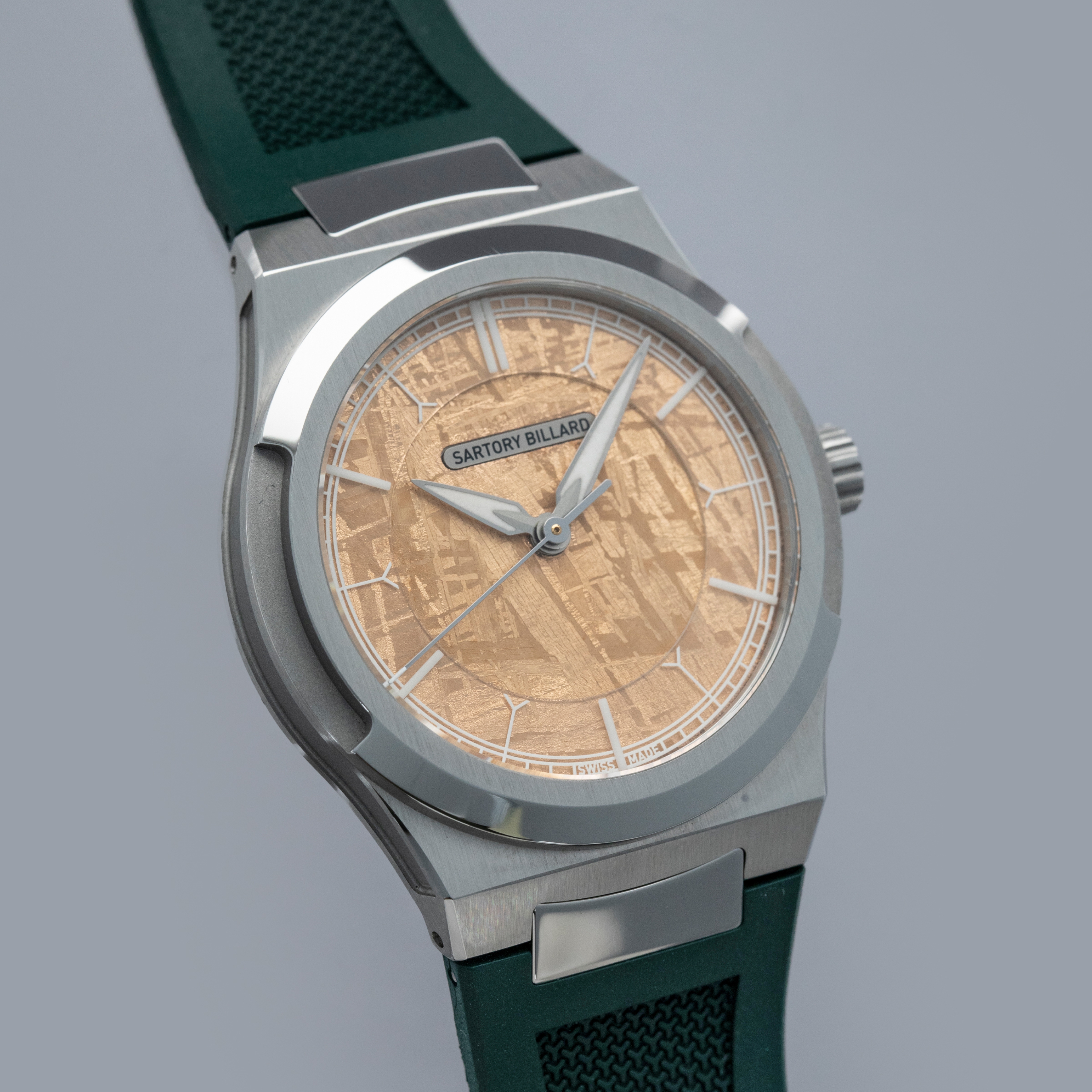While watchmaking is dominated by a handful of Goliath-like brands, there are some independent microbrands that operate like David and offer services that those larger brands just can’t quite offer, like bespoke creations that are individual to the wearer. Founded in 2015 with a simple idea, Sartory Billard set out to design and create timepieces that capture and express the unique history and personality of their customers by offering their clients the ability to customize almost every piece of their watch, so long as the watch was from their range of references. Offered here we have the SB07, the brand’s integrated bracelet sports watch launched in 2023. Boasting a tonneau-shaped 40mm x 10.65mm stainless steel case, the SB07 speaks to the market’s desire for functional sports watches, but mixed with their distinctive independent watchmaker flourish, which often manifests itself through their incredible dials, as this example shows. Featuring a stunning golden meteorite dial with bright luminous indices, hands, and luminous chapter ring this bright example belongs to the limited edition collection of just 30 pieces that was created in collaboration with Italian watch retailer Great Masters of Time.