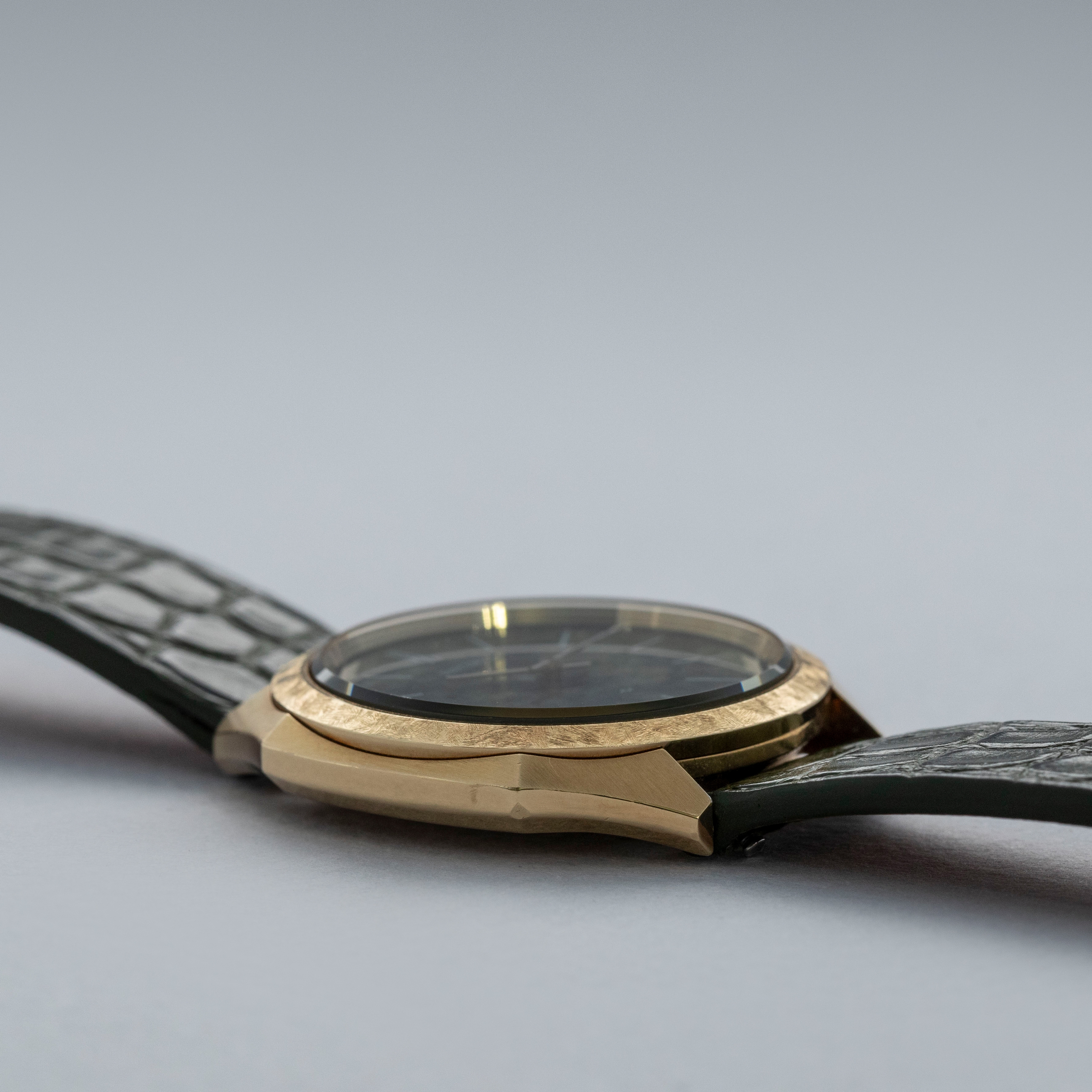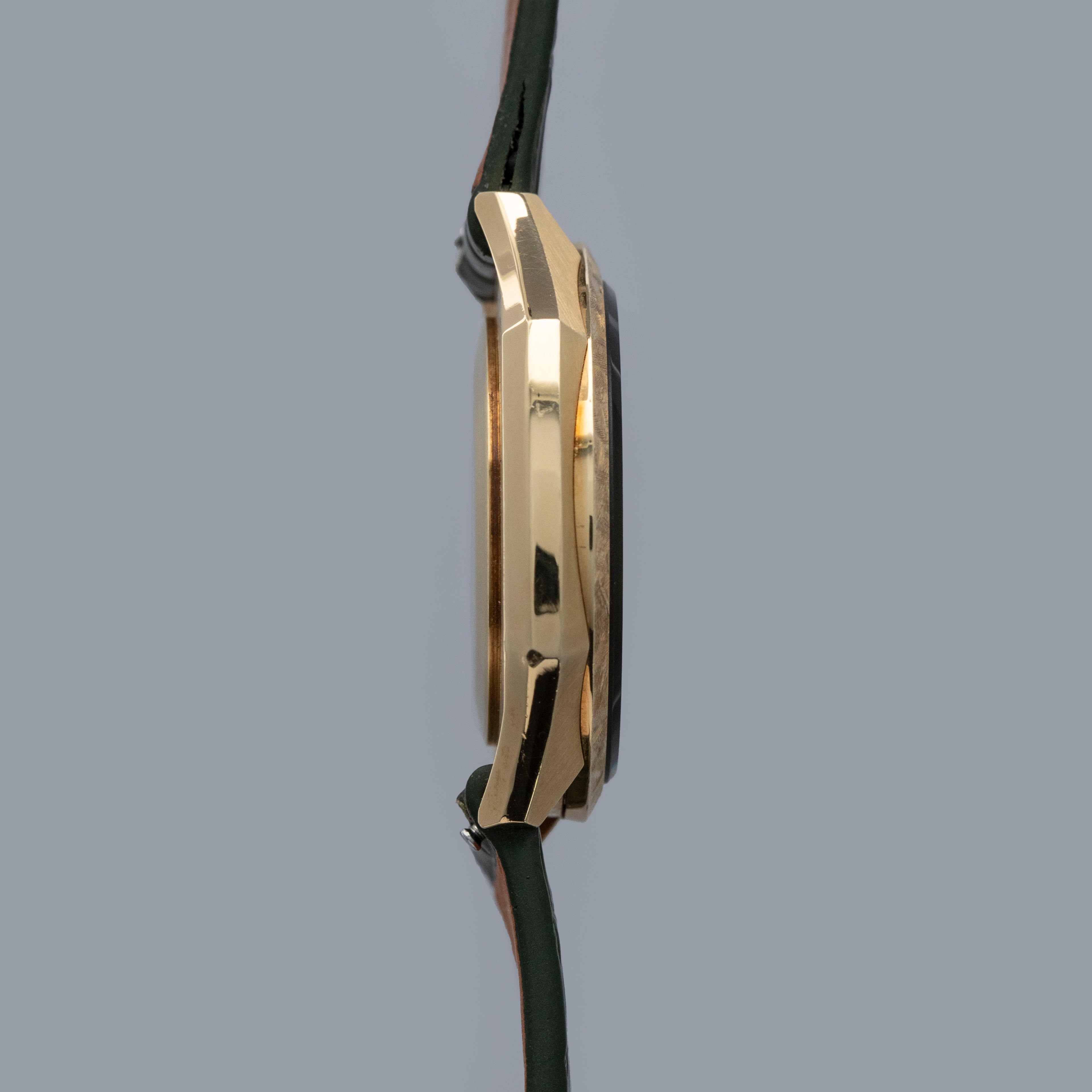 Featuring an impressive 36mm 18kt yellow gold construction, this example's case is almost octagonal thanks to the angularity of its mid-case and lugs, but it is broken up by its round bezel and display.