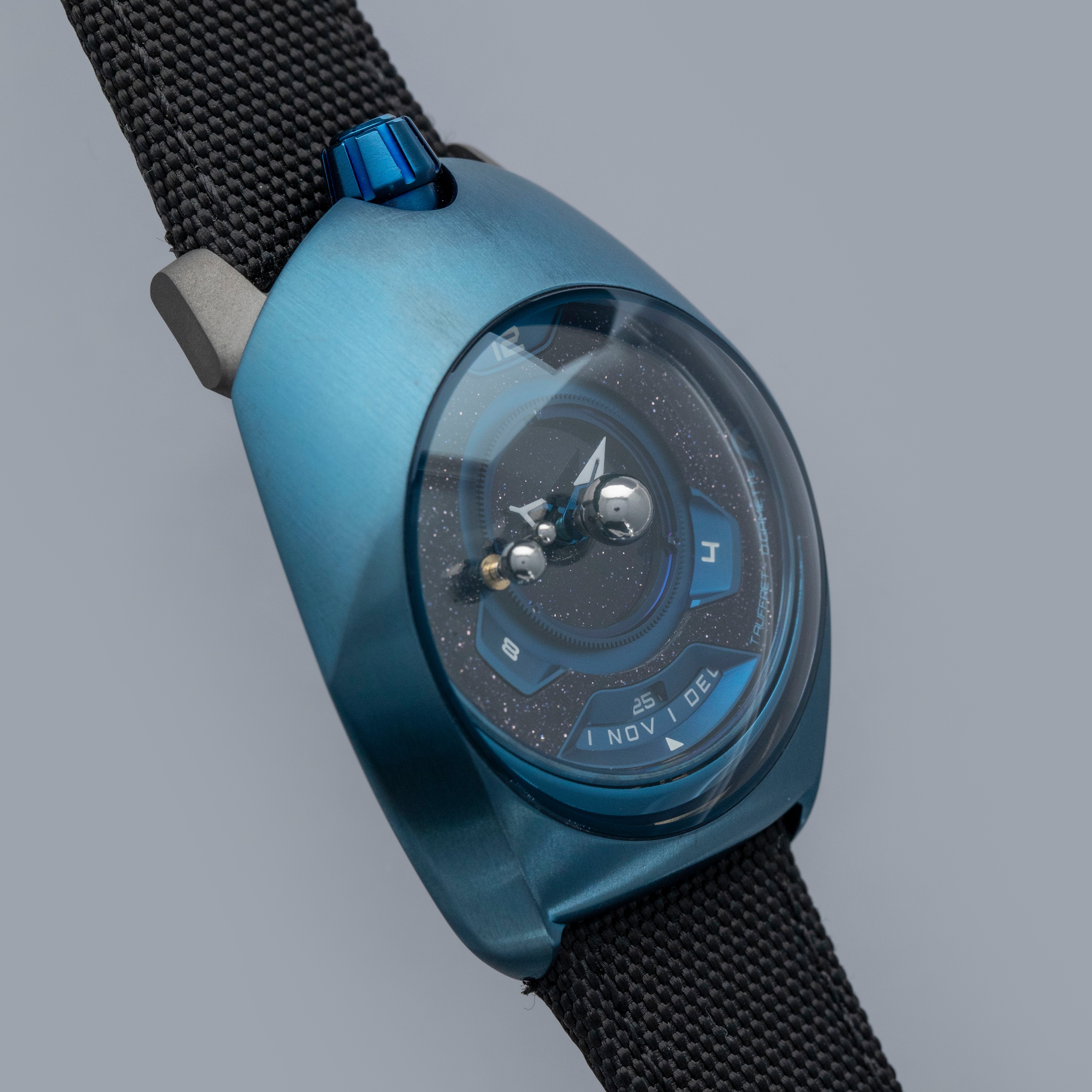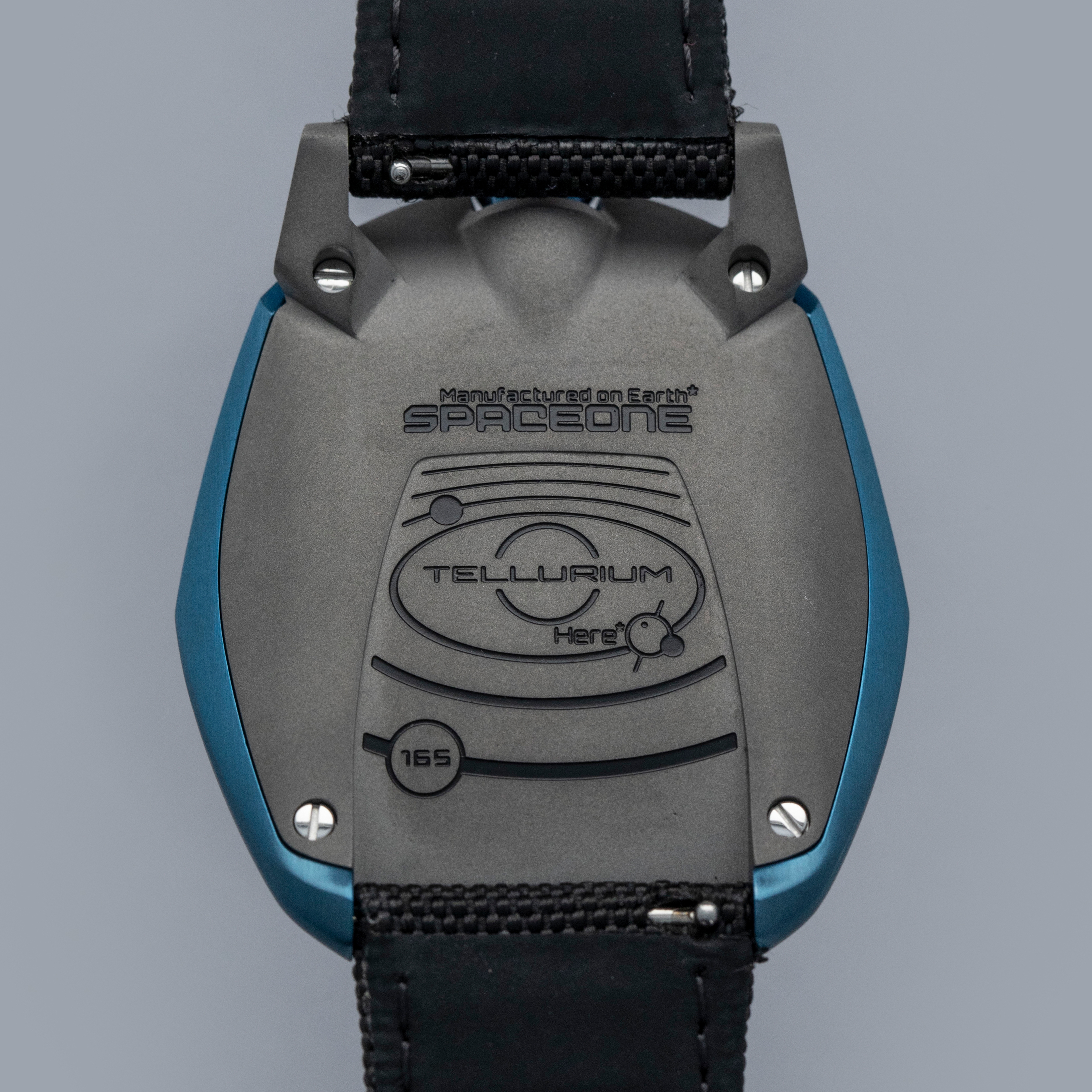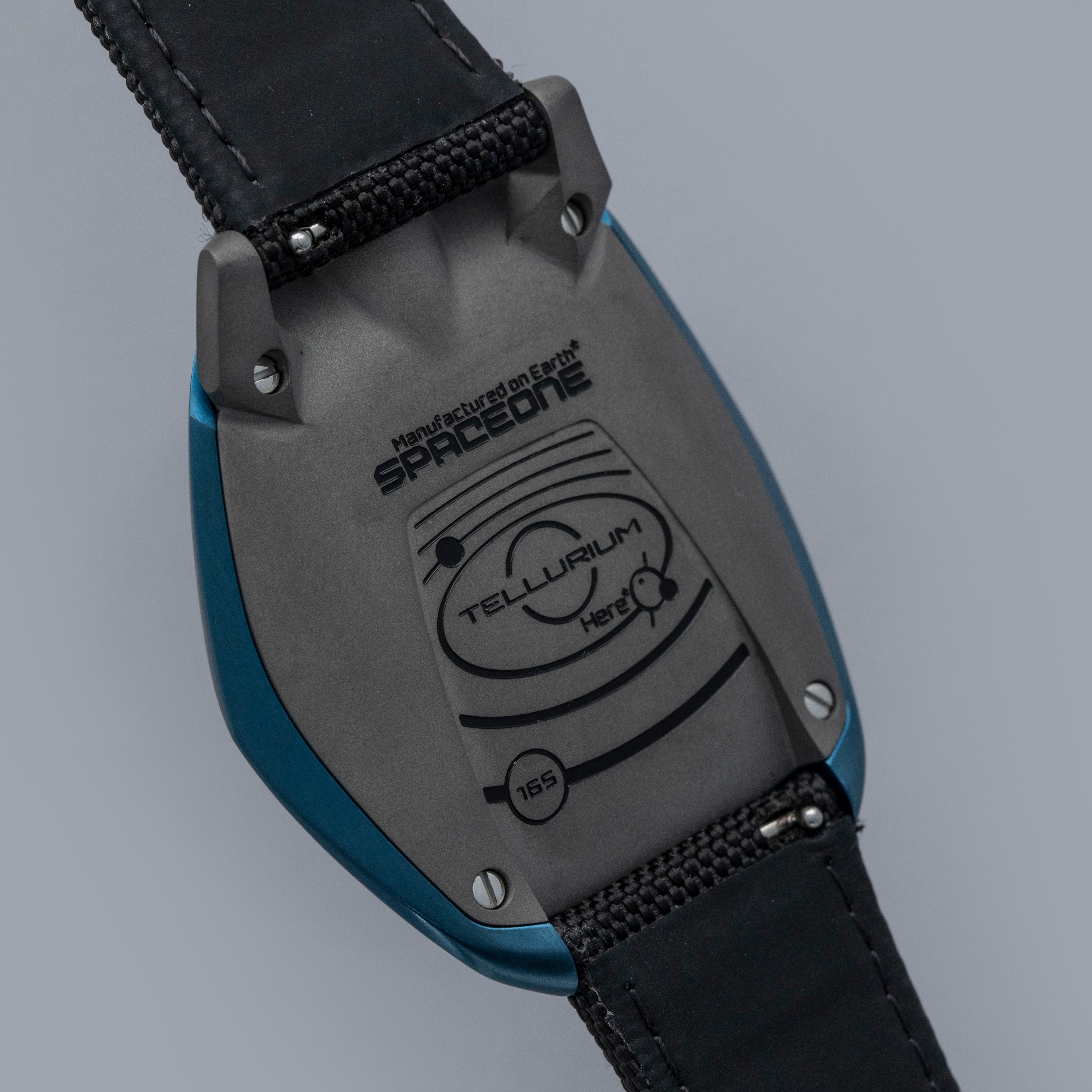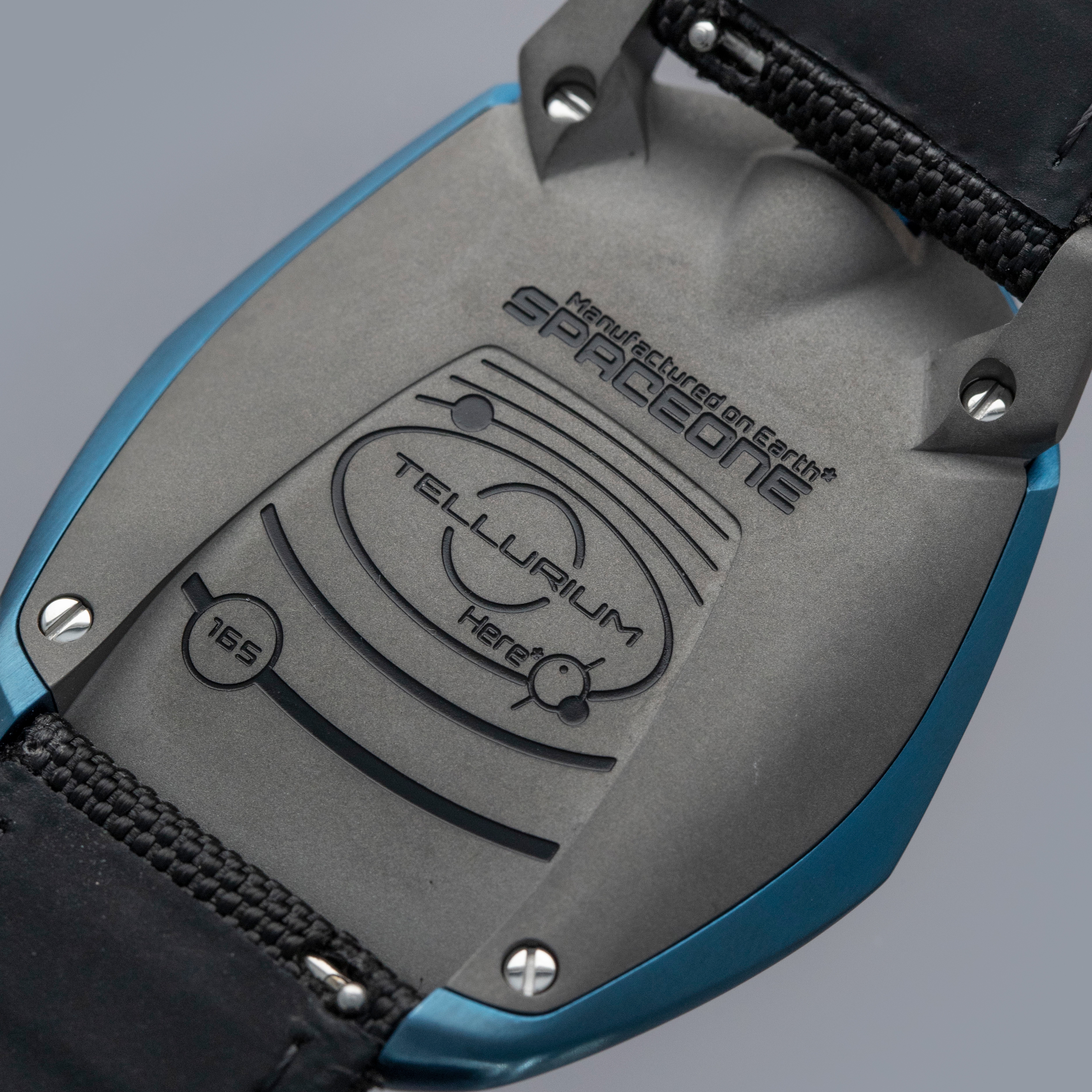 Sporting a futuristic aesthetic, the Tellurium boasts a blue PVD-coated grade 5 titanium case that is shaped like something from outer space.