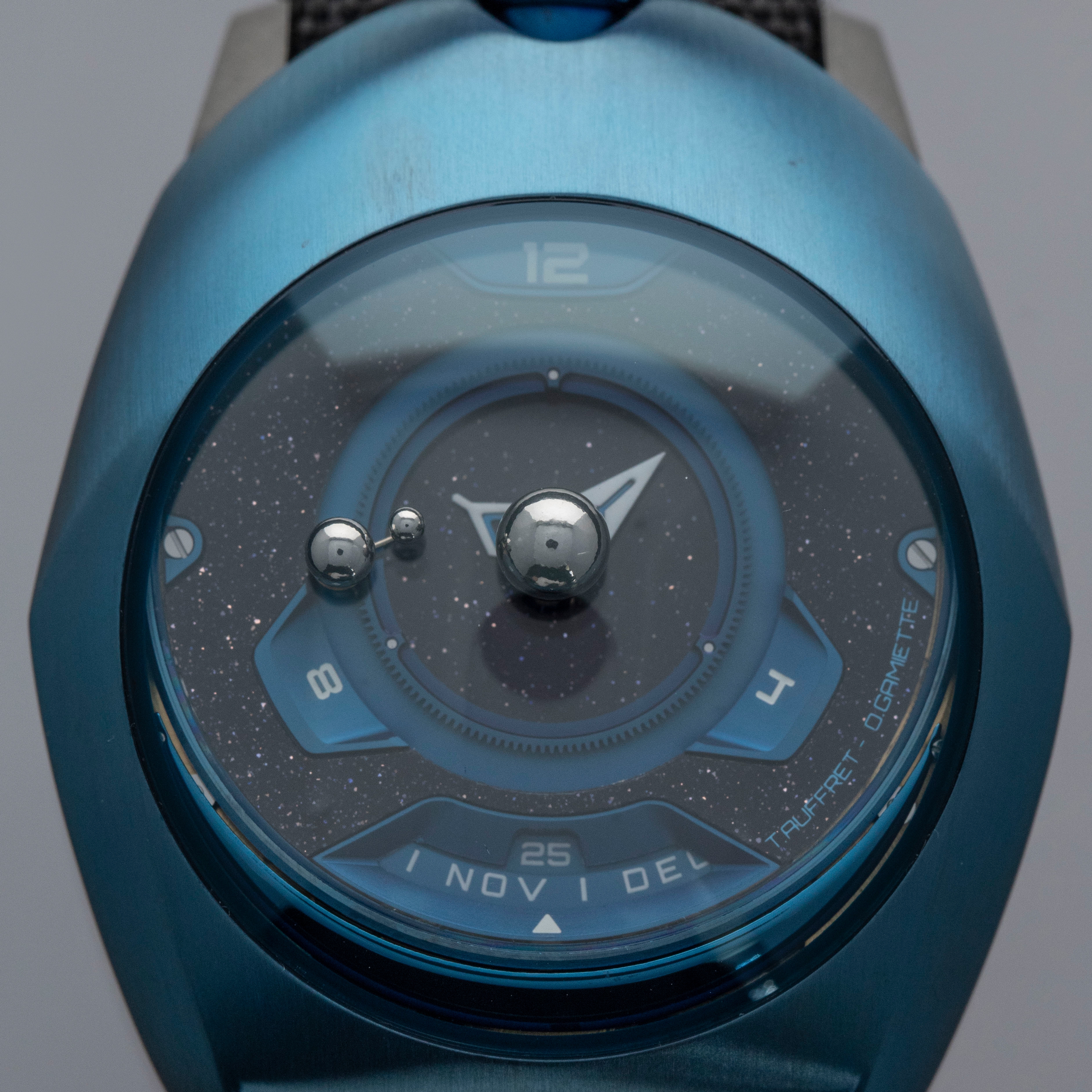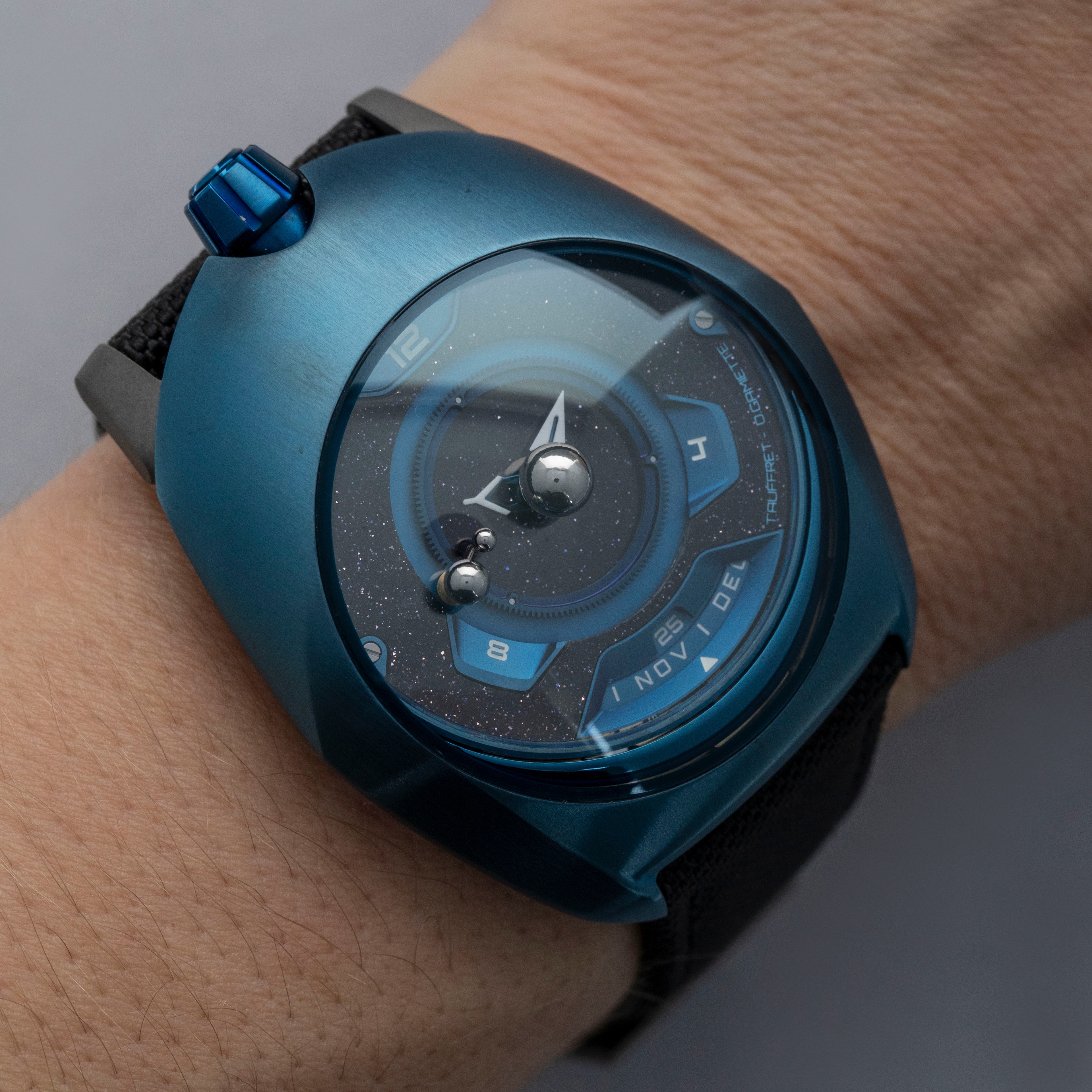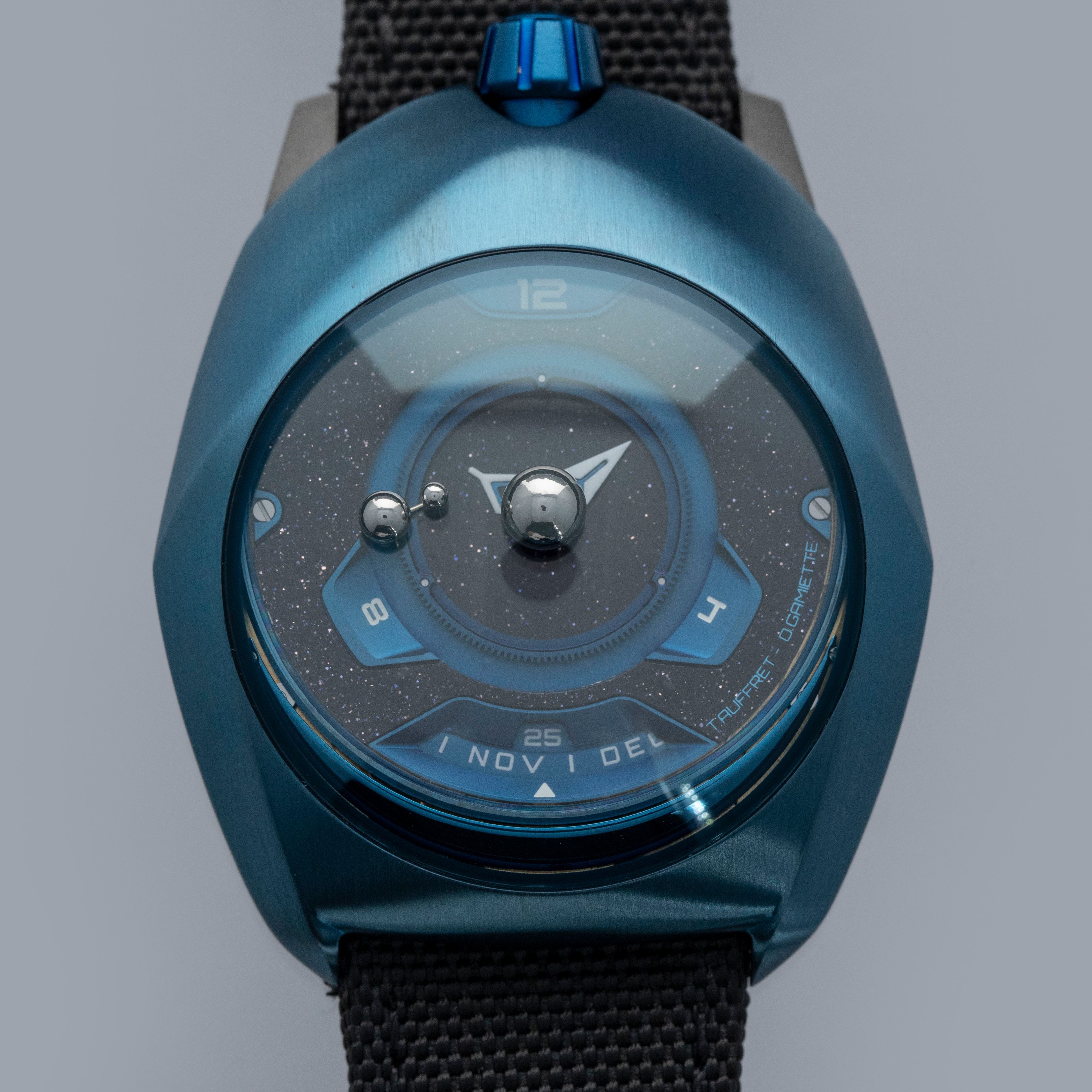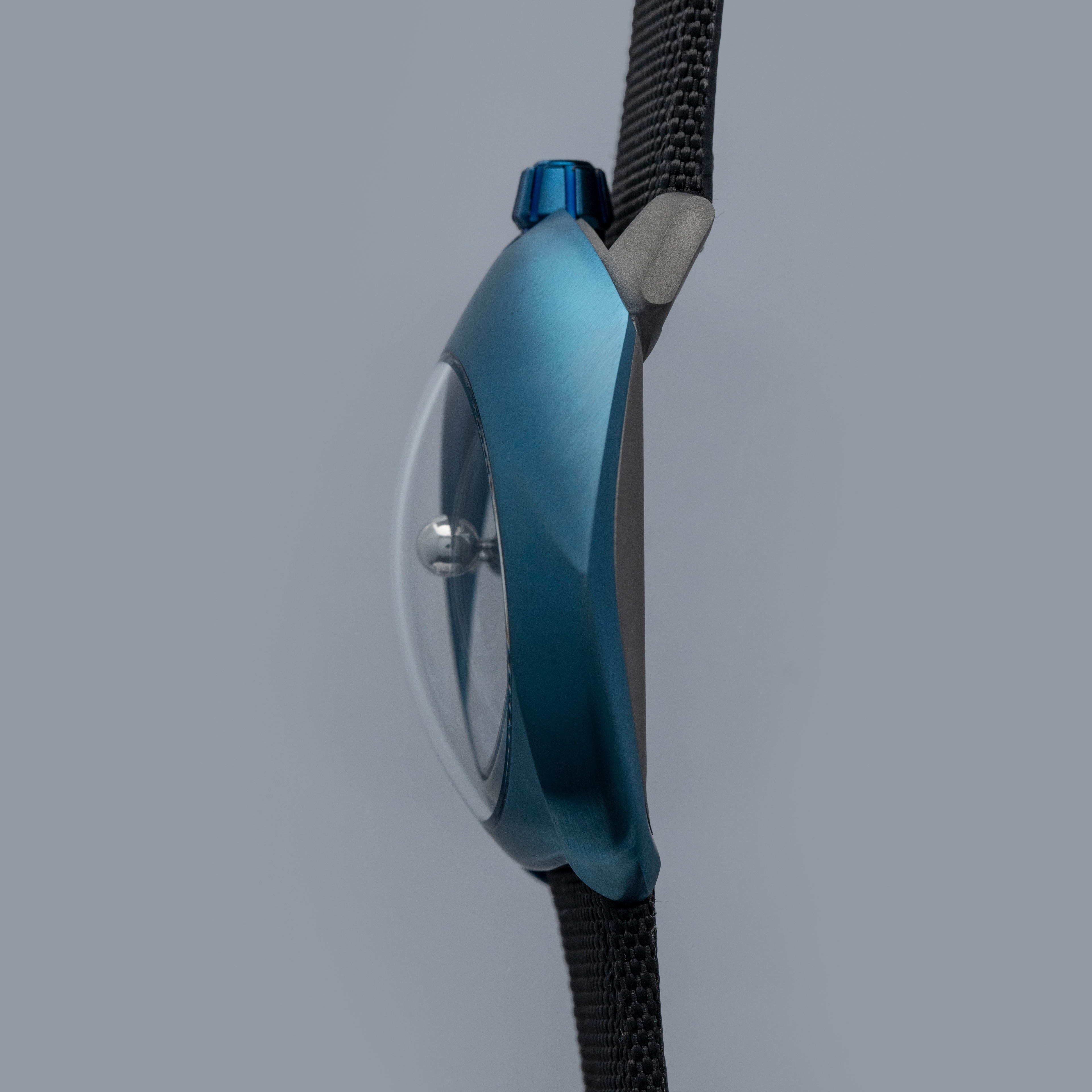Sporting a futuristic aesthetic, the Tellurium boasts a blue PVD-coated grade 5 titanium case that is shaped like something from outer space.