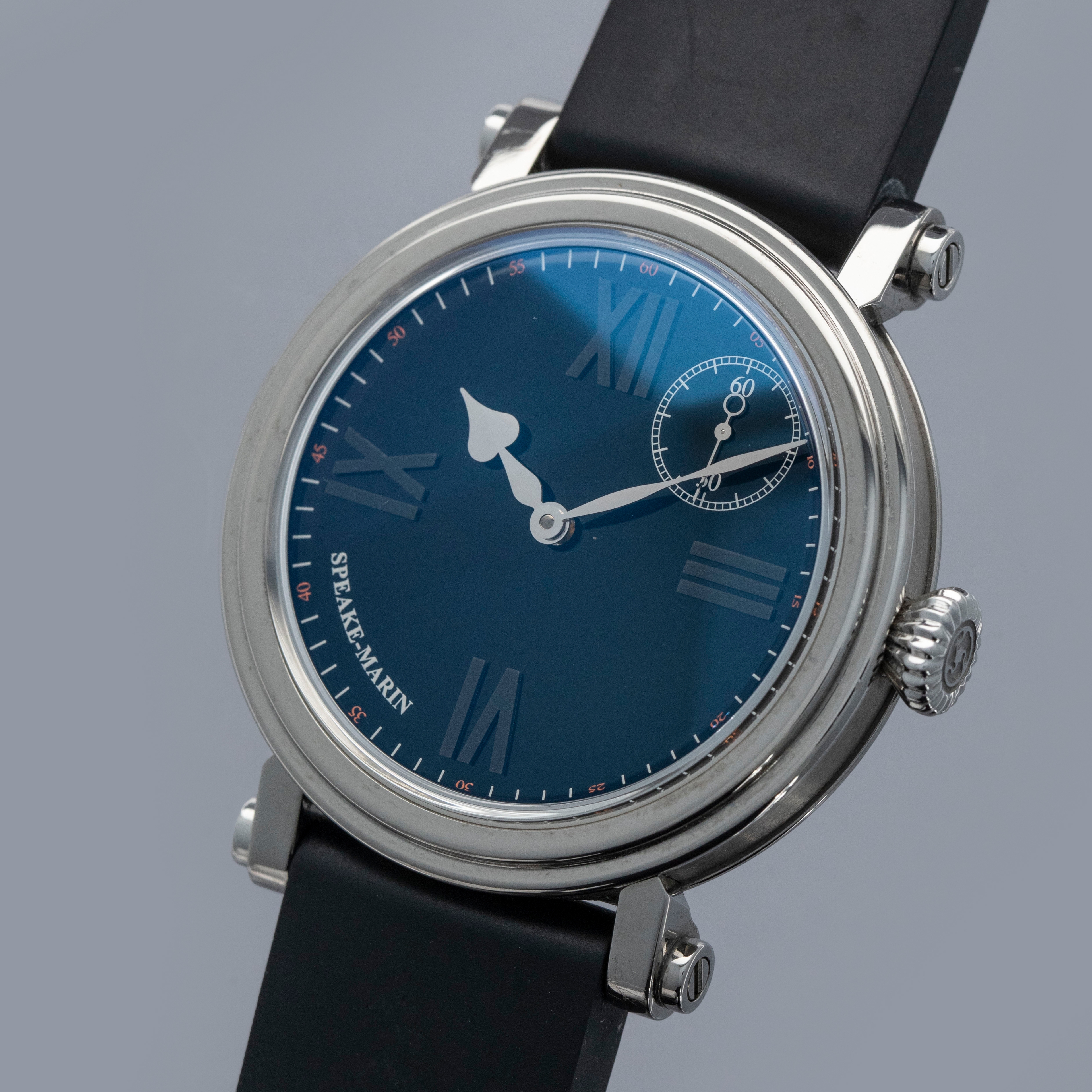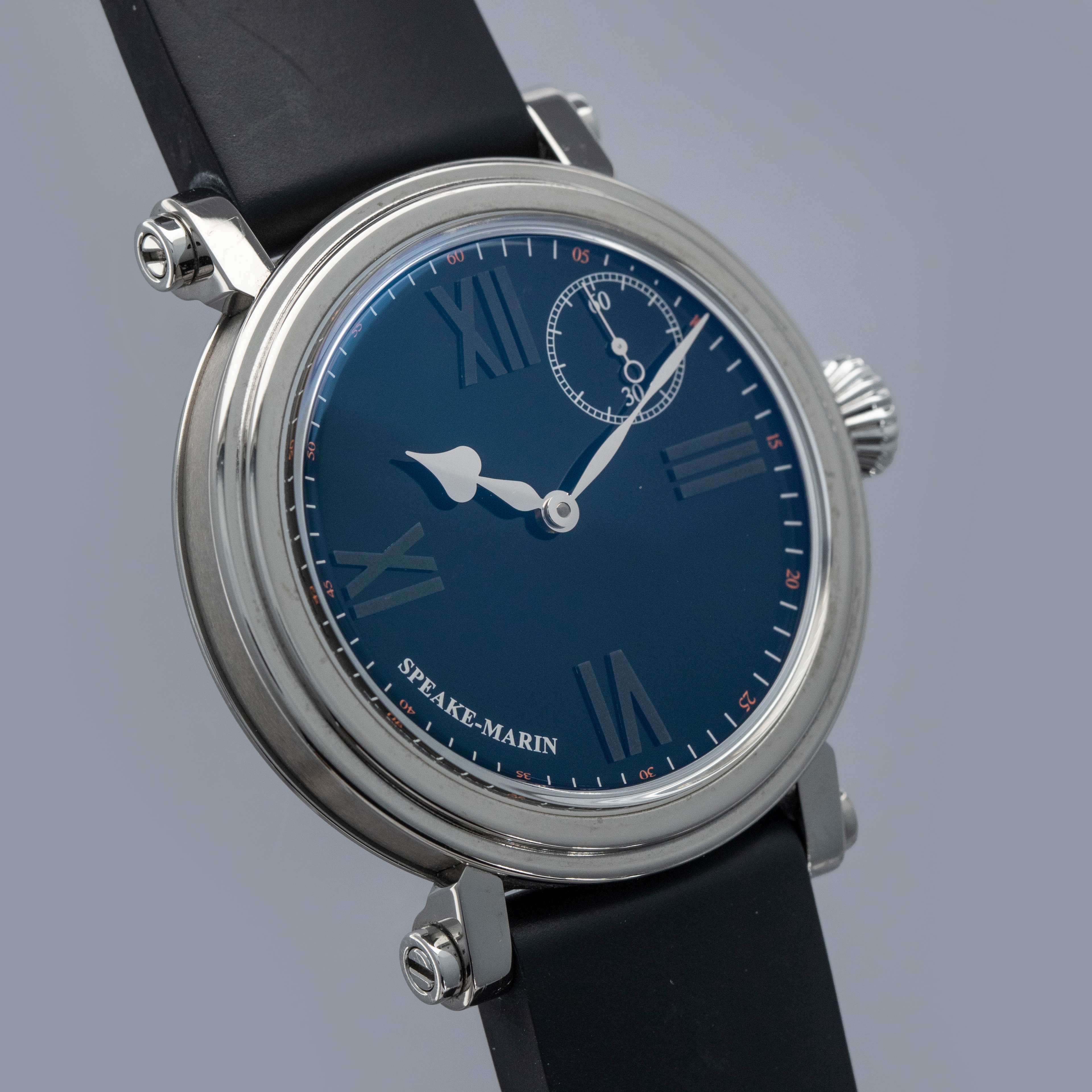 Founded in 2002 by English watchmaker Peter Speake-Marin, Speake-Marin is a luxury watch brand famed for its unique case shapes and wonderful craftsmanship. Renowned for their unique sense of innovation, the brand combines traditional watchmaking with modern aesthetics, appealing to connoisseurs and collectors worldwide. Offered here we have the Speake-Marin Academic Black Tie ref. 41421740, a minimalist take on Speake-Marin’s marine chronometer-inspired design. Boasting Speake-Marin’s famed ‘Piccadilly’ case in titanium, the 42mm Academic Black Tie boasts long scrolled lugs and stunningly classical black lacquer dial with blacked-out quarter hour Roman numerals that combine with the case design to provide a classical and understated aesthetic. Powered by the automatic cal. SMA03, and thus featuring a running seconds subdial at 1:30, the Academic Black Tie is a wonderfully unique piece on the wrist that is full of whimsy and intrigue.