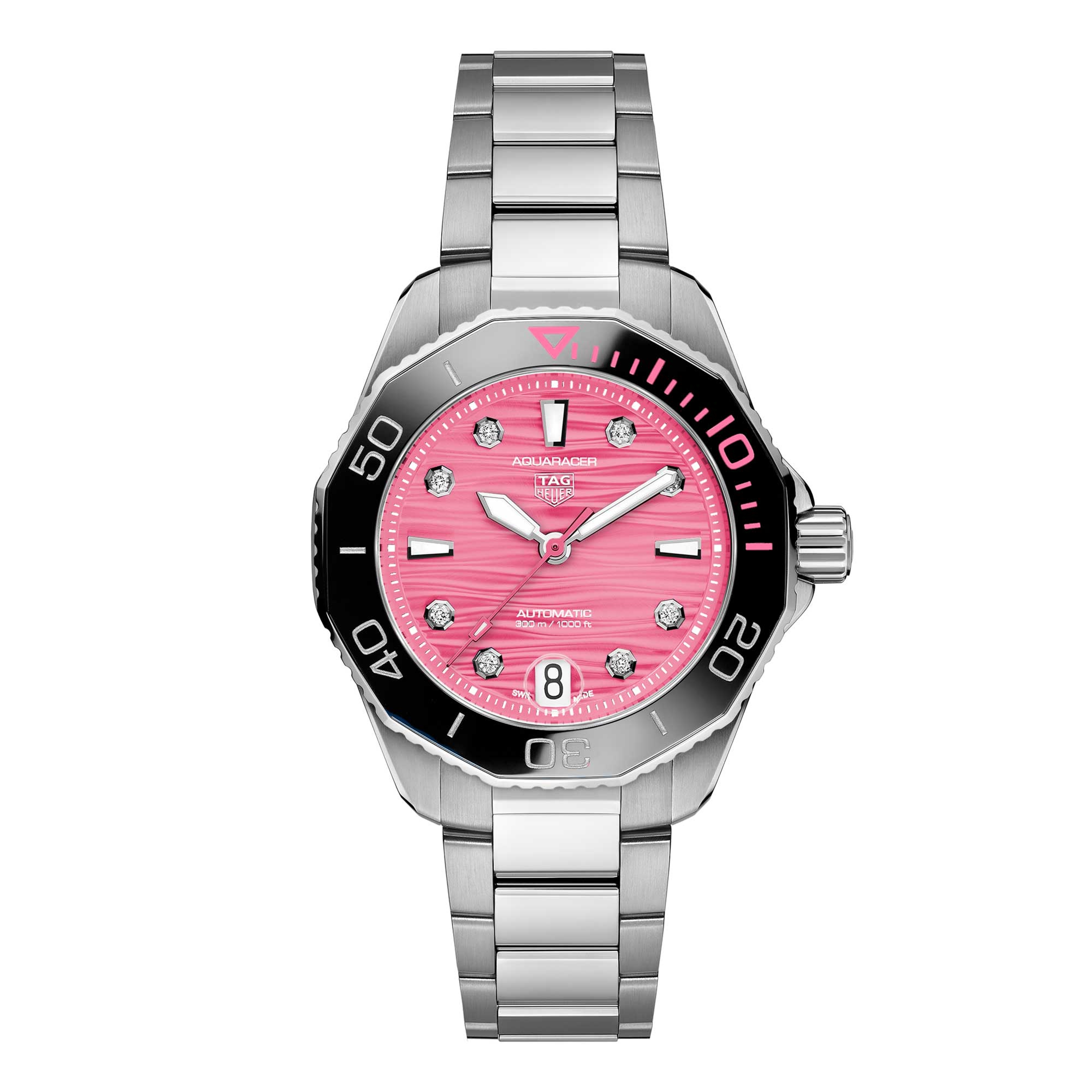 We are honored that TAG Heuer was able to contribute to the Pink Dial Project and create a special piece for which we chose one of our iconic Aquaracer 36mm models with a unique pink dial replete with diamond indexes and a ceramic bezel with pink minute markers from 0 to 15. This watch has a special feminine touch and we hope it will have a very symbolic meaning for its future owner – just as it has for TAG Heuer.