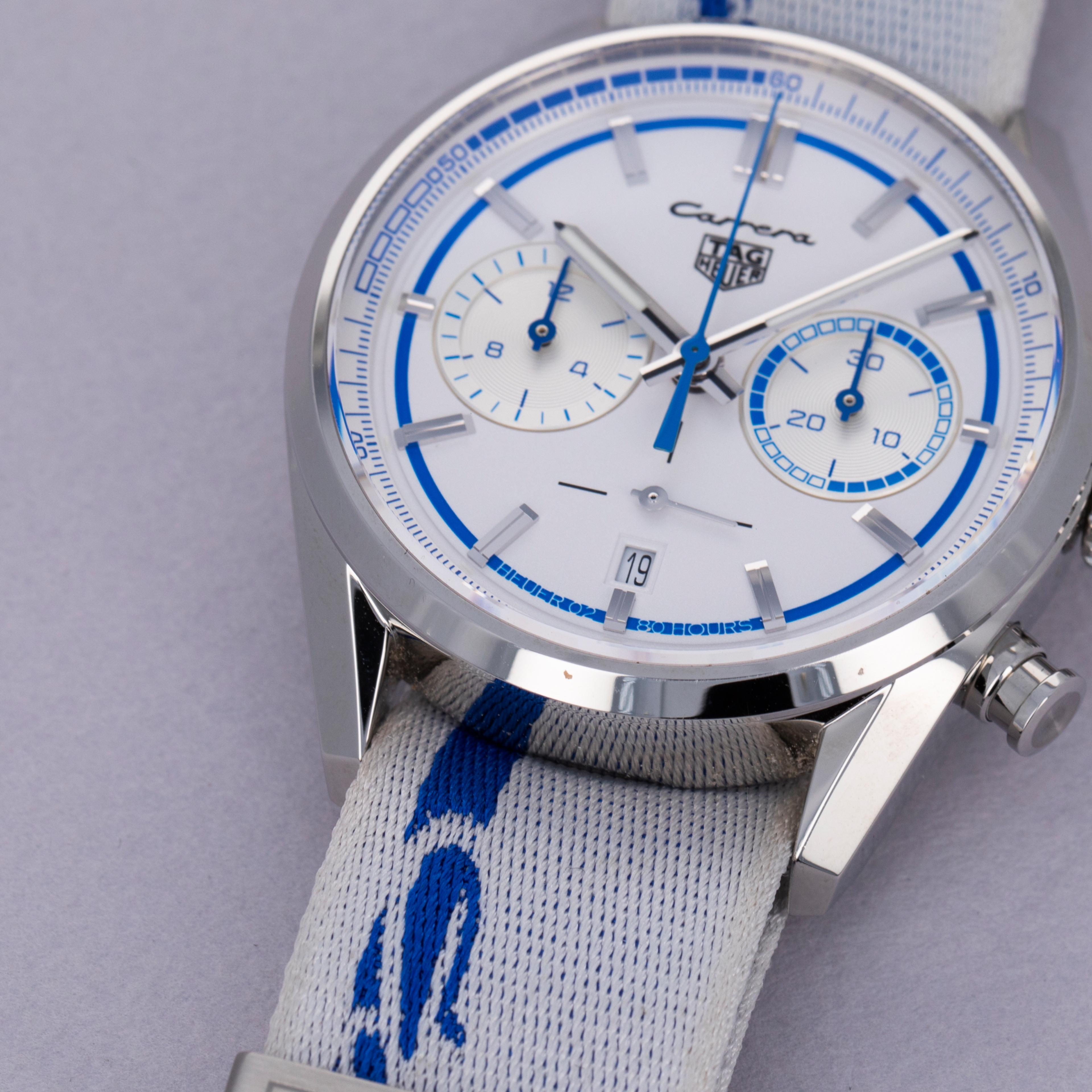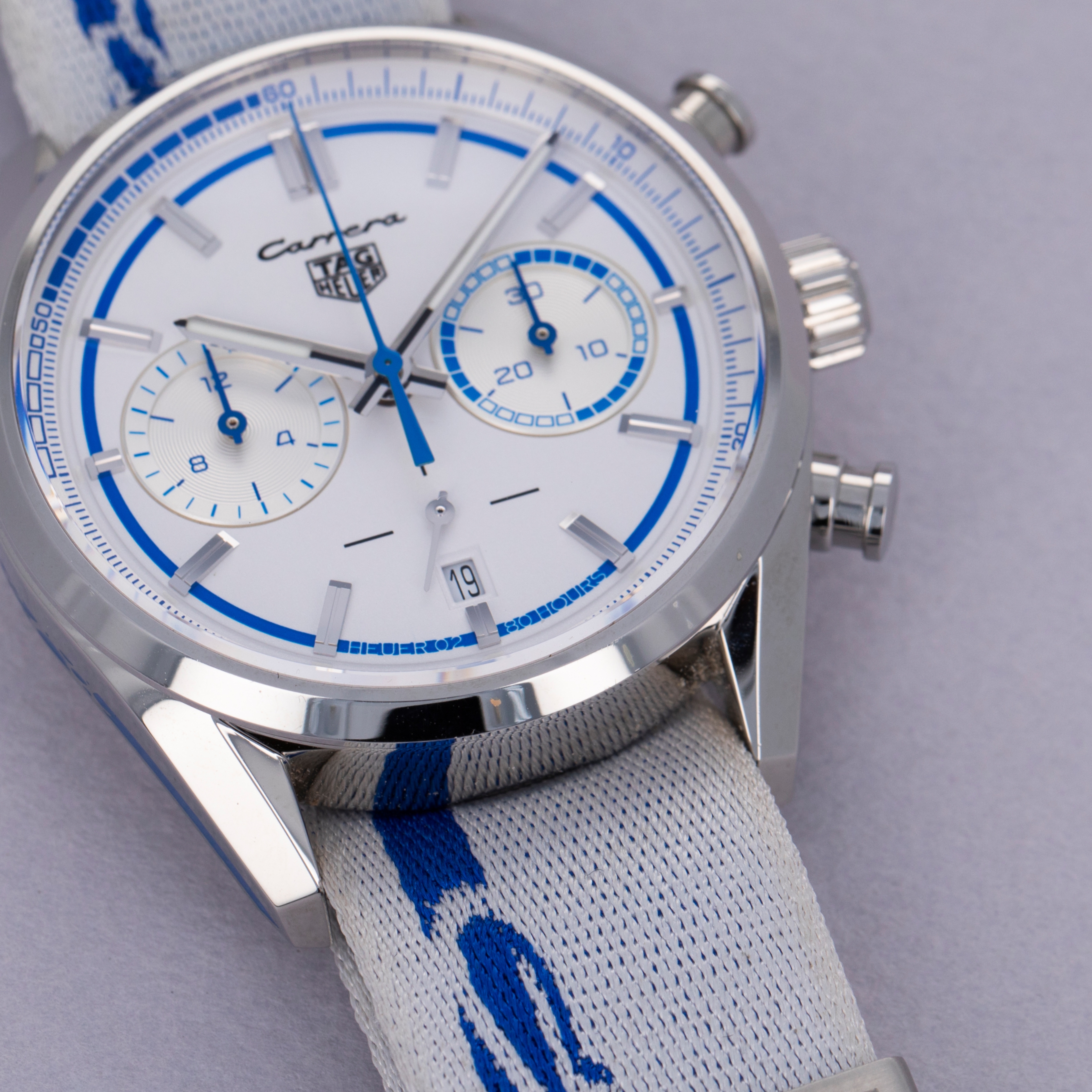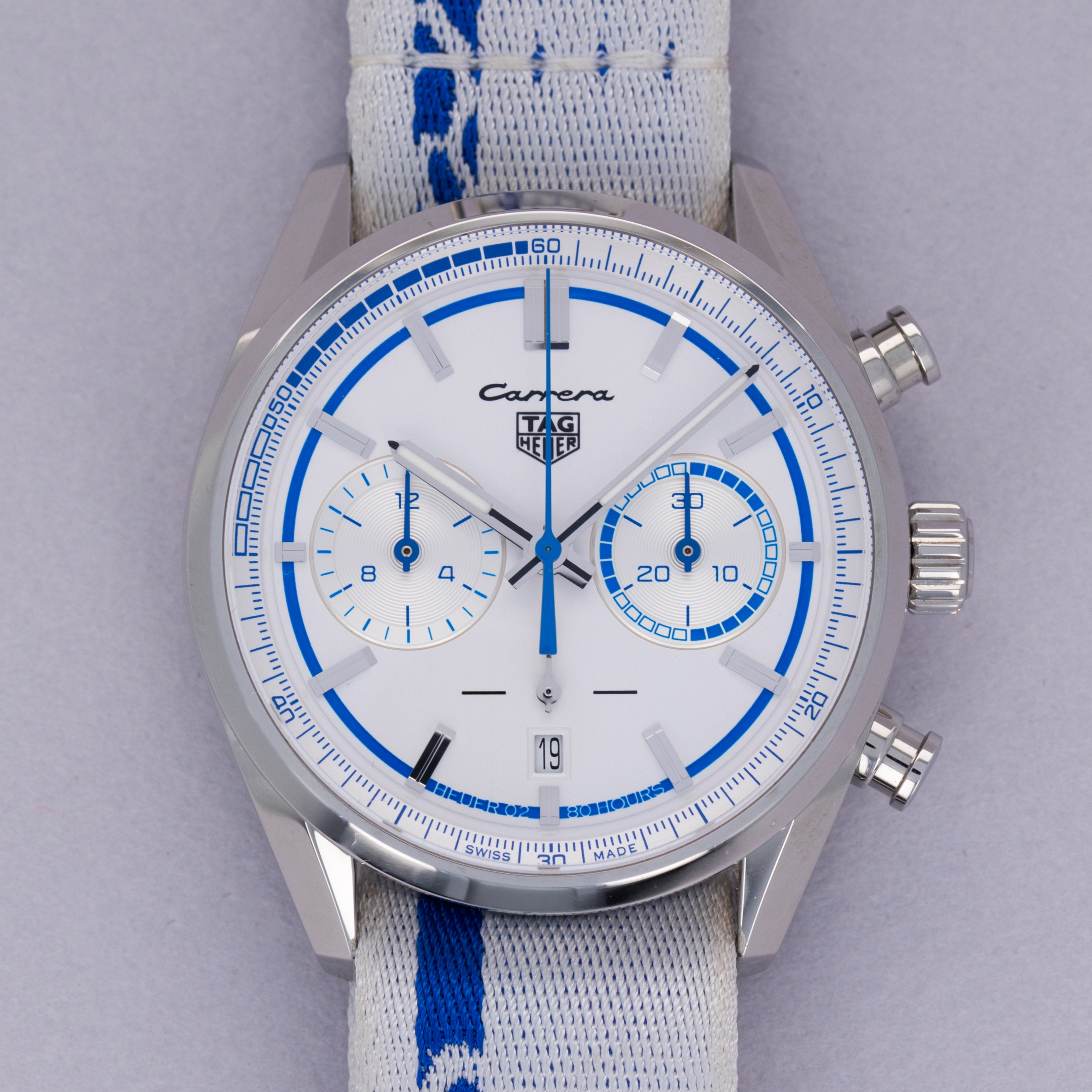 Launched in collaboration with iconic automaker Porsche to celebrate the 50th anniversary of the mythical Porsche 911 Carrera RS 2.7, the TAG Heuer x Porsche Carrera Chronograph RS 2.7 celebrates the two brands’ history working together since the 1980s. Debuting in 2022, the limited edition watch of just 500 pieces boasts a 42mm stainless steel case and is powered by the automatic Heuer 02 column wheel movement with 80-hour power reserve – all of which is on display behind a sapphire crystal caseback and a Porsche steering wheel-designed winding rotor. Sporting a bright silver dial with blue accents through its inscriptions and hands, the Carrera RS 2.7 even uses Porsche’s famous script for the Carrera inscription, instead of TAG Heuer’s typical font. With a blue lacquer-filled midcase and a bright white and blue strap to match its dial, the Carrera RS 2.7 is a stunning combination of TAG Heuer’s credentials as a watchmaker and Porsche’s credentials as the creator behind one of the car industry’s most beautiful cars.