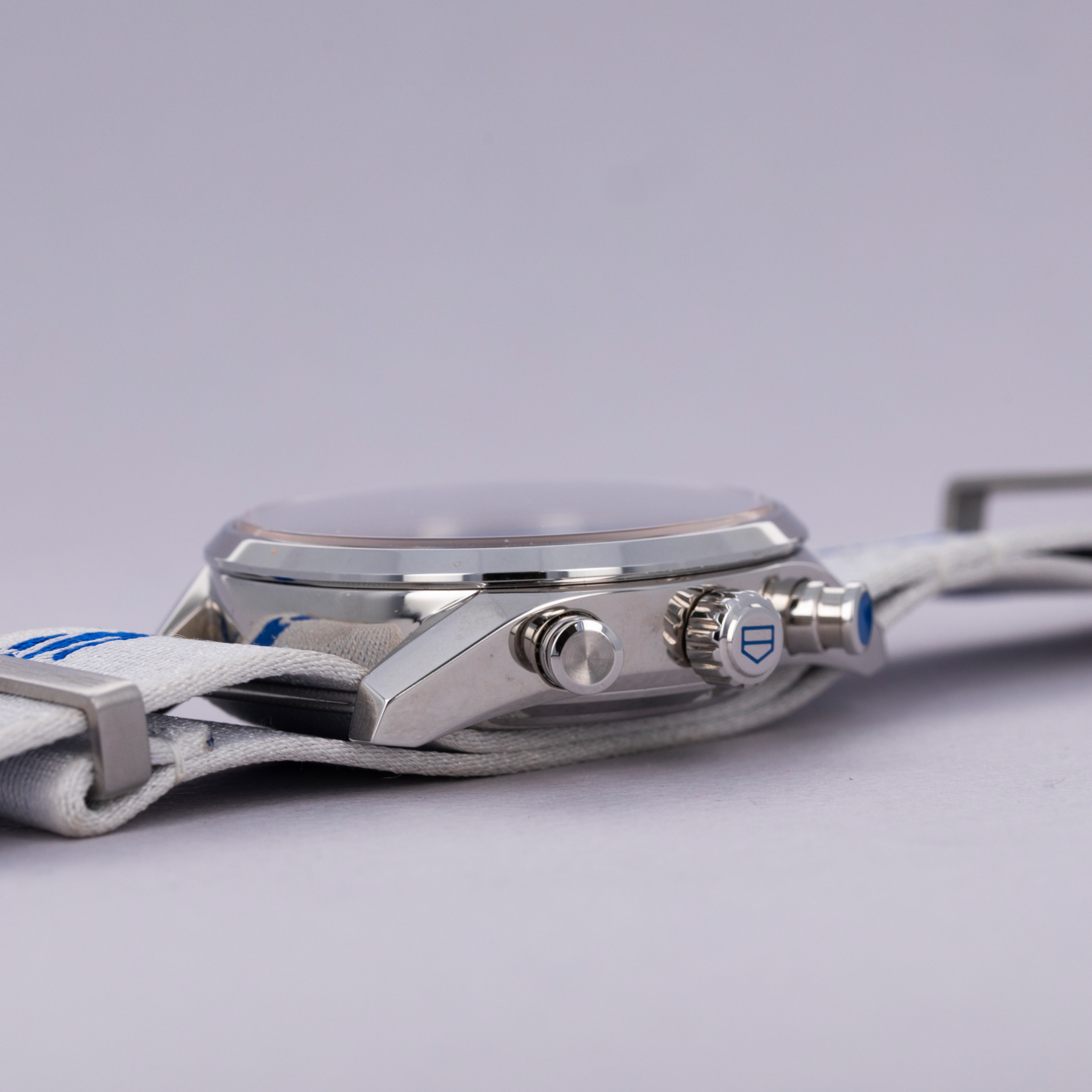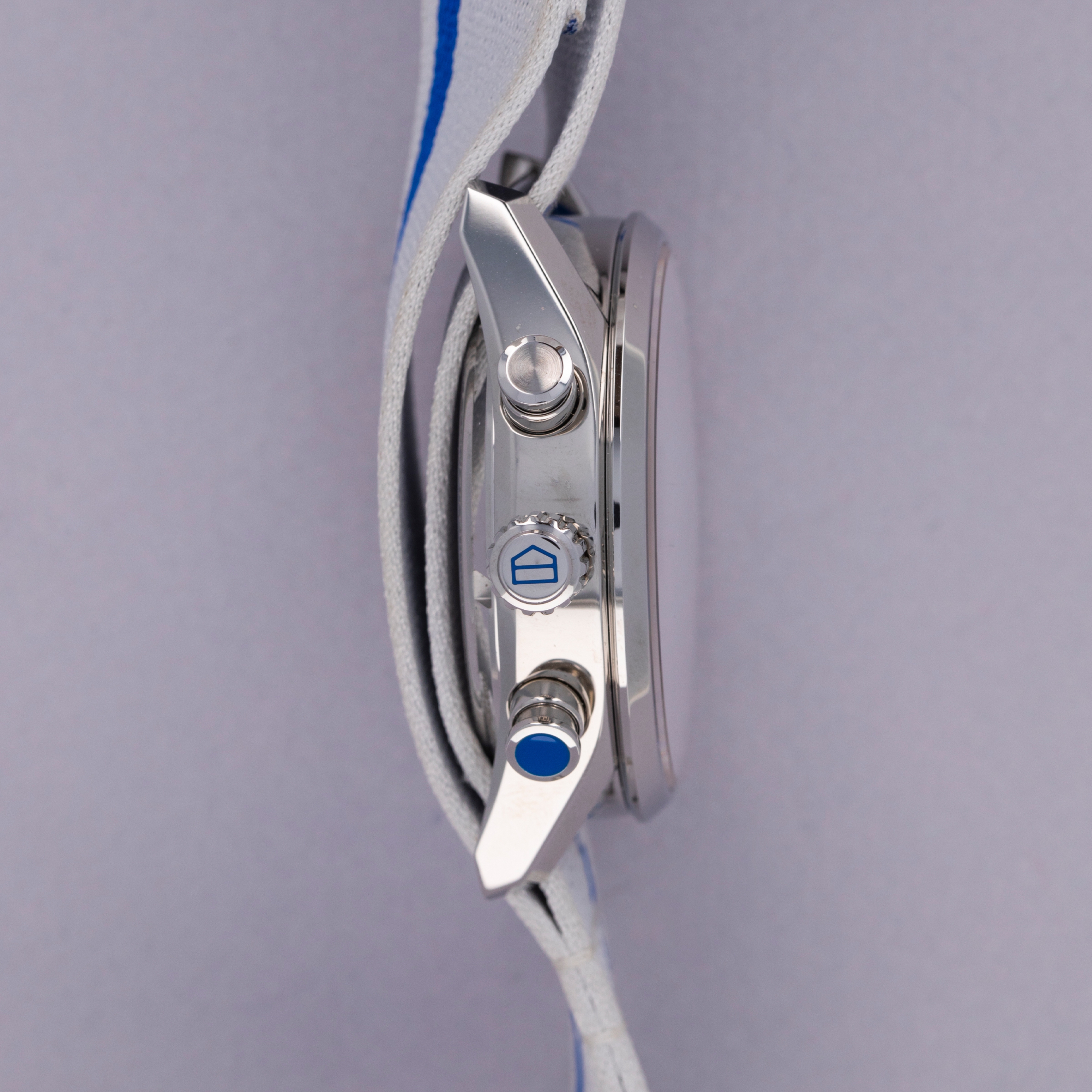Boasting a stainless steel case with a blue lacquer-filled midcase, thick bevels, pump pushers, and a sloped bezel, the Carrera RS 2.7's design is modern in its execution and thoughtful in its flourishes.