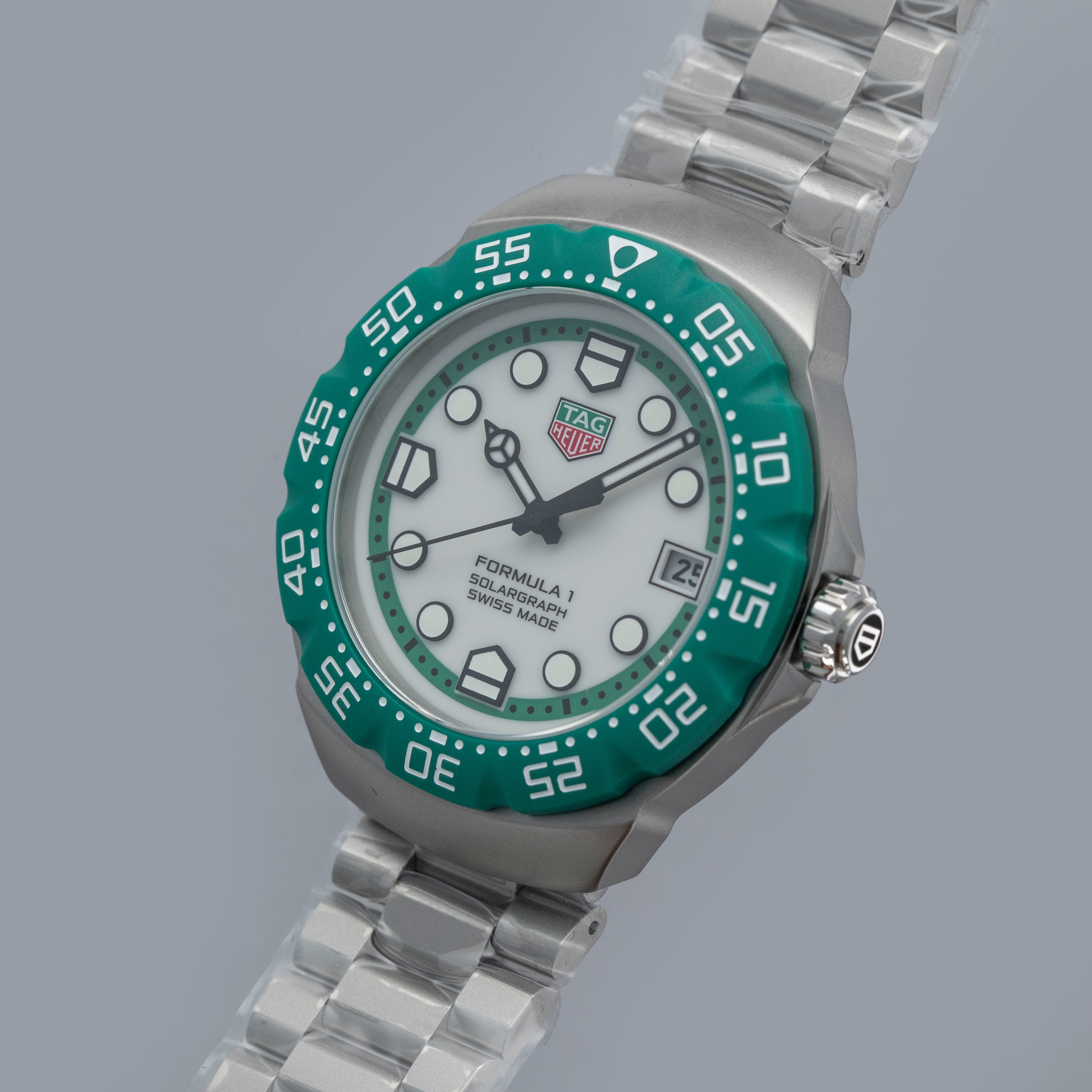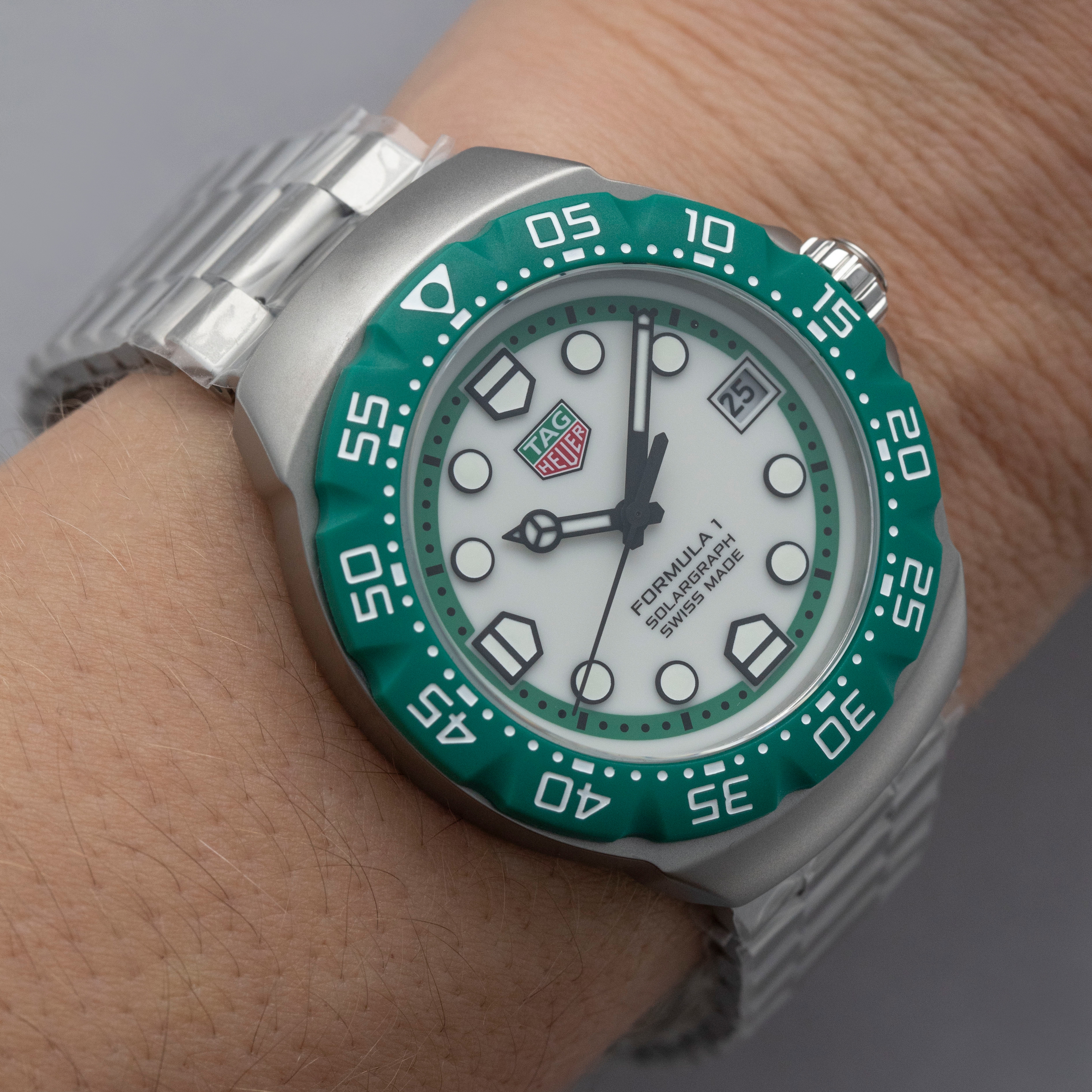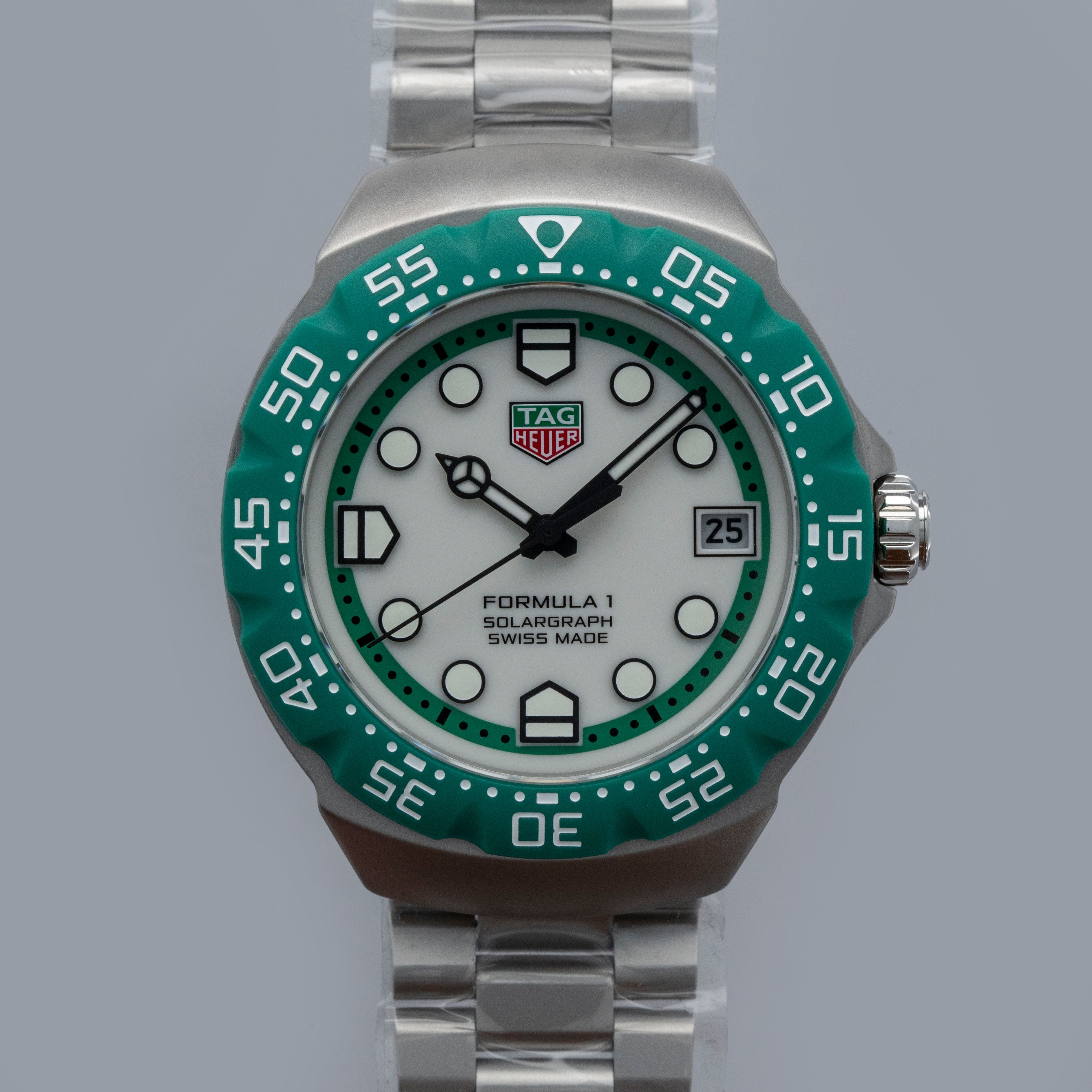 Emerging in 1986 as TAG Heuer’s bold, entry-level expression of performance, colour and youthful energy during a pivotal moment in its post-Heuer relaunch, the Formula 1 collection is built around quartz reliability and vivid racing-inspired palettes. Originally offered on colorful rubber straps and paired with equally colorful bezels, it quickly became an accessible gateway into TAG Heuer’s world of motorsport. Over the decades, the design matured into more substantial silhouettes with steel cases while retaining its core identity. However, TAG Heuer decided to bring the collection back to its roots in 2024 by relaunching it as a collaboration with KITH, and so this year TAG Heuer have taken it one step further by relaunching the collection as a full family of colorful solar-powered quartz references. While a handful remain in normal production, another selection of references were only offered during the coinciding races from the F1 season, as a way to celebrate TAG Heuer becoming F1’s official timekeeper. Offered here as the Silverstone GP limited edition variant, we have the ref. WBY1113.BA0042, which features a 38mm sandblasted stainless steel case, a matching sandblasted stainless steel bracelet and a bright british racing green bezel made from a proprietary material called TH-Polylight. Matching both the bezel with green accents and the case through its opaline silver center, the ref. WBY1113.BA0042 reflects the Formula 1’s iconic design language, with its angular case and high-legibility display give it a utilitarian, timing-first personality that still carries the spirit of the 1980s originals but translated into a contemporary, everyday tool watch.