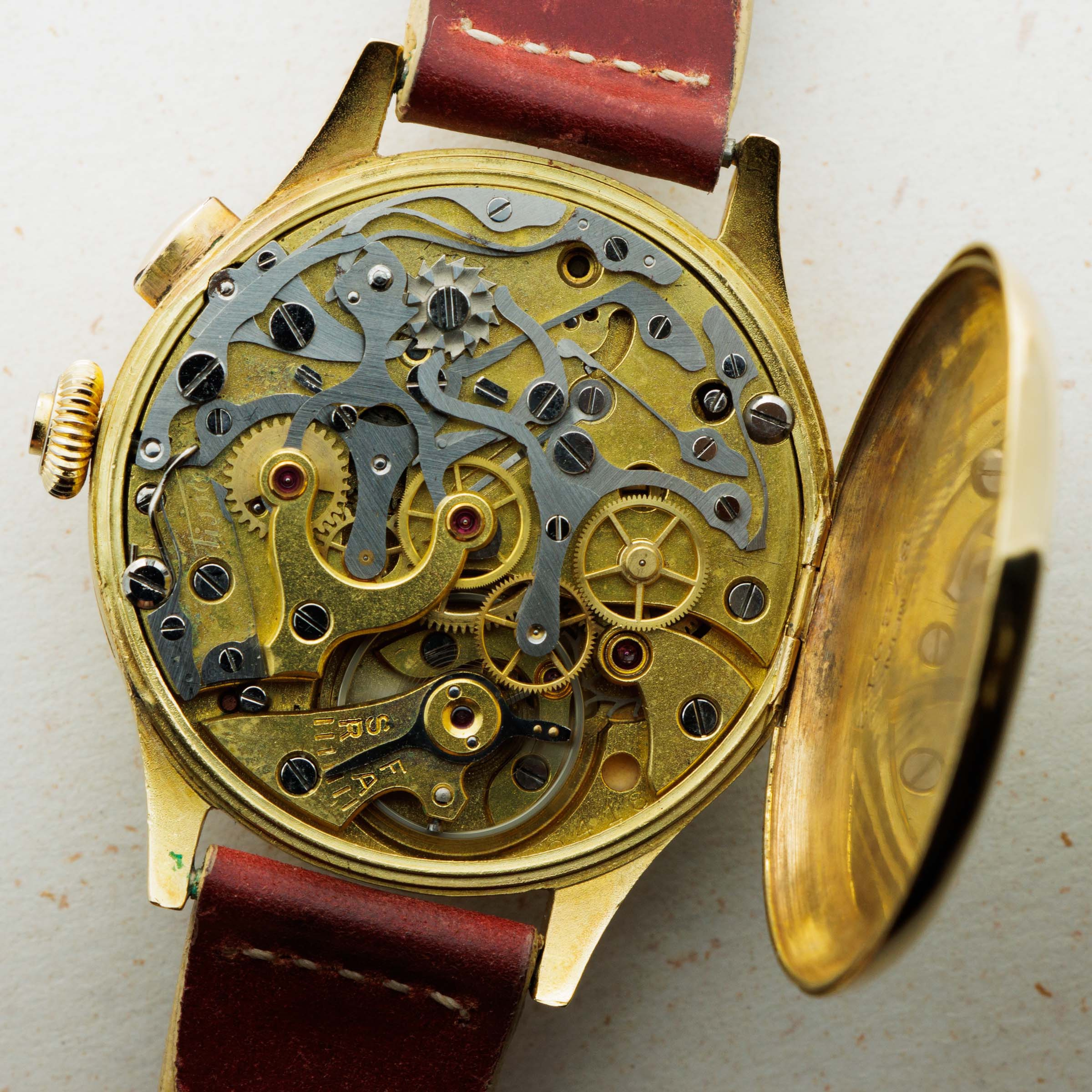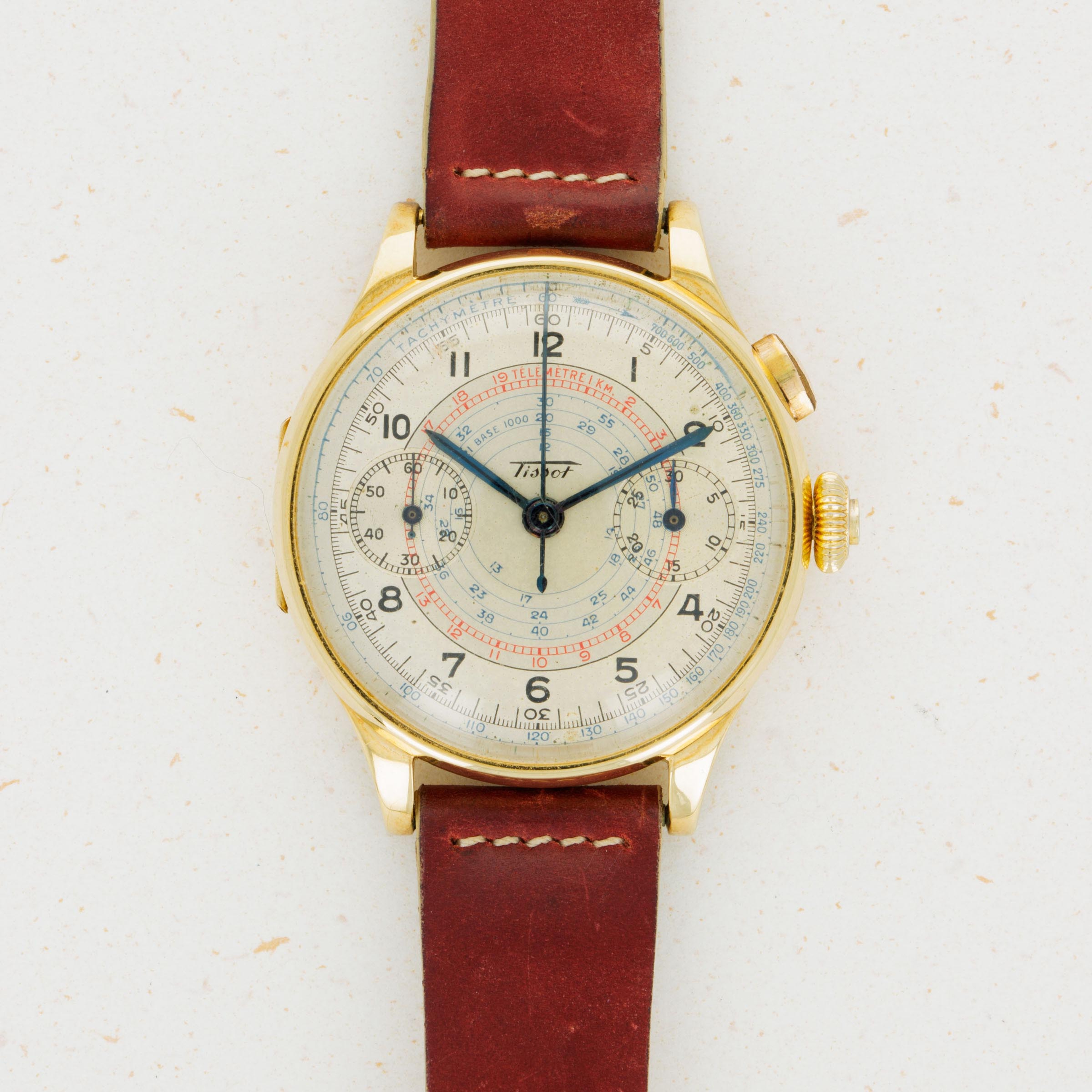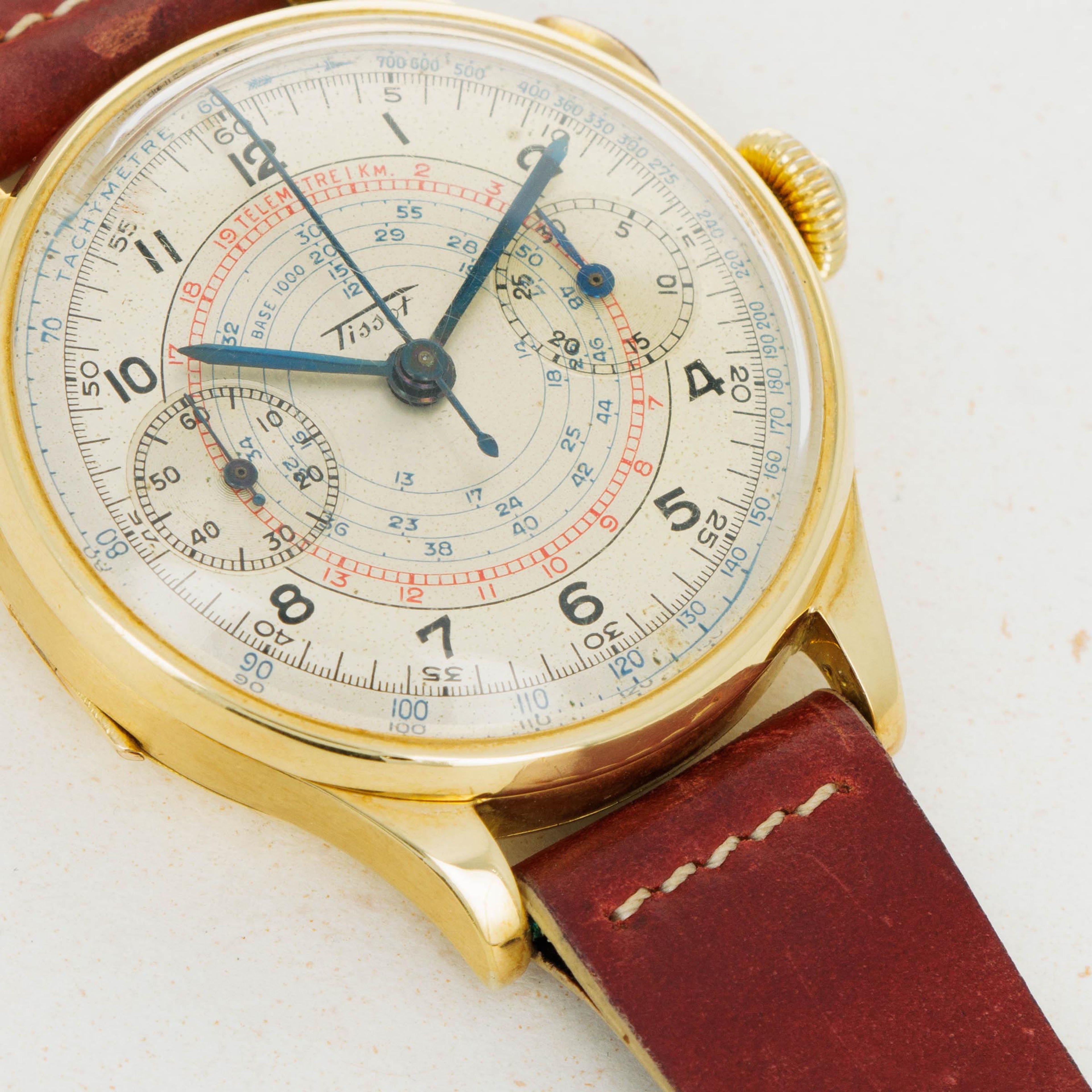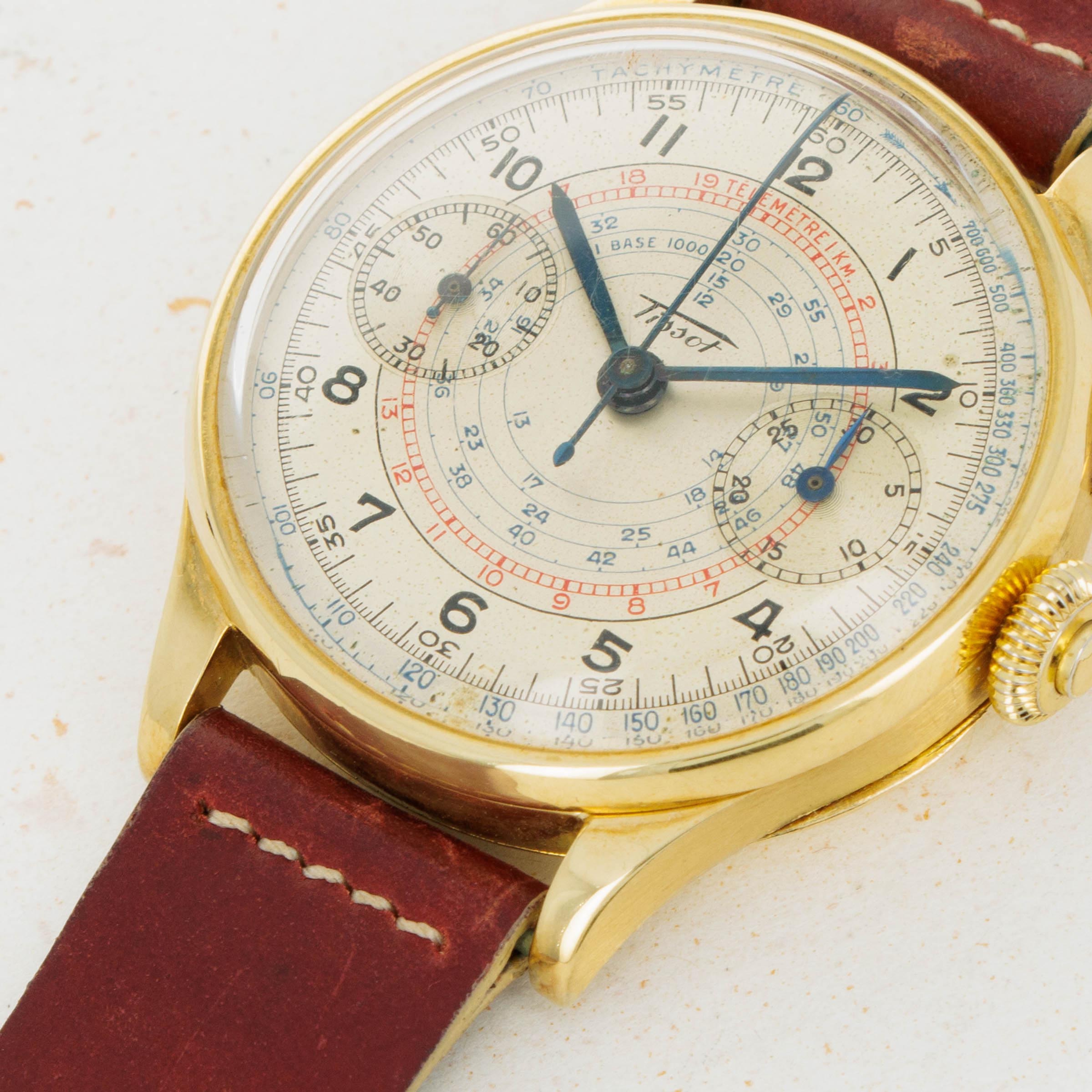 Founded in the mid-1800s, Tissot started its life as a watchmaker determined to create finely crafted yet accessible pocket watches and other timing instruments. In 1930, they collaborated with Omega to create Société Suisse pour l’Industrie Horlogère (SSIH), which became a crucial element within the creation of the Swatch Group. This collaboration also proved to be very important for Tissot as it allowed Tissot to use Omega’s highly-renowned chronograph movements, which enabled Tissot to become a timekeeper for several events and races. One such event was a 1938 ski race in the village of Villar, near Tissot’s hometown in the Jura mountains. As the timekeeper, Tissot used a multiscale monopusher chronograph much like the example we have here to time the races and events. With a 37mm 18kt yellow gold case, this timepiece would have been the ultimate in luxury timekeeping at the time. Fitted with a stunningly aged silver dial, this example boasts a blue and red telemeter scale in its center and a blue tachymetre scale along its dial periphery, proving its usefulness as a timing instrument. Presented in wonderful condition considering its age and featuring a hinged caseback alongside its single chronograph pusher at 2 o’clock, this timepiece is a wonderfully unique piece of vintage watchmaking that has been preserved over the decades, as it so deserves.