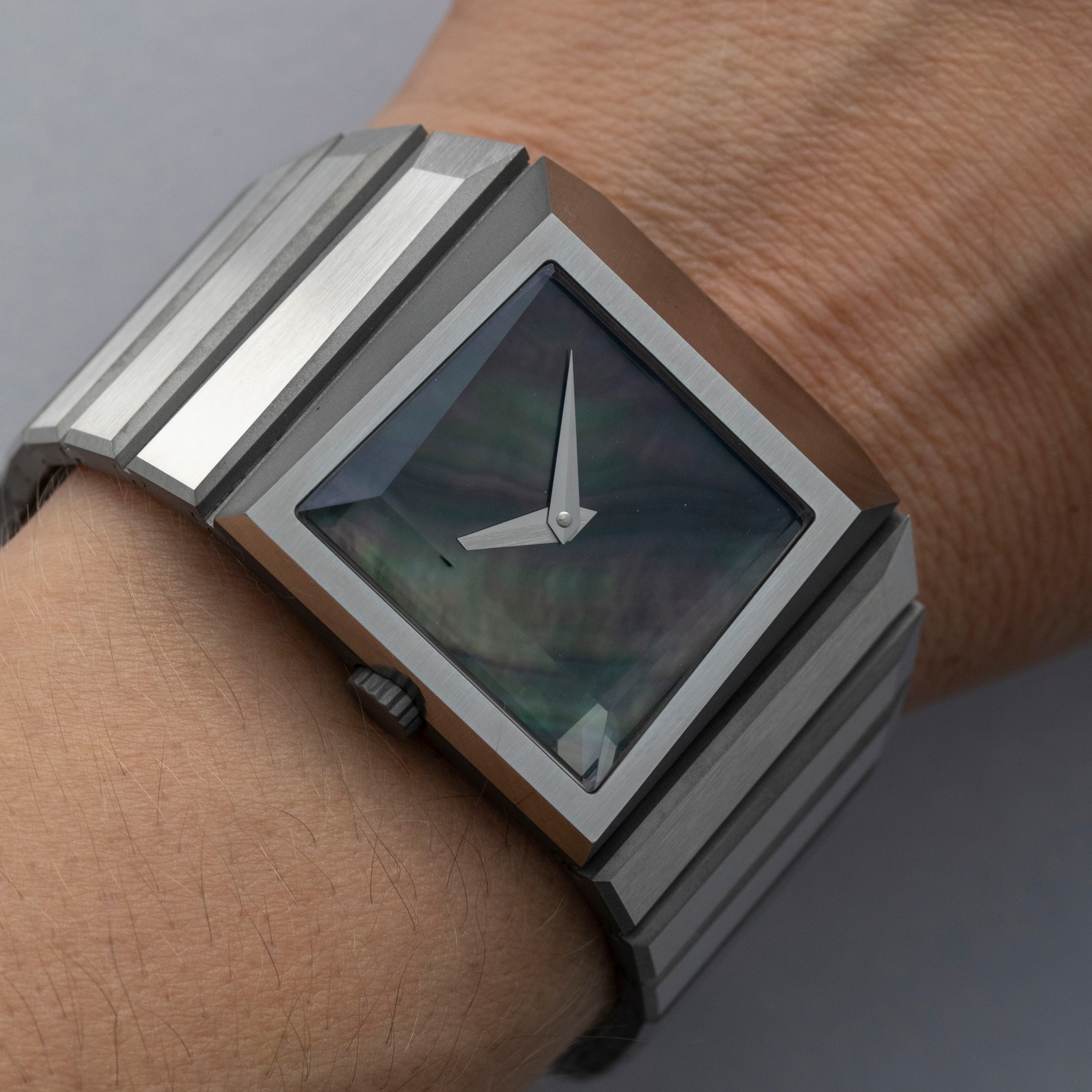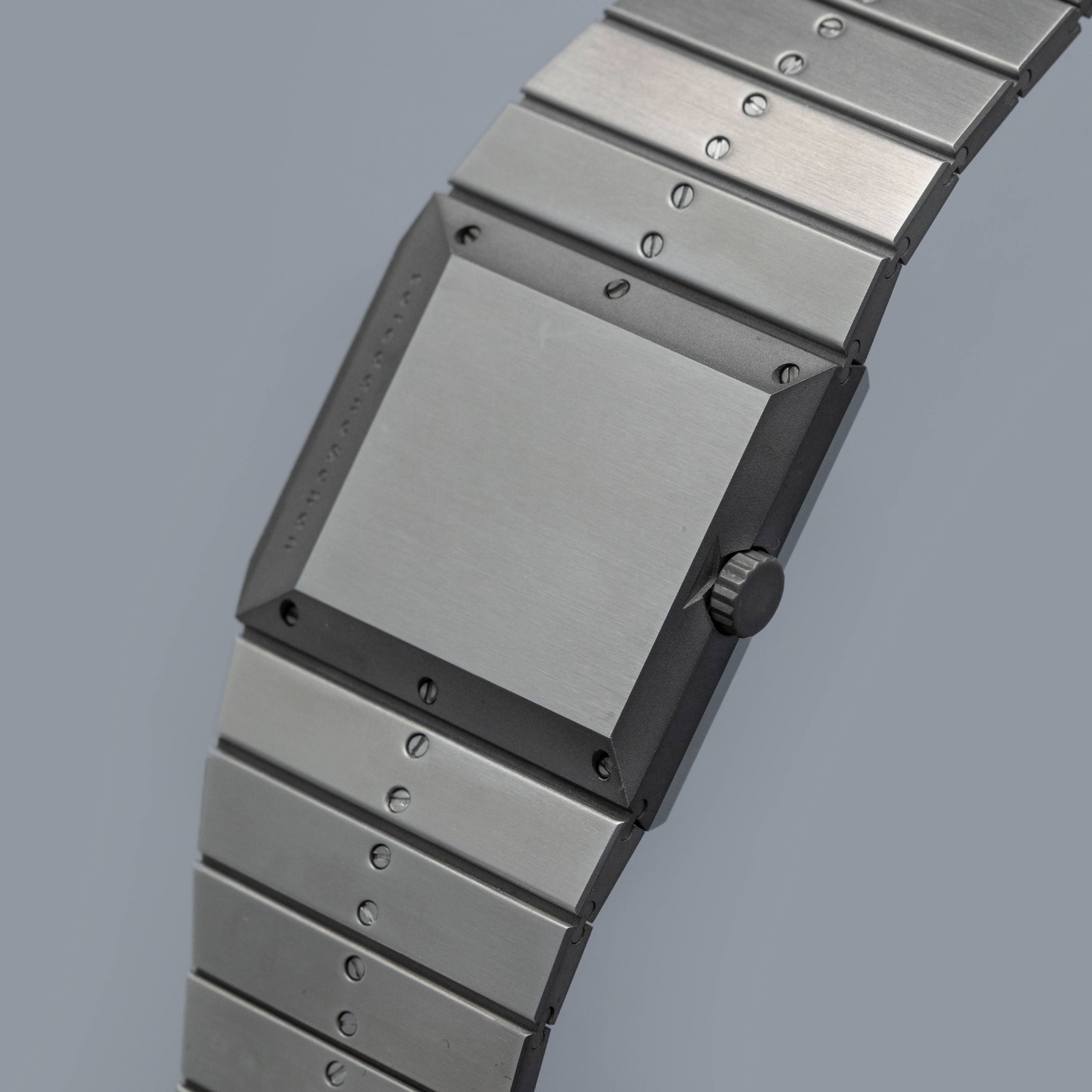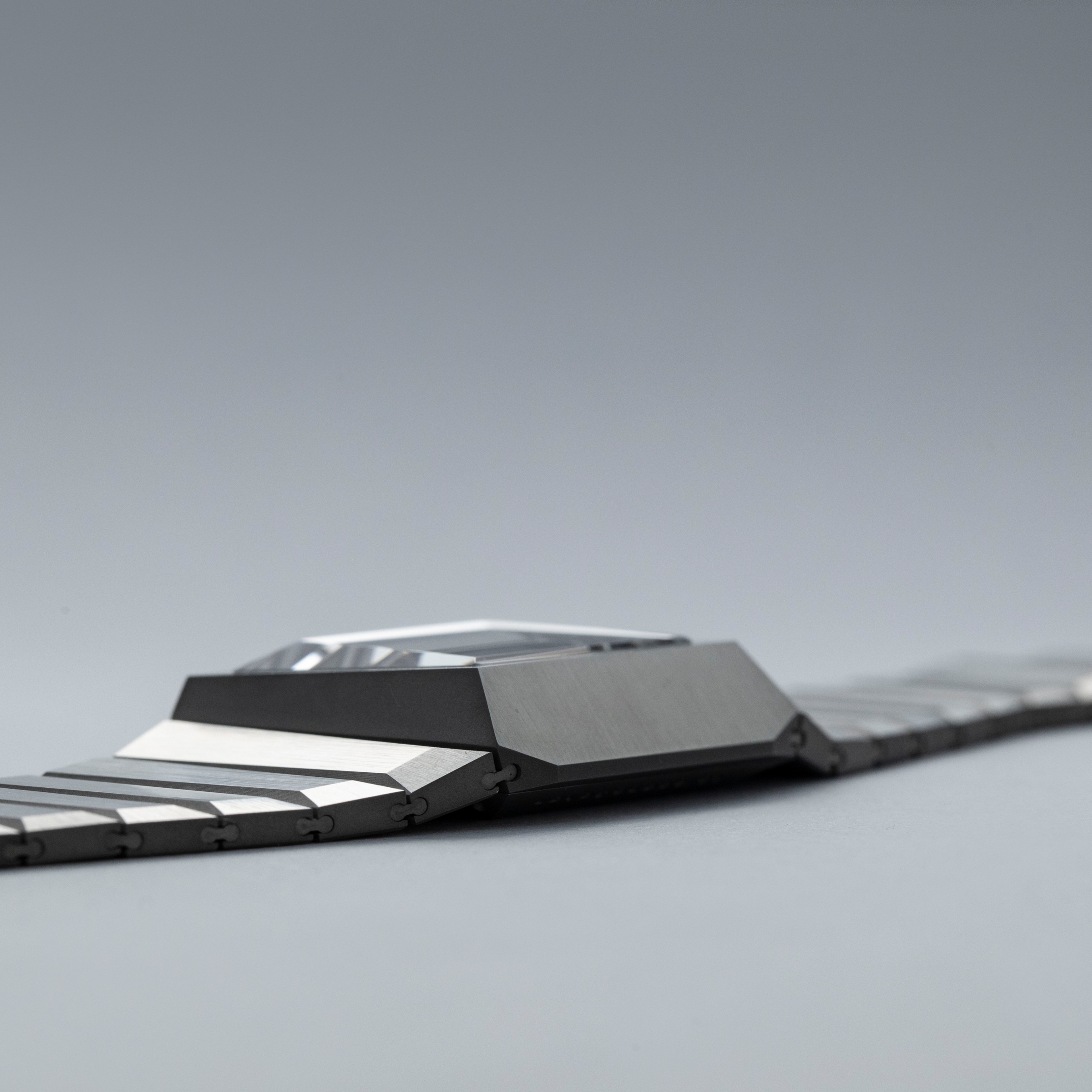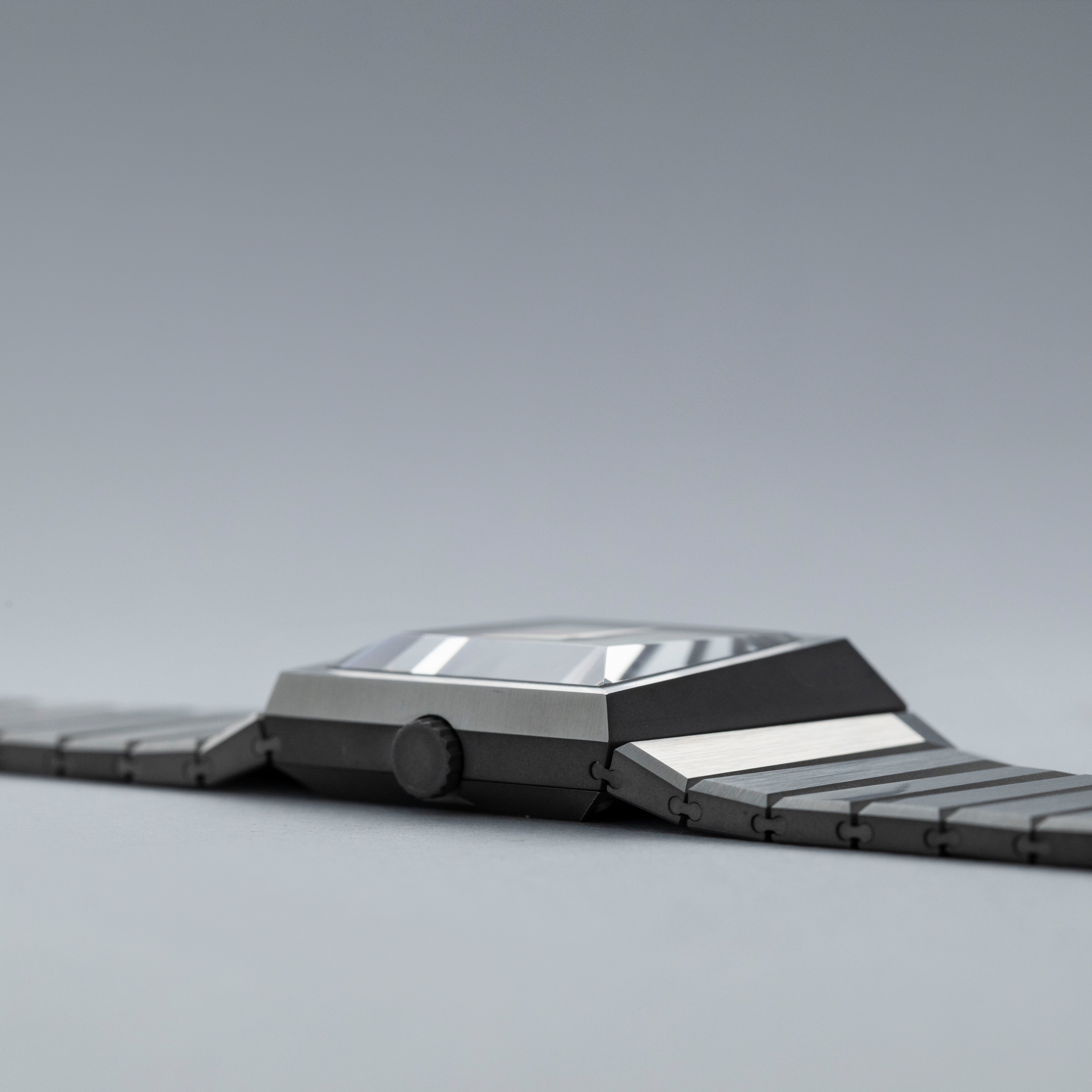 Inspired by 1970s brutalist architecture, the B/1.2's asymmetric destro case is intriguingly three-dimensional thanks to how its case, bracelet, and display are all angled towards the wearer.