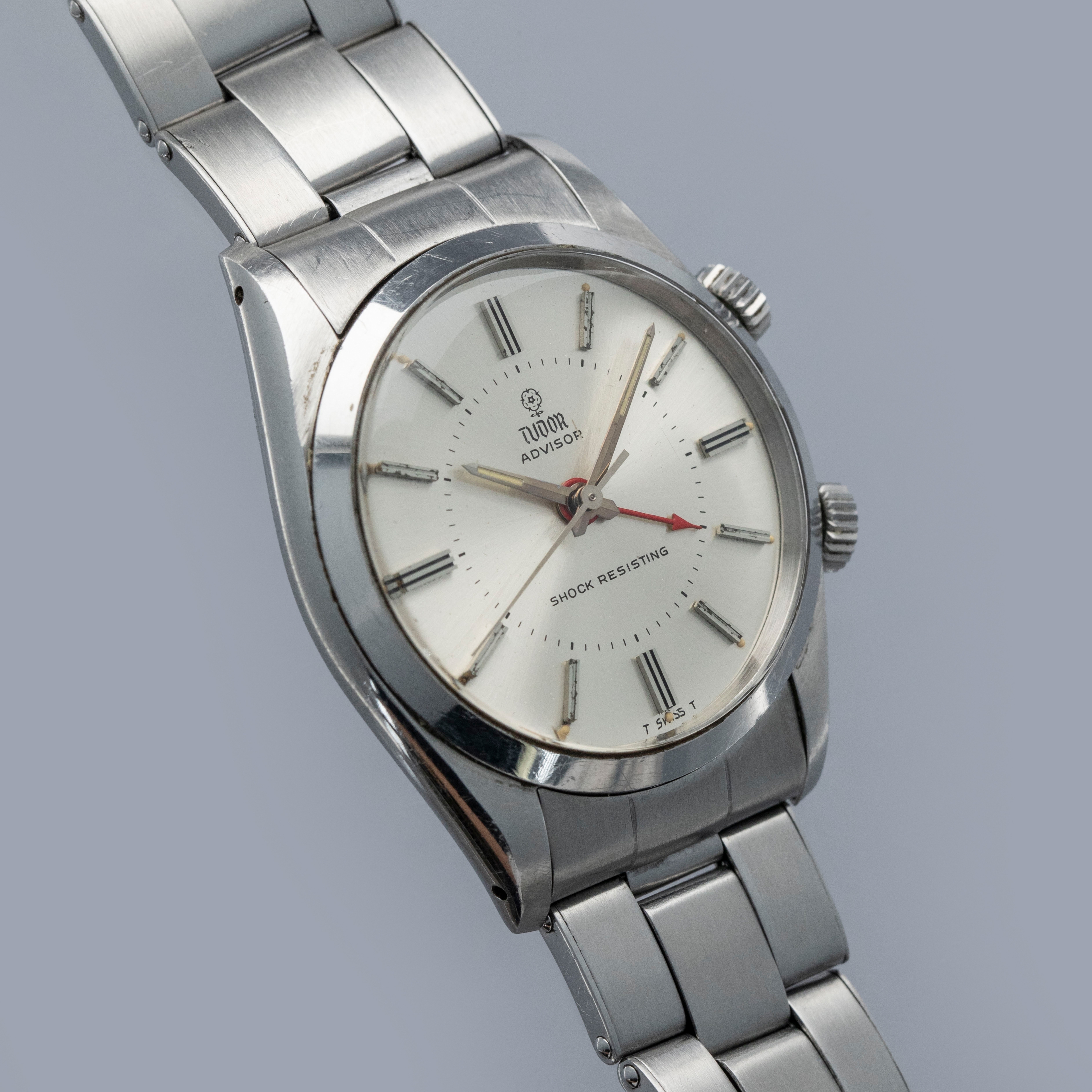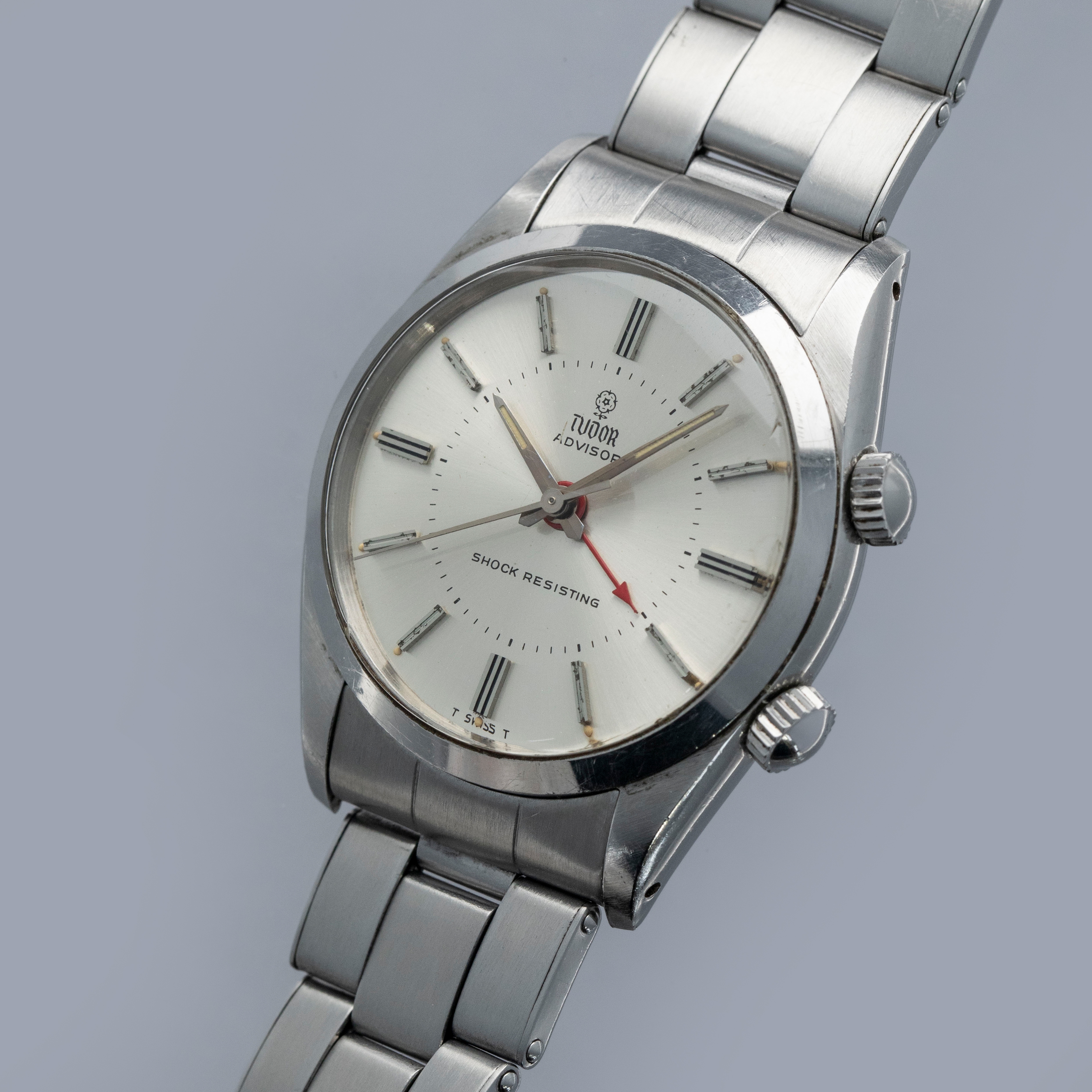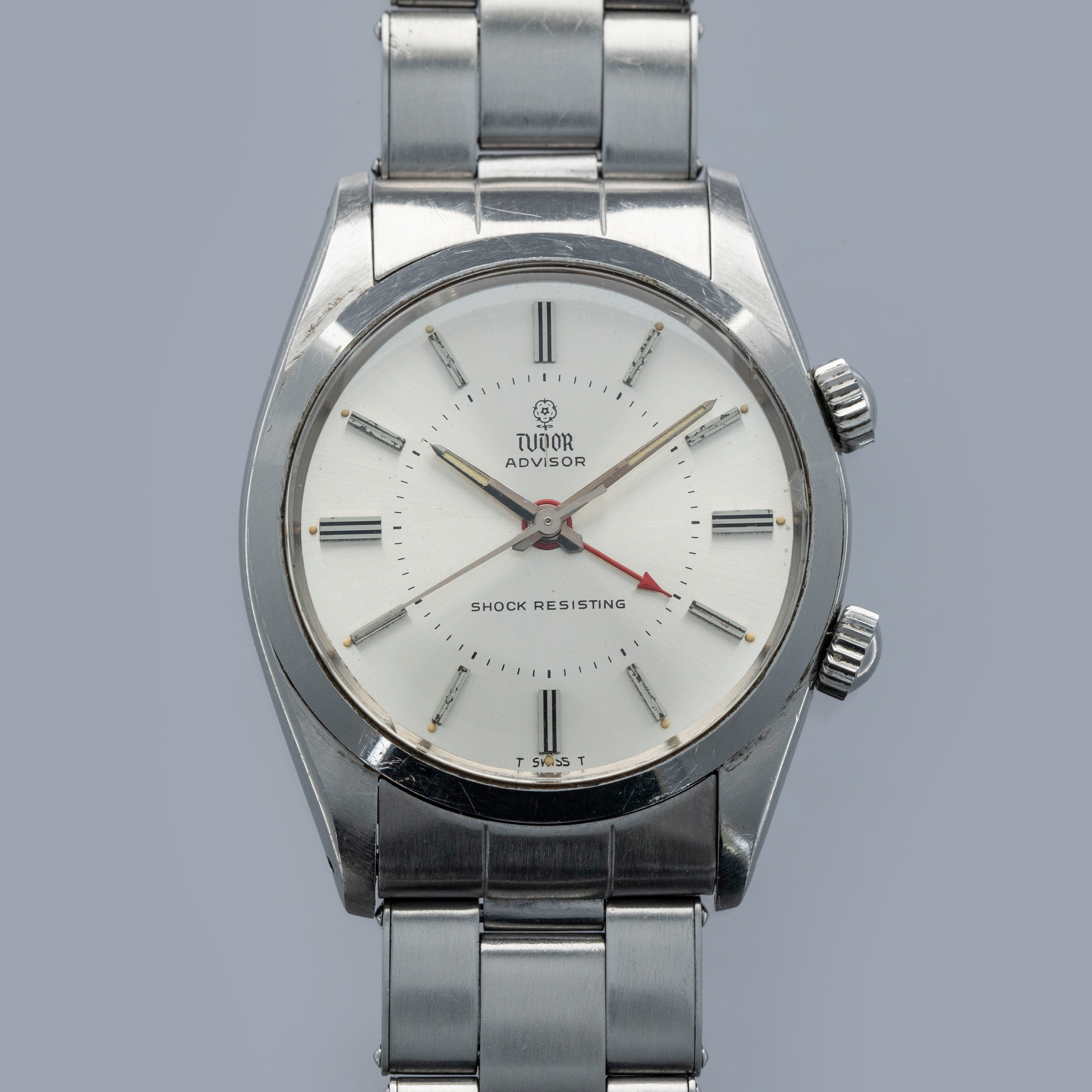 A sophisticated timepiece that epitomizes Tudor's commitment to both elegance and functionality, the Tudor Advisor ref. 7926 was introduced in 1957 as an alarm wristwatch that would remind its wearer of whatever upcoming appointment, meeting or other such event they had that day. Boasting a sleek stainless steel case on an Oyster bracelet and with a polished steel bezel, the Advisor’s most notable construction detail is the use of dual crowns, as its alarm function is not set or wound through the same crown that winds and sets its time-keeping functions. Fitted with a simple sunburst silver dial adorned with applied hour markers, the Advisor’s display highlights its alarm function’s distinctive red hand that adds a touch of flair to its design. Produced until 1968, the Advisor showcases Tudor’s mission to produce no-frills timepieces for the everyday man who needed a reliable watch to perform its function while managing the rough and tumble of everyday life.