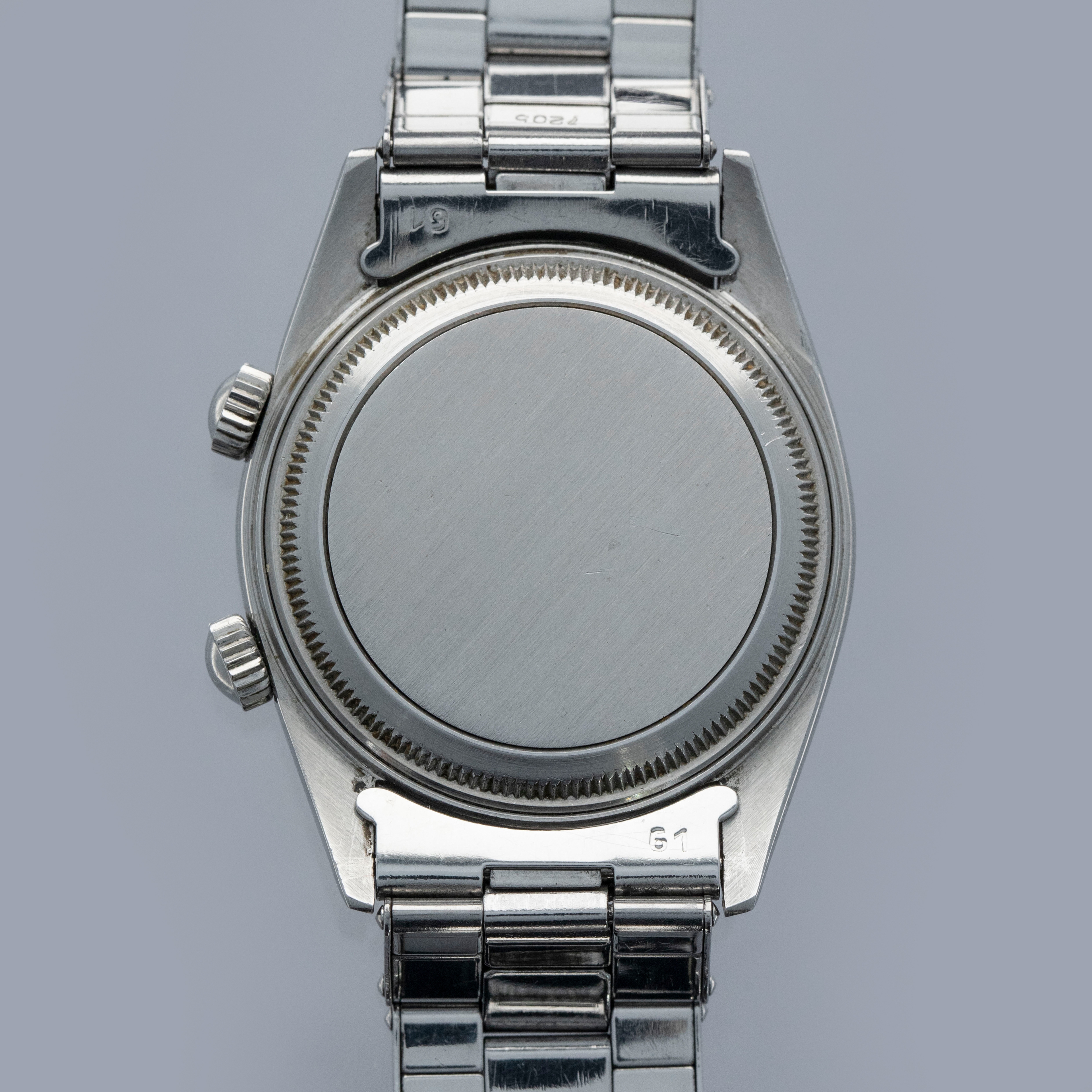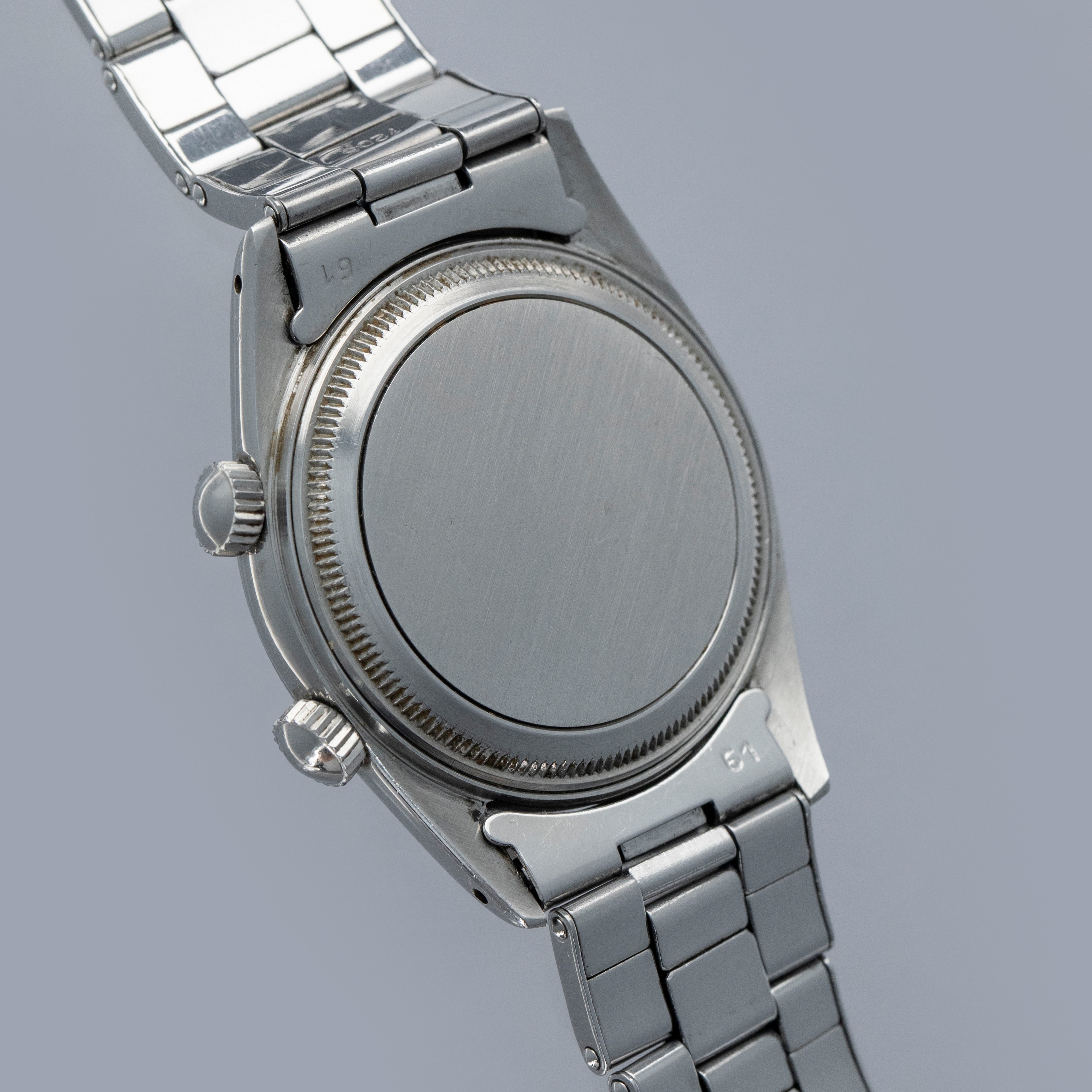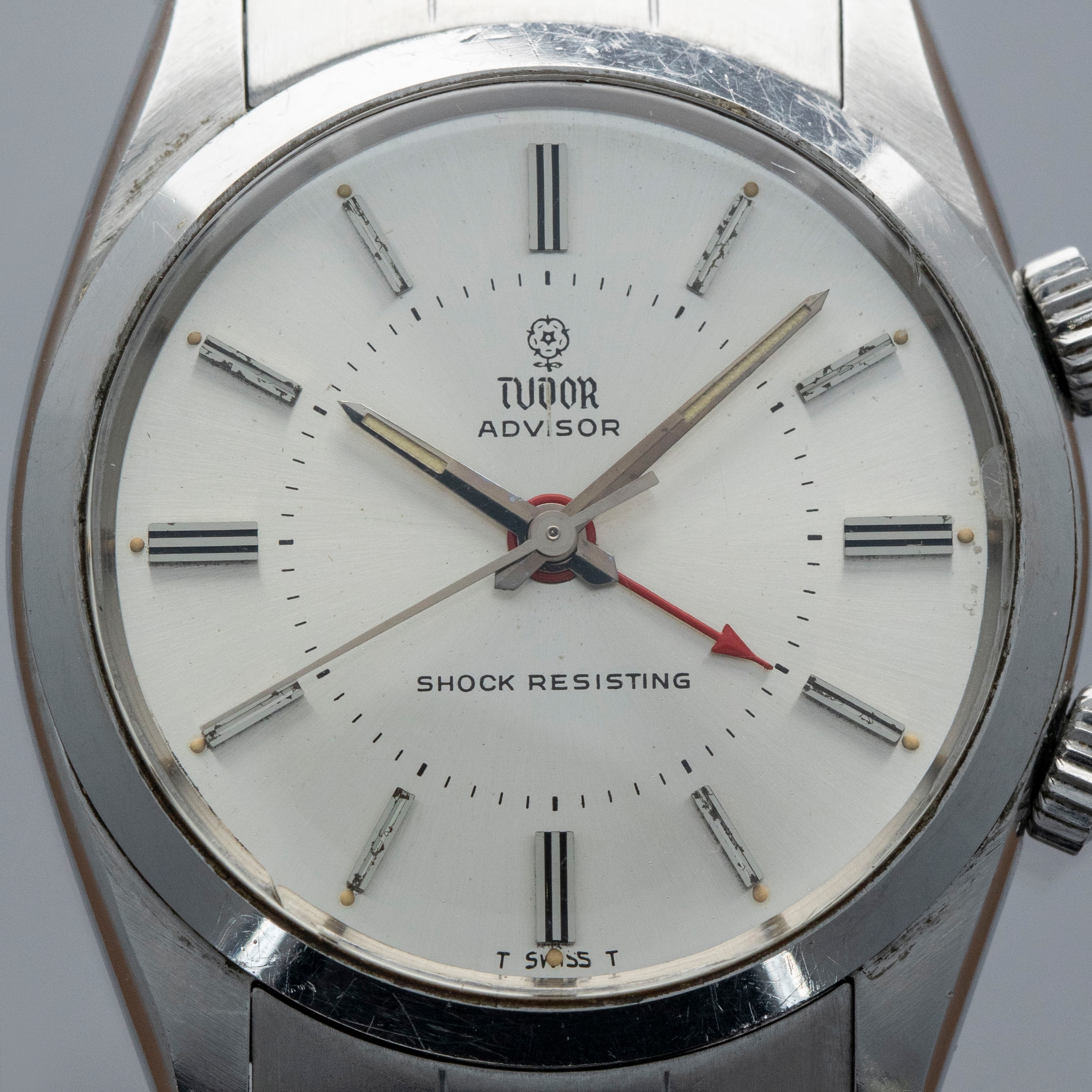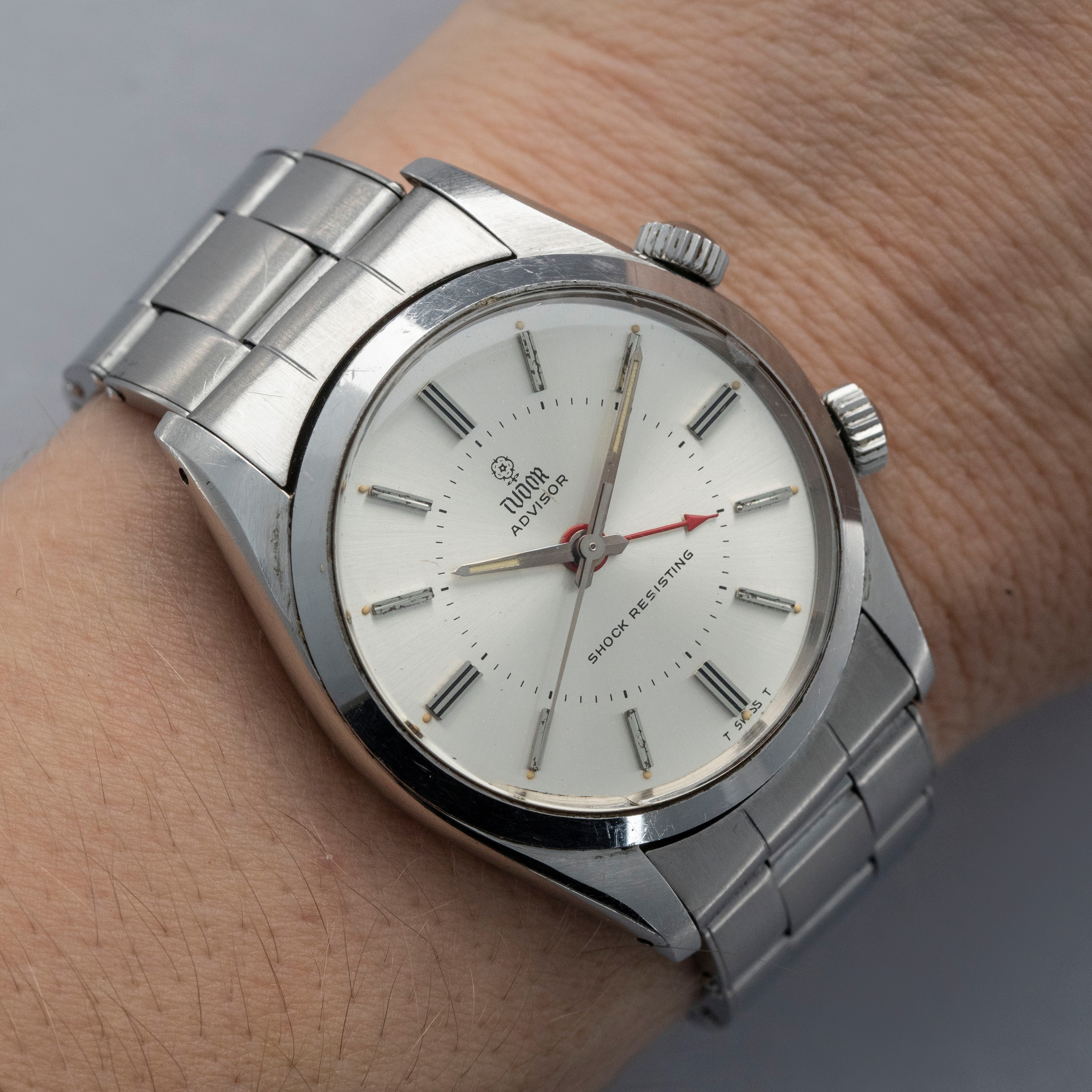 A sophisticated timepiece that epitomizes Tudor's commitment to both elegance and functionality, the Tudor Advisor ref. 7926 was introduced in 1957 as an alarm wristwatch that would remind its wearer of whatever upcoming appointment, meeting or other such event they had that day. Boasting a sleek stainless steel case on an Oyster bracelet and with a polished steel bezel, the Advisor’s most notable construction detail is the use of dual crowns, as its alarm function is not set or wound through the same crown that winds and sets its time-keeping functions. Fitted with a simple sunburst silver dial adorned with applied hour markers, the Advisor’s display highlights its alarm function’s distinctive red hand that adds a touch of flair to its design. Produced until 1968, the Advisor showcases Tudor’s mission to produce no-frills timepieces for the everyday man who needed a reliable watch to perform its function while managing the rough and tumble of everyday life.