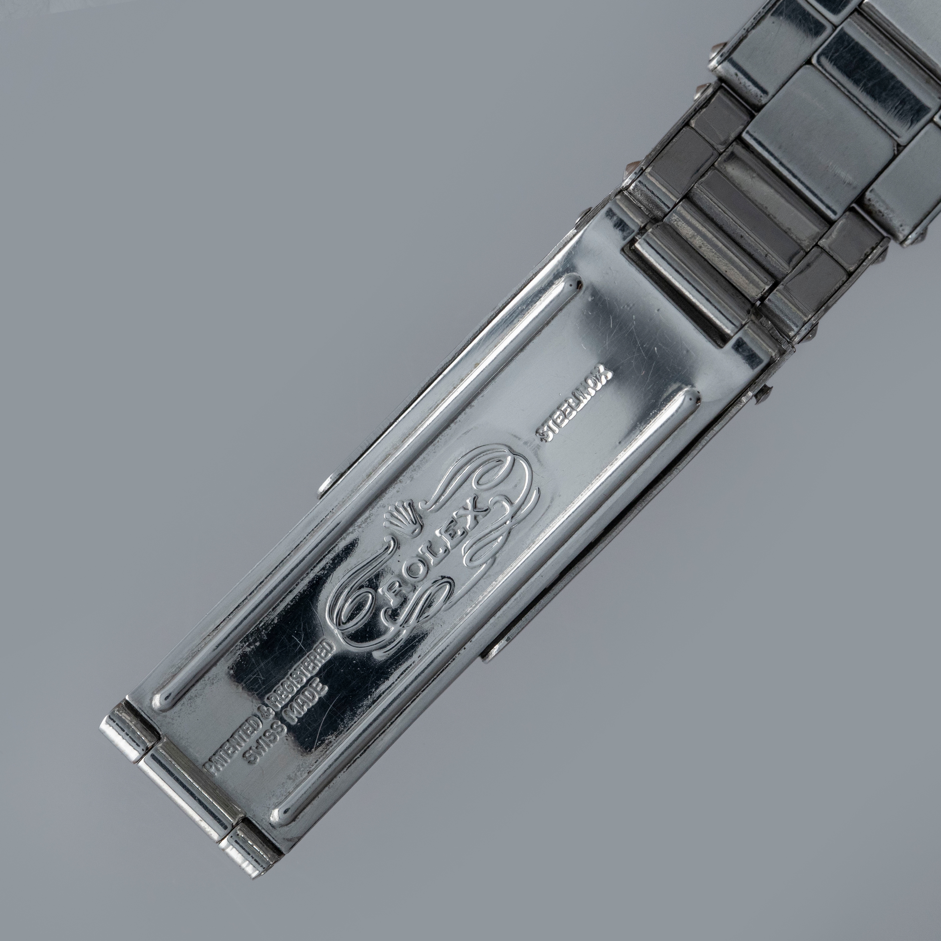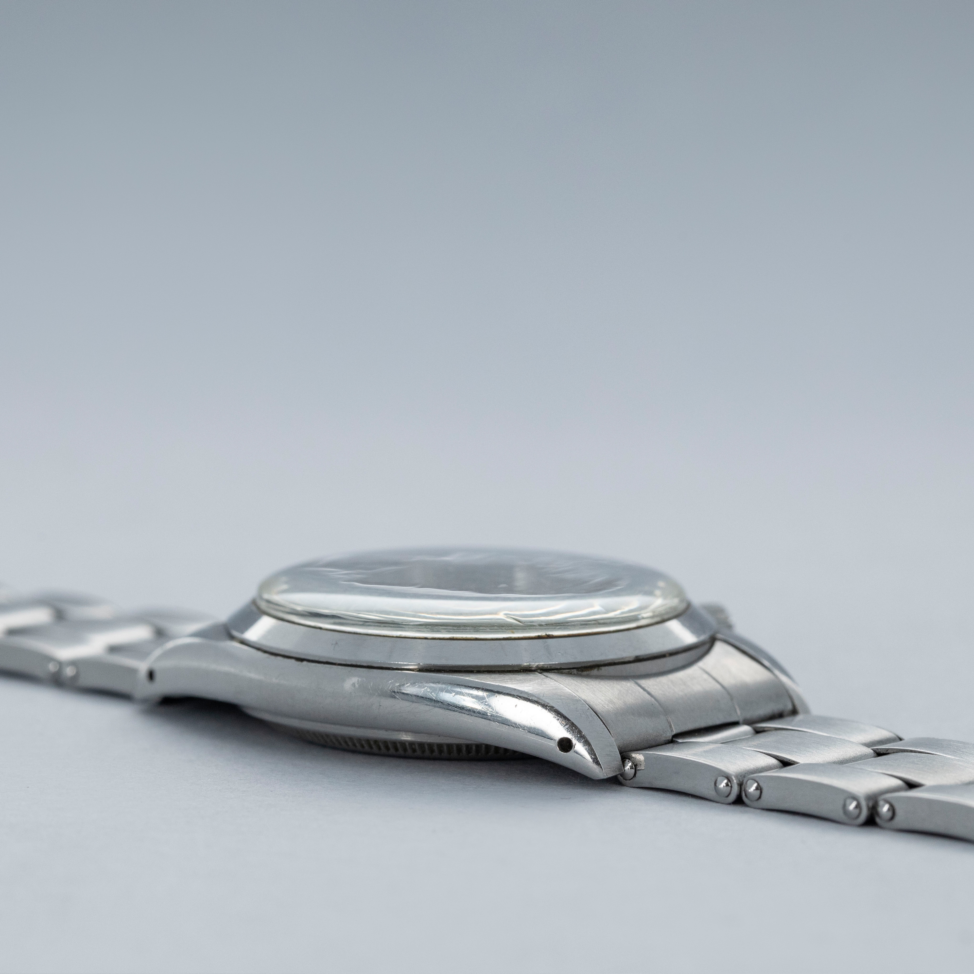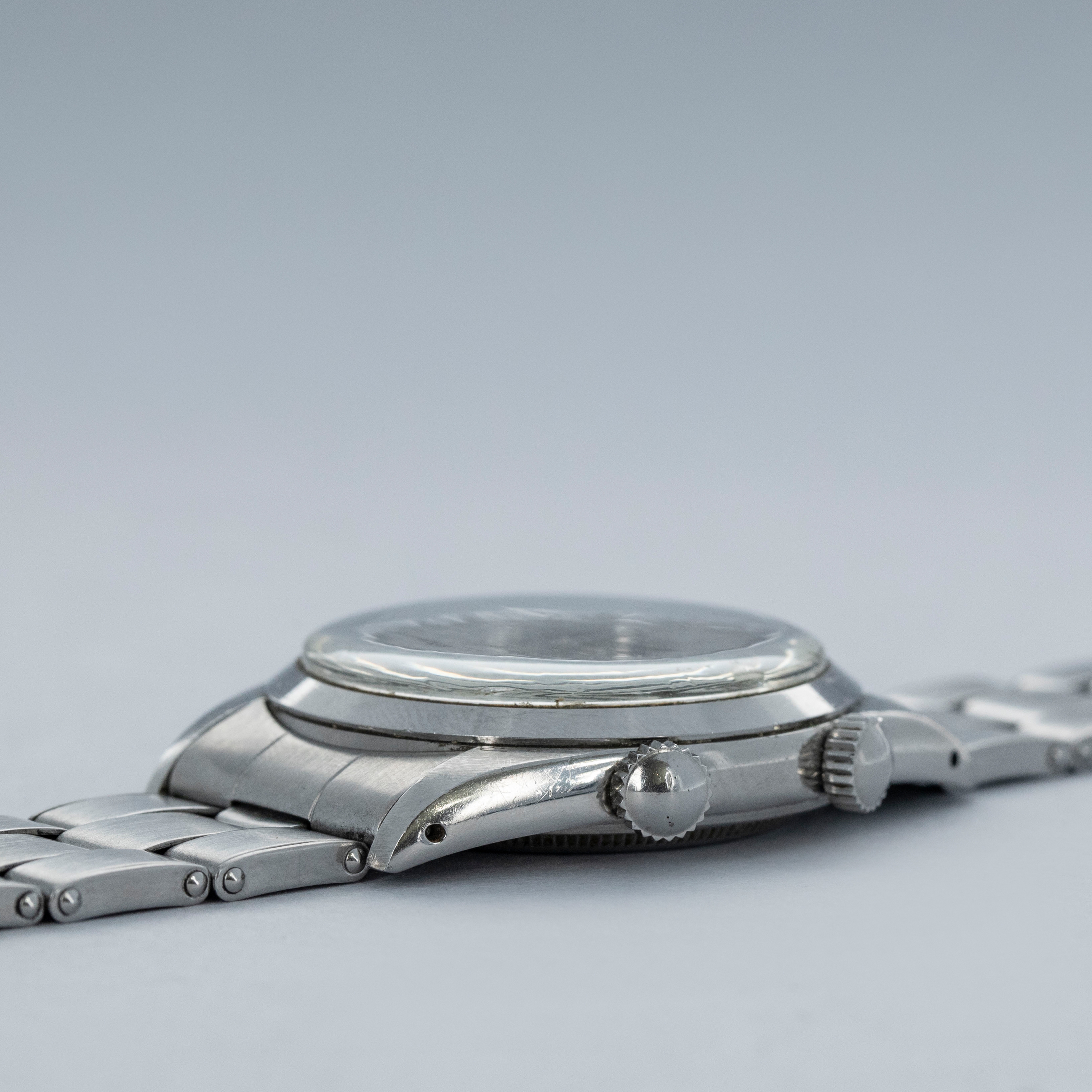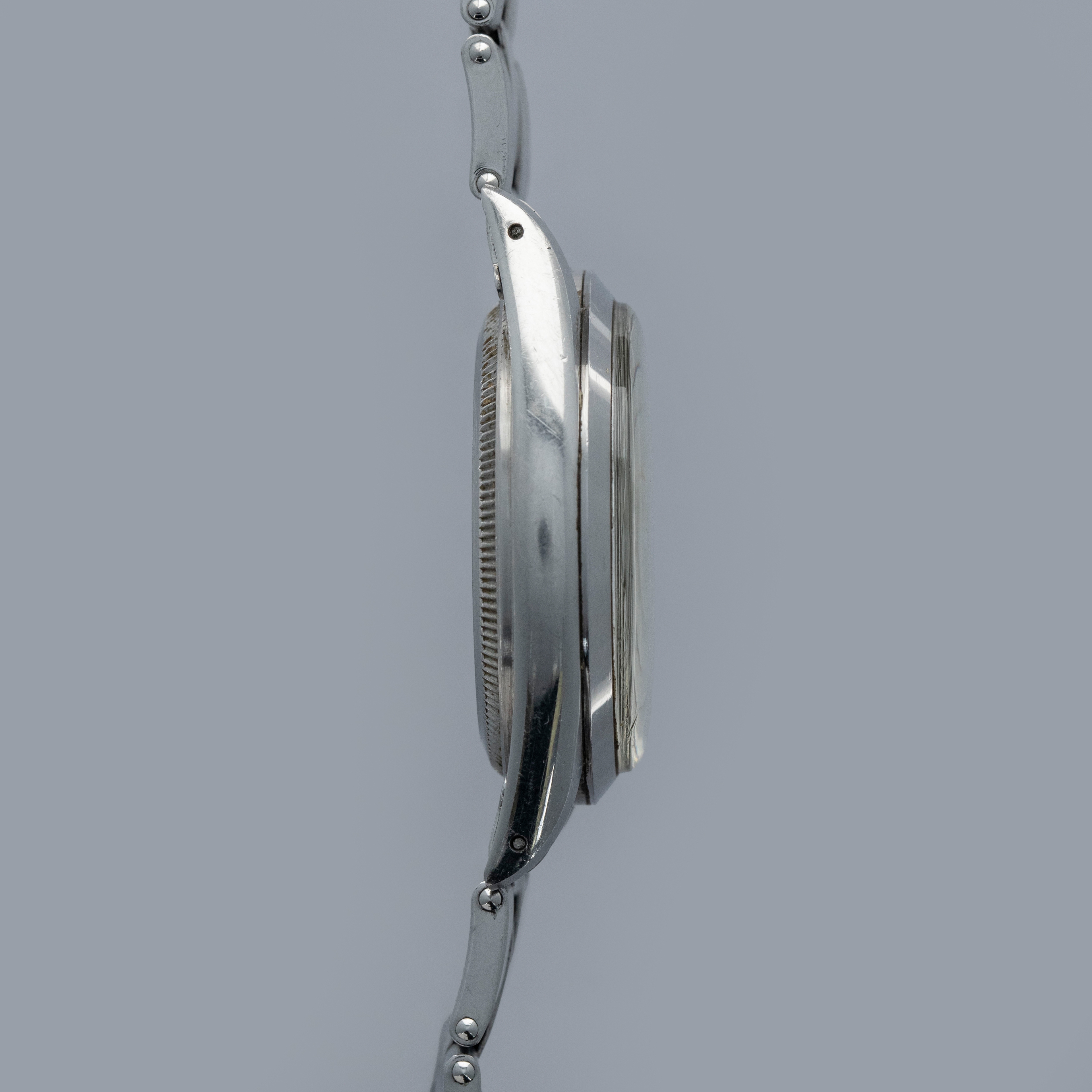 Watch is in overall excellent condition. The steel case has some light scratches and tiny nicks, most notably on the polished bezel, as expected of a watch of this vintage. The case back has some light scratches, and both crowns remain very well defined. The dial is excellent, with intact lume plots and some light oxidation on a few of the applied hour markers. The hands are very clean. It is fitted with a five-link Oyster bracelet, showing surface scuffs and light play between the links. The bracelet has 12 links and fits approximately a 7 1/4” wrist. Please note that the watch ticks at time of cataloging, but timekeeping is poor and a service is recommended.