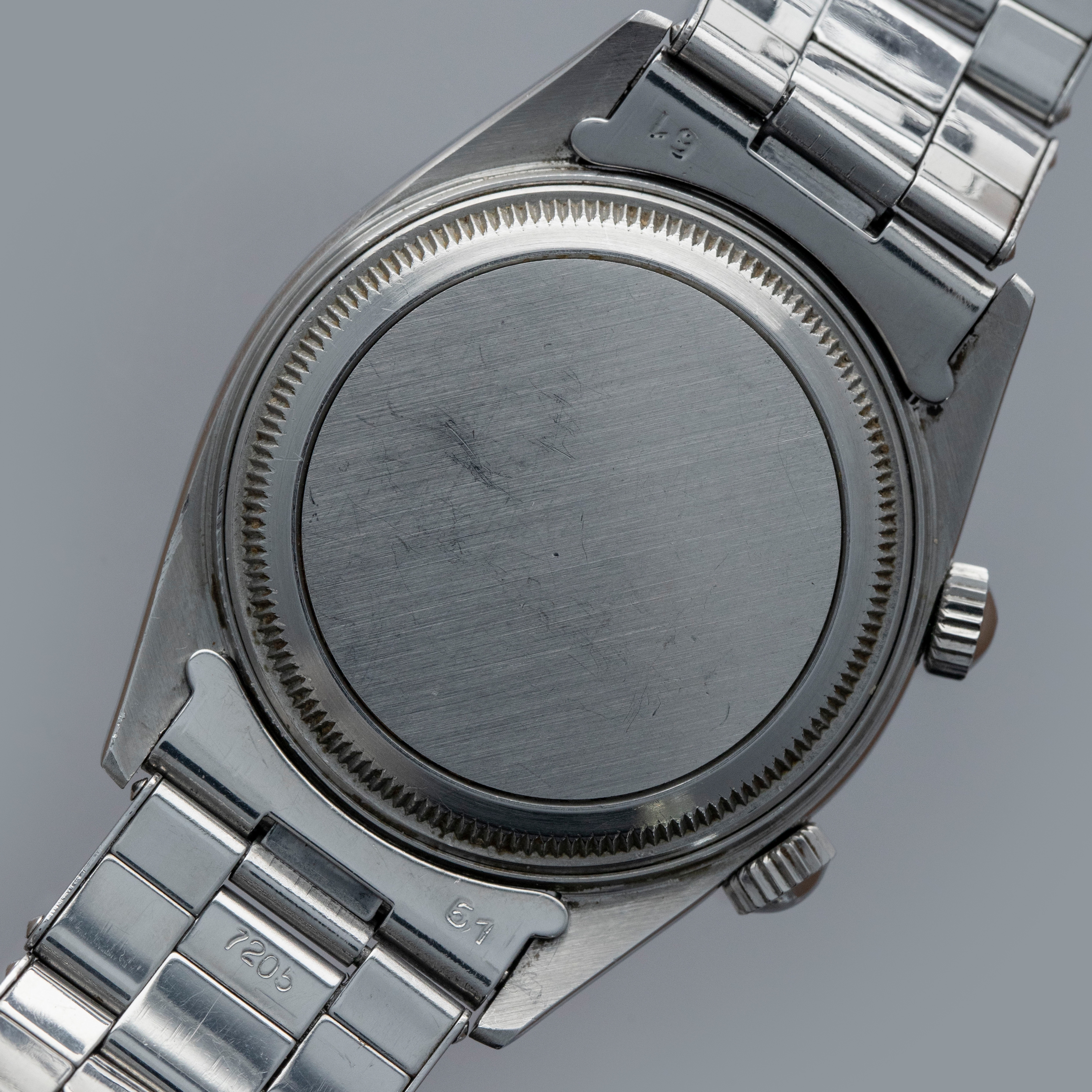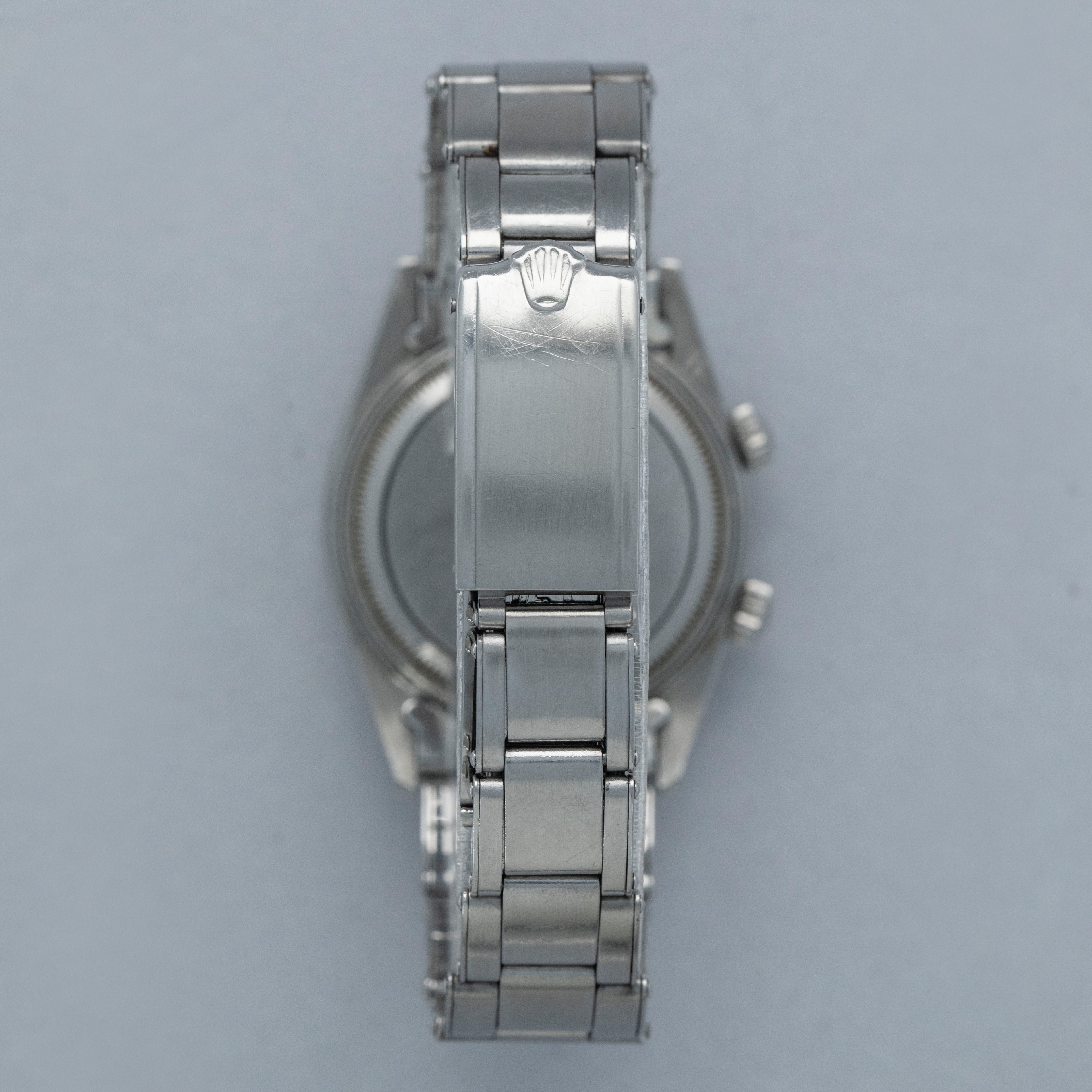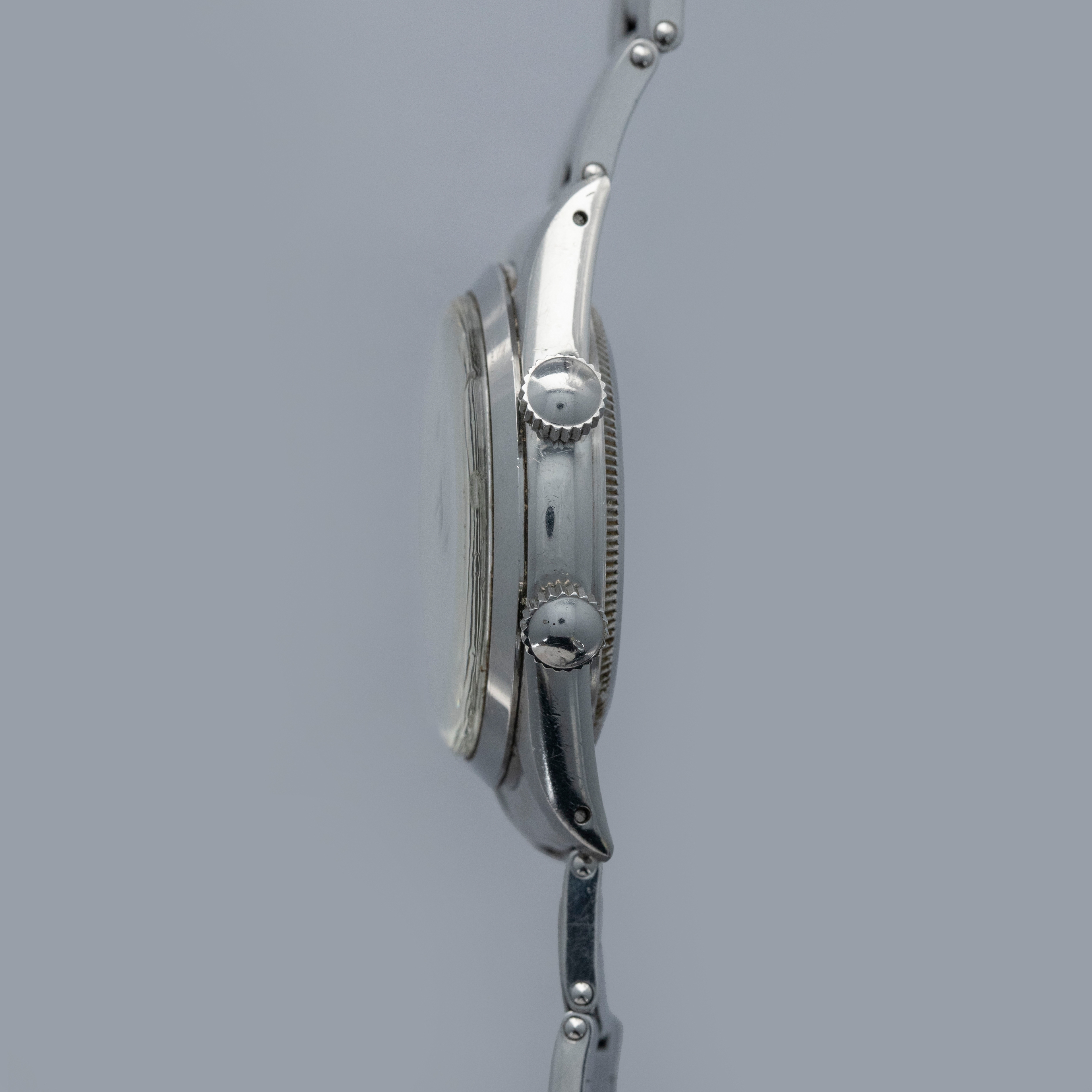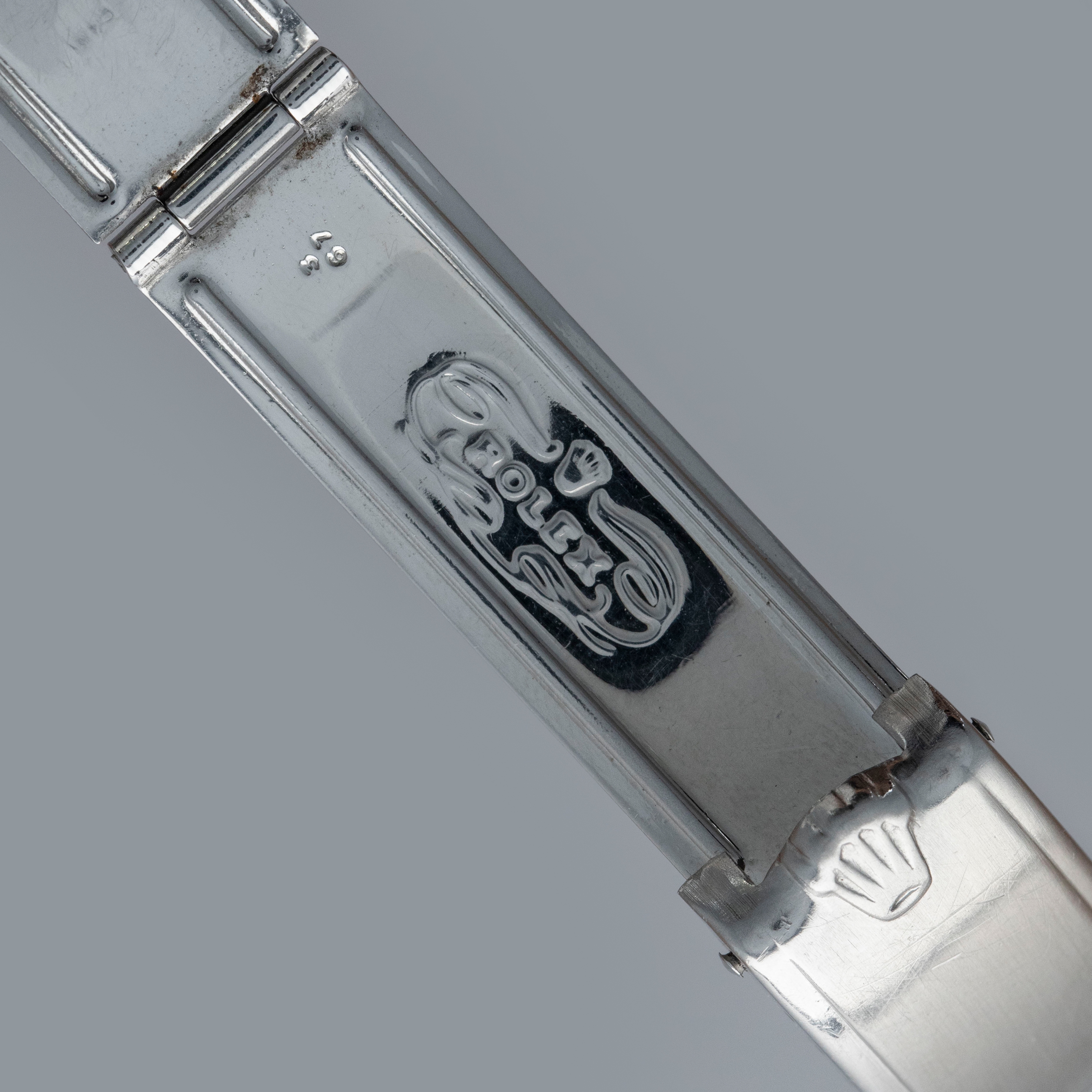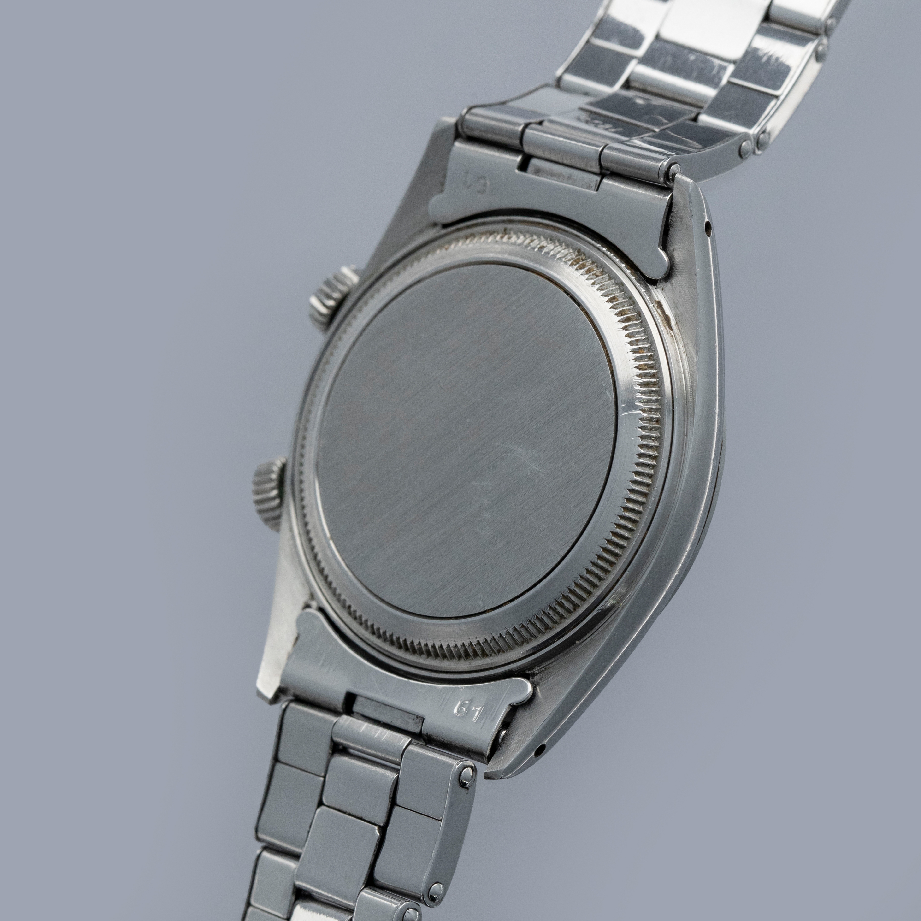 Watch is in overall excellent condition. The steel case has some light scratches and tiny nicks, most notably on the polished bezel, as expected of a watch of this vintage. The case back has some light scratches, and both crowns remain very well defined. The dial is excellent, with intact lume plots and some light oxidation on a few of the applied hour markers. The hands are very clean. It is fitted with a five-link Oyster bracelet, showing surface scuffs and light play between the links. The bracelet has 12 links and fits approximately a 7 1/4” wrist. Please note that the watch ticks at time of cataloging, but timekeeping is poor and a service is recommended.