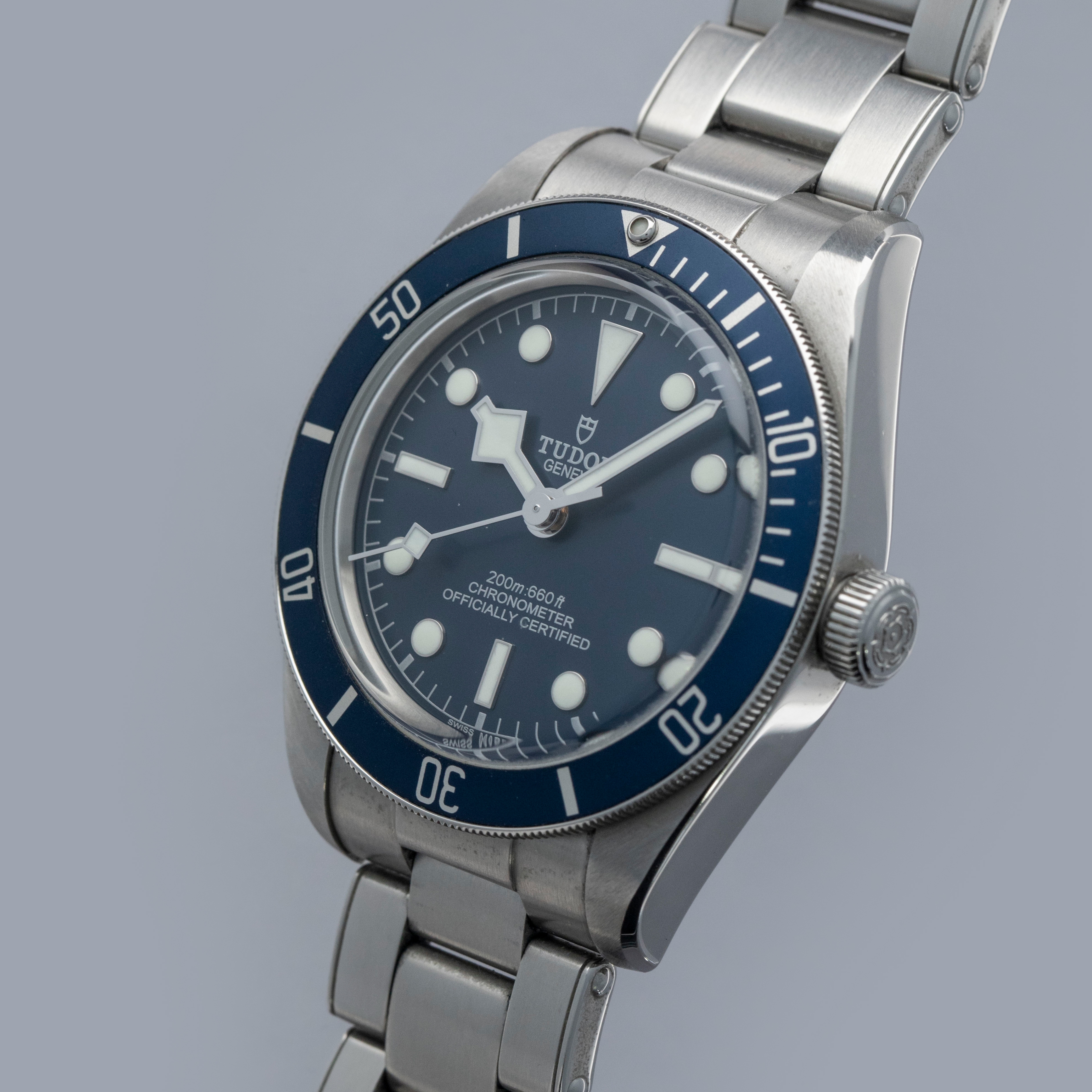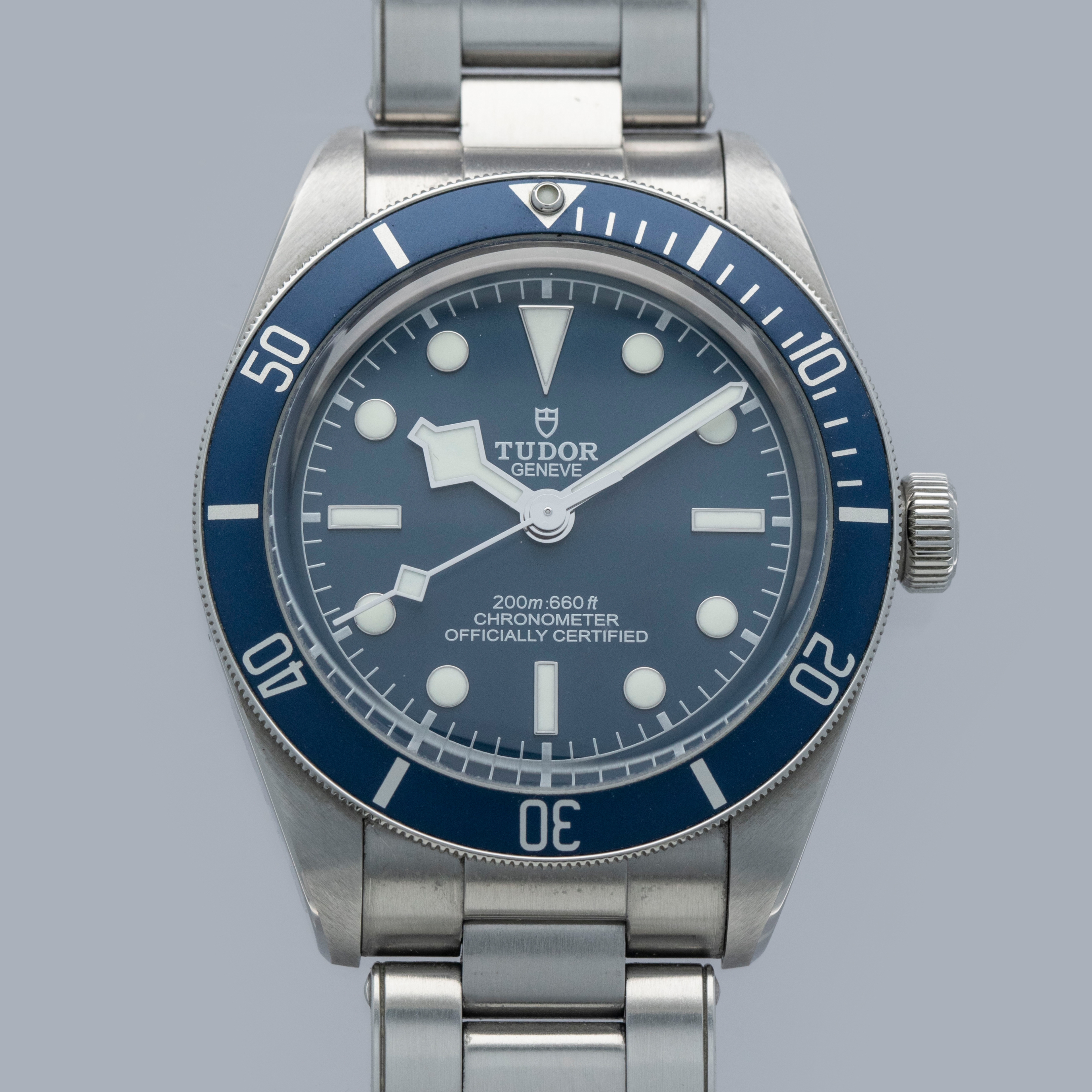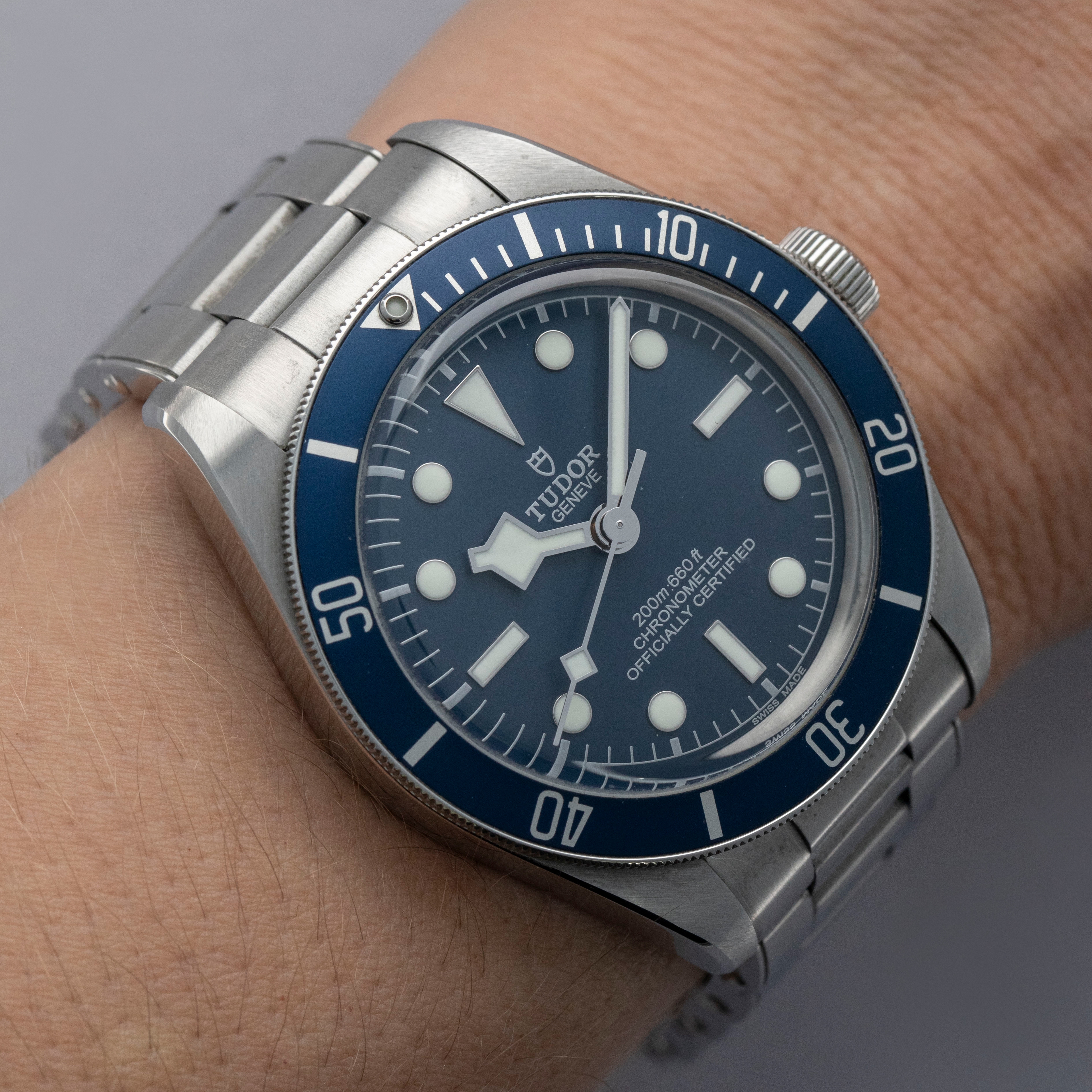 Unveiled in 2012 at Baselworld, the Tudor Black Bay has quickly become one of Tudor’s best-selling collections as it takes direct inspiration from the iconic Tudor Submariner ref. 7922. Seeking to build on the aesthetics of the early Submariner models, the Black Bay family is beloved by Tudor’s collectors for its vintage-inspired design traits like its faux-rivet bracelet, gilt inscriptions, anodized aluminum bezel insert, and large crown. Further refined in 2018, Tudor launched the Black Bay Fifty-Eight as they dove even deeper into their archives and drew inspiration from their 1958 Submariner “Big Crown” Ref. 7924. With its red arrow-featuring dive bezel, thinner profile and 2mm smaller case diameter of 39mm, the BB58, as it is called, was a more refined version of its older sibling, with the very same depth rating of 200m – a true dive watch. Receiving intensely positive reception straight away, the BB58 has quickly become Tudor’s most popular watch. In 2020, Tudor decided to expand upon the Black Bay Fifty-Eight’s blacked out aesthetic with a blue dial and bezel combination, which is what we have here. Swapping the black variant’s gilt inscriptions, the blue reference uses silver inscriptions to add a modern sense of style to its display, while maintaining the BB58’s other vintage-inspired details, such as its faux rivet bracelet, lack of crown guards, anodized aluminum bezel, and domed crystal.