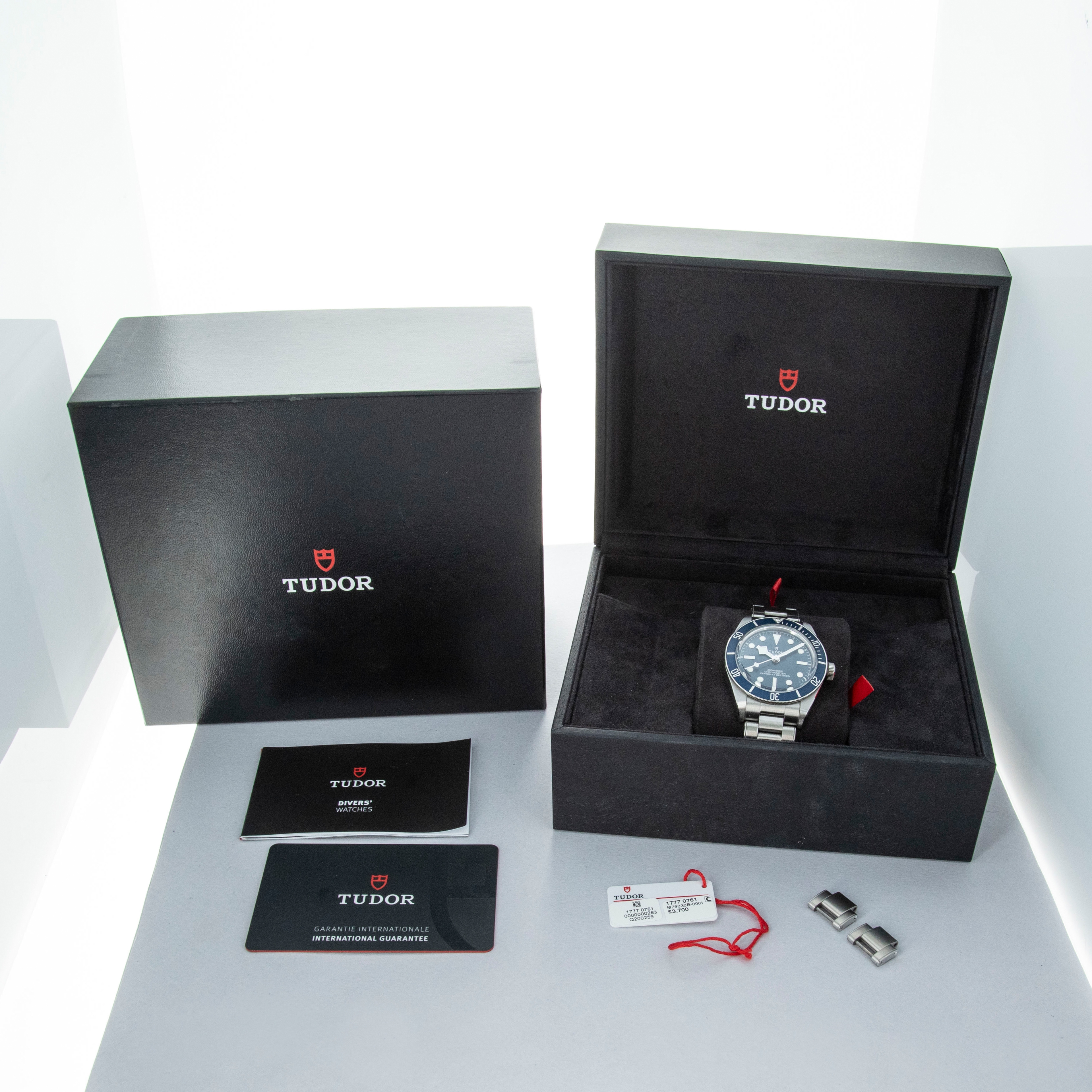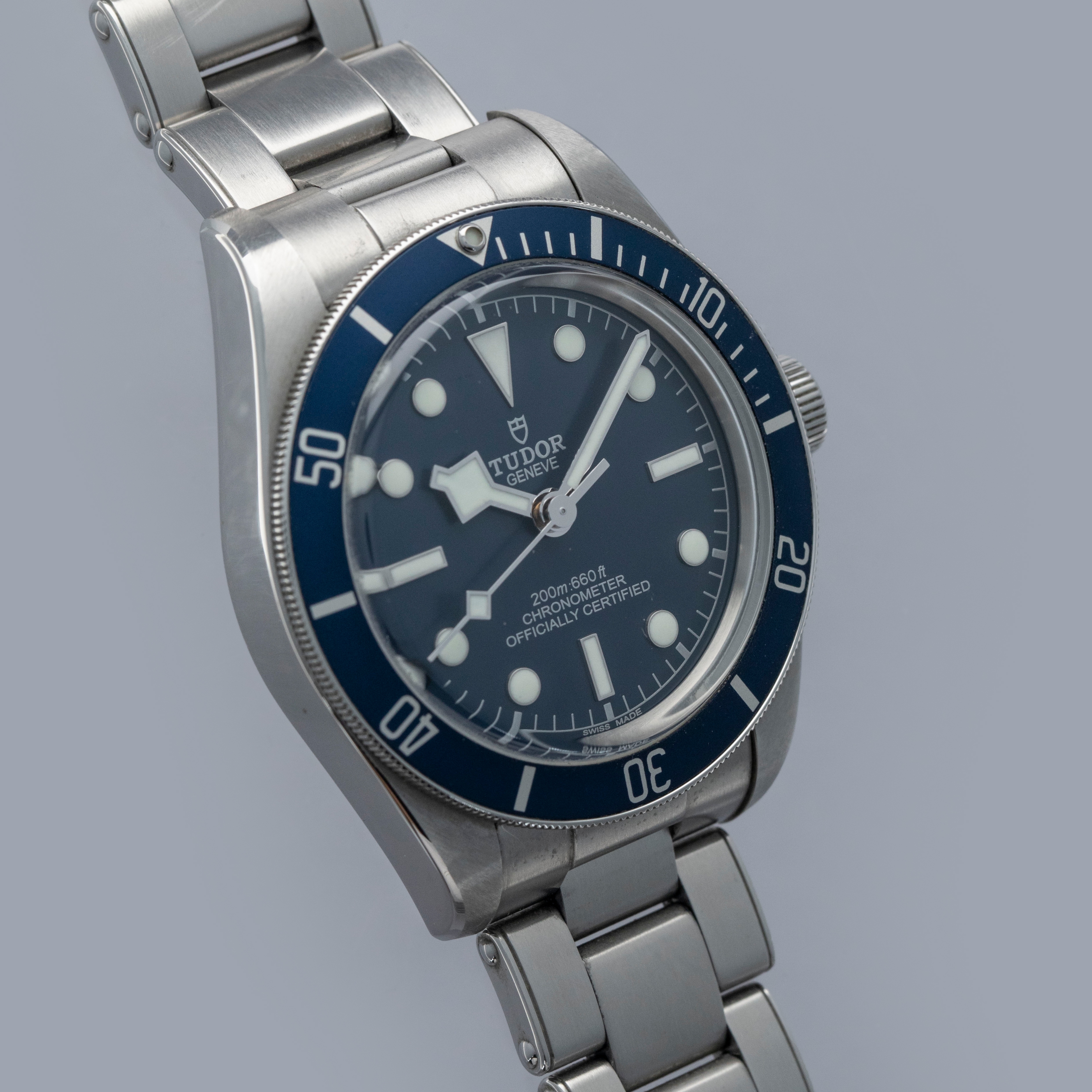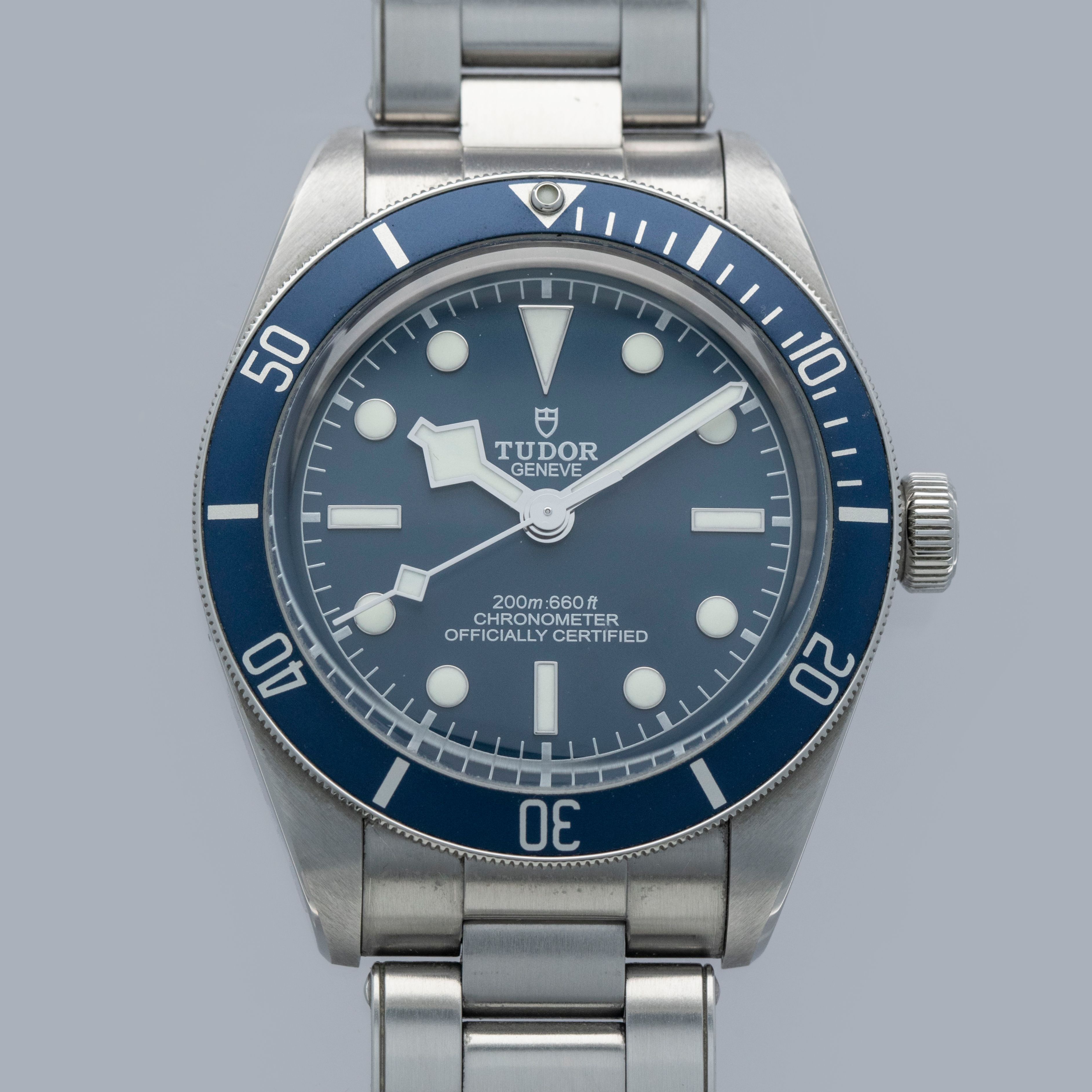 Unveiled in 2012 at Baselworld, the Tudor Black Bay has quickly become one of Tudor’s best-selling collections as it takes direct inspiration from the iconic Tudor Submariner ref. 7922. Seeking to build on the aesthetics of the early Submariner models, the Black Bay family is beloved by Tudor’s collectors for its vintage-inspired design traits like its faux-rivet bracelet, gilt inscriptions, anodized aluminum bezel insert, and large crown. Further refined in 2018, Tudor launched the Black Bay Fifty-Eight as they dove even deeper into their archives and drew inspiration from their 1958 Submariner “Big Crown” Ref. 7924. With its red arrow-featuring dive bezel, thinner profile and 2mm smaller case diameter of 39mm, the BB58, as it is called, was a more refined version of its older sibling, with the very same depth rating of 200m – a true dive watch. Receiving intensely positive reception straight away, the BB58 has quickly become Tudor’s most popular watch. In 2020, Tudor decided to expand upon the Black Bay Fifty-Eight’s blacked out aesthetic with a blue dial and bezel combination, which is what we have here. Swapping the black variant’s gilt inscriptions, the blue reference uses silver inscriptions to add a modern sense of style to its display, while maintaining the BB58’s other vintage-inspired details, such as its faux rivet bracelet, lack of crown guards, anodized aluminum bezel, and domed crystal.