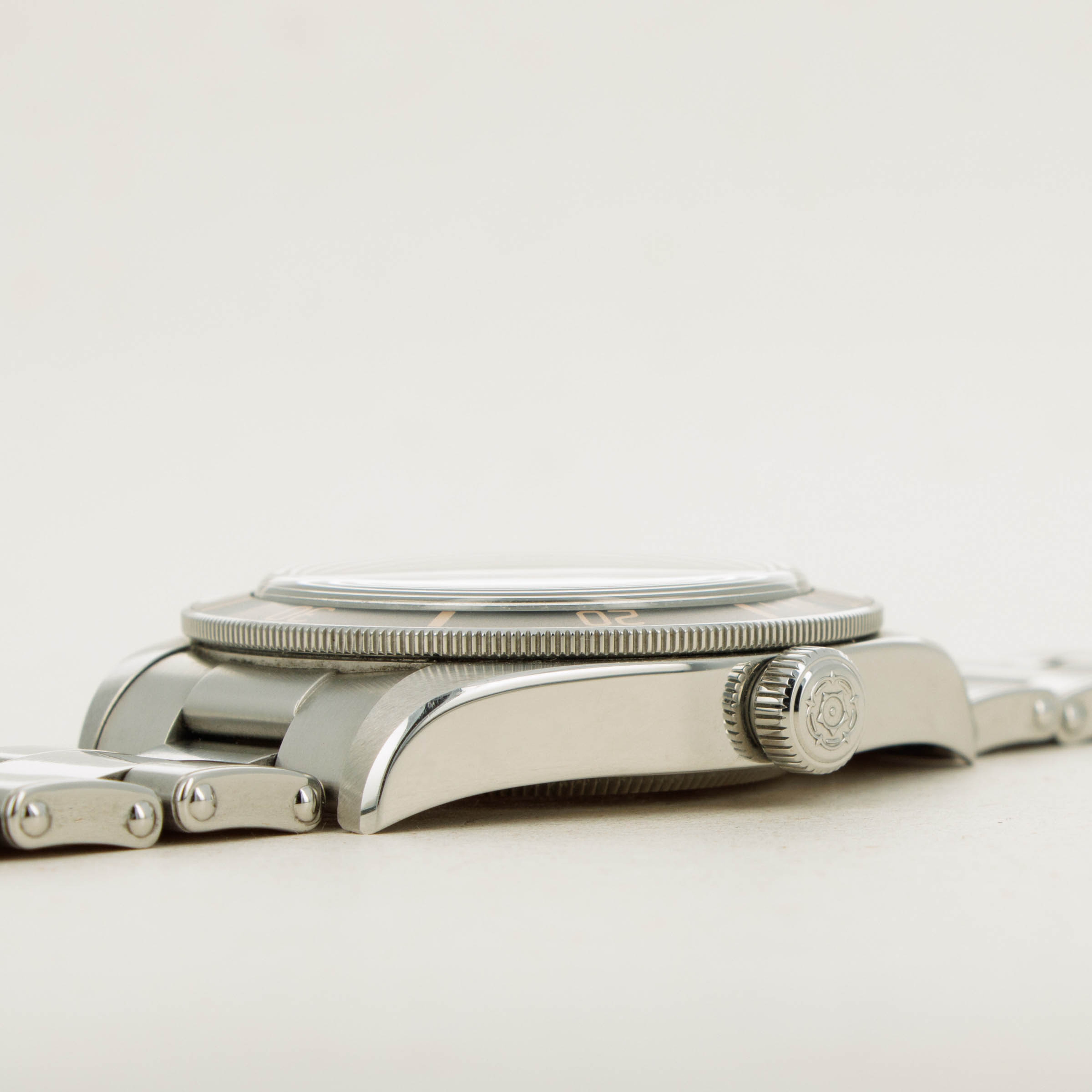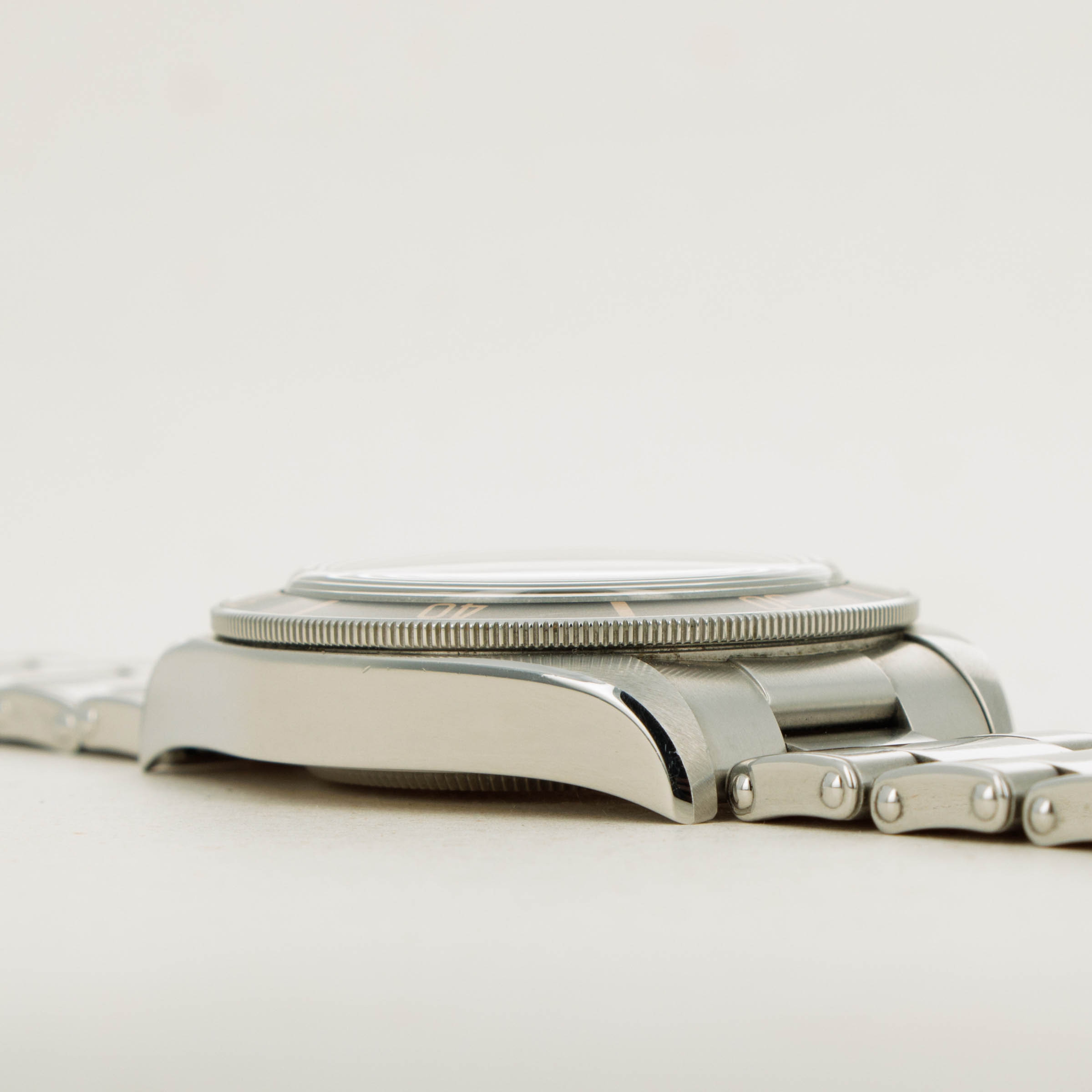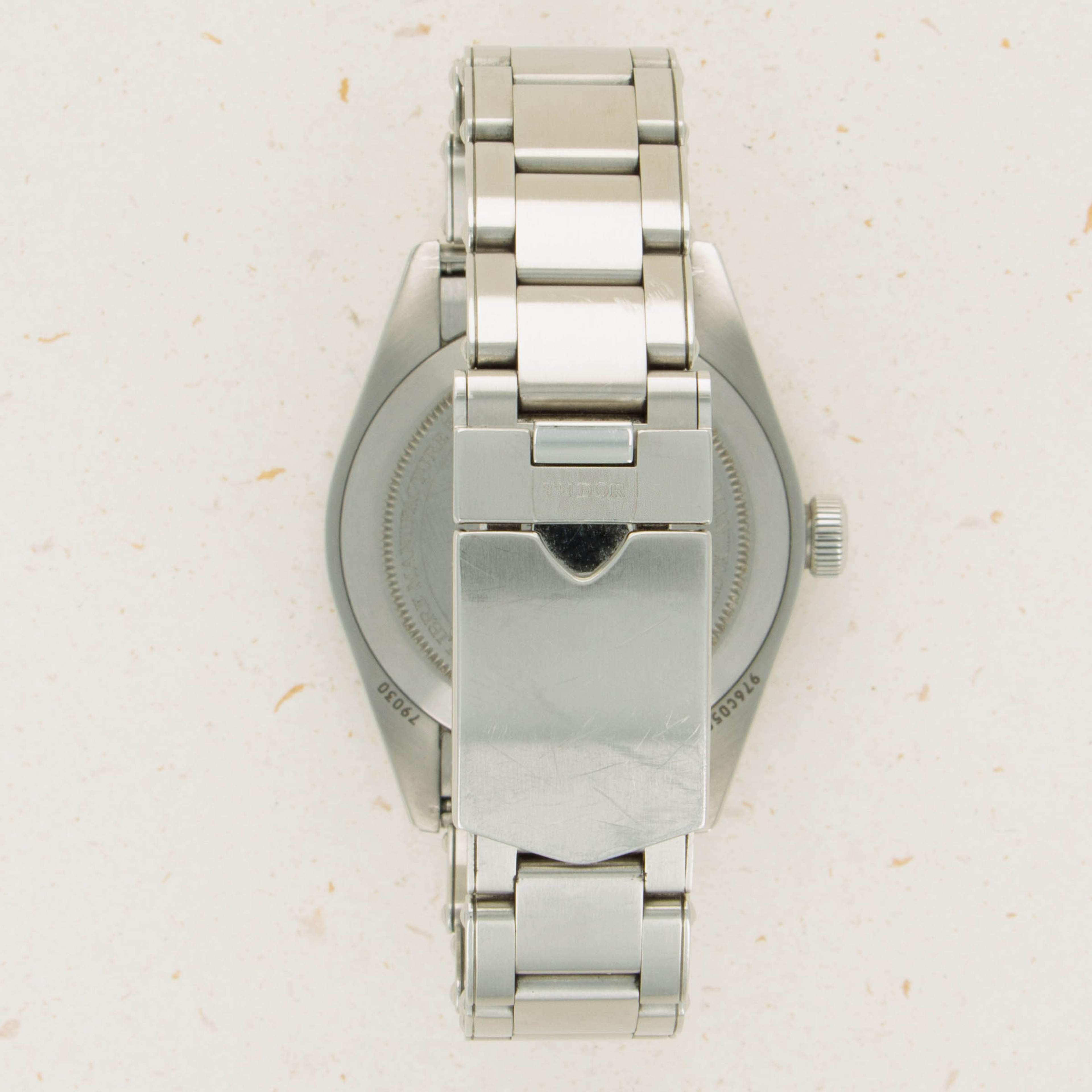 Watch is in excellent overall condition. Case has some wear and minor marks, with partial plastic still intact on the crown side of the case. Bracelet with scratches visible along links and the clasp. Band was sized previously but removed links are included.