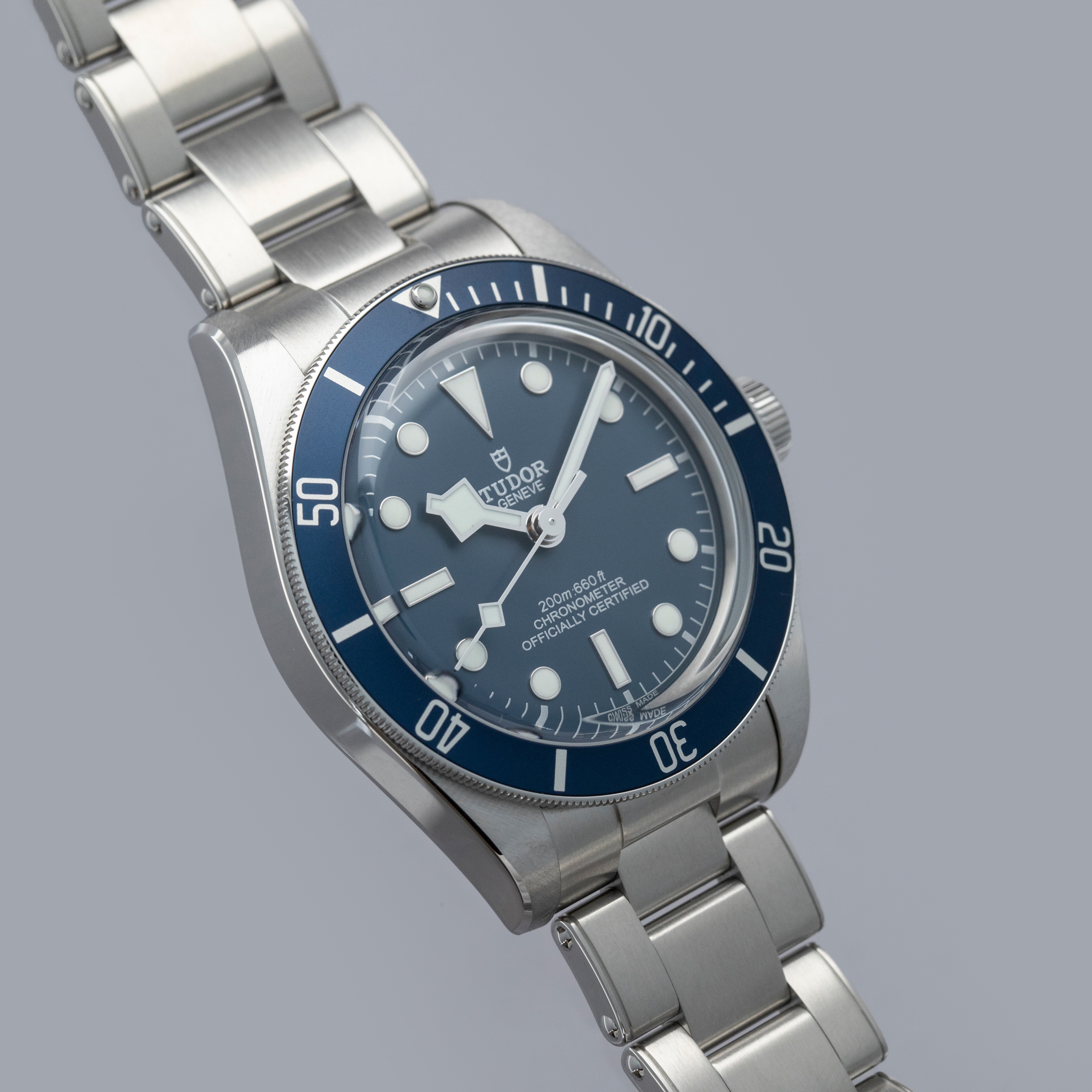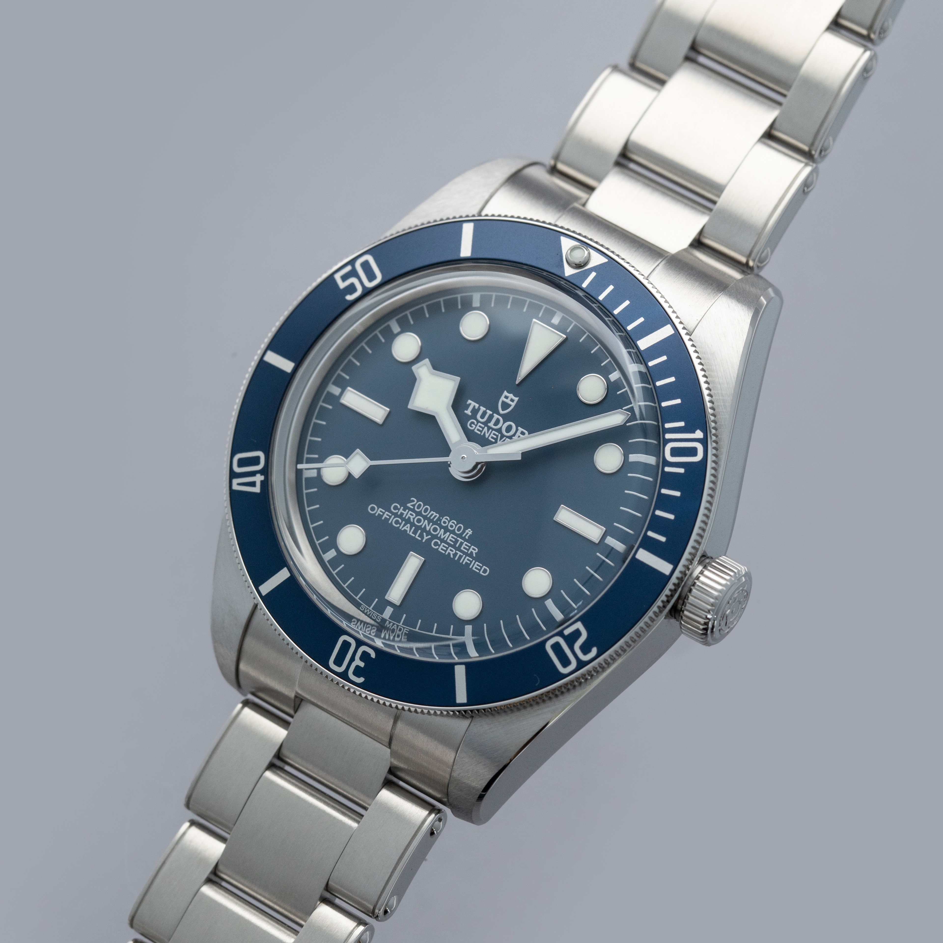 Unveiled in 2012 at Baselworld, the Tudor Black Bay has quickly become one of Tudor’s best-selling collections as it takes direct inspiration from the iconic Tudor Submariner ref. 7922. Seeking to build on the aesthetics of the early Submariner models, the Black Bay family is beloved by Tudor’s collectors for its vintage-inspired design traits like its faux-rivet bracelet, gilt inscriptions, anodized aluminum bezel insert, and large crown. Further refined in 2018, Tudor launched the Black Bay Fifty-Eight as they dove even deeper into their archives and drew inspiration from their 1958 Submariner “Big Crown” Ref. 7924. With its red arrow-featuring dive bezel, thinner profile and 2mm smaller case diameter of 39mm, the BB58, as it is called, was a more refined version of its older sibling, with the very same depth rating of 200m – a true dive watch. Receiving intensely positive reception straight away, the BB58 has quickly become Tudor’s most popular watch. In 2020, Tudor decided to expand upon the Black Bay Fifty-Eight’s blacked out aesthetic with a blue dial and bezel combination, which is what we have here. Swapping the black variant’s gilt inscriptions, the blue reference uses silver inscriptions to add a modern sense of style to its display, while maintaining the BB58’s other vintage-inspired details, such as its faux rivet bracelet, lack of crown guards, anodized aluminum bezel, and domed crystal.