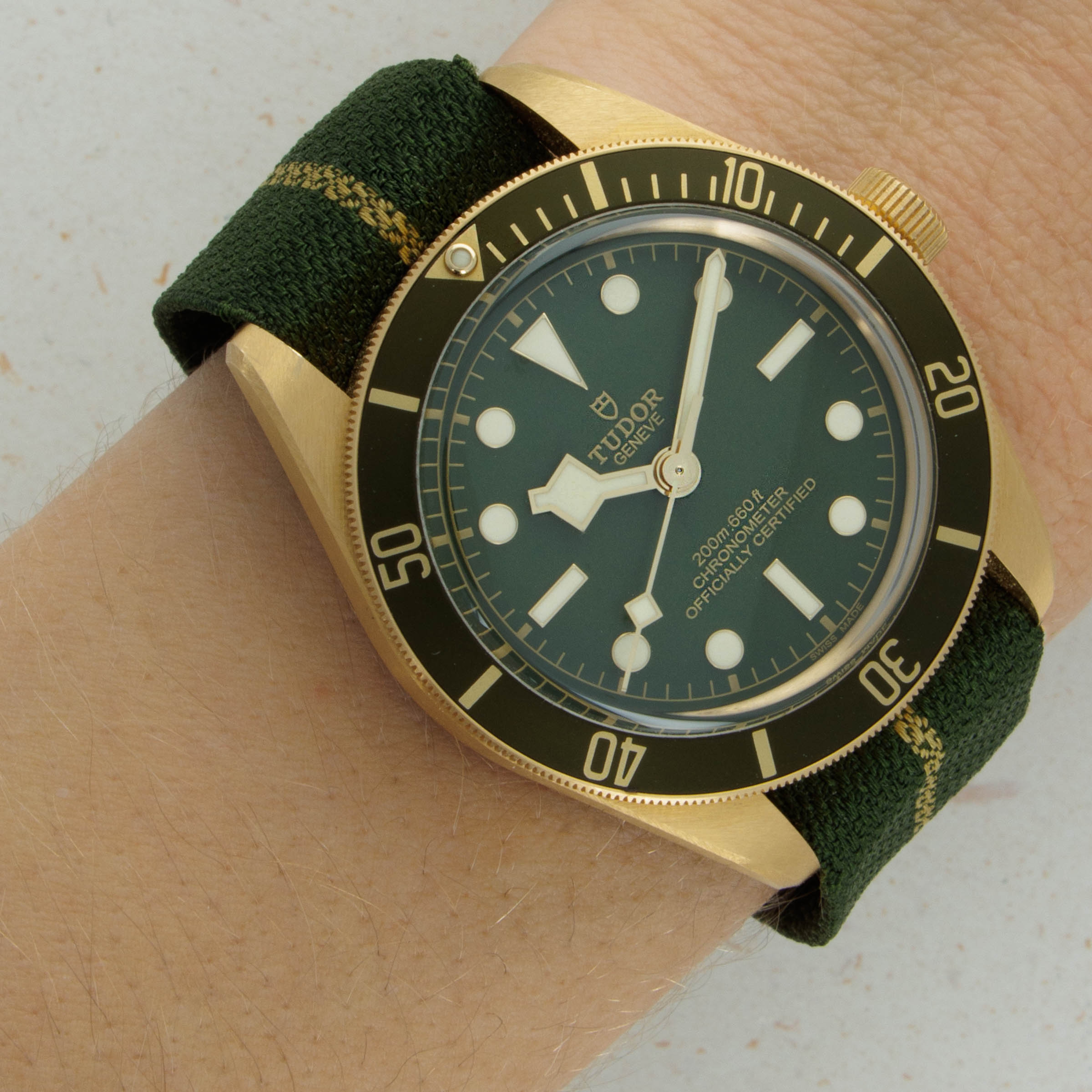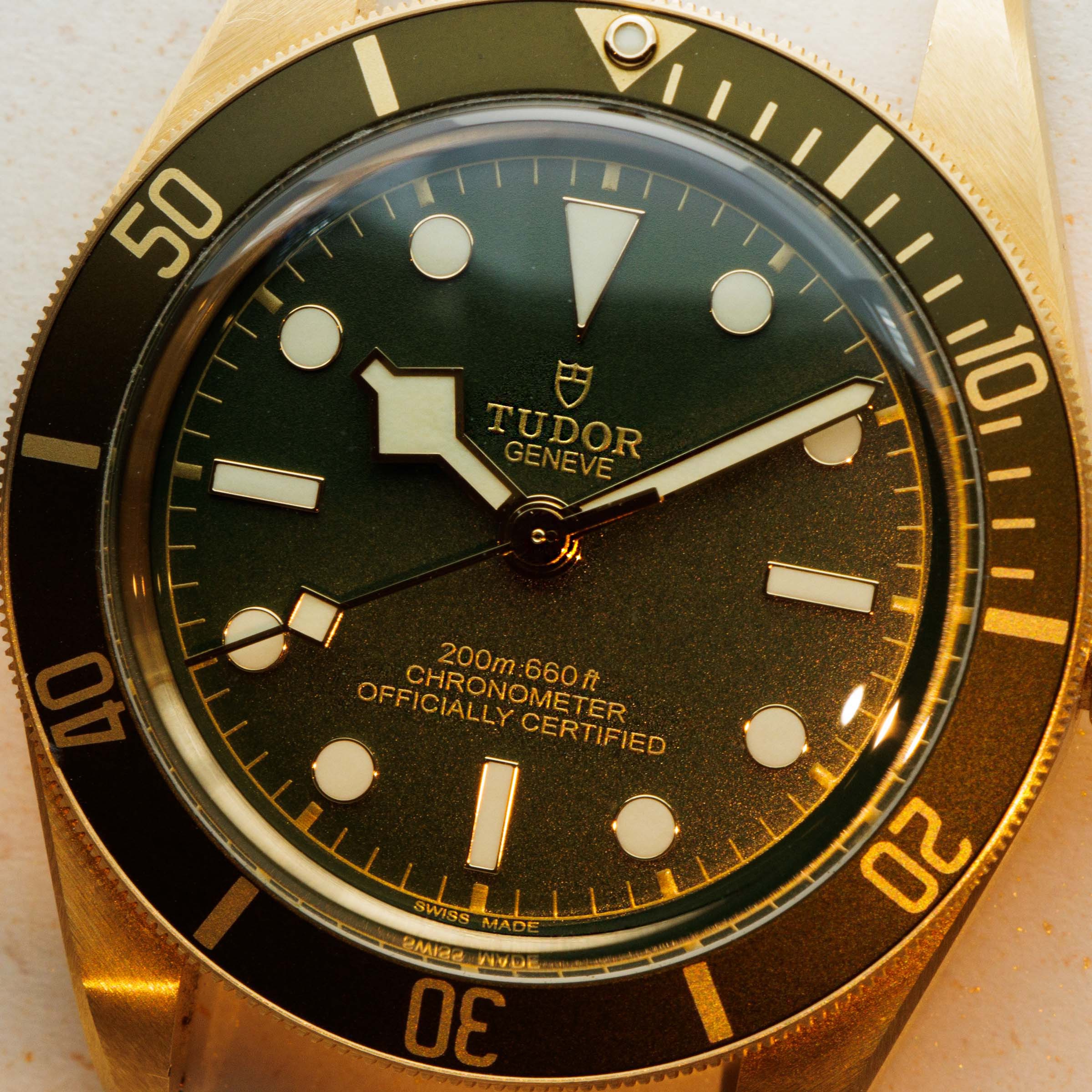 Fitted with a matte green dial with gold inscriptions and dial furniture and green aluminum bezel with gold inscriptions too, the Black Bay's display compliments its 18kt yellow gold construction beautifully.