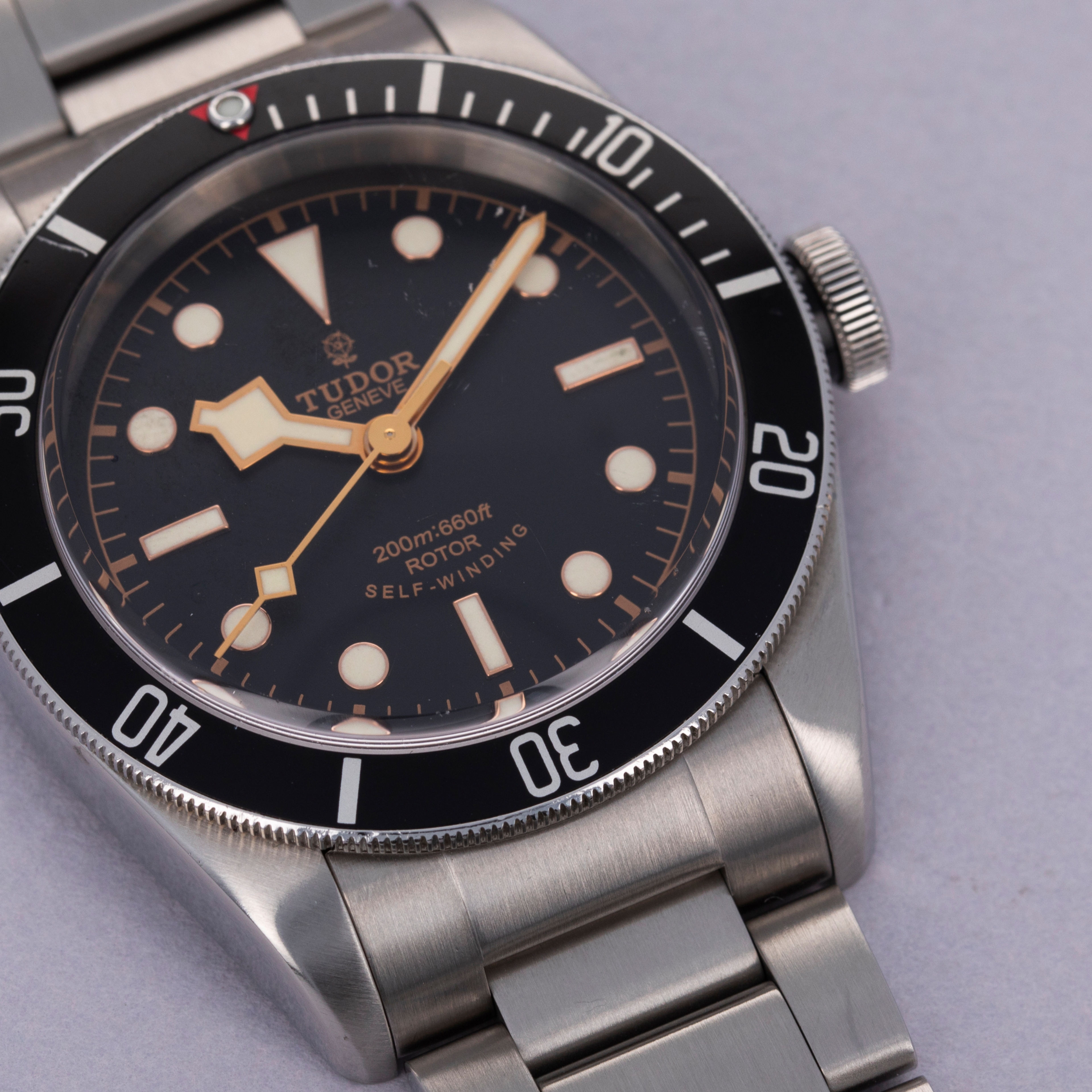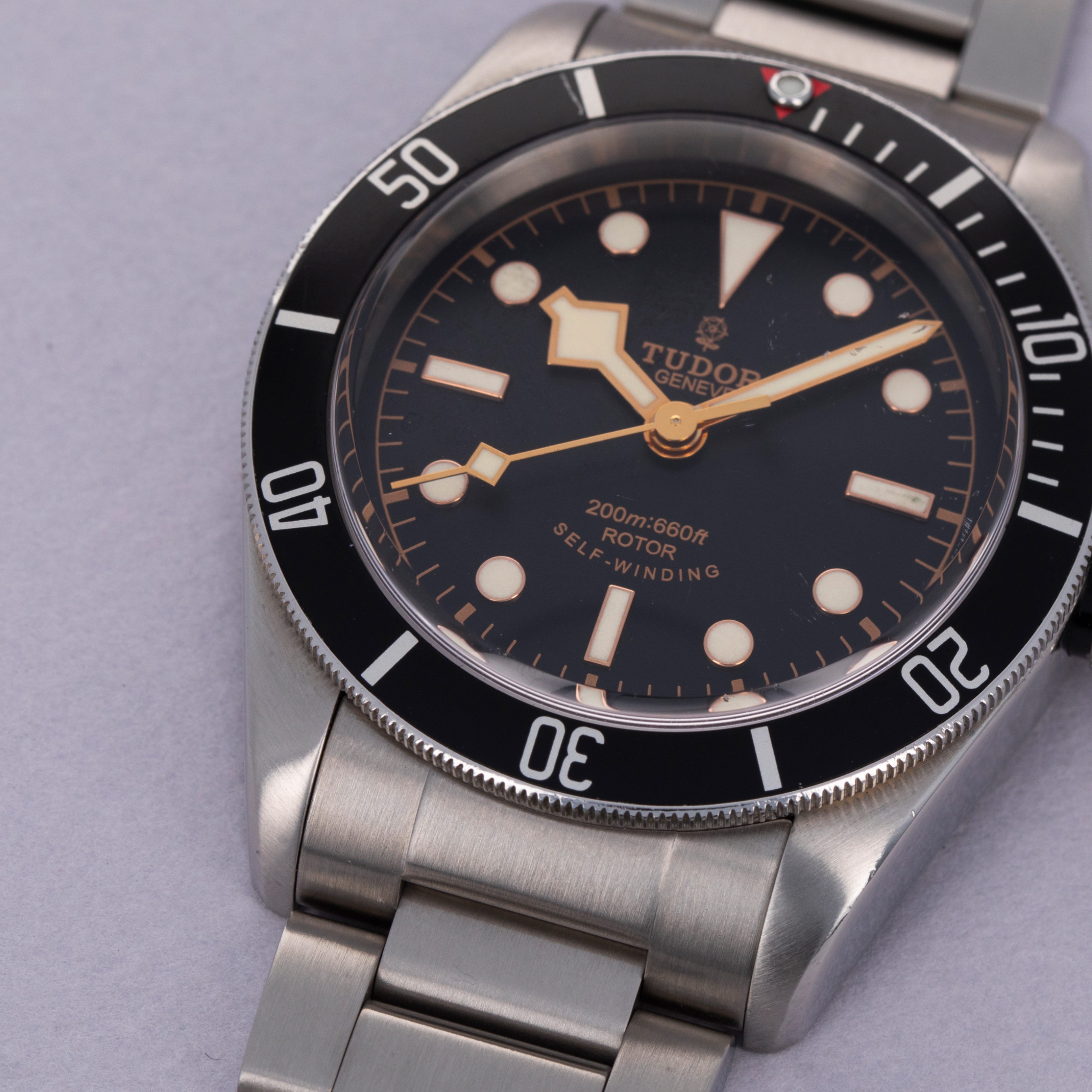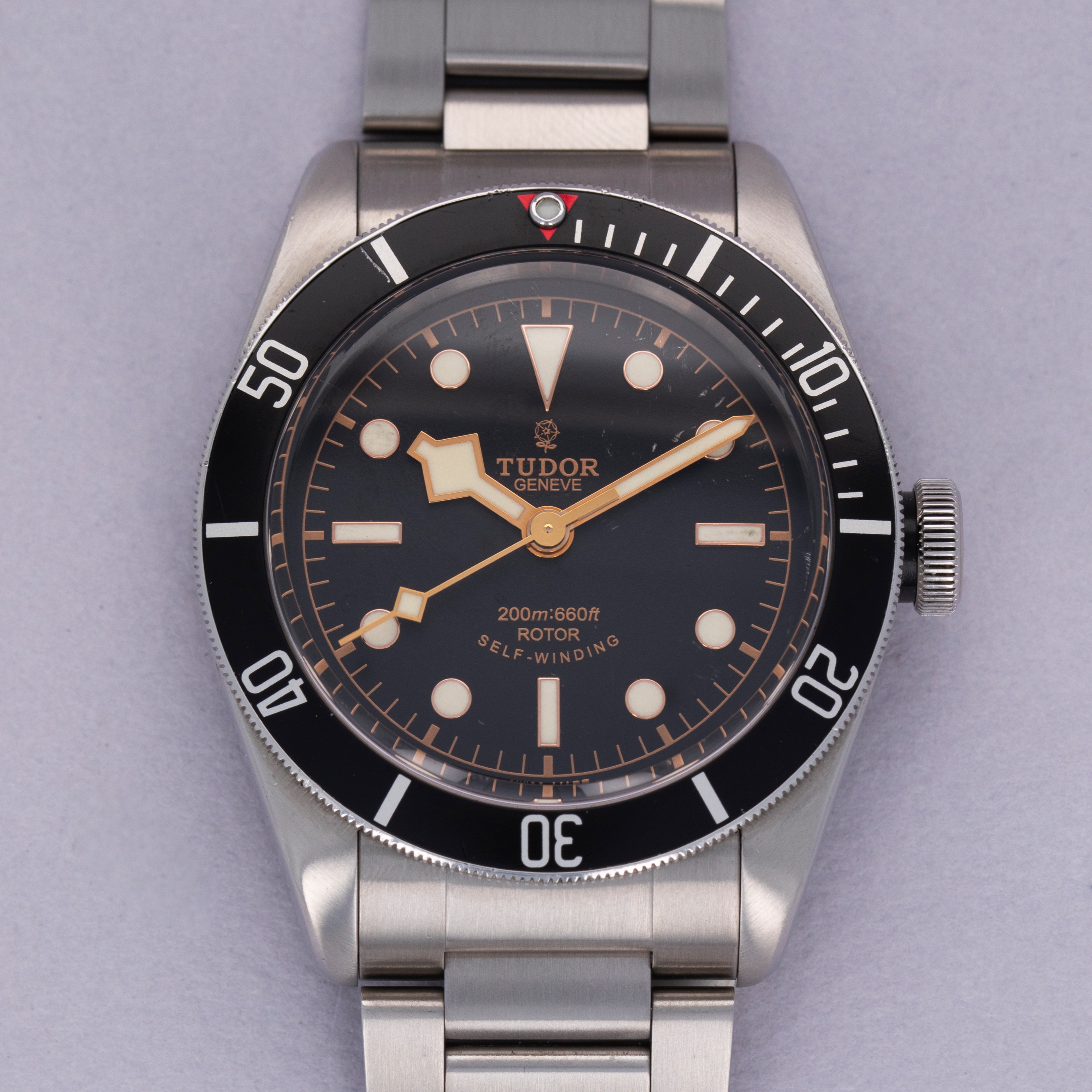 Boasting a black dial with gilt inscriptions, the collectable ETA-powered variants of the Black Bay can be identified by their rose logo at 12 o'clock and "smiley face" inscription at 6 o'clock, which was replaced with straight inscriptions and Tudor's shield logo in the ref. 79230.