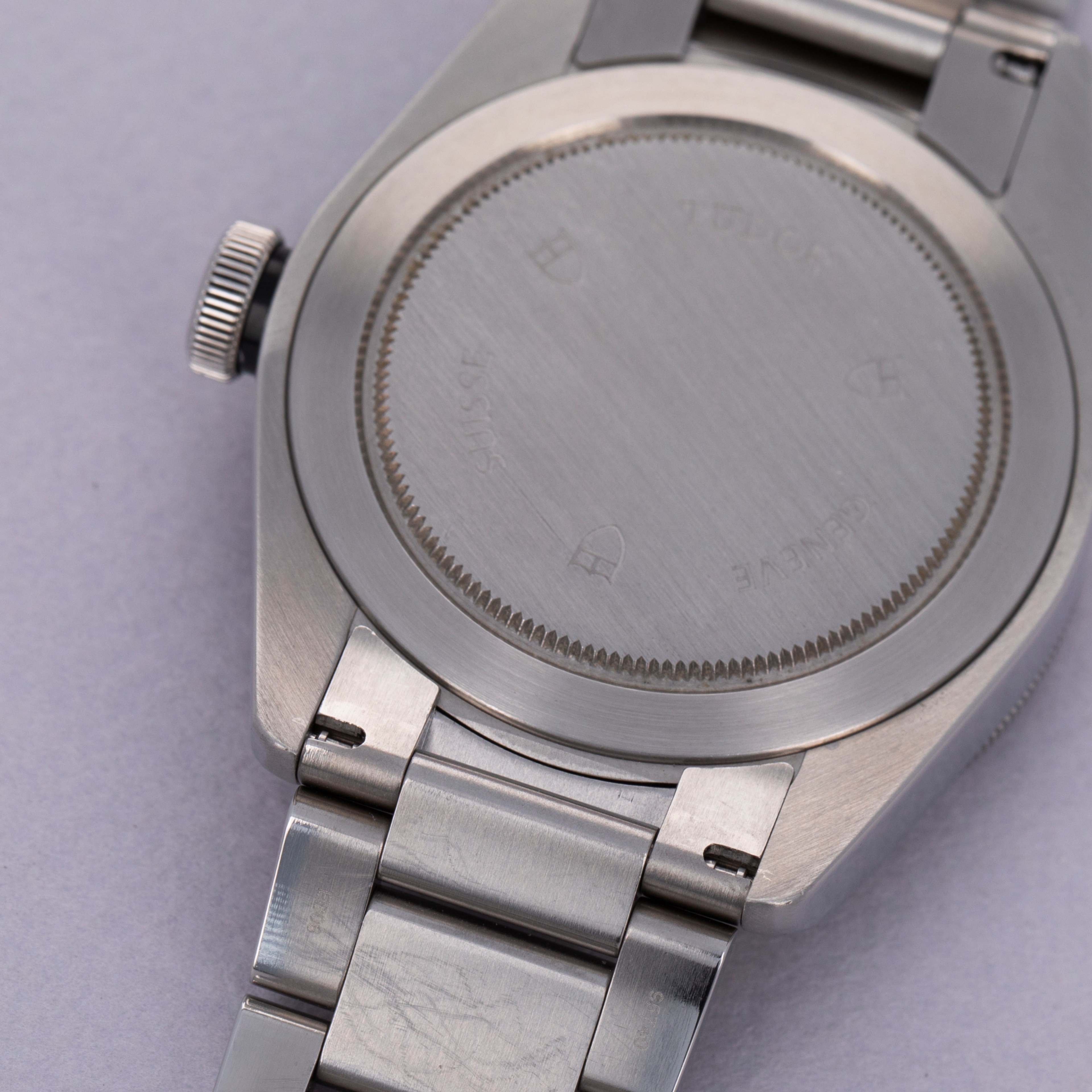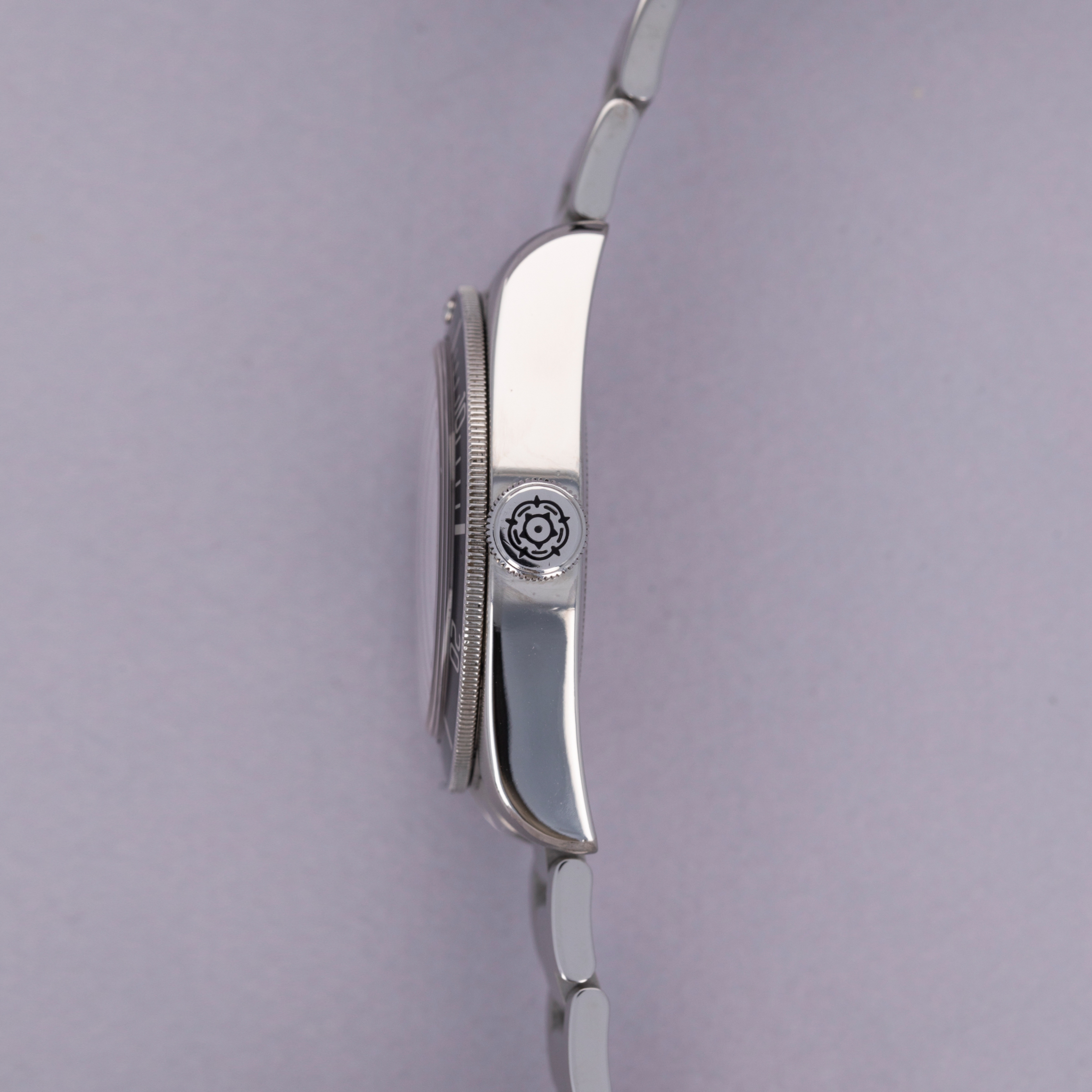 Watch is in very good overall condition. Case shows moderate signs of wear, wtih soft lugs that have small scratches and nicks visible. Bezel has a vertical scratch next to the 55 minute index. Crystal shows light surface scratches. Watch comes on its original bracelet currently sized for a 7" wrist. It shows negligible stretch and minor surface wear. There were 3 links removed from the bracelet but they are included with the watch. Please note that the watch runs at time of cataloging, but the timekeeping is poor and a service is recommended.