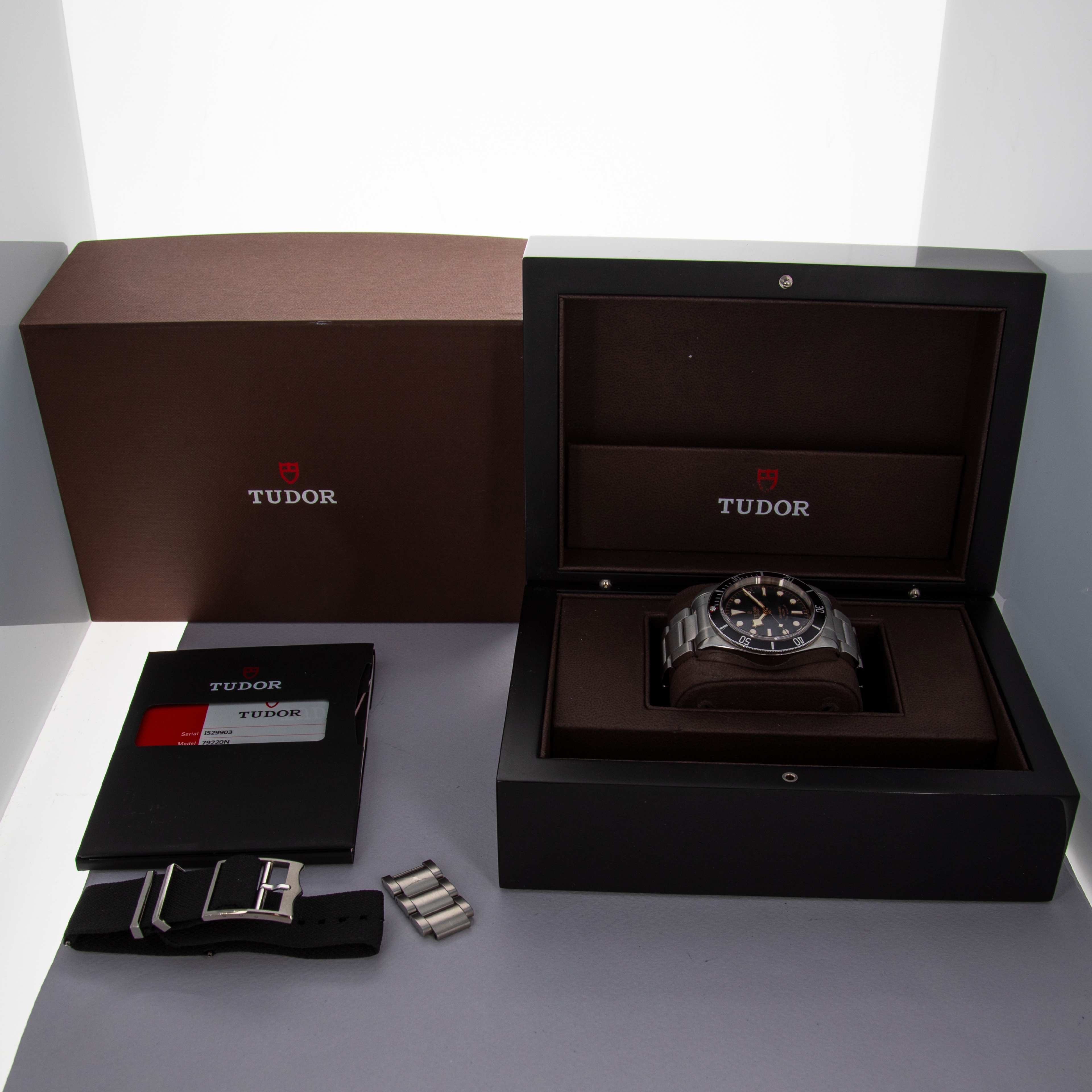 Unveiled in 2012 at Baselworld, the Tudor Black Bay has quickly become one of Tudor’s best-selling collections as it takes direct inspiration from the iconic Tudor Submariner ref. 7922. Seeking to build on the aesthetics of the early Submariner models, the Black Bay family is beloved by Tudor’s collectors for its vintage-inspired design traits like its faux-rivet bracelet, gilt inscriptions, anodized aluminum bezel insert, and large crown. Offered here, we have the Black Bay Heritage ref. 79220N, launched in October 2015 and discontinued by Baselworld 2016 on March 17th, meaning it has the shortest production run out of any watch Tudor have ever produced. Powered by an ETA movement, before the collection went with in-house movements, and boasting Tudor’s rose logo at 12 o’clock before changing to the shield logo that now dons the Black Bay’s dial, this black and gilt timepiece’s dial is truly reminiscent of the watches that it was created to celebrate.