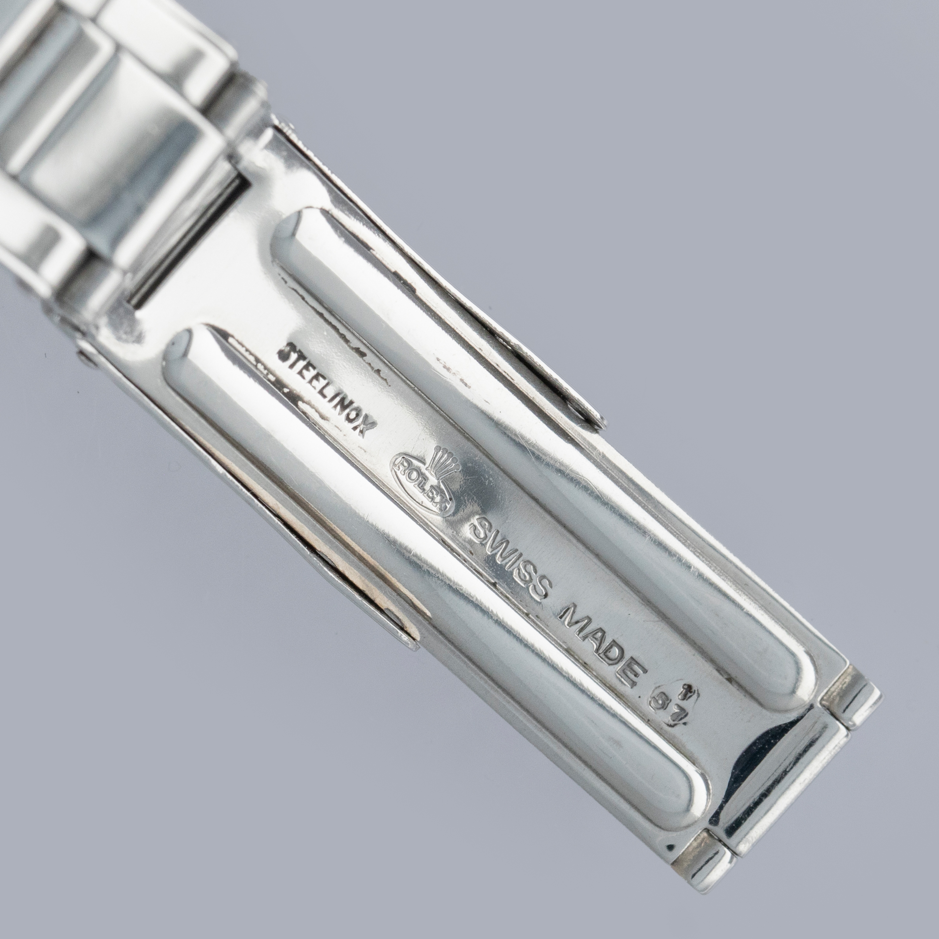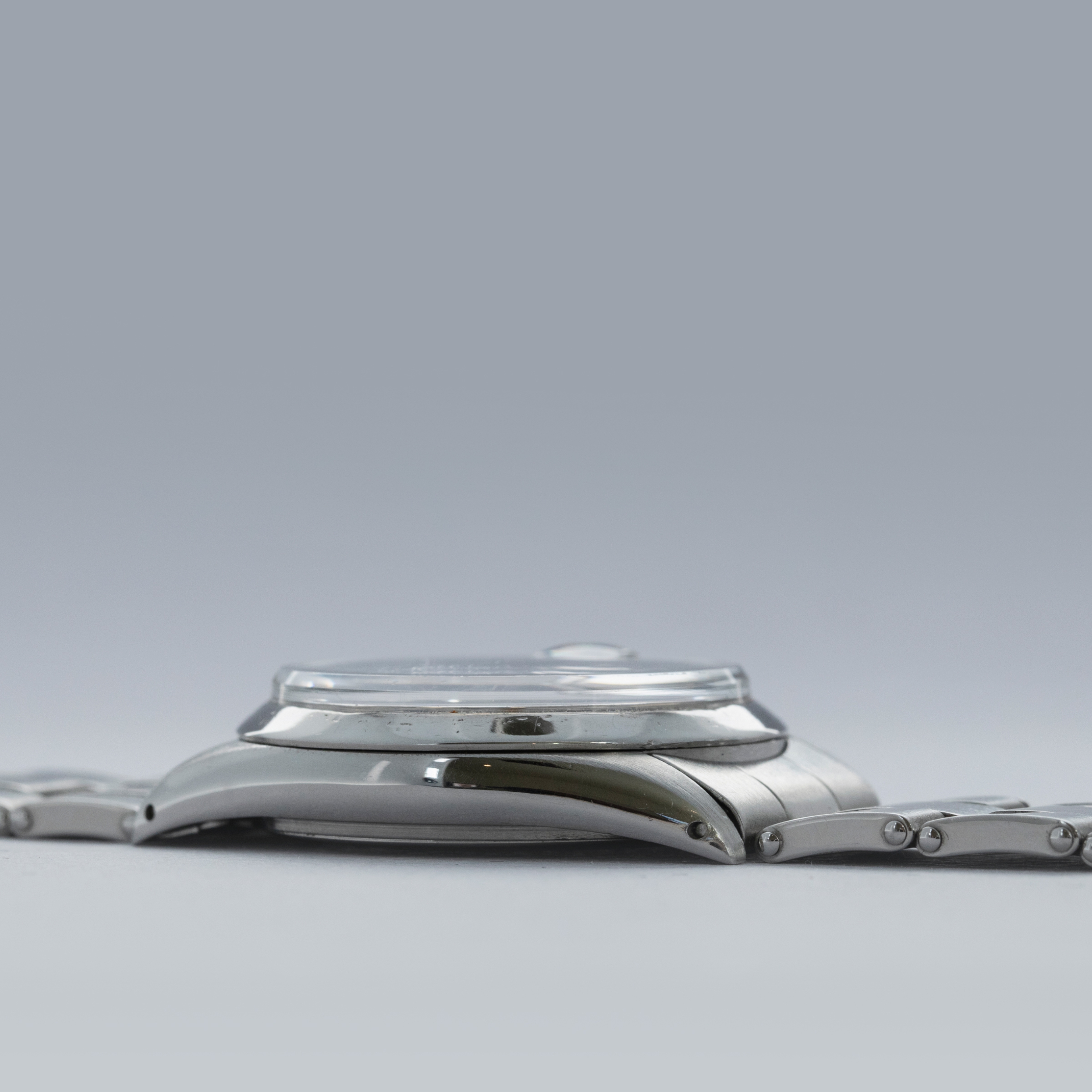 Watch is in excellent overall condition. The 34.5mm case and case back show some signs of wear and marks. The bezel is also in excellent condition, retaining its original sharpness. The black waffle dial is in outstanding condition, with complete lume plots and clean hands. The rivet link Oyster bracelet has 11 links and fits an approximately 7" wrist. It shows light to moderate stretch.