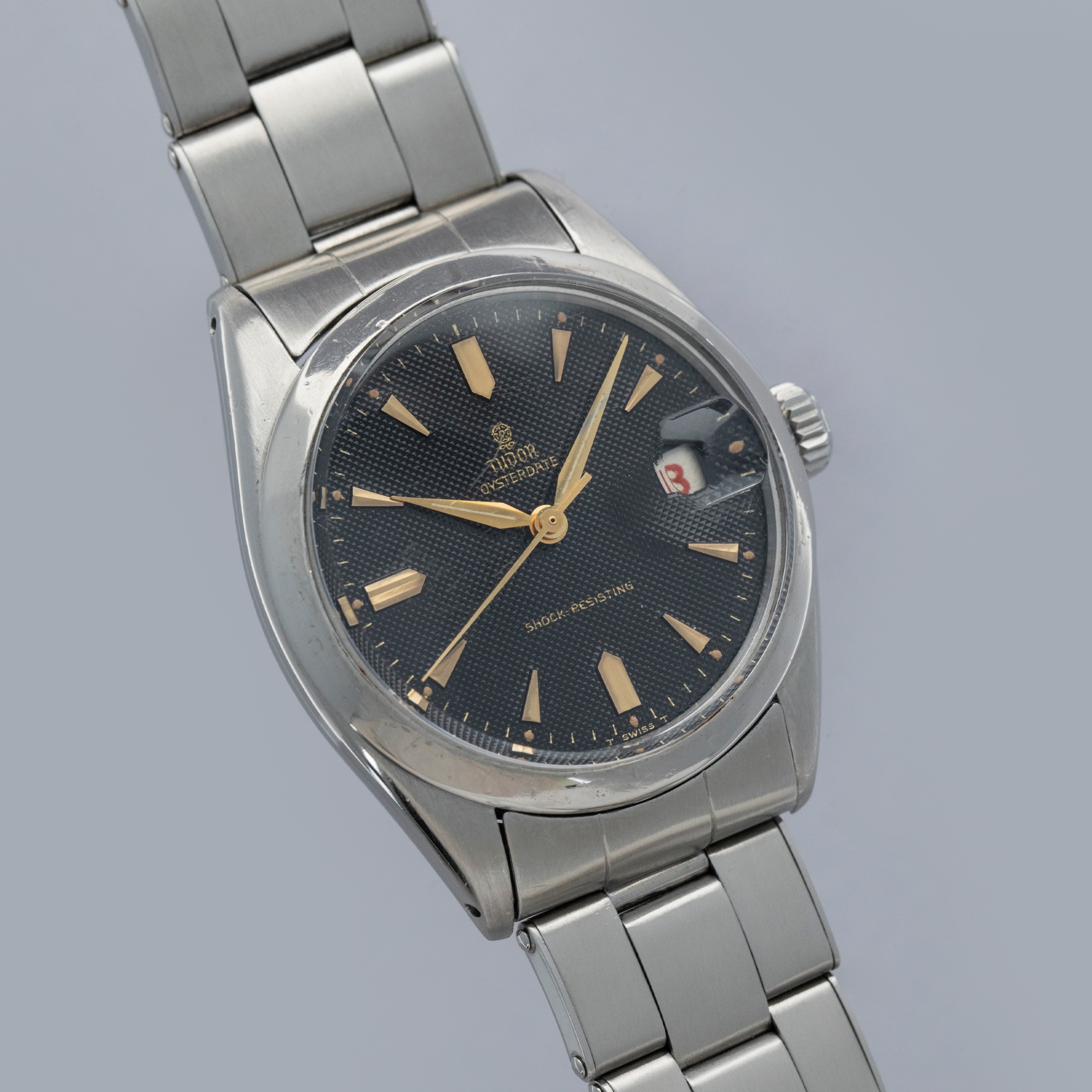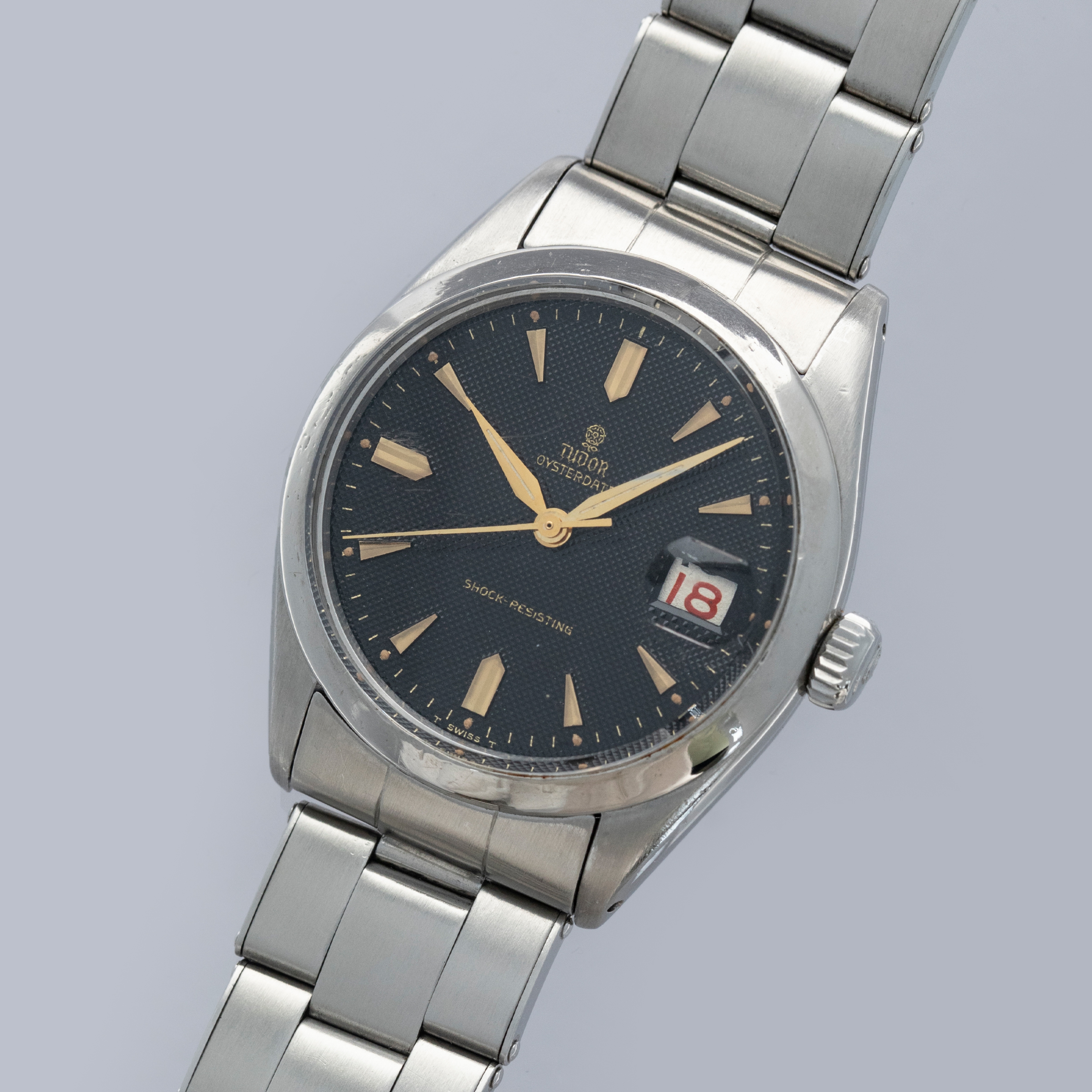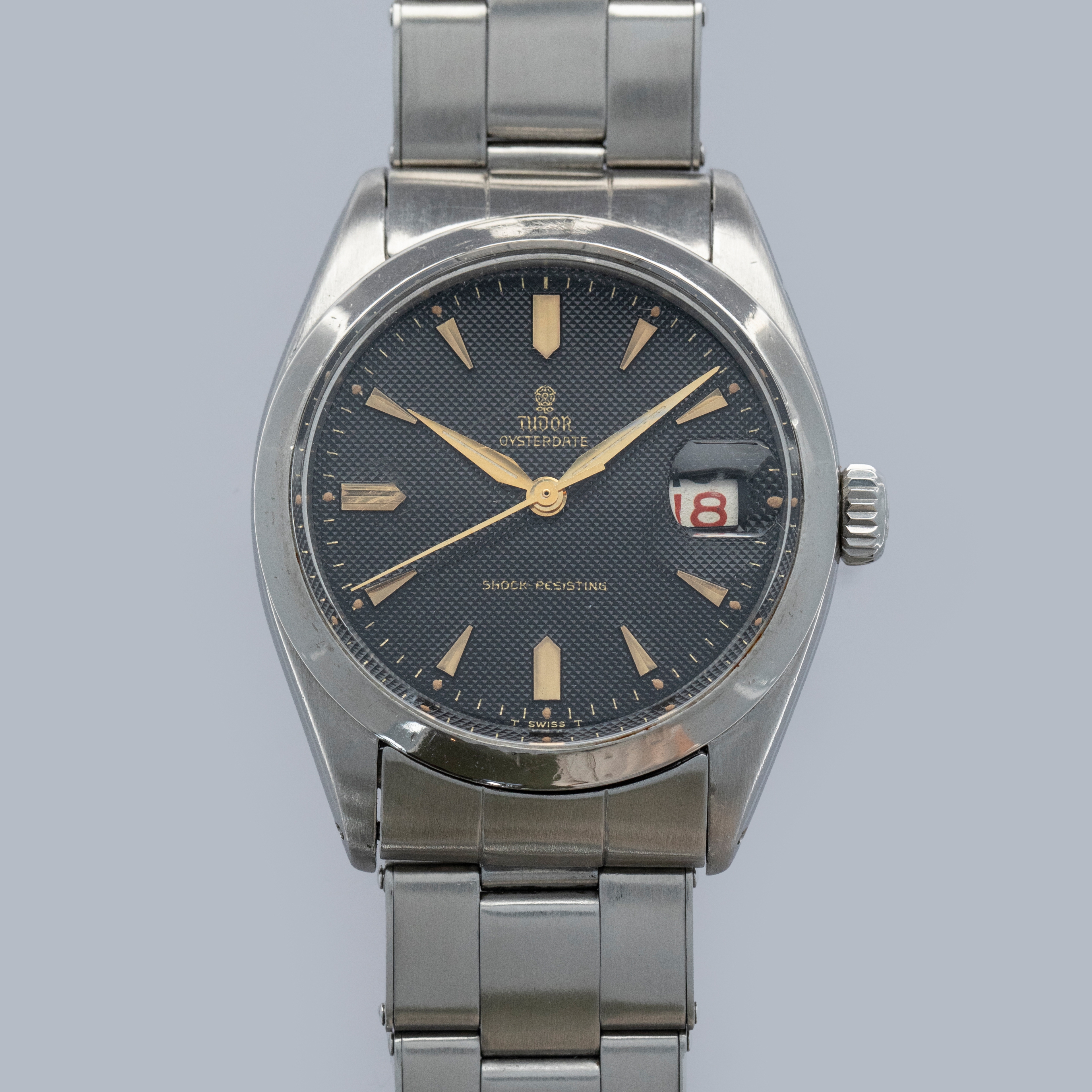 An admittedly utilitarian watch, the Tudor Oysterdate is refined and free from excess like a lot of other Tudor models. Launched in the 1950s, it features the manual-wind movement and boasts a stainless steel Rolex case and Rolex Oyster bracelet along with a Rolex winding cronw . Svelte by today’s proportions, the Oysterdate was sold as an entry-level cousin to the Rolex Datejust, with its 2mm smaller 34mm case and manual movement allowing its retail price to be that bit more palatable. Sporting a black waffle dial with a roulette datewheel whereby the numbers alternate between red and black, this ref. 7939 is a stunning example of mid-century utilitarianism at its finest.