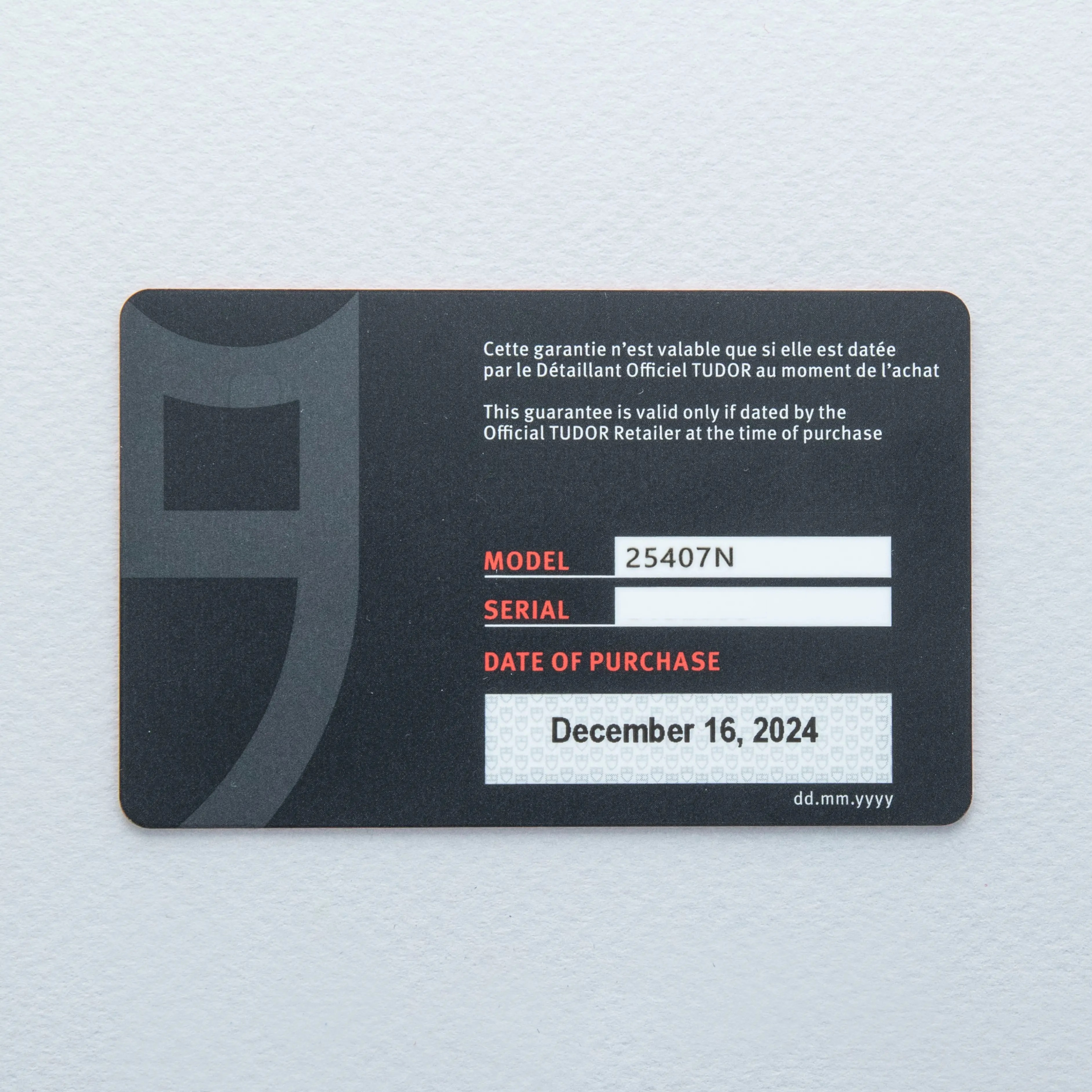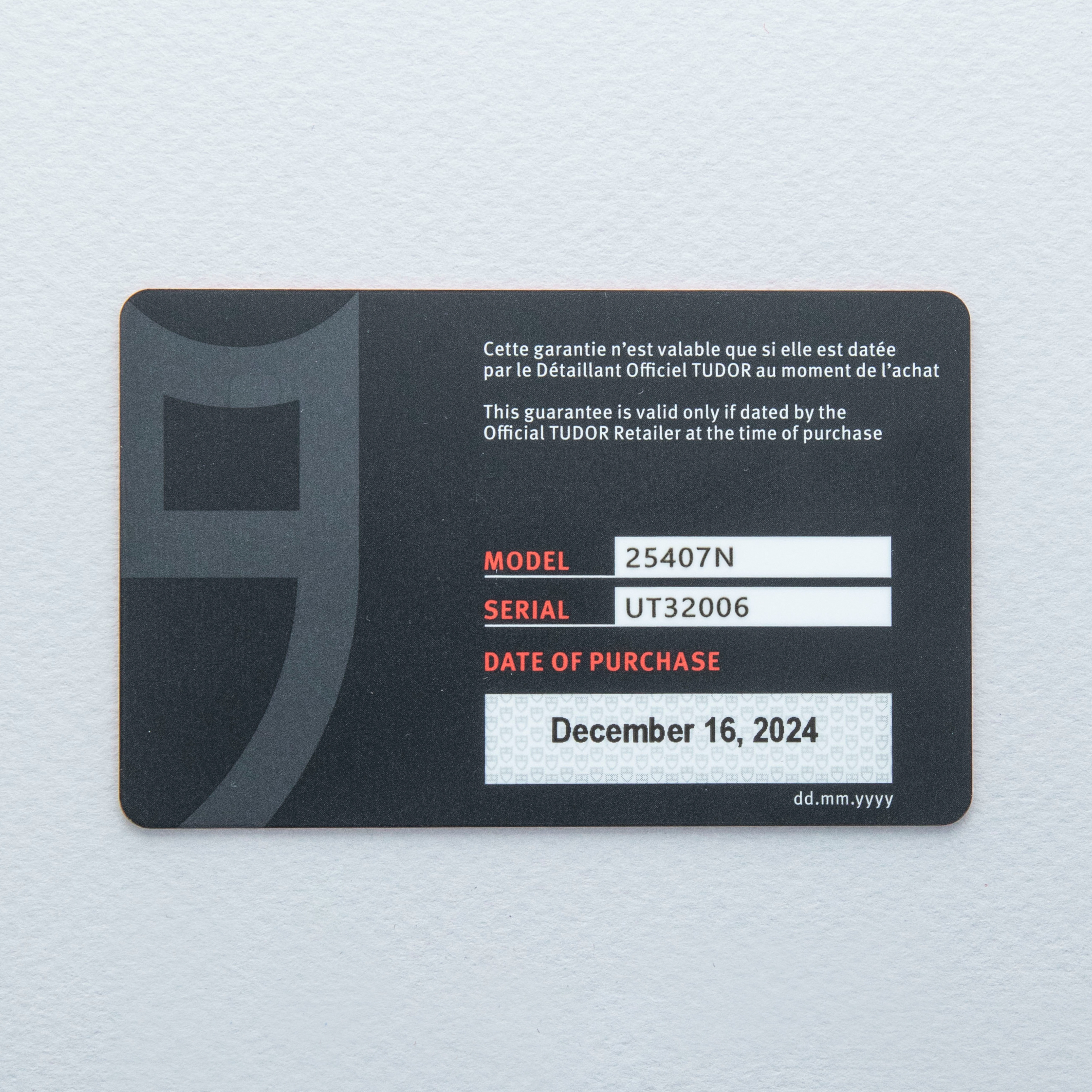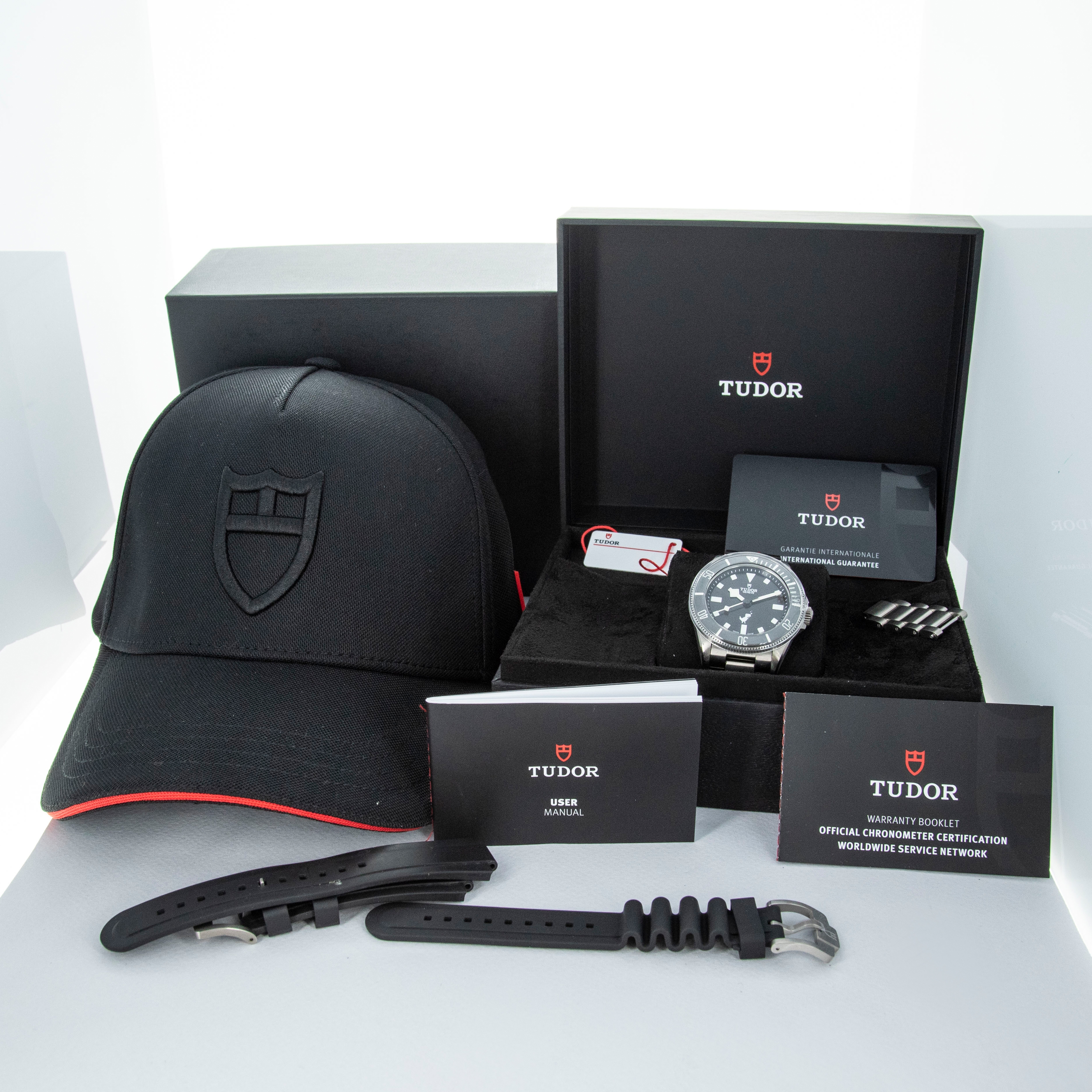 Watch is in overall excellent condition. The titanium case shows surface scratches and small nicks, most notably on the upper right lug, along with marks from the bracelet having been removed. The bezel and insert remain near mint. The dial and hands remain like new. It is fitted with a titanium bracelet showing surface scratches and small nicks on the clasp. The bracelet is fitted with 8 links and fits approximately a 6½” wrist. Additionally, there are 4 links included. Comes complete with inner and outer boxes, warranty card, booklets, hangtag, rubber strap with diver extension and a Tudor cap.