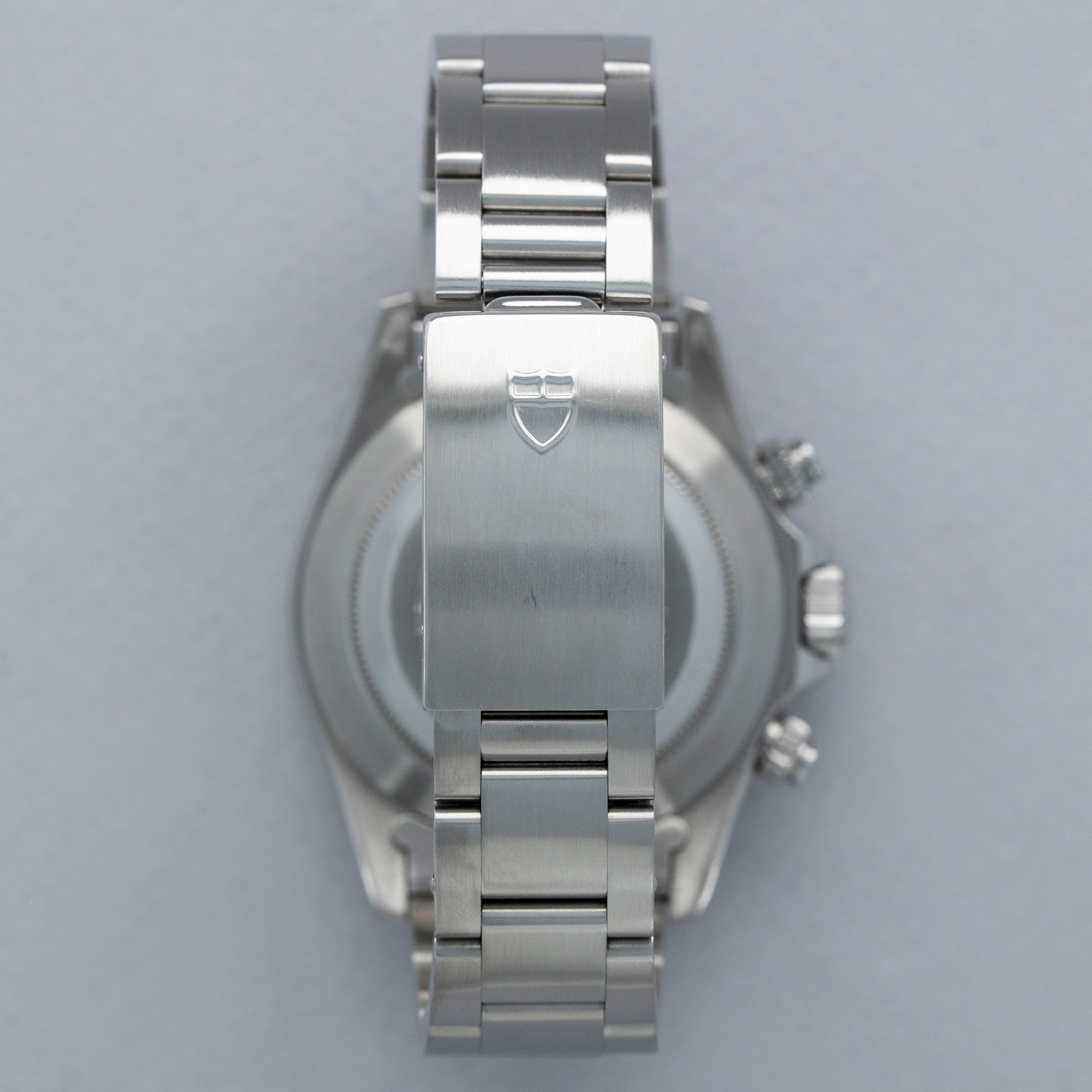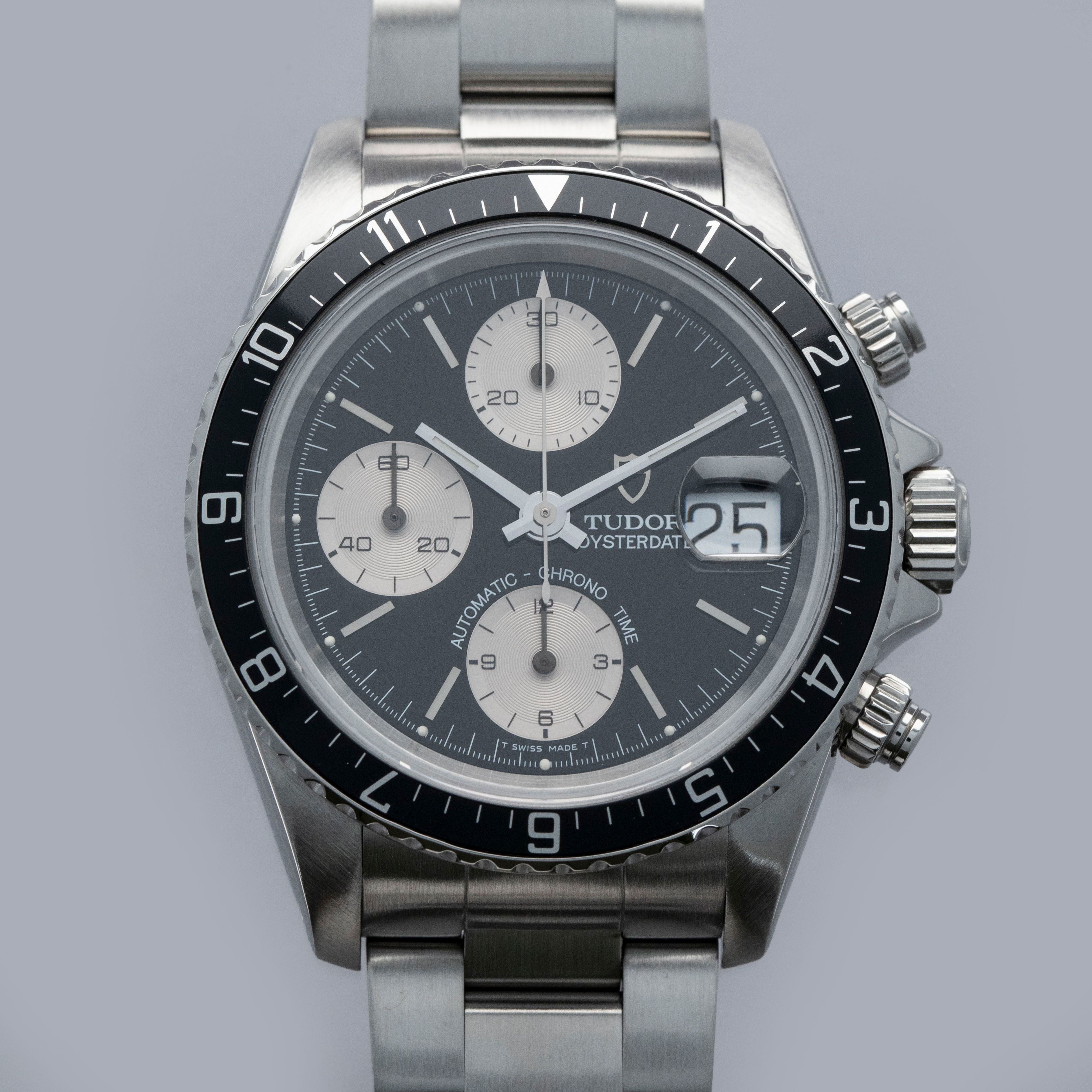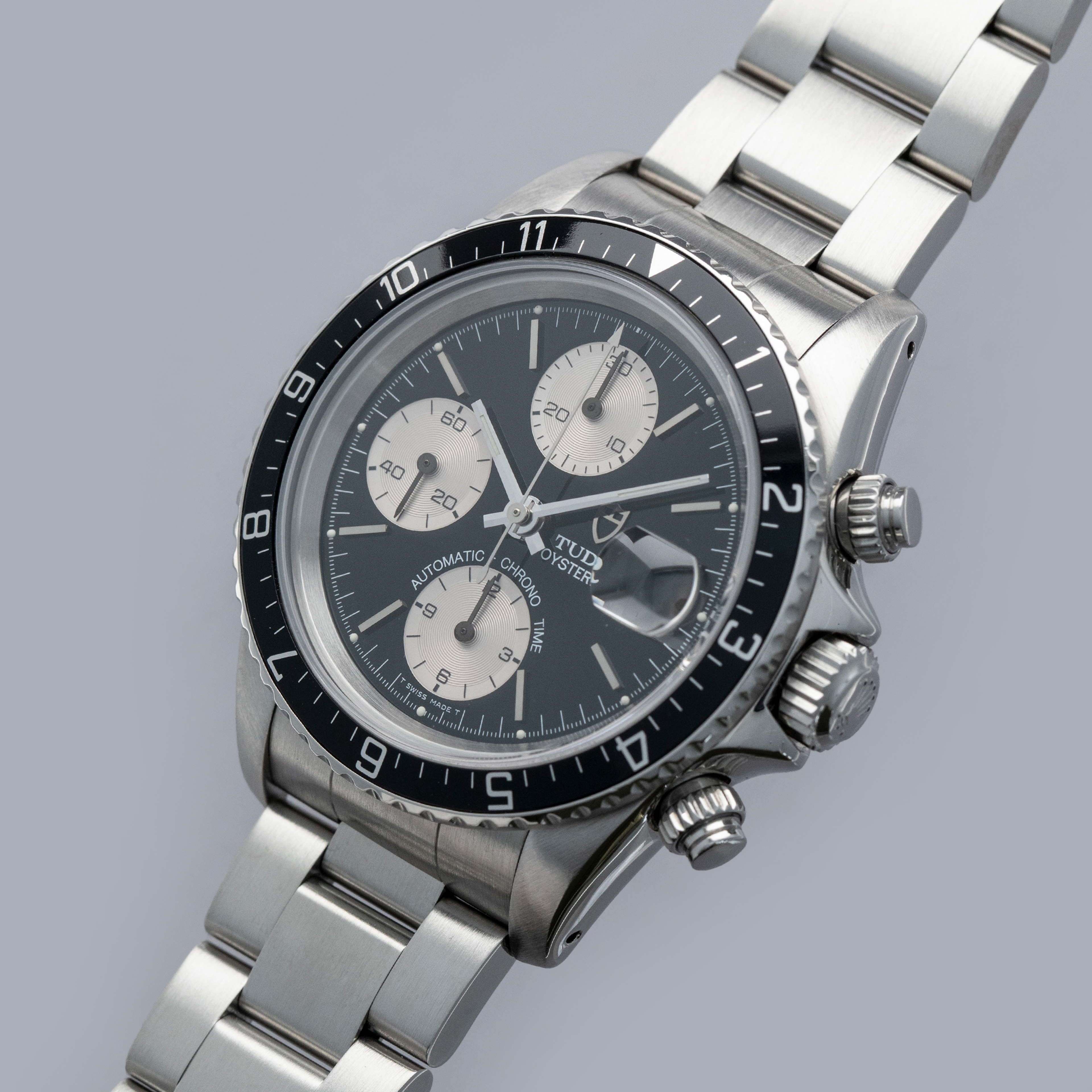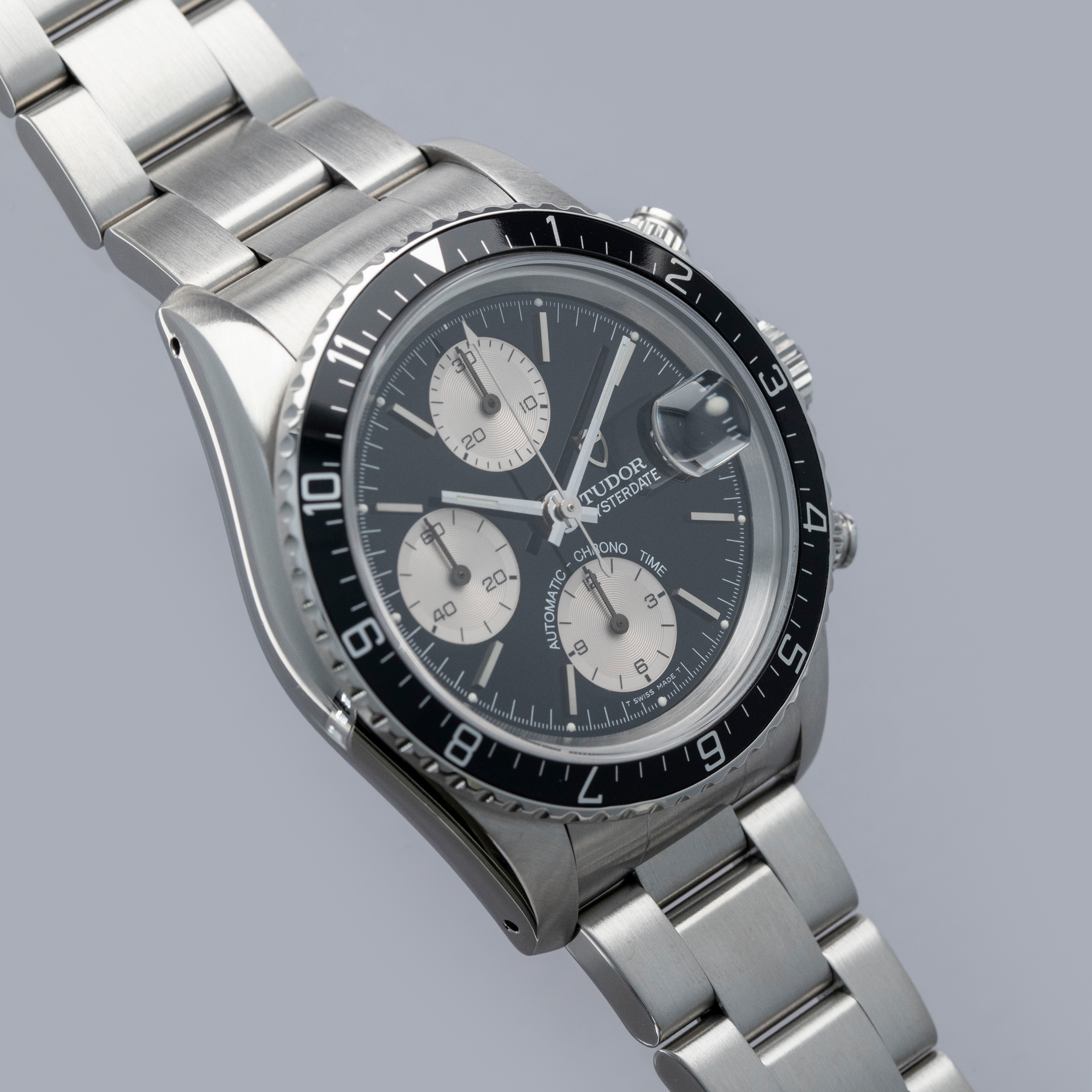 First introduced to Tudor’s catalog in 1995 with the ref. 79200 series, the 4th series of the Tudor Oysterdate Chronograph was an evolution of earlier Tudor chronograph models that began to add sleeker designs to the iconic collection’s repertoire. Amongst the changes that the ref. 79200 brought about was a new thinner case design with a sapphire crystal and a move away from Rolex-branded parts such as winding crowns, casebacks, and bracelets. Taking another step forward in 1996, the ref. 79270, which is what we have here, introduced a new black aluminum bezel insert to the Tudor Oysterdate chronograph collection. Printed with a 12-hour countdown scale, this bezel was a significant improvement on the black acrylic bezel inserts that Tudor had been using previously, as they were prone to cracking. Fitted with a black dial with three silver subdials and a cyclops lens-coved date aperture, the ref. 79270 is a monochromatic masterpiece that links vintage Tudor with the modern world of watchmaking with its aluminum bezel insert and sapphire crystal, both of which are still in use by Tudor today.