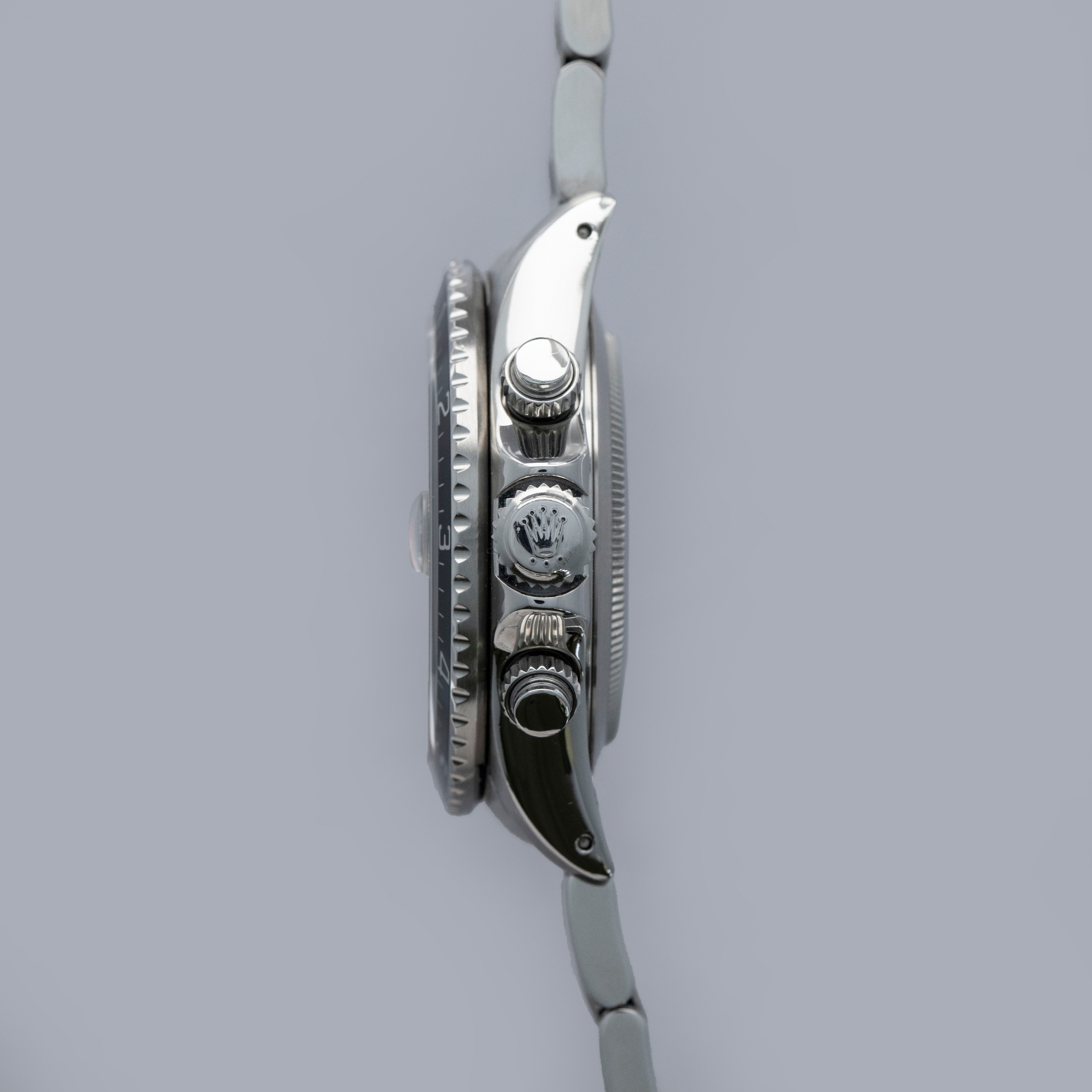 Offered in black to match its black aluminum bezel insert, this example's silver subdials burst out of the ref. 79270's display with the utmost legibility. Additionally, its cyclops lens-clad date aperture makes this timepiece all the more useful.