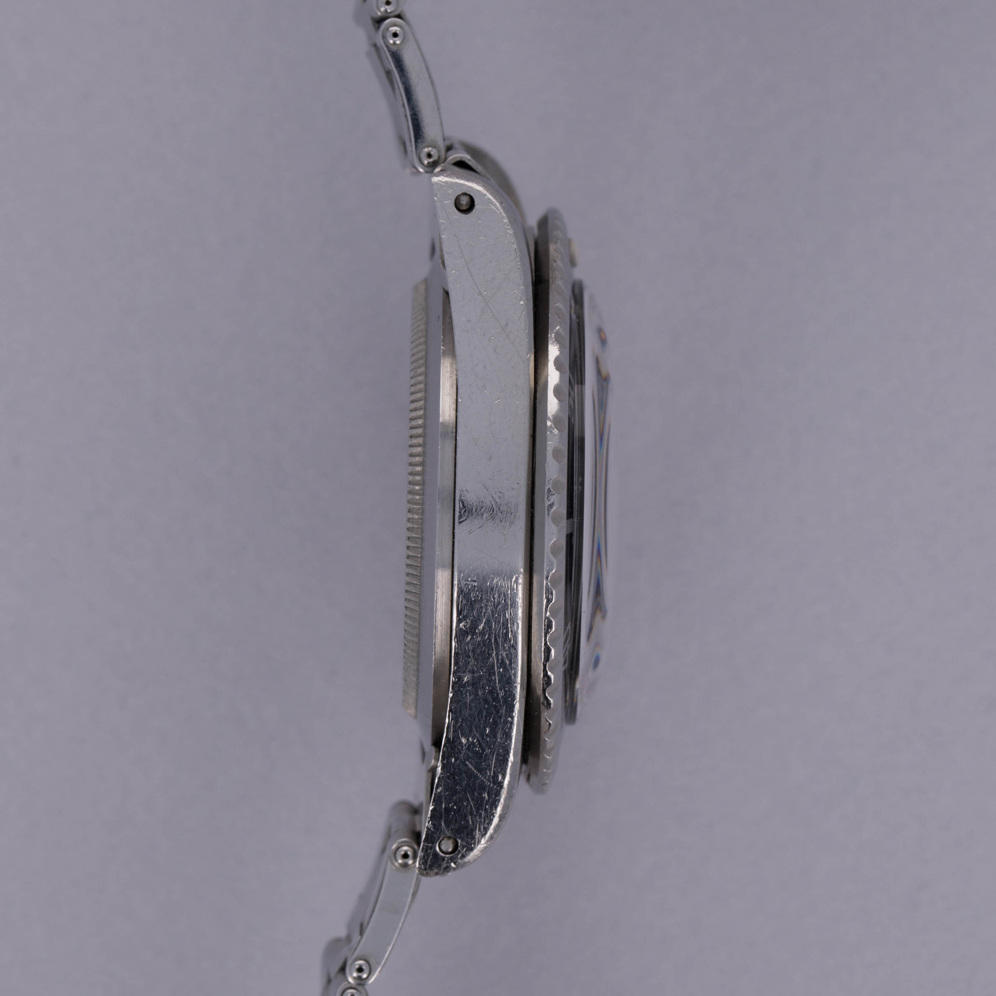 Watch is in very good overall condition. Case shows some wear, with scratches and nicks visible along the surfaces, most particularly on the lugs. There is some damage visible along the metal bezel ring as well, although the edges remain sharp and well defined. The dial has aged tritium with a glossy surface. There is slight discoloration visible on some of the indexes and there is some crazing visible in the lower half of the dial surface radiating from the edge. Hands are matching. Watch comes on a USA rivet band dated 1973. It fits a 6 1/2" wrist in its widest setting.